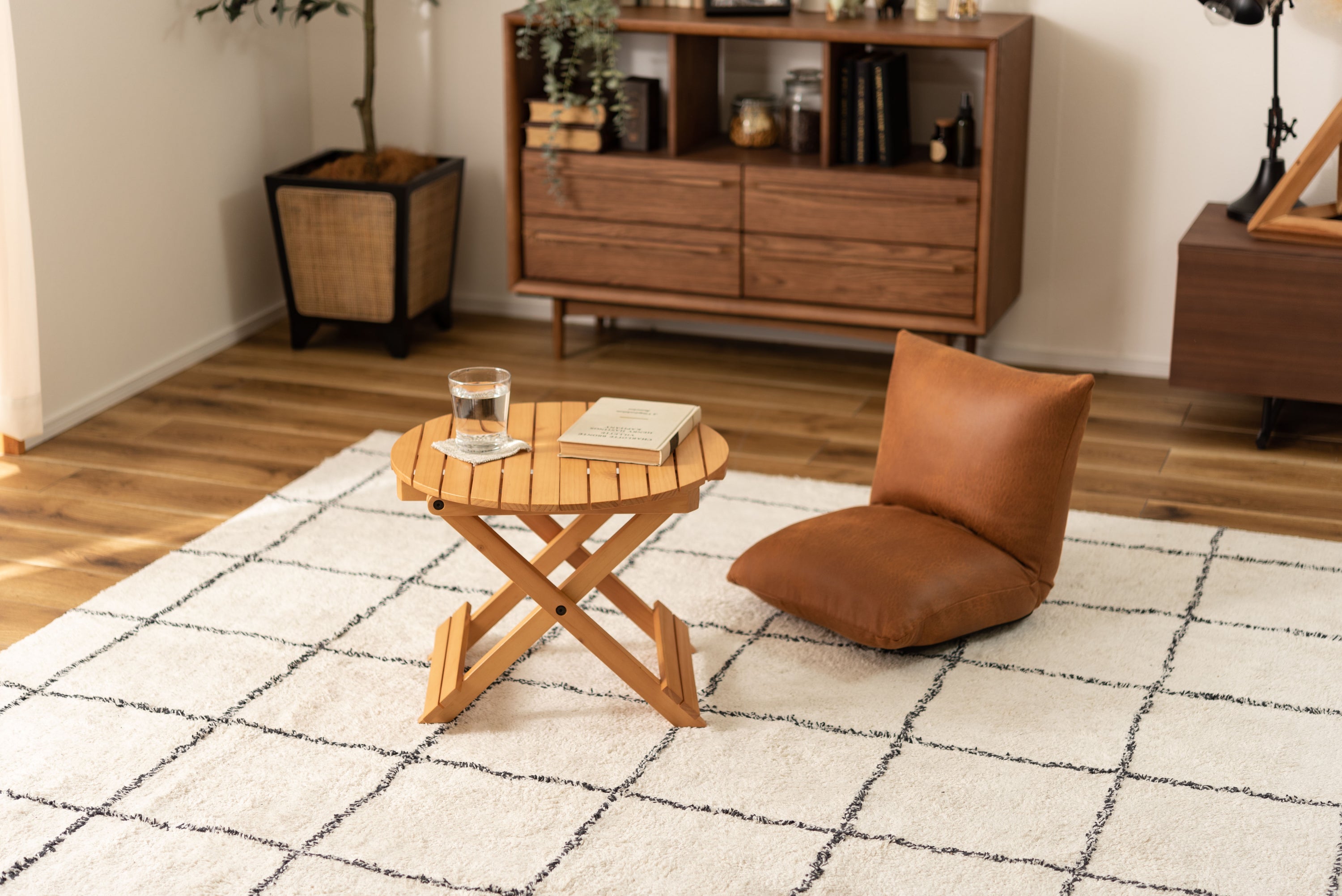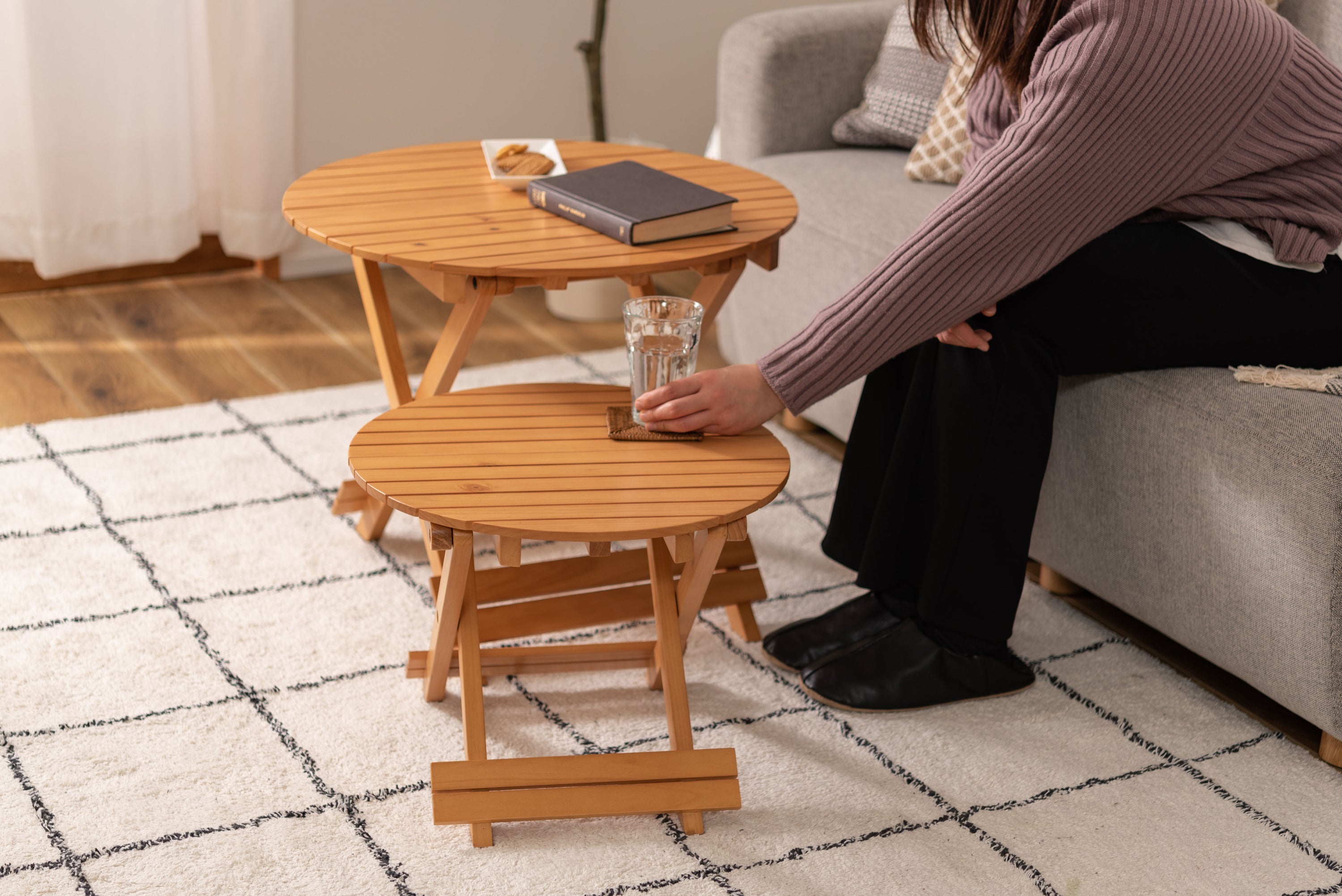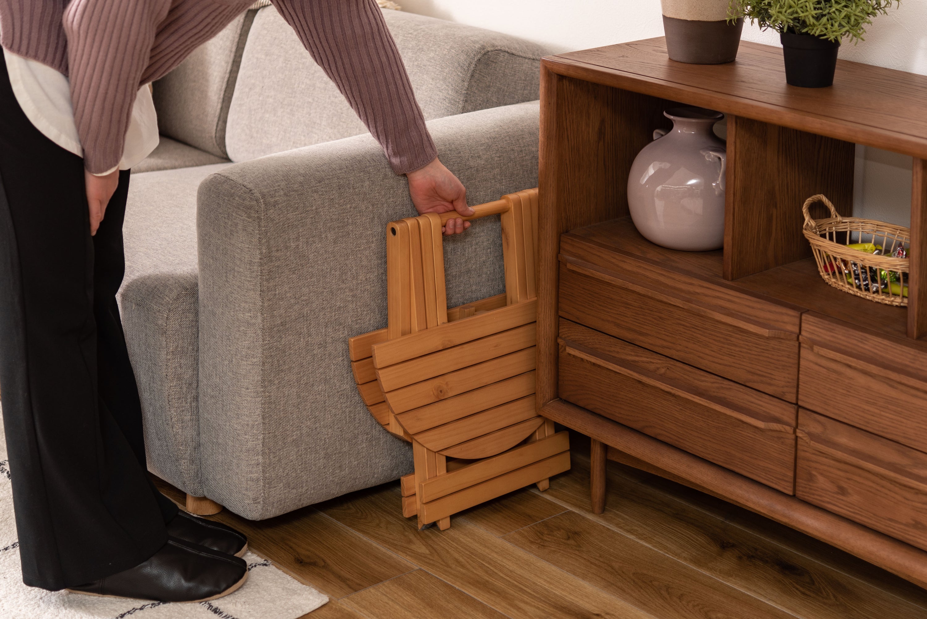 工具不要で簡単組み立て、ワンタッチで折りたためる便利なラウンドテーブル。折りたたみ時の“持ち手”で移動もしやすく、様々なシーンで大活躍。コンパクトでちょうどいいサイズ。大・小を組み合わせてネストテーブルとしても使えます。折りたたみ時の厚さは、Sサイズで5cm、Lサイズで6cmと薄型に。ベッド下やクローゼットなどの隙間に収納が可能。脚裏にはフェルトが付いているので床への傷防止にもなり安心です。