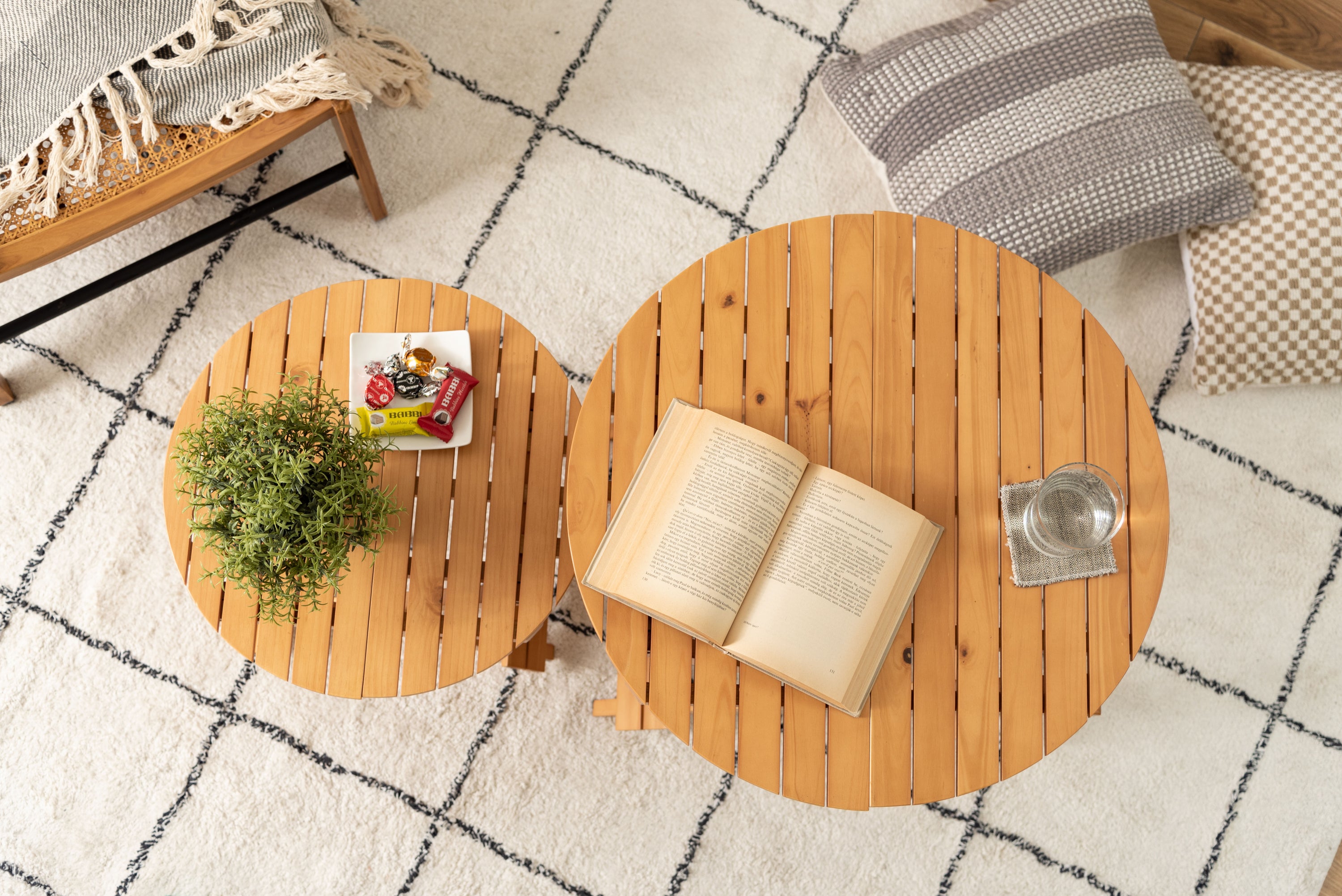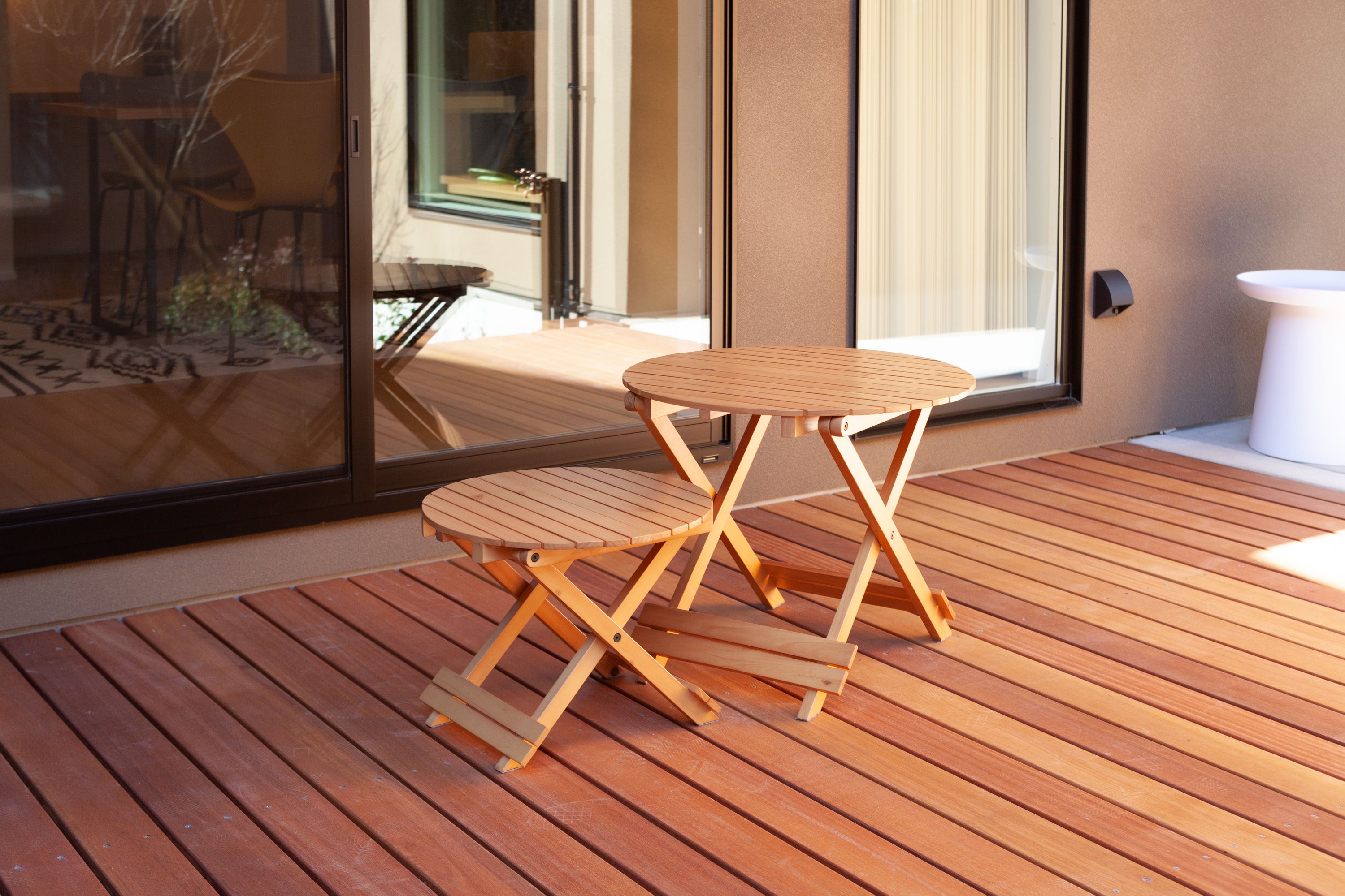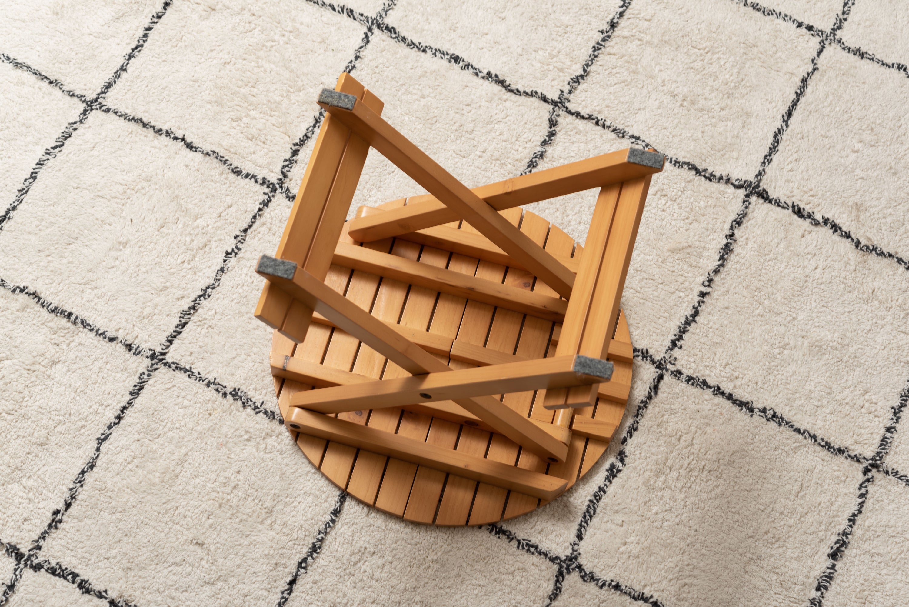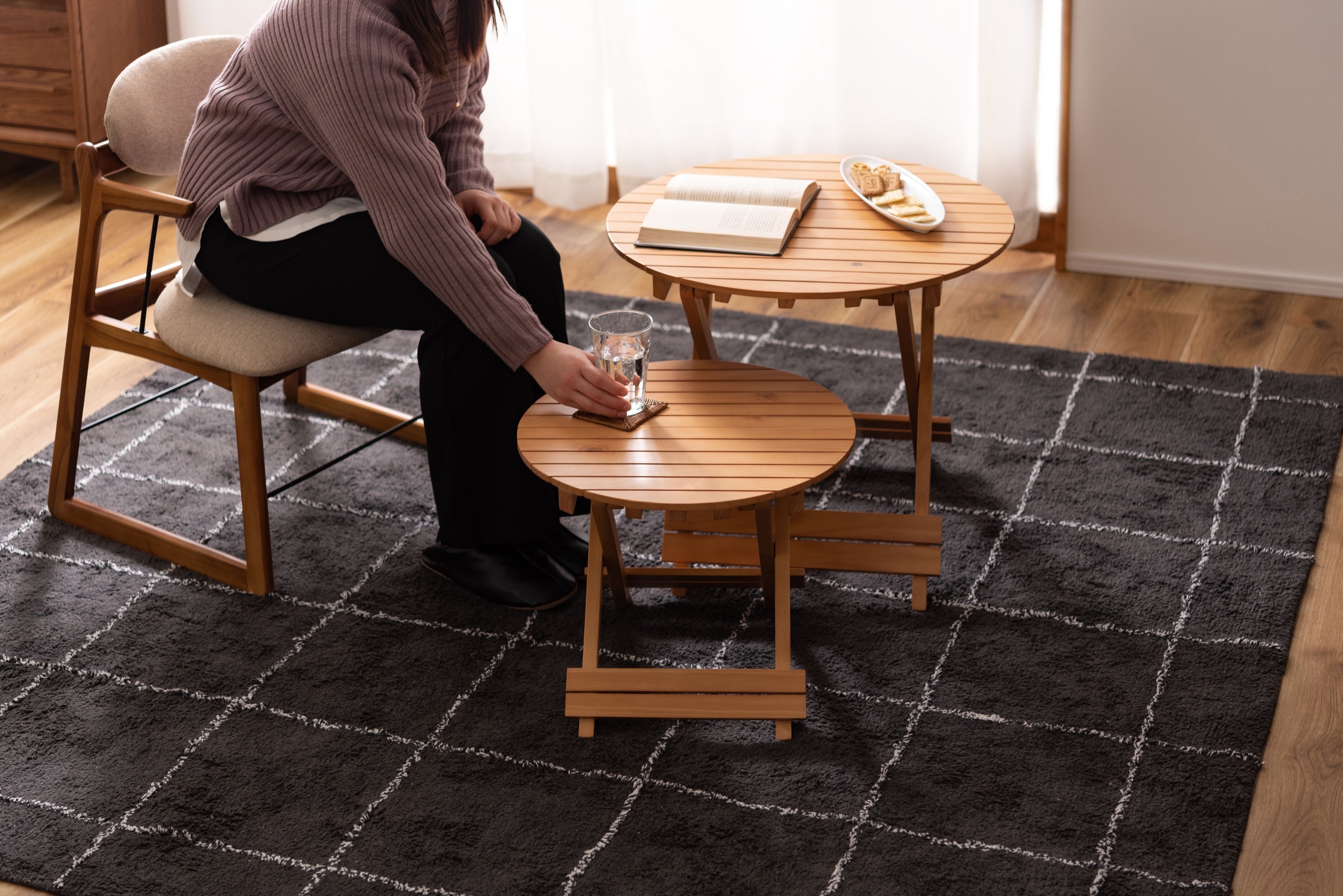 工具不要で簡単組み立て、ワンタッチで折りたためる便利なラウンドテーブル。折りたたみ時の“持ち手”で移動もしやすく、様々なシーンで大活躍。コンパクトでちょうどいいサイズ。大・小を組み合わせてネストテーブルとしても使えます。折りたたみ時の厚さは、Sサイズで5cm、Lサイズで6cmと薄型に。ベッド下やクローゼットなどの隙間に収納が可能。脚裏にはフェルトが付いているので床への傷防止にもなり安心です。