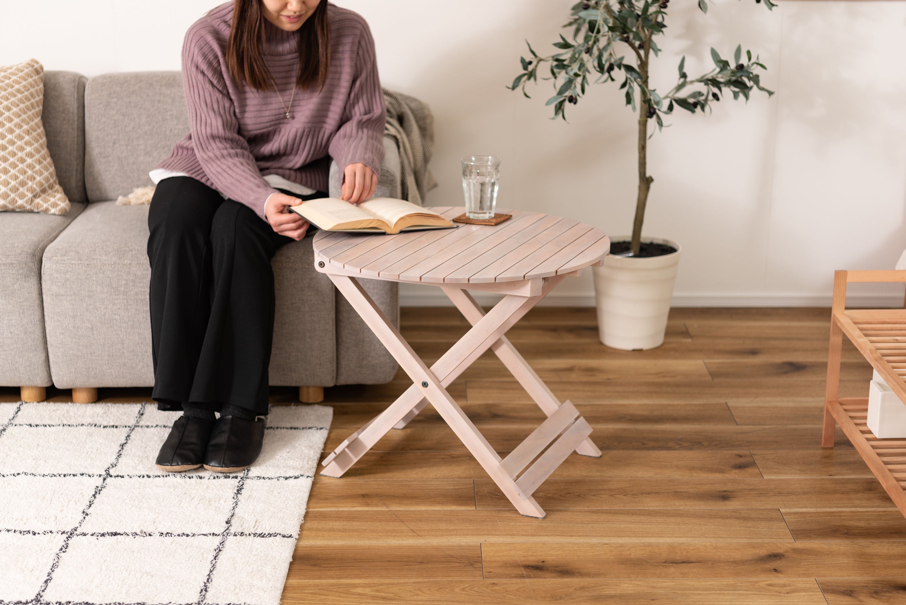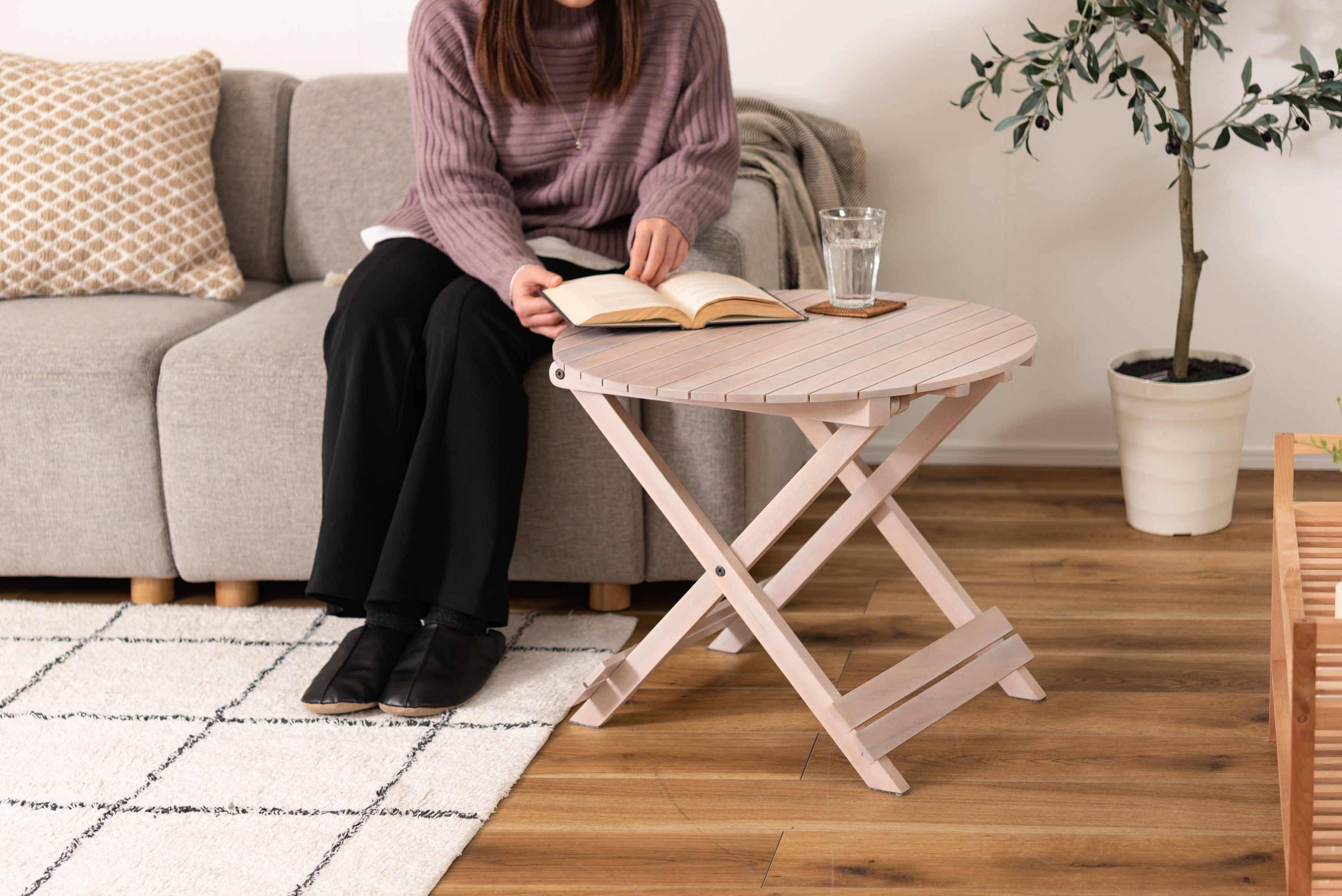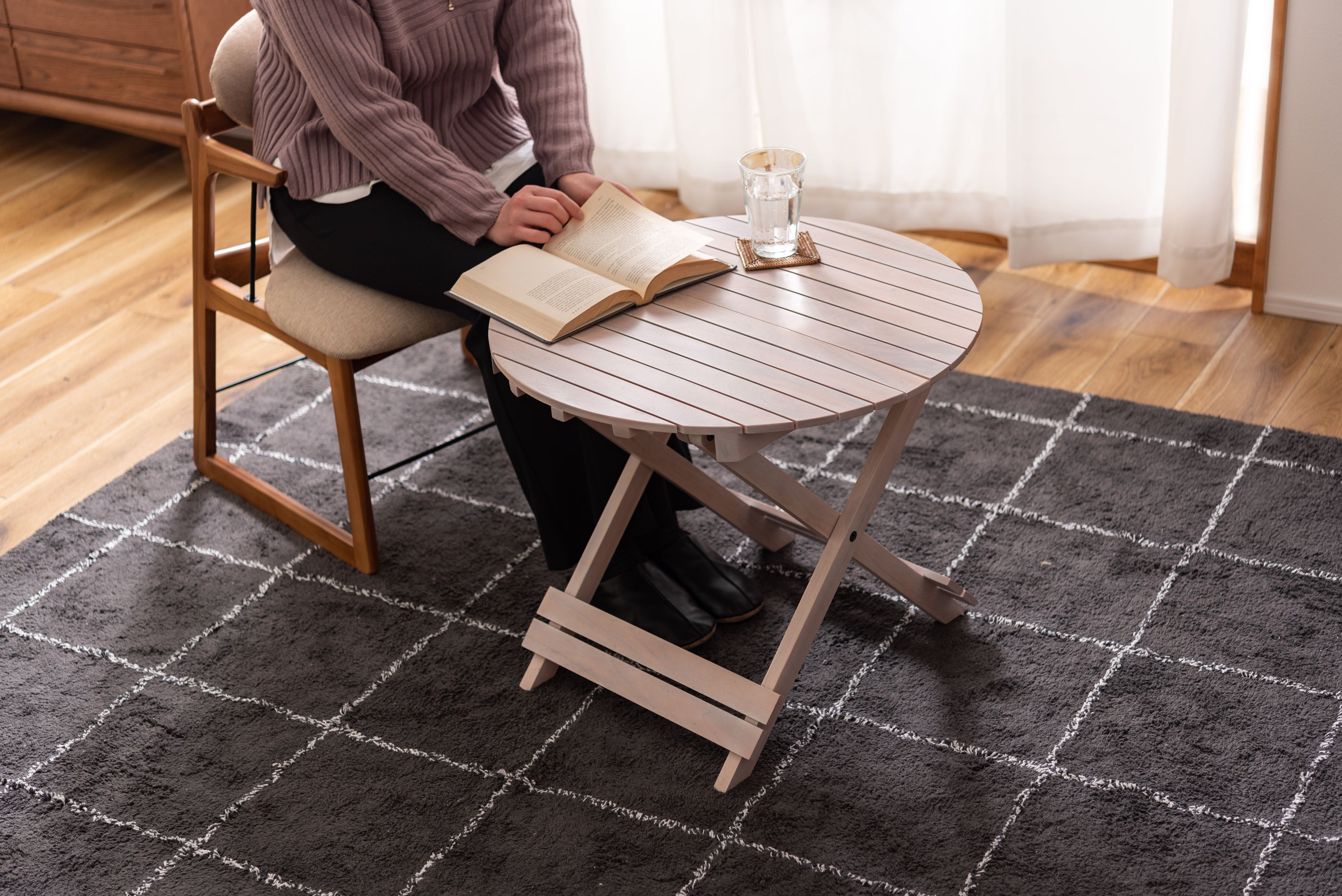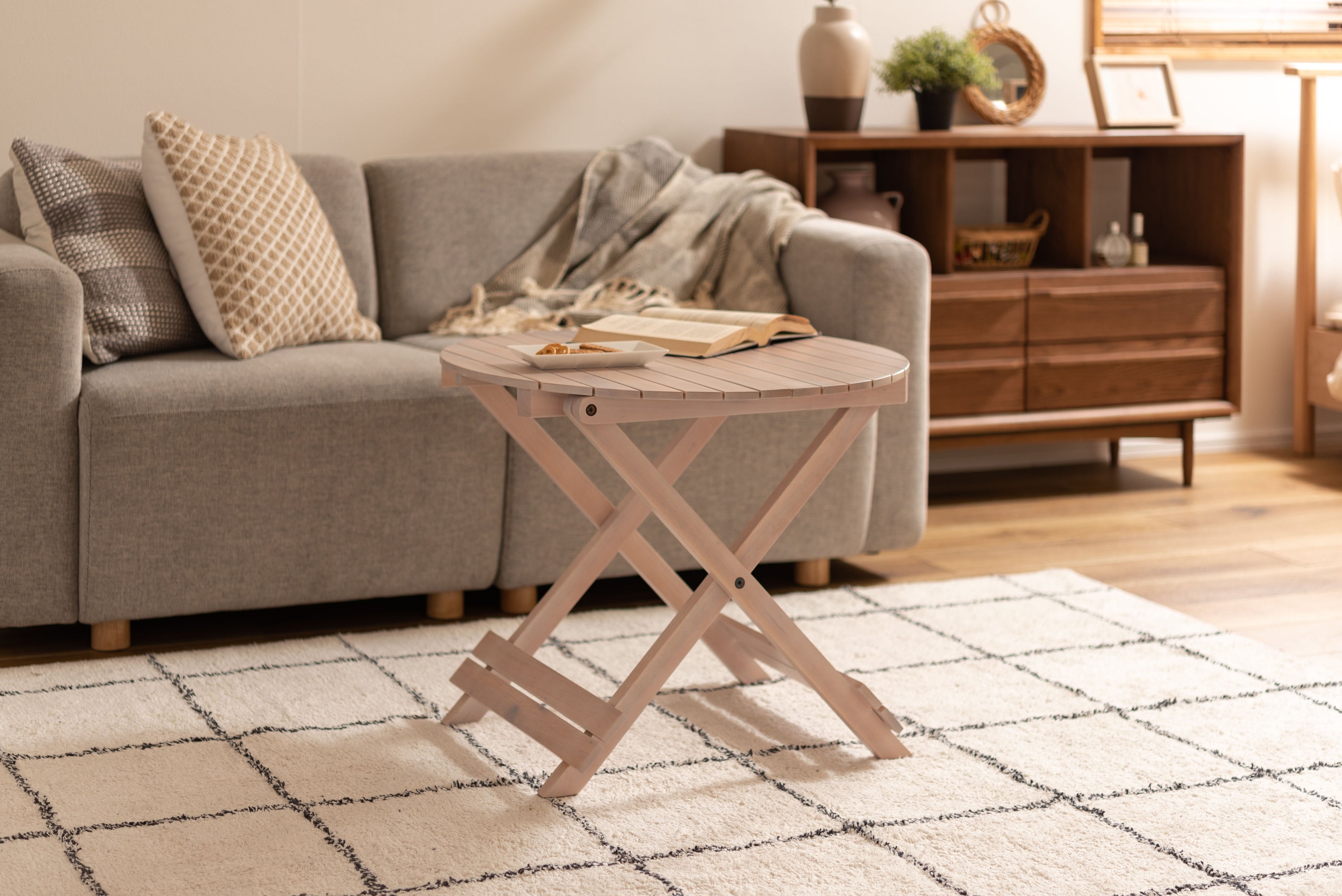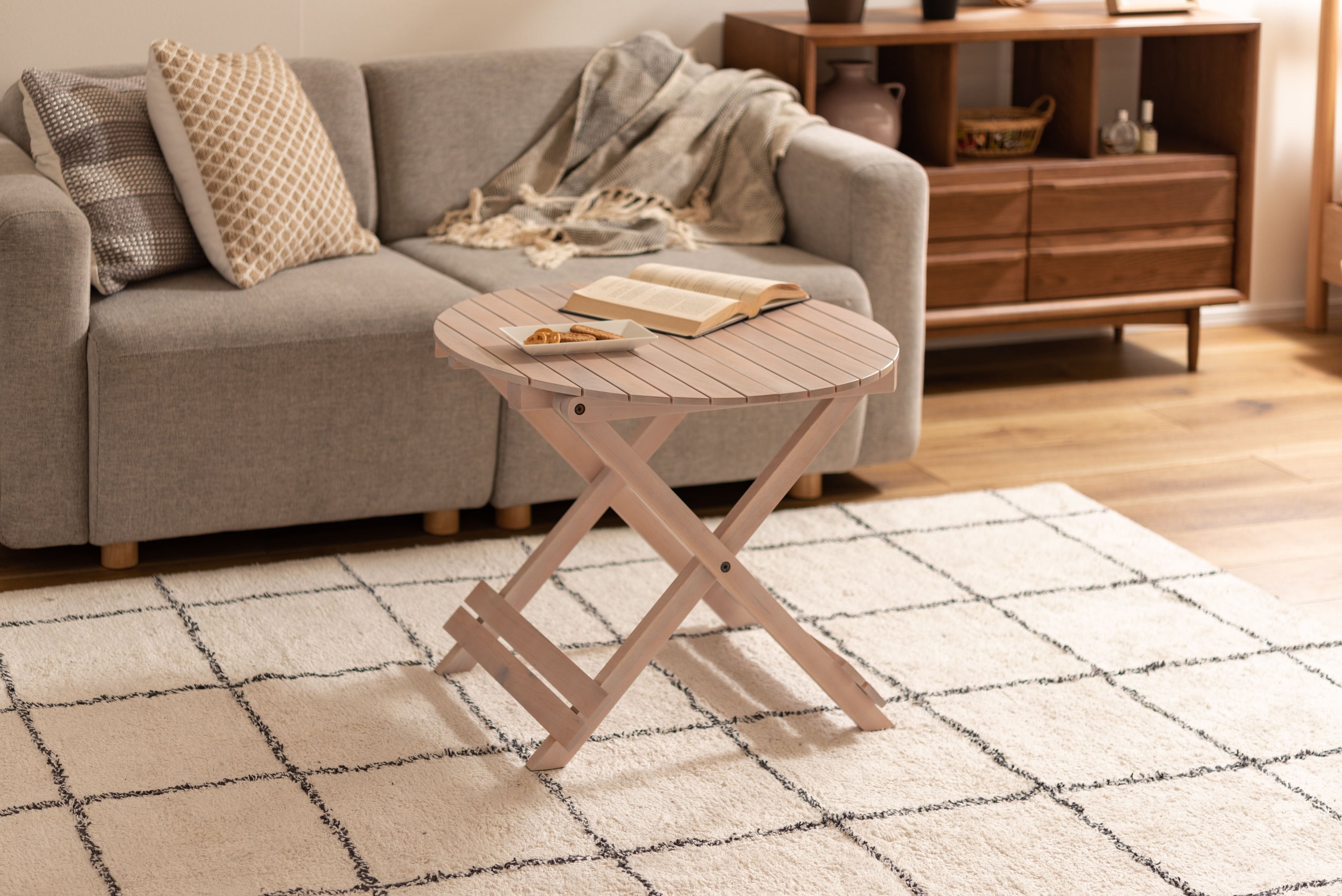工具不要で簡単組み立て、ワンタッチで折りたためる便利なラウンドテーブル。折りたたみ時の“持ち手”で移動もしやすく、様々なシーンで大活躍。コンパクトでちょうどいいサイズ。大・小を組み合わせてネストテーブルとしても使えます。折りたたみ時の厚さは、Sサイズで5cm、Lサイズで6cmと薄型に。ベッド下やクローゼットなどの隙間に収納が可能。脚裏にはフェルトが付いているので床への傷防止にもなり安心です。