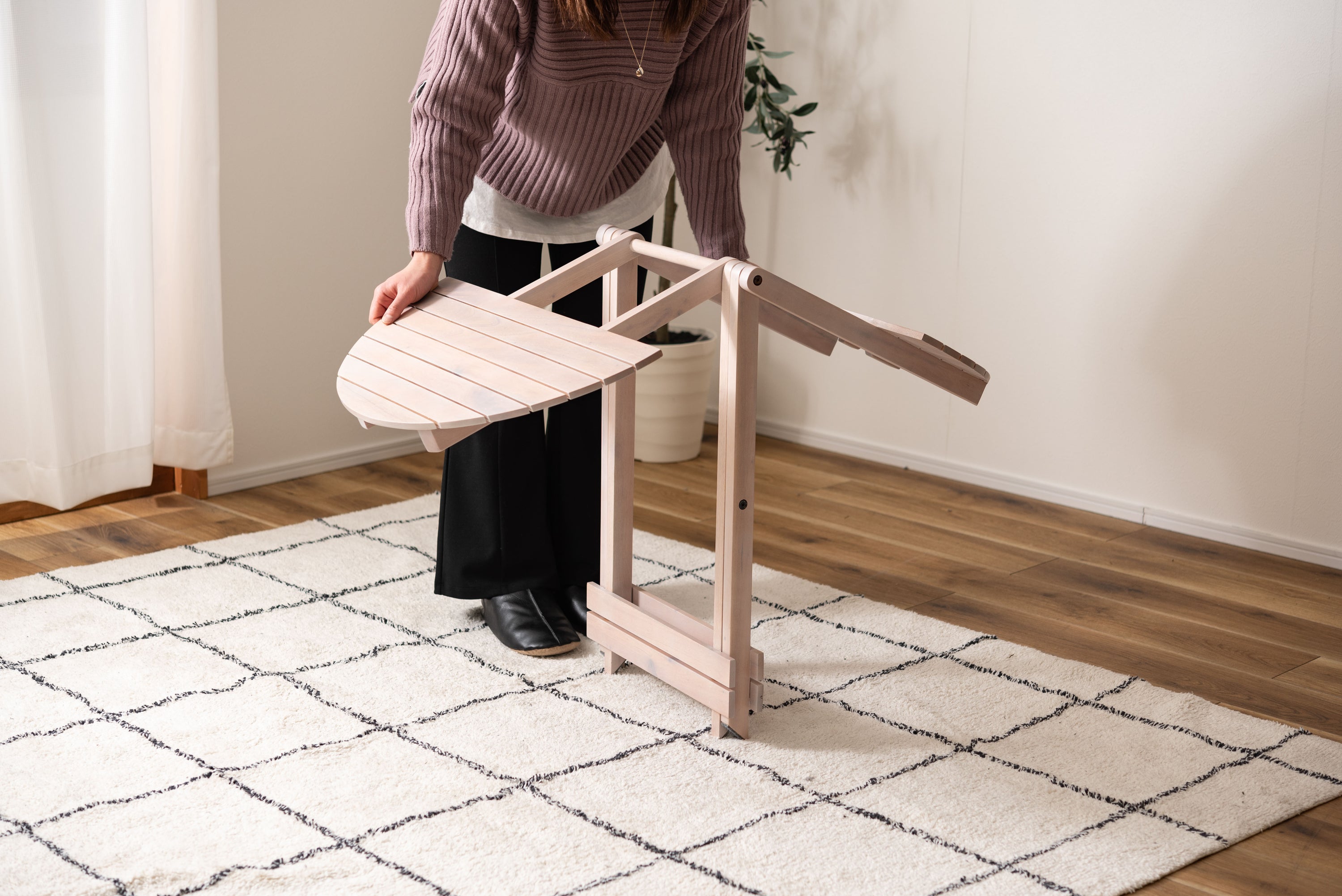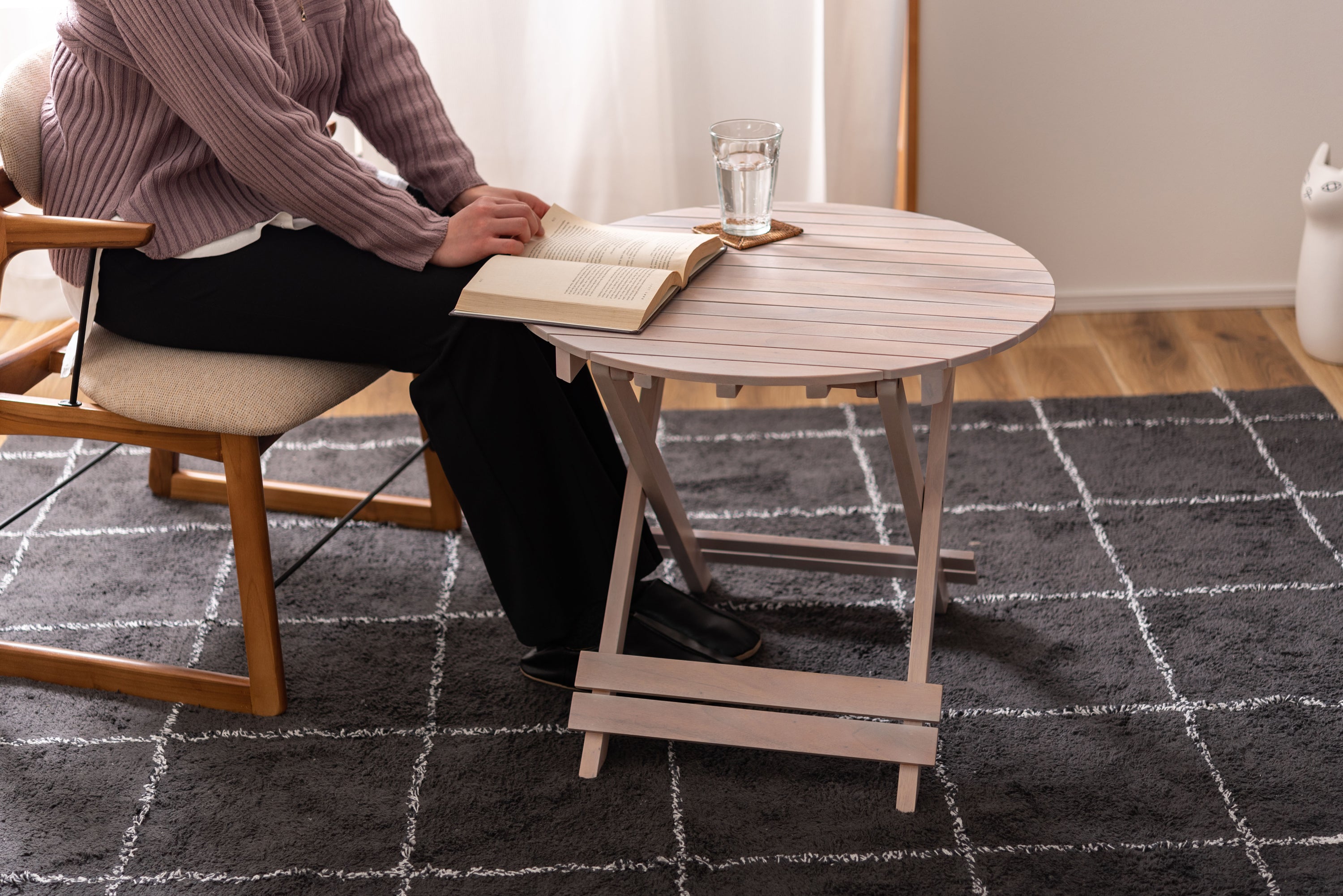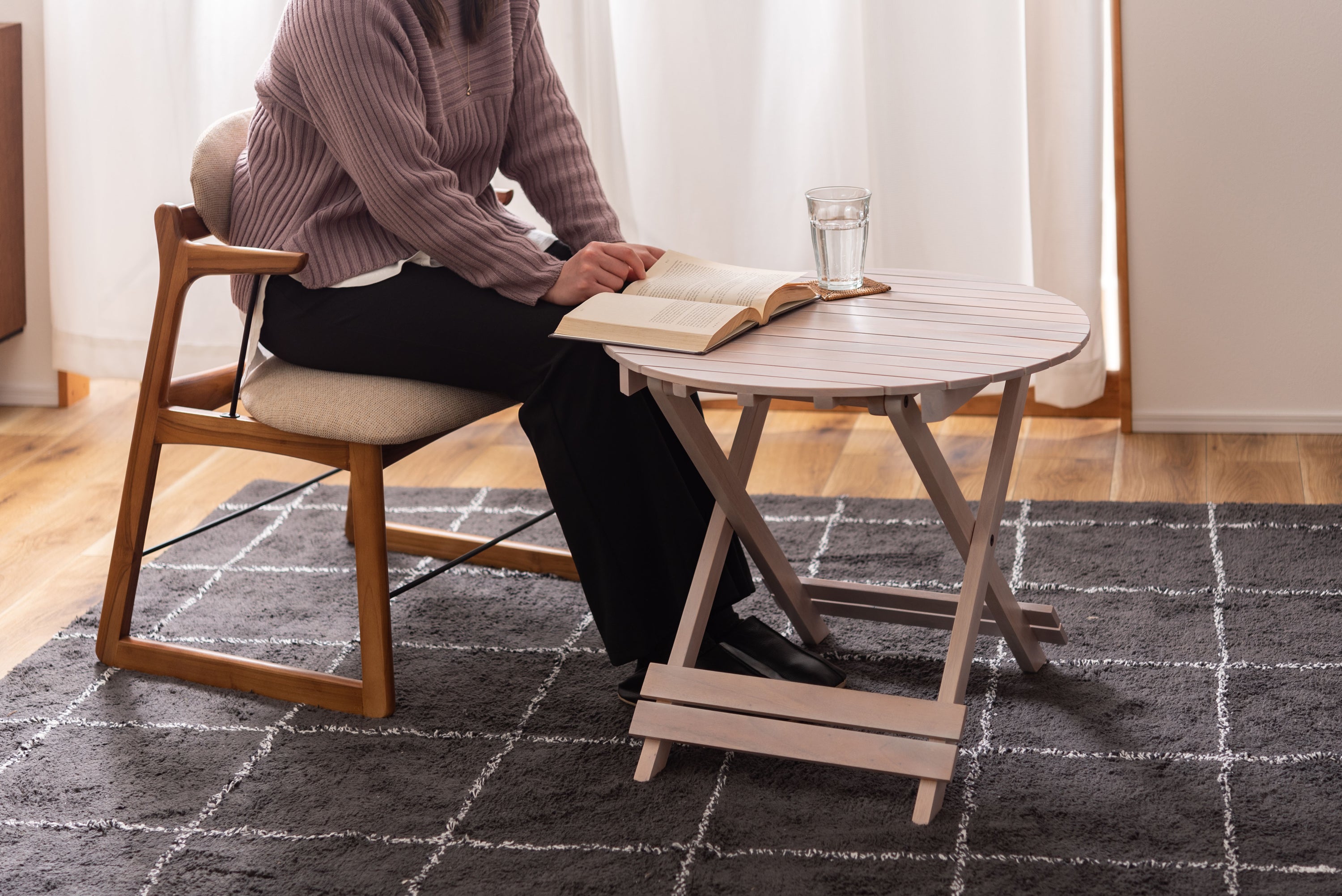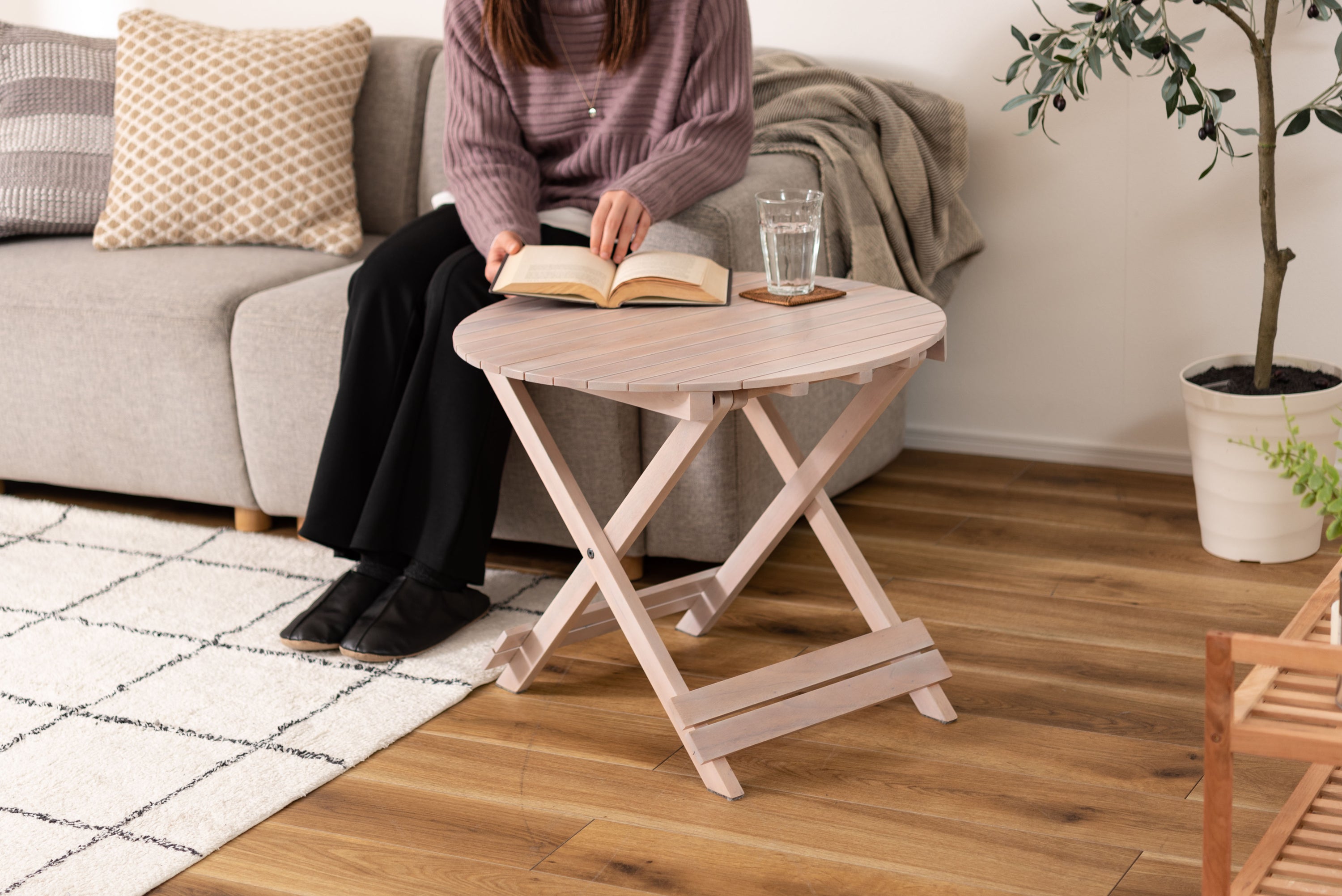 工具不要で簡単組み立て、ワンタッチで折りたためる便利なラウンドテーブル。折りたたみ時の“持ち手”で移動もしやすく、様々なシーンで大活躍。コンパクトでちょうどいいサイズ。大・小を組み合わせてネストテーブルとしても使えます。折りたたみ時の厚さは、Sサイズで5cm、Lサイズで6cmと薄型に。ベッド下やクローゼットなどの隙間に収納が可能。脚裏にはフェルトが付いているので床への傷防止にもなり安心です。