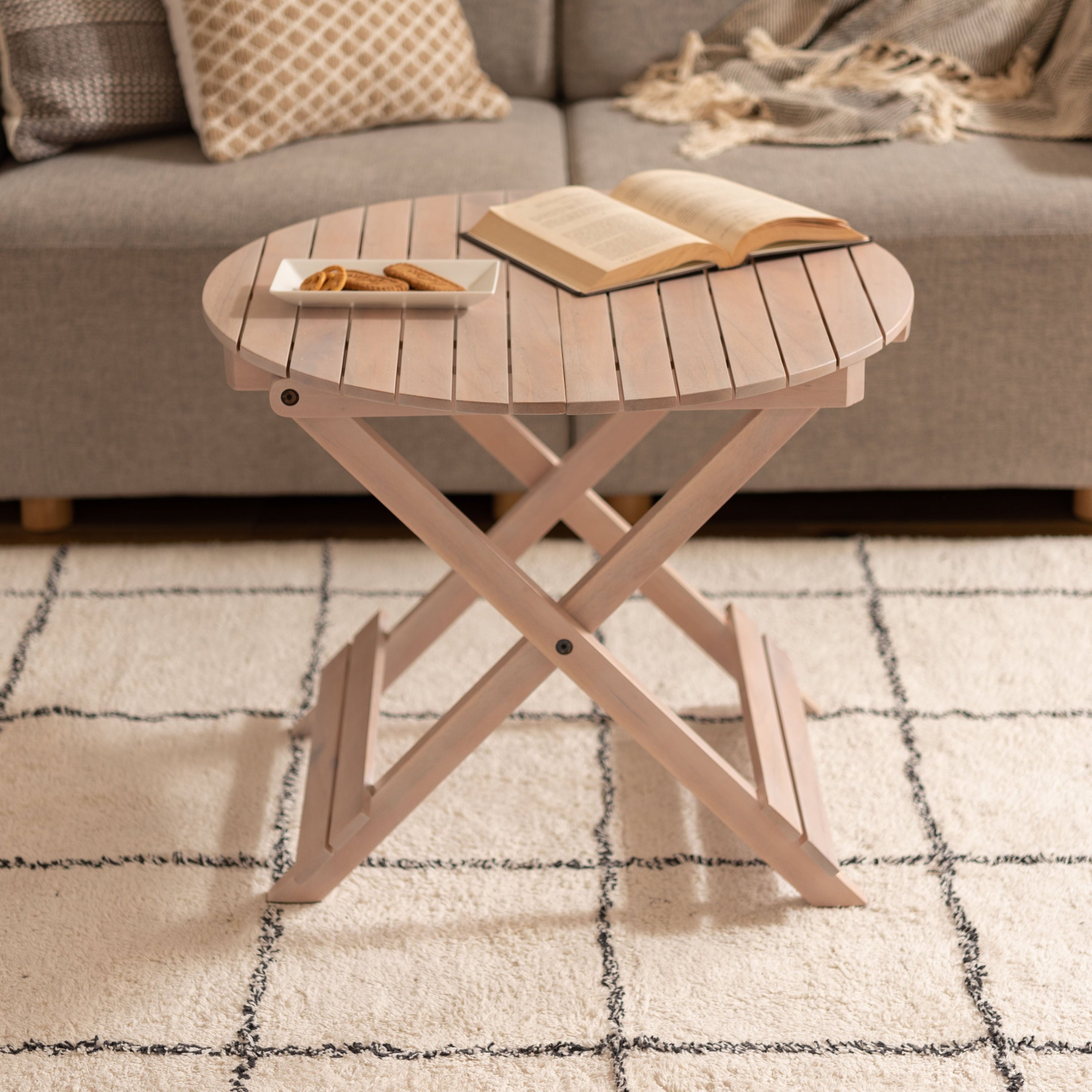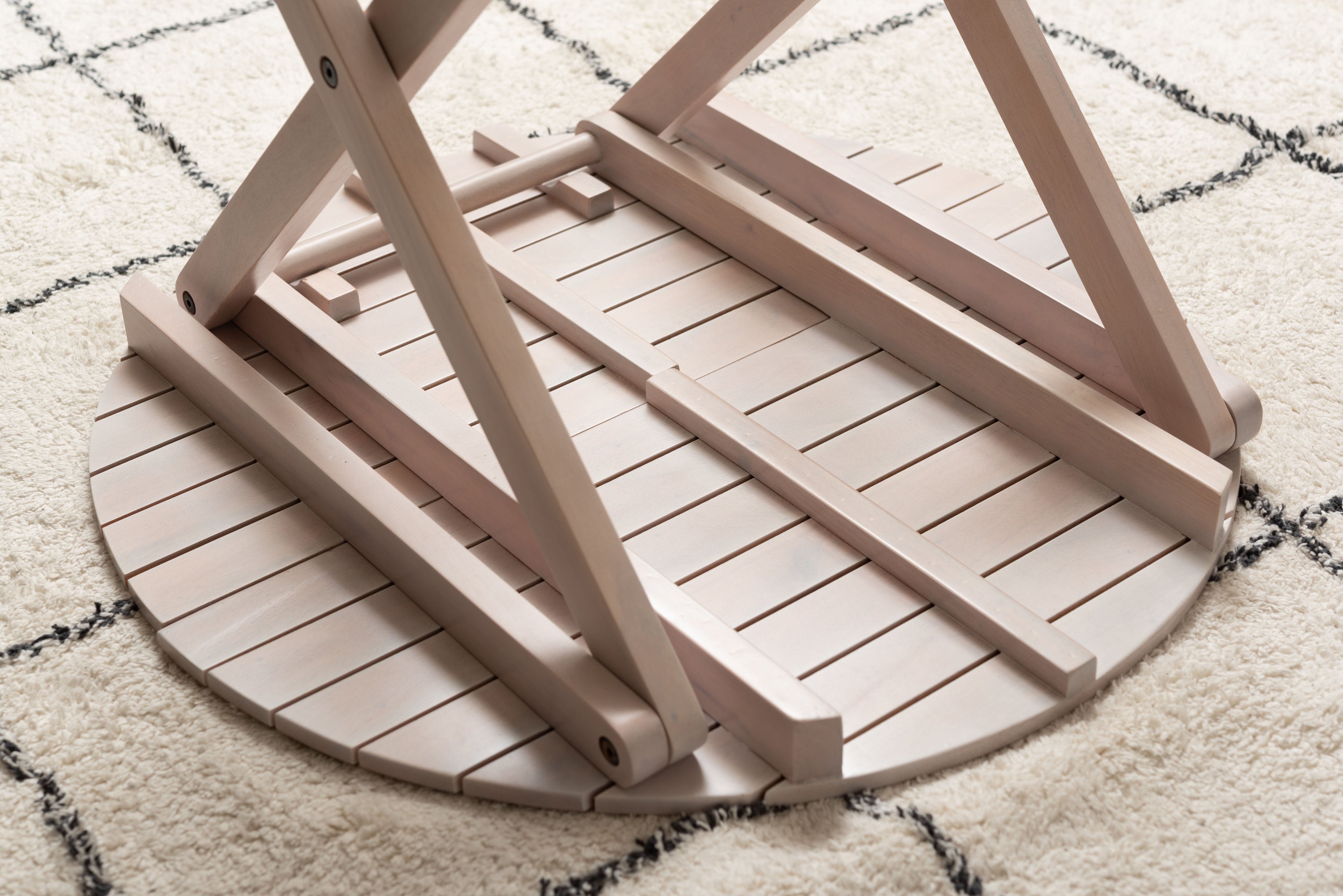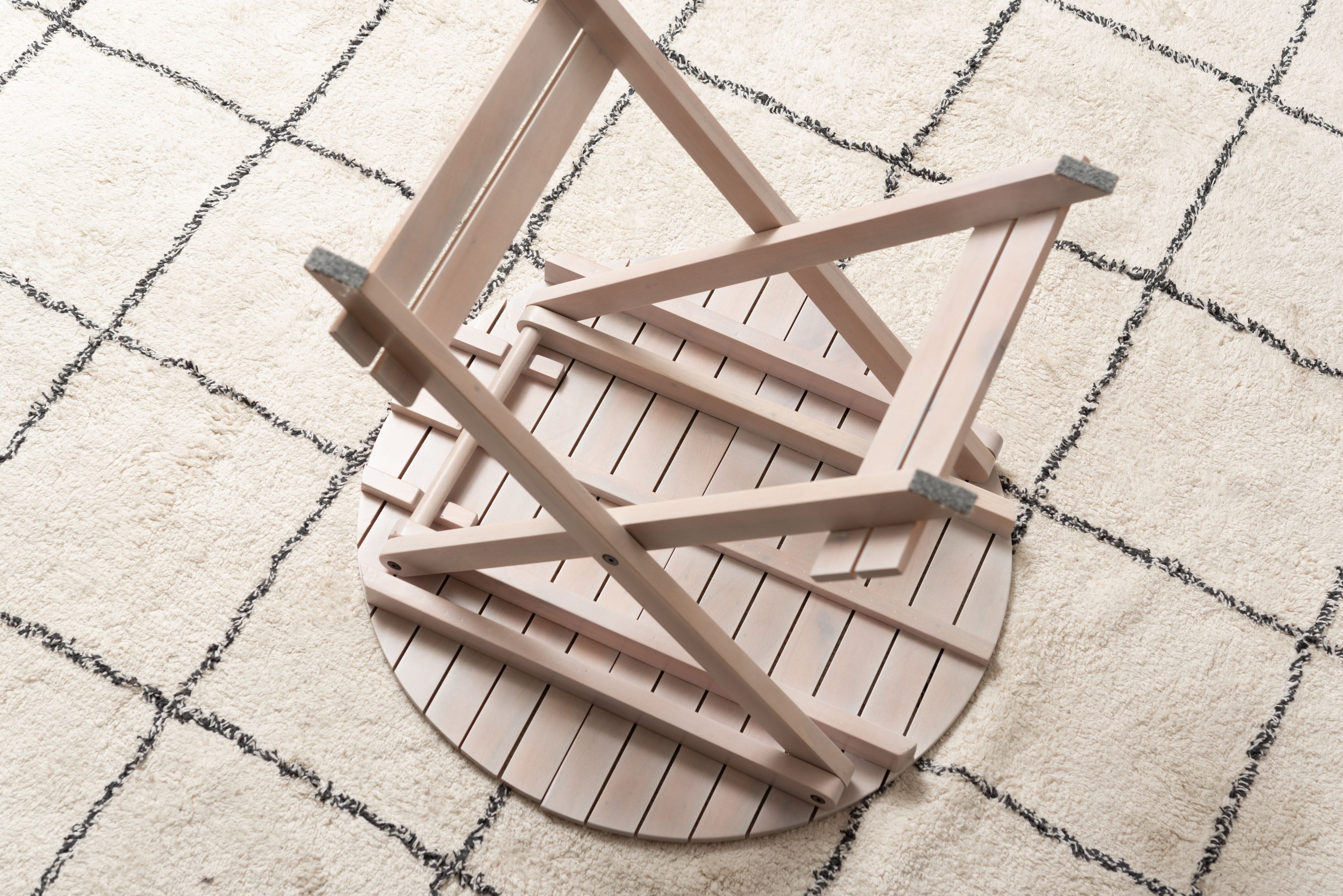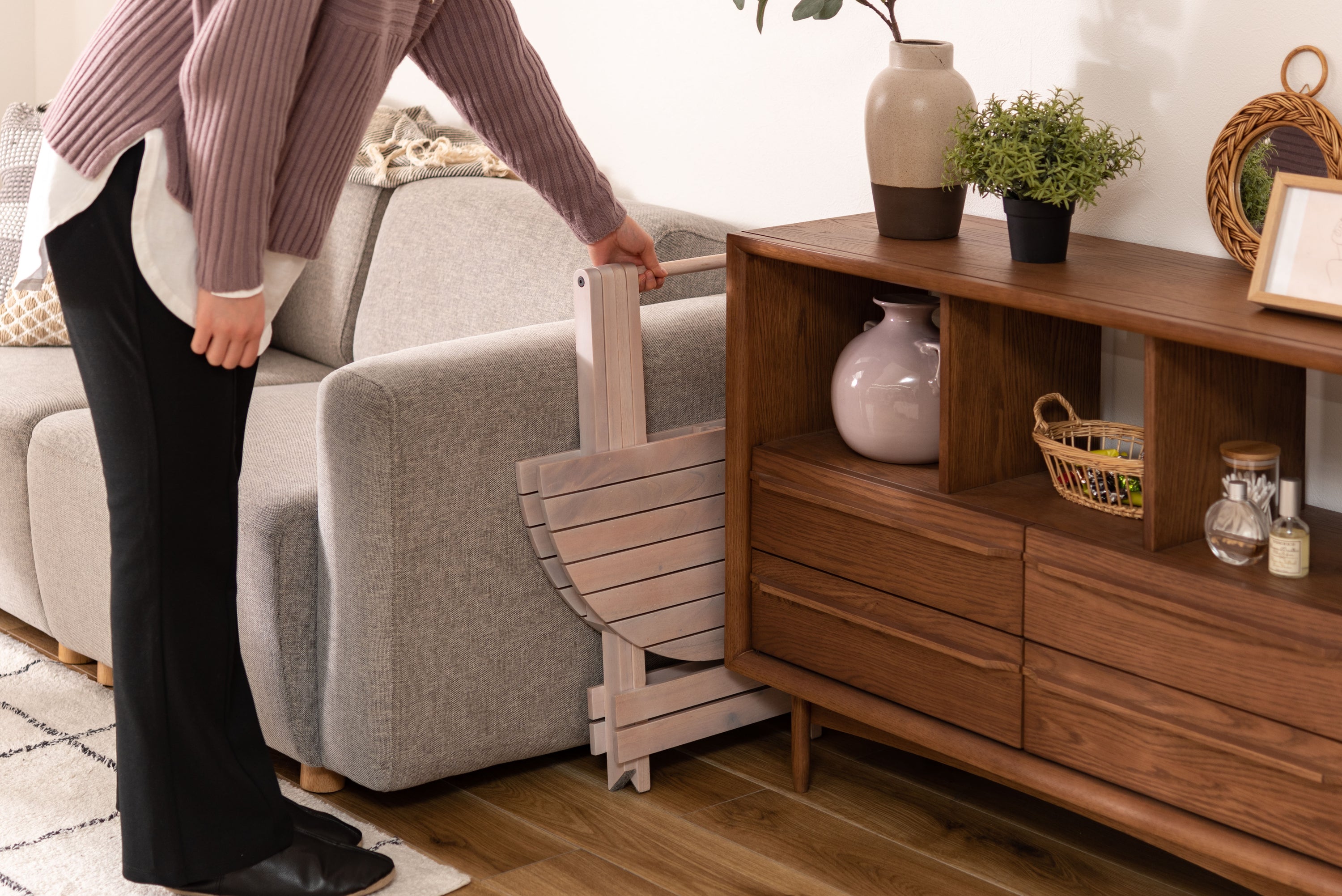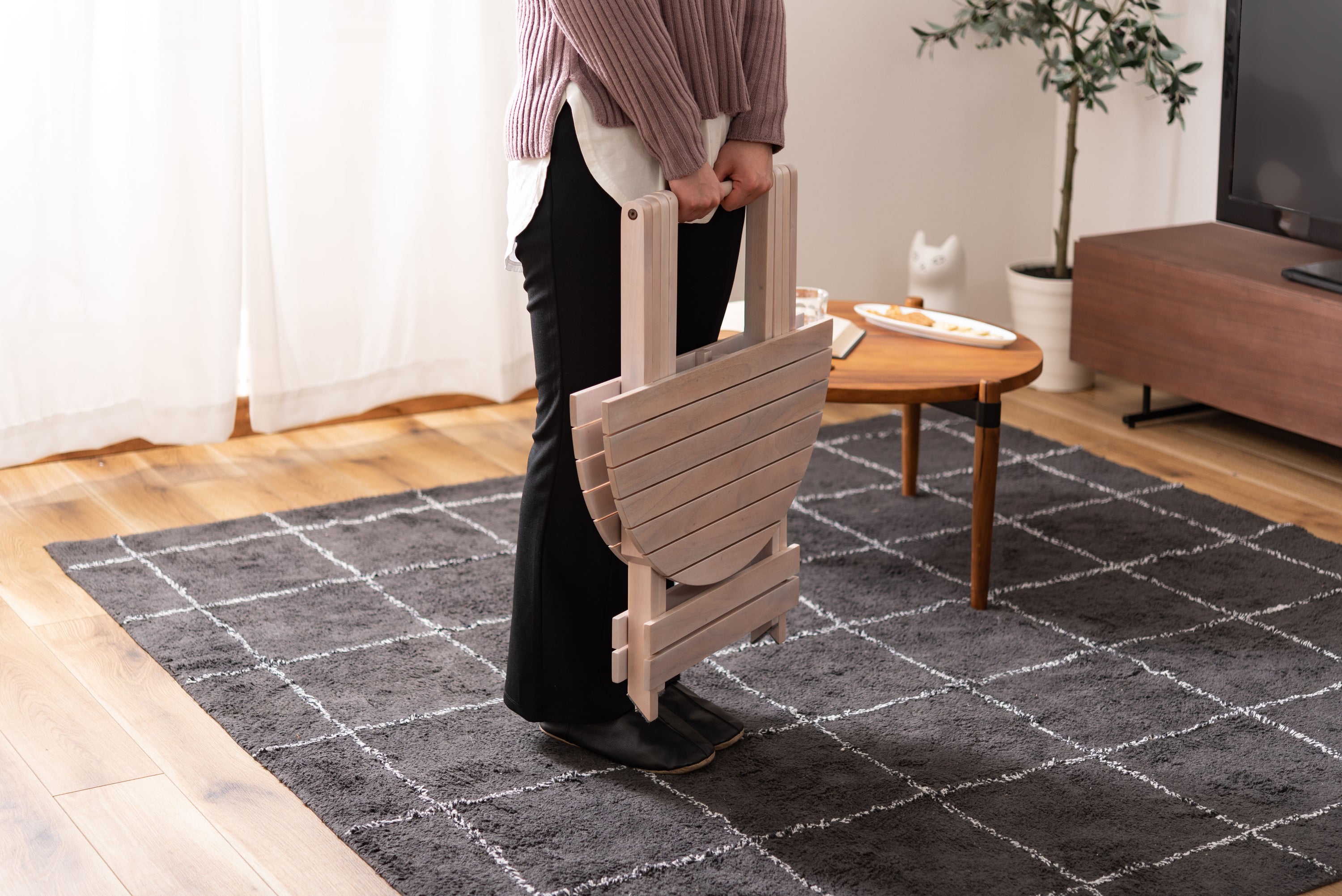 工具不要で簡単組み立て、ワンタッチで折りたためる便利なラウンドテーブル。折りたたみ時の“持ち手”で移動もしやすく、様々なシーンで大活躍。コンパクトでちょうどいいサイズ。大・小を組み合わせてネストテーブルとしても使えます。折りたたみ時の厚さは、Sサイズで5cm、Lサイズで6cmと薄型に。ベッド下やクローゼットなどの隙間に収納が可能。脚裏にはフェルトが付いているので床への傷防止にもなり安心です。