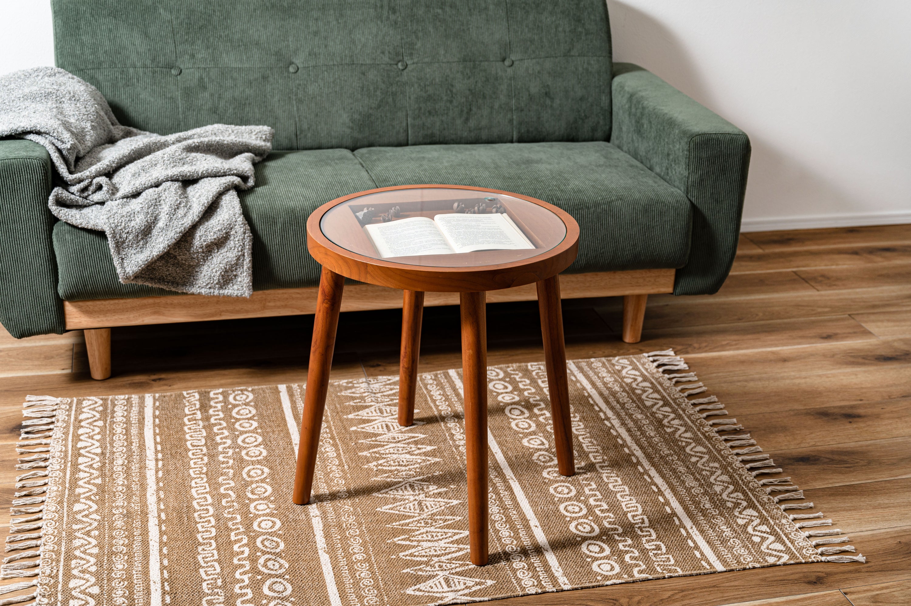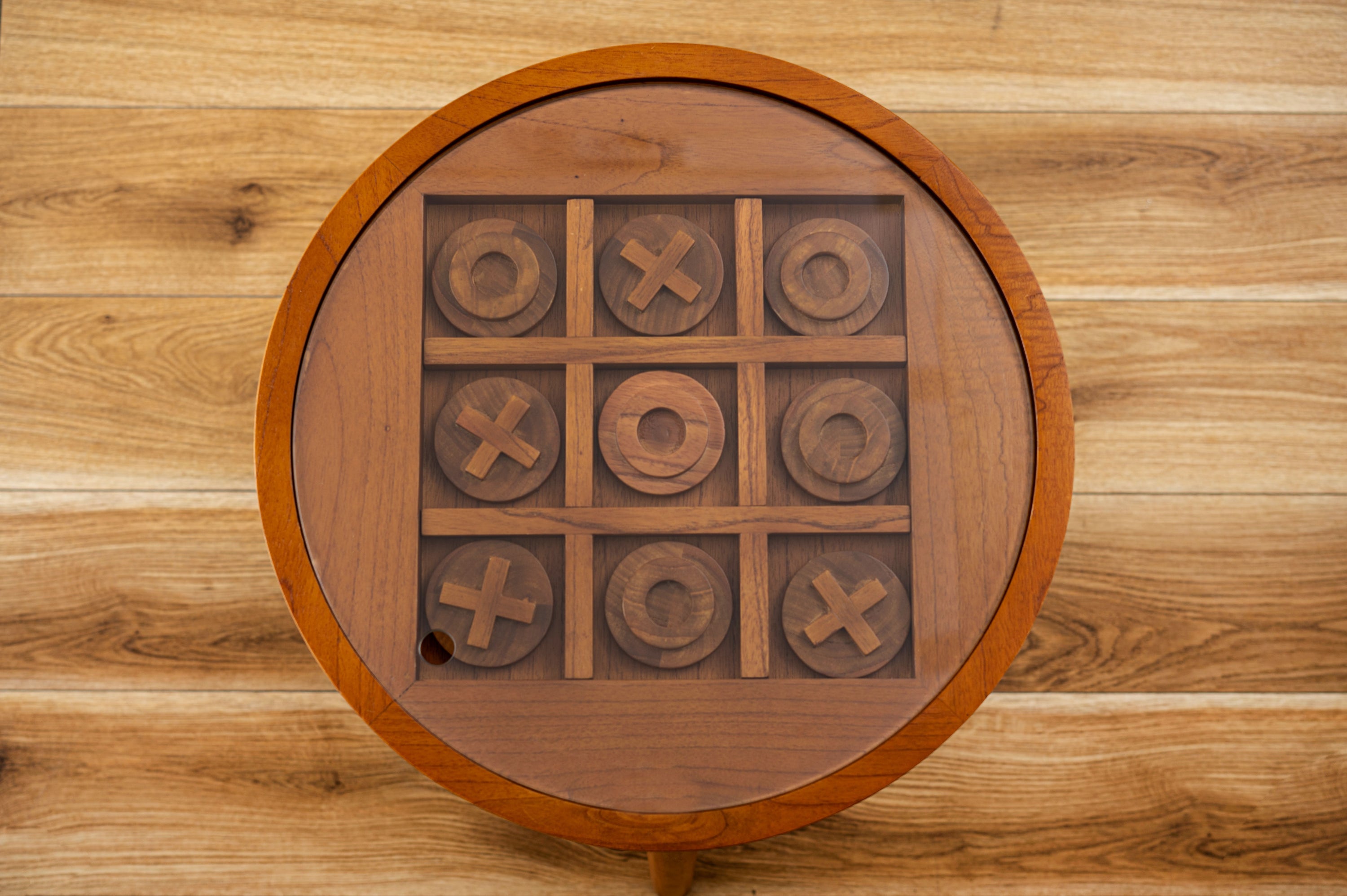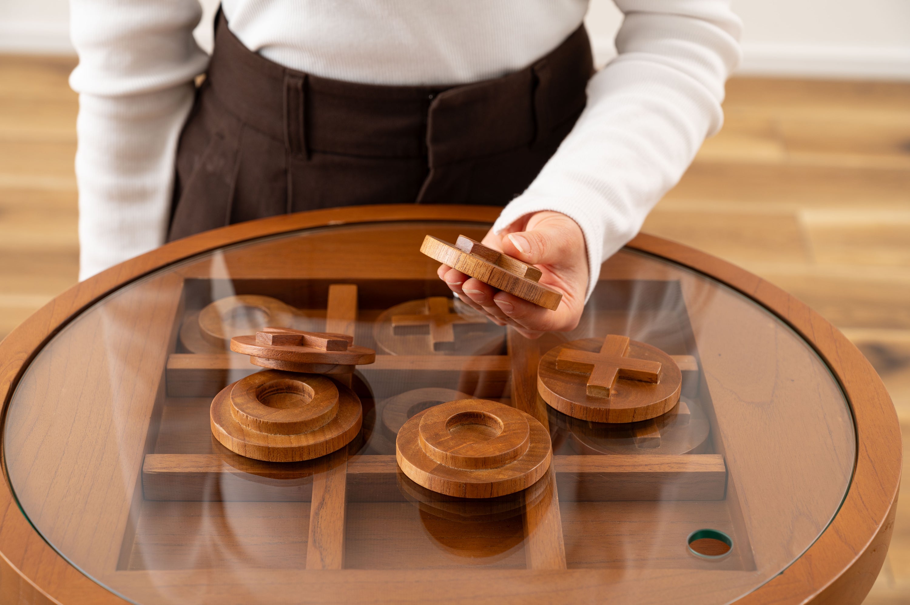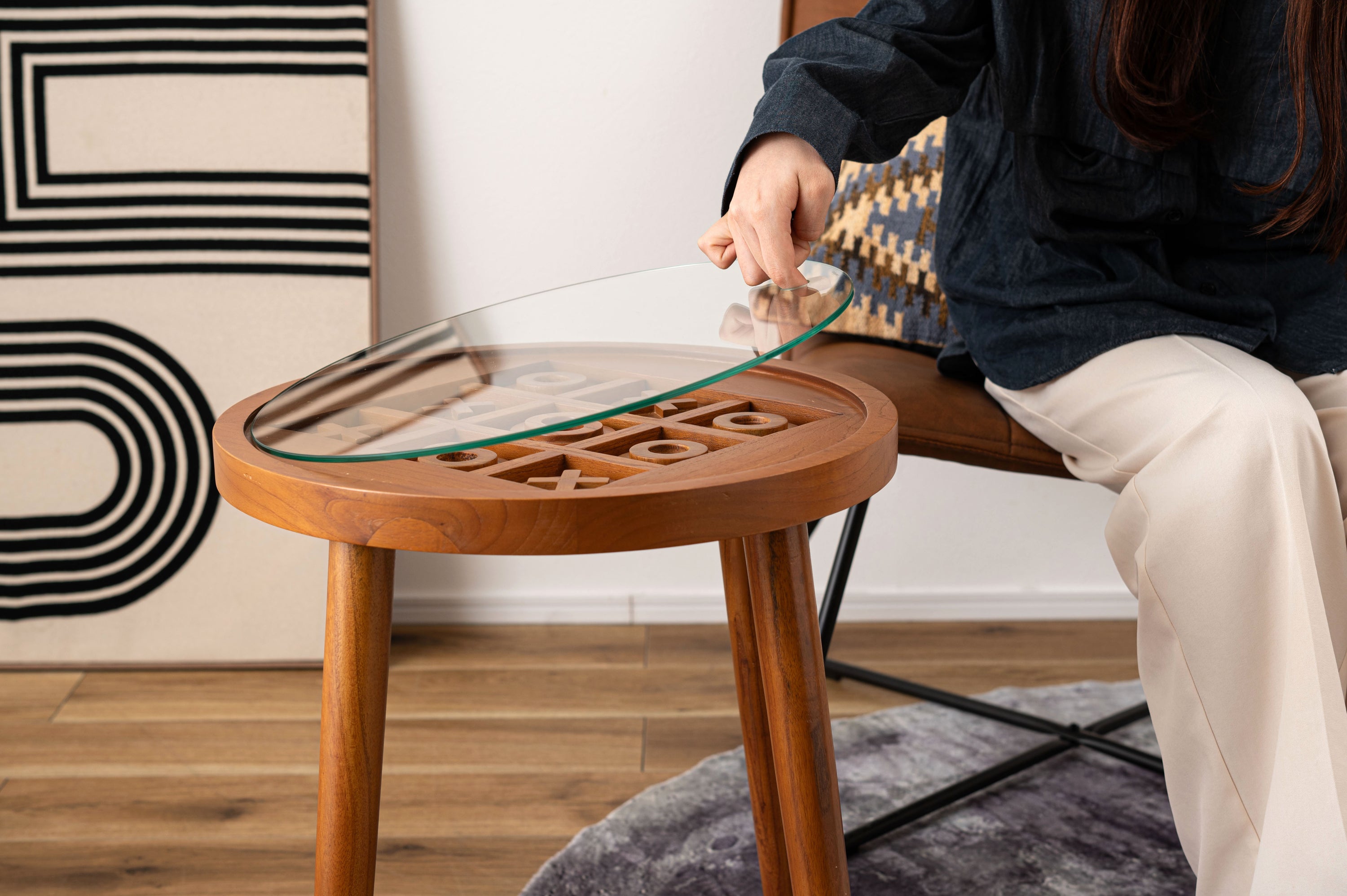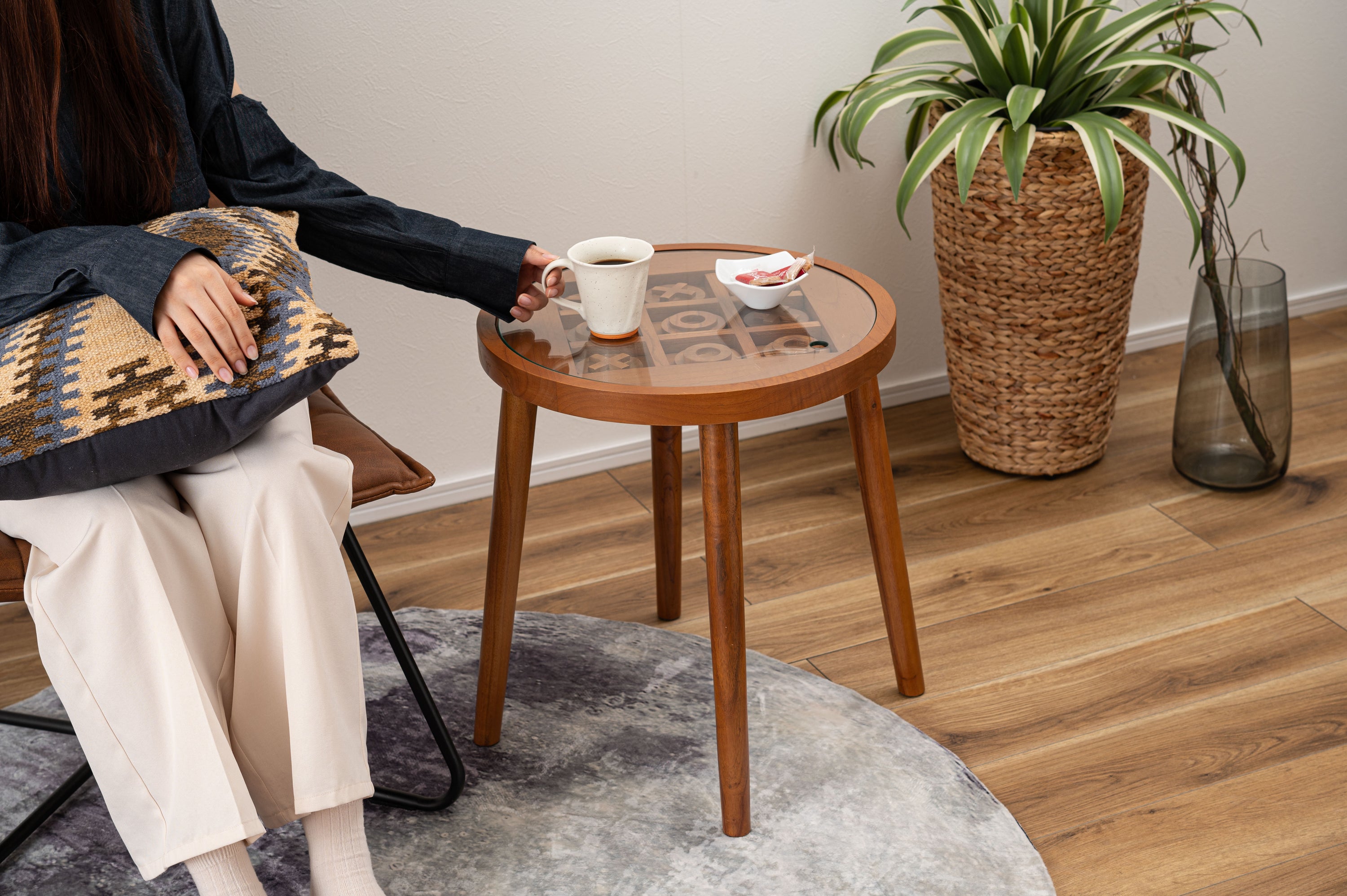 〇×ゲームのデザインを施したサイドテーブル。ガラス天板は取り外し可能なので、実際にゲームを楽しむことも可能。個性的で置くだけで目を引くアイテム。ソファ横やベッド横でサイドテーブルとして使いやすいサイズ感。仕切り板と〇×の駒付きで、天板でボードゲームが楽しめる仕様。ガラス板、仕切り共に取り外しが可能なのでお手入れも簡単。ガラス天板の下にお気に入りを並べてディスプレイテーブルとしても。※本製品は天然木を使用し一点一点手作業で作られたハンドクラフト製品の為、色や風合いに個体差がございます。