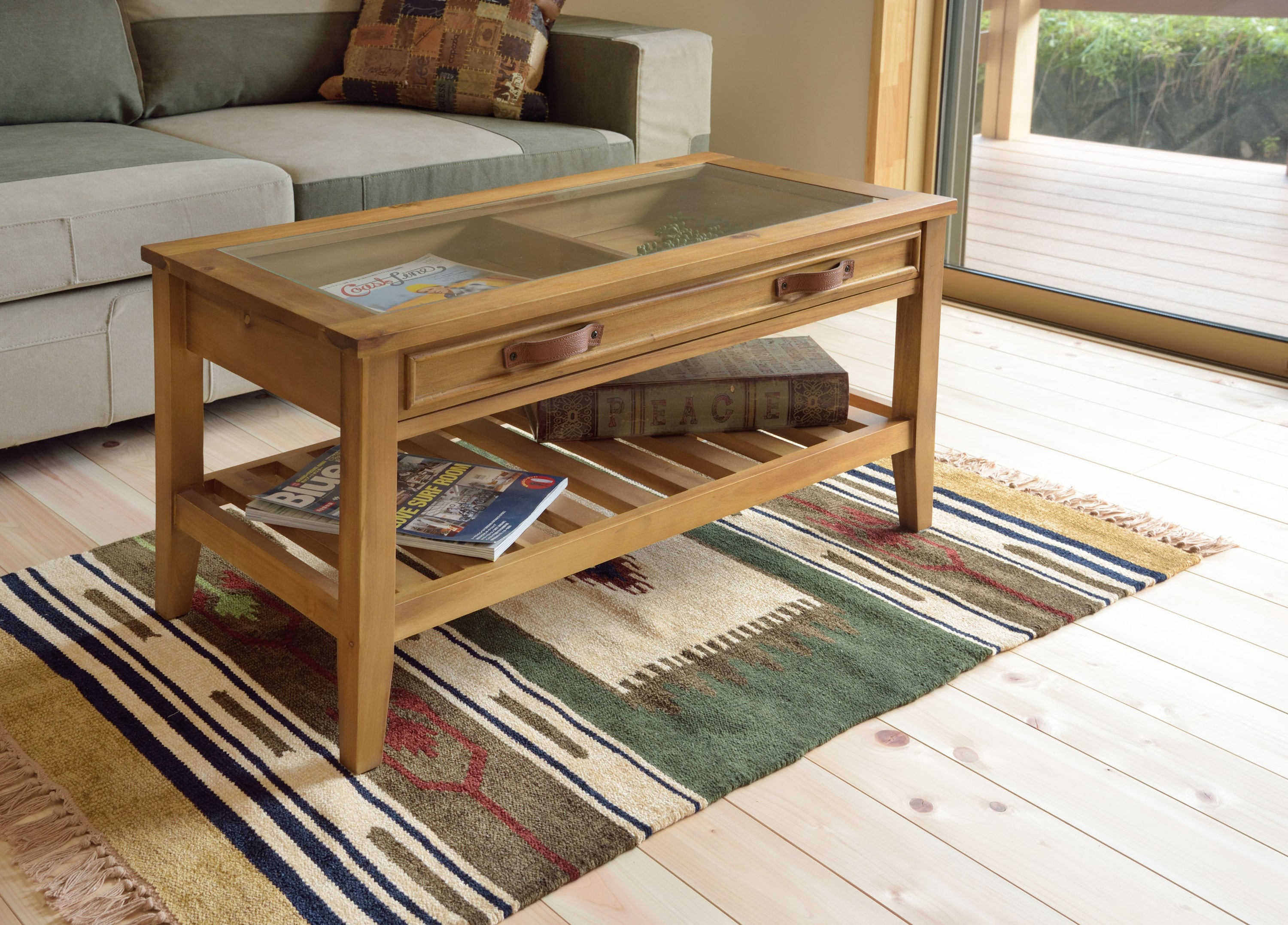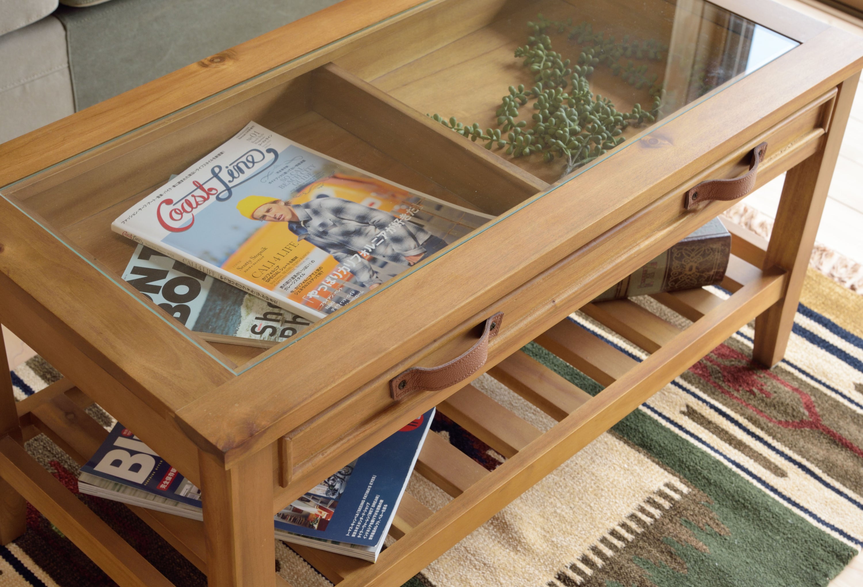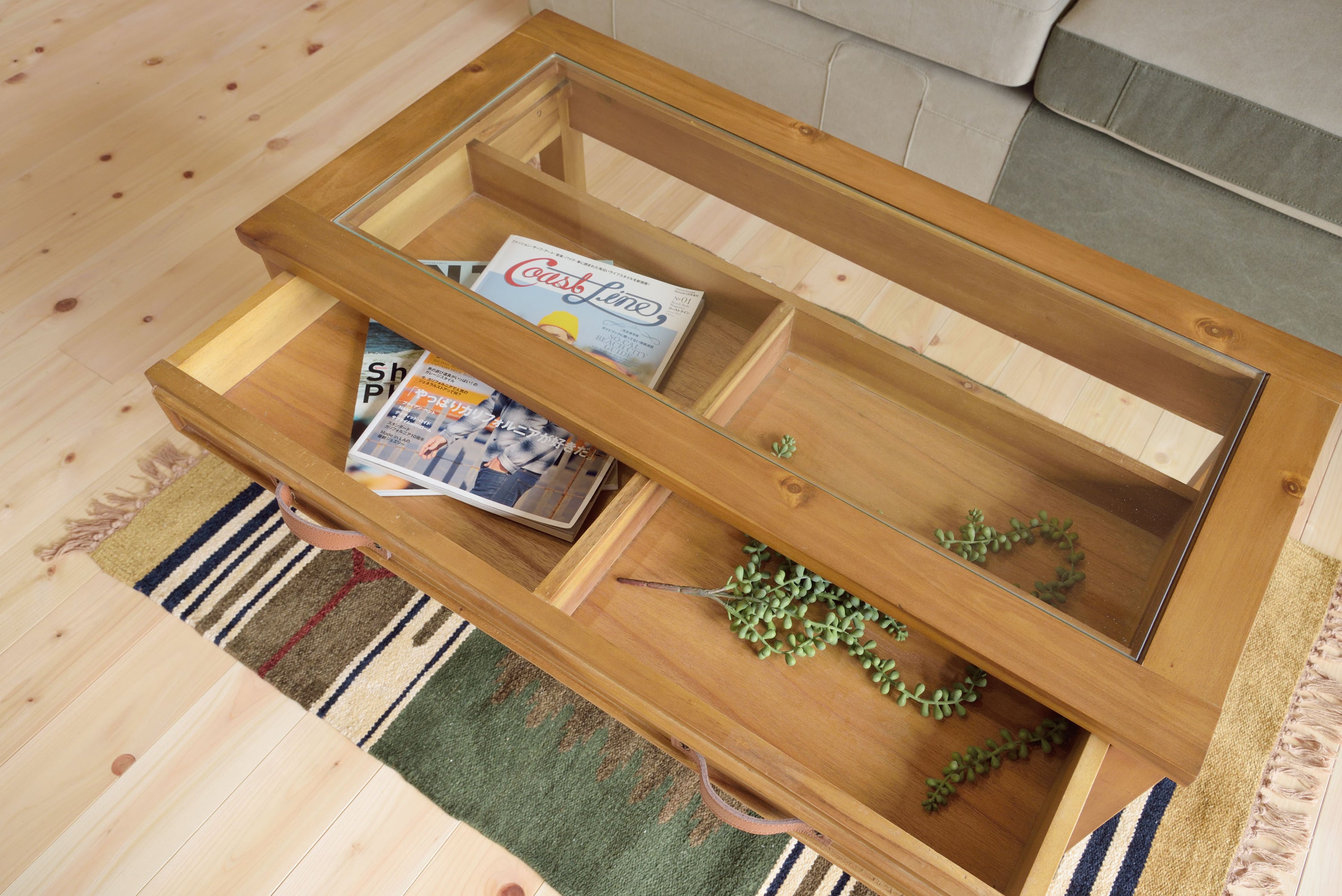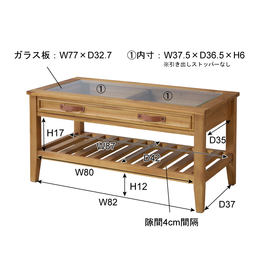 お気に入りをレイアウト。コレクションテーブル 天板にガラスを使用しているので、引出しにしまったものが見えるコレクションテーブル。 お気に入りのポストカードや雑貨を収納してディスプレイするのもよし、 雑誌やリモコンをオシャレに収納するのもよしな万能テーブルです。 引出しの下にすのこ状の棚もあるので、ティッシュなどを置くことができます。 見た目以上収納力が高いテーブルです。