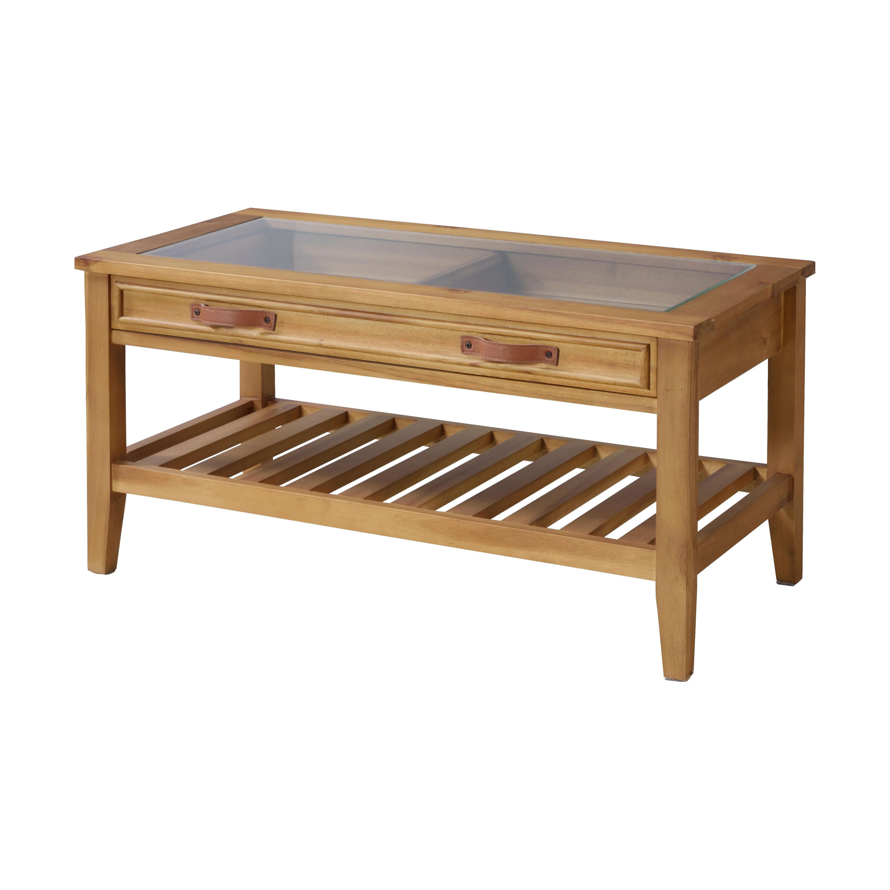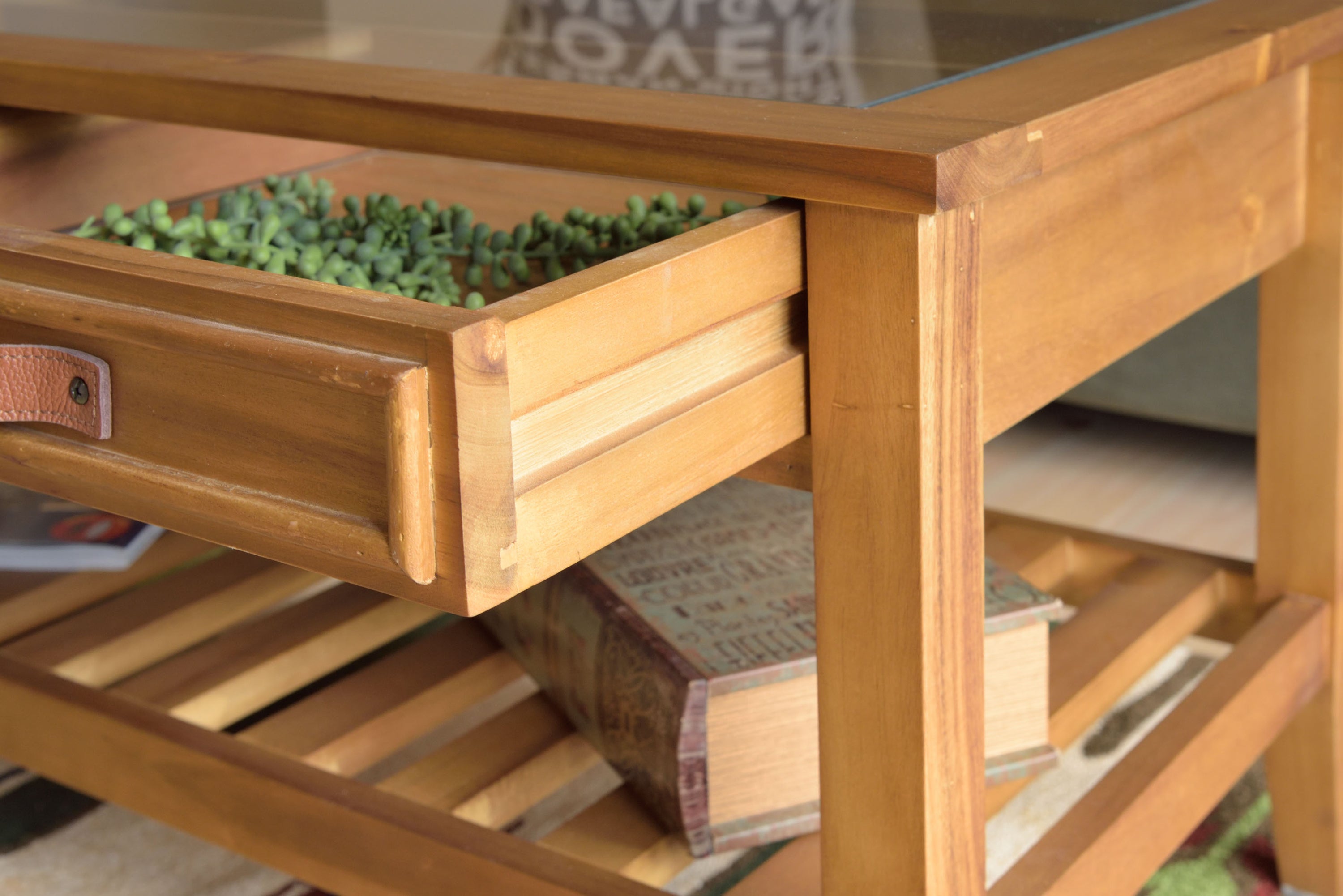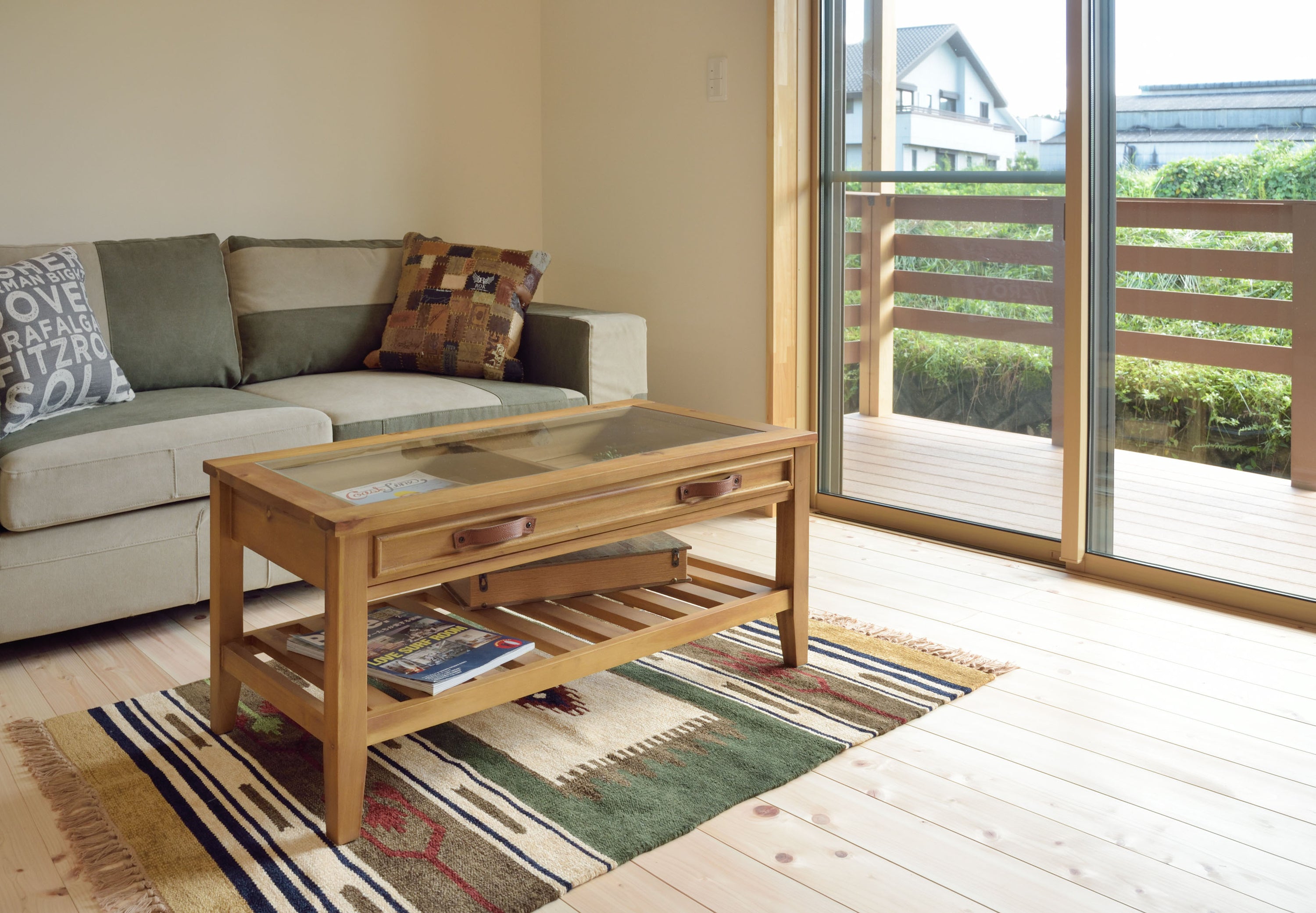 お気に入りをレイアウト。コレクションテーブル 天板にガラスを使用しているので、引出しにしまったものが見えるコレクションテーブル。 お気に入りのポストカードや雑貨を収納してディスプレイするのもよし、 雑誌やリモコンをオシャレに収納するのもよしな万能テーブルです。 引出しの下にすのこ状の棚もあるので、ティッシュなどを置くことができます。 見た目以上収納力が高いテーブルです。