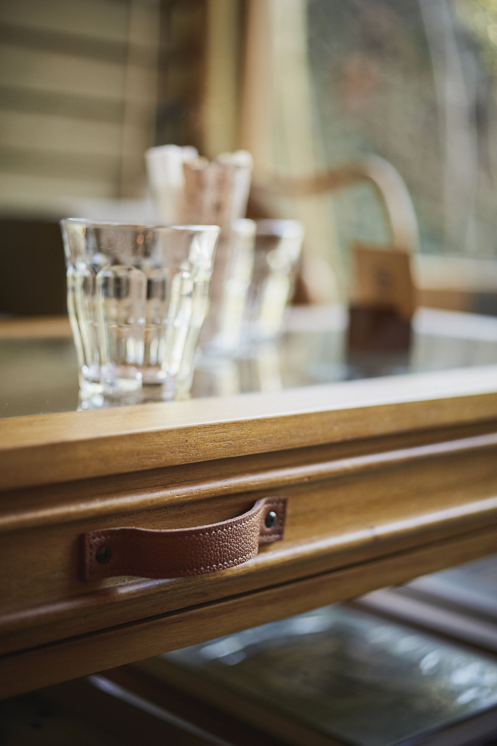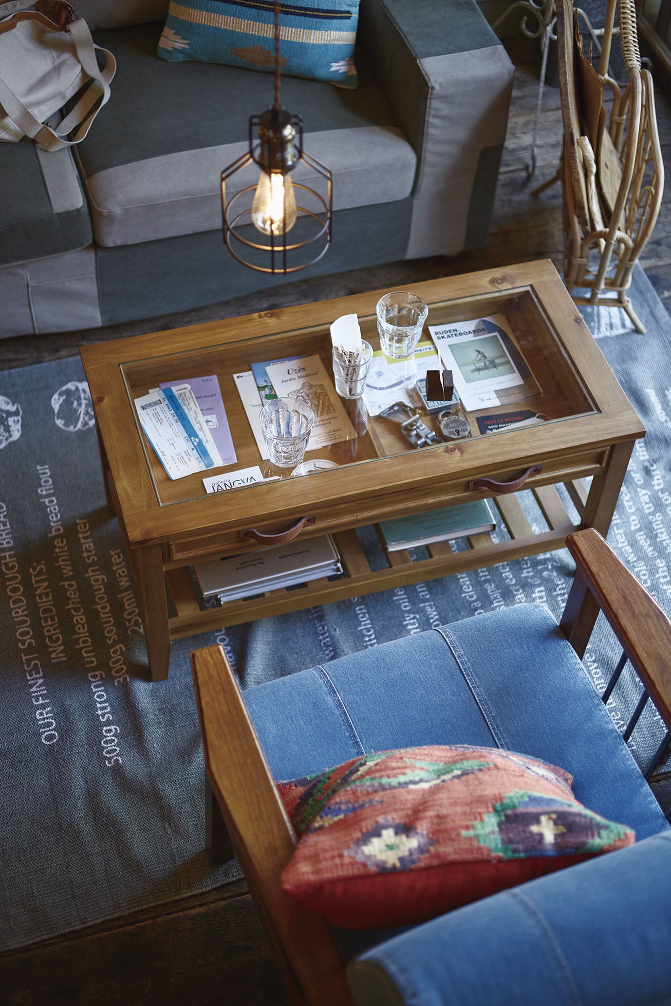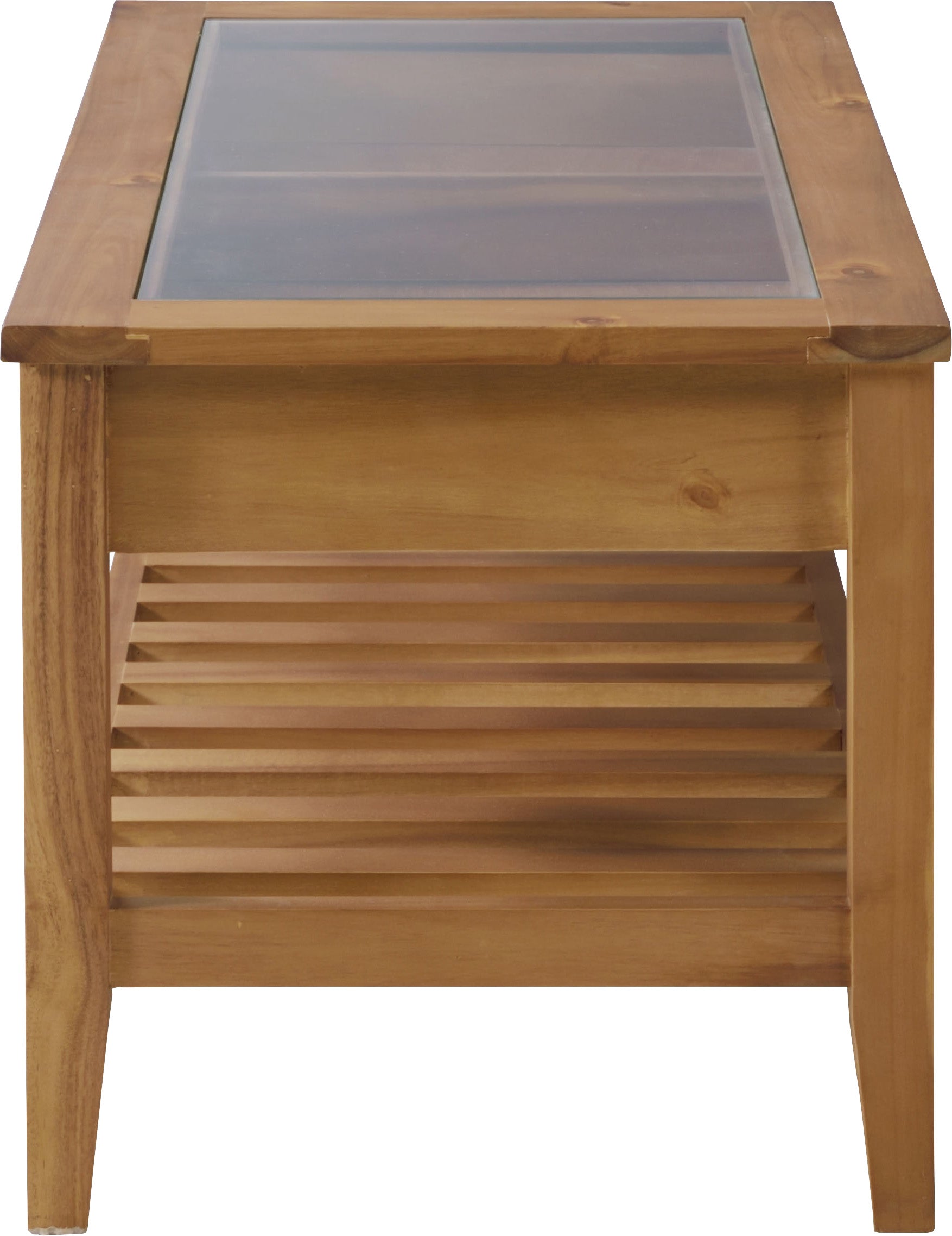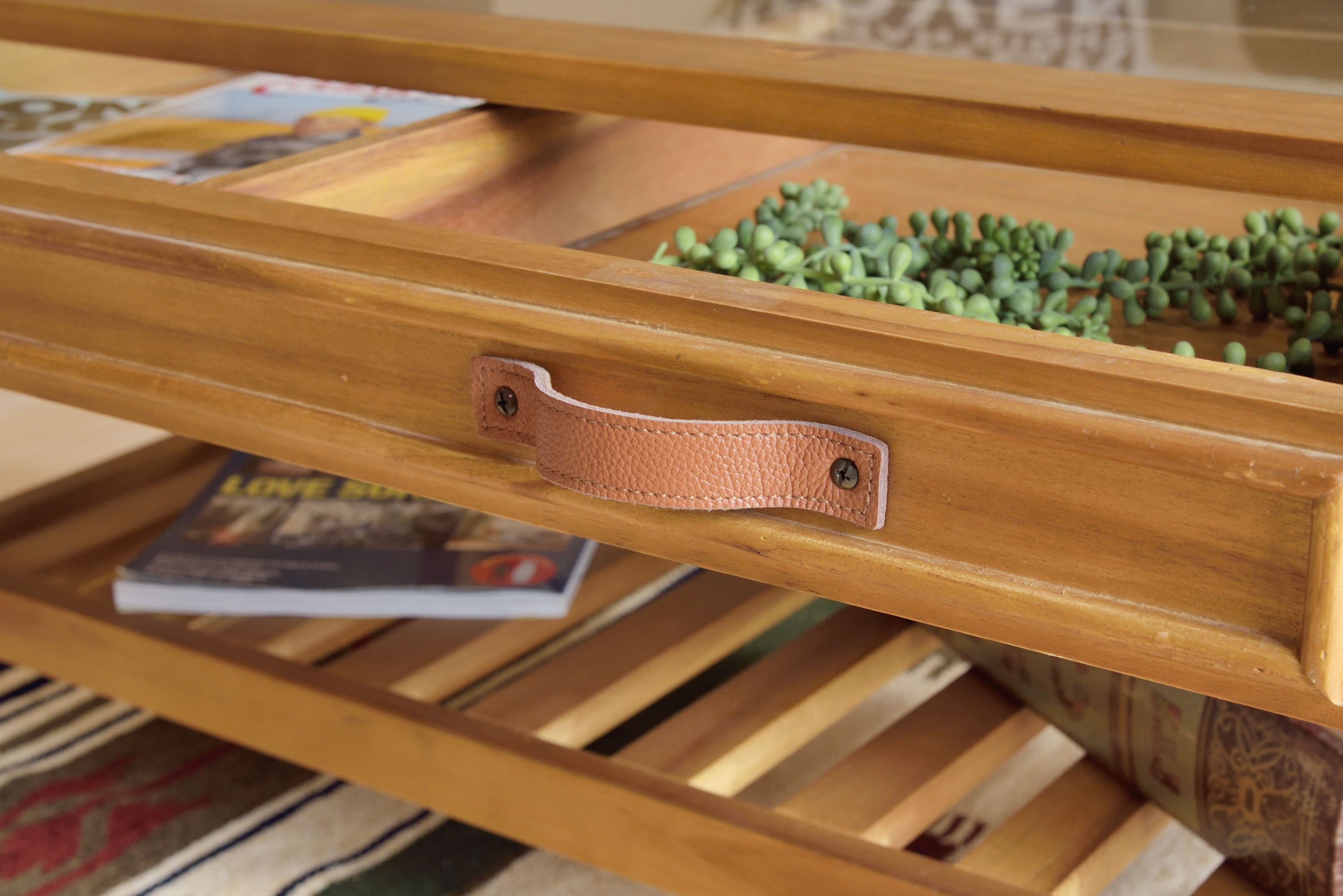 お気に入りをレイアウト。コレクションテーブル 天板にガラスを使用しているので、引出しにしまったものが見えるコレクションテーブル。 お気に入りのポストカードや雑貨を収納してディスプレイするのもよし、 雑誌やリモコンをオシャレに収納するのもよしな万能テーブルです。 引出しの下にすのこ状の棚もあるので、ティッシュなどを置くことができます。 見た目以上収納力が高いテーブルです。