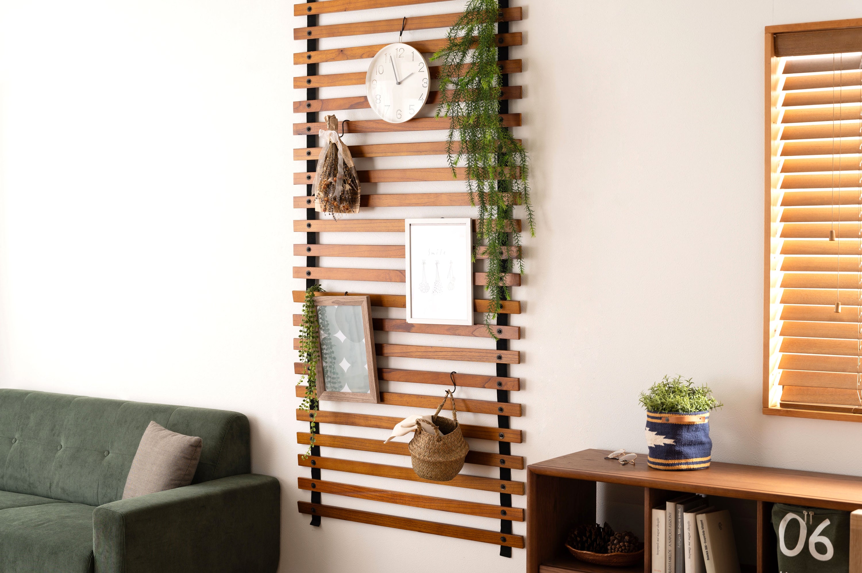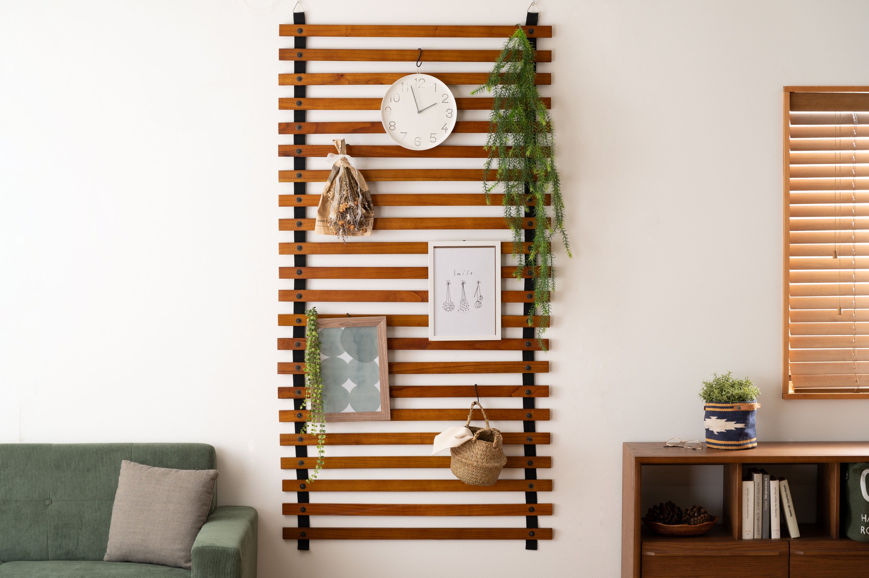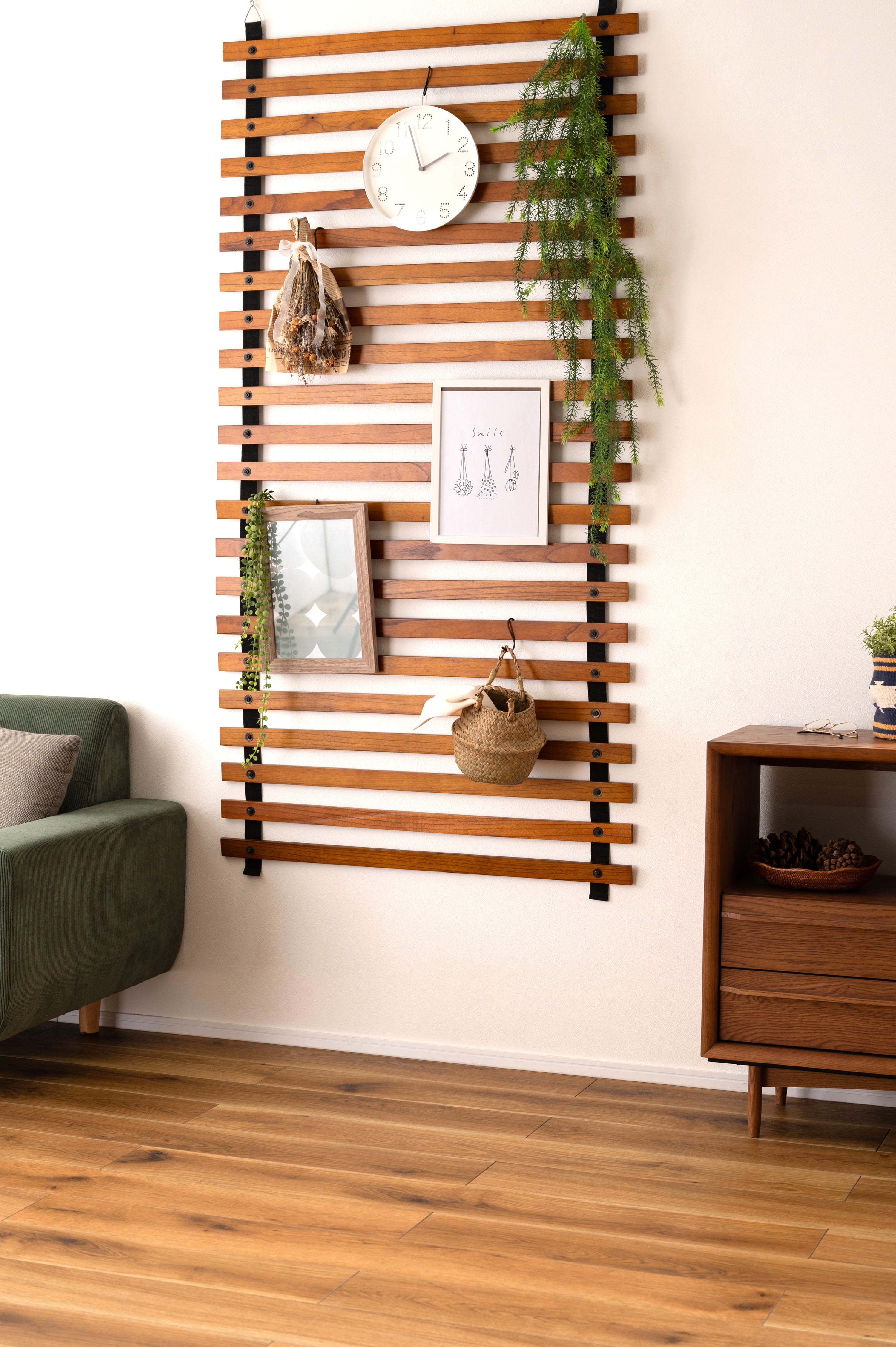 吊り下げて省スペースに設置できるパーテーション 天然木の雰囲気溢れるナチュラルなパーテーション。 空間を区切る間仕切りとして使うだけでなく、ディスプレイとしても活躍します。 自然な色味でどんなインテリアにも馴染みやすく、ウッドのぬくもりある風合いが空間にやさしさをプラスしてくれます。