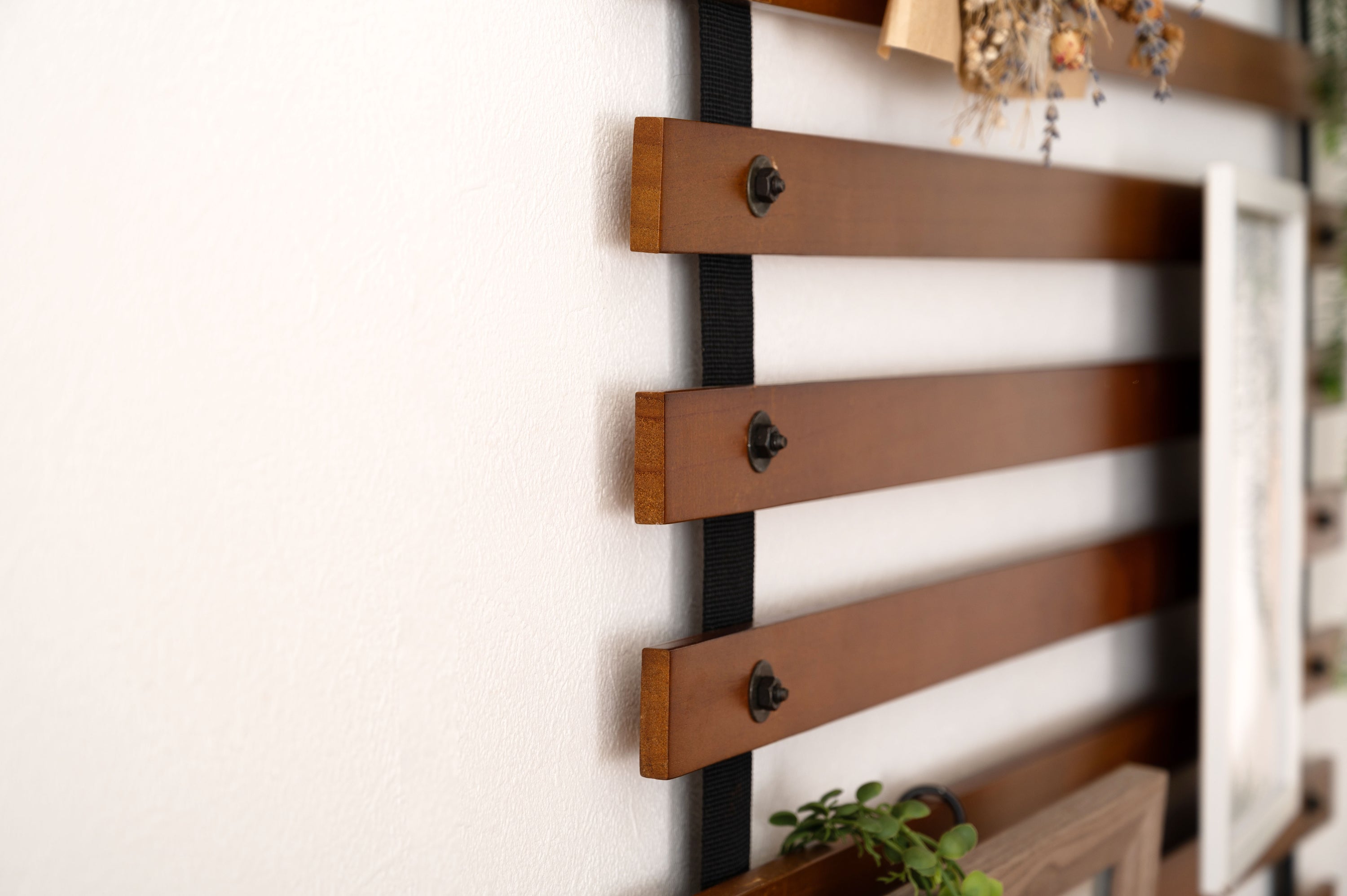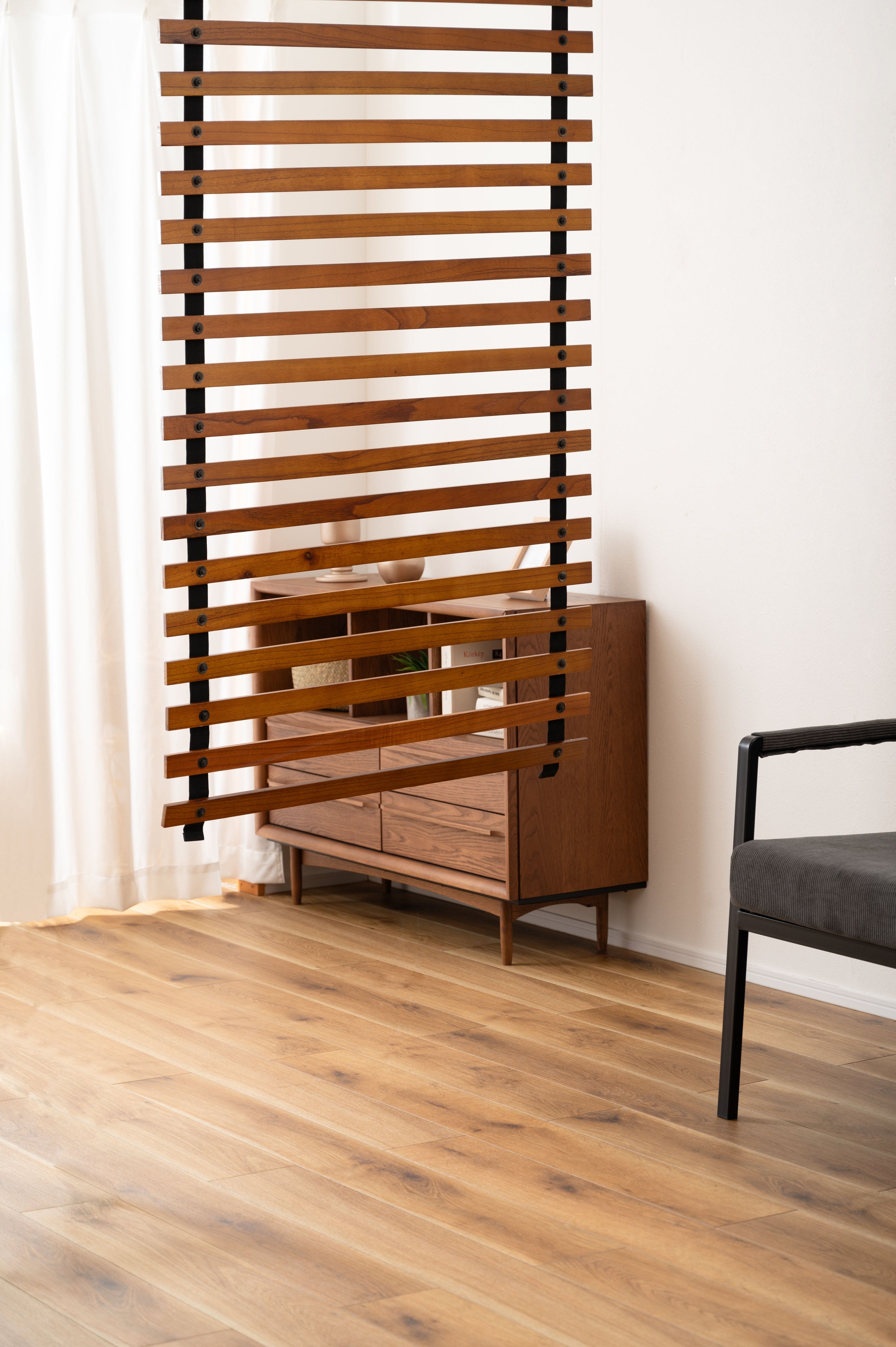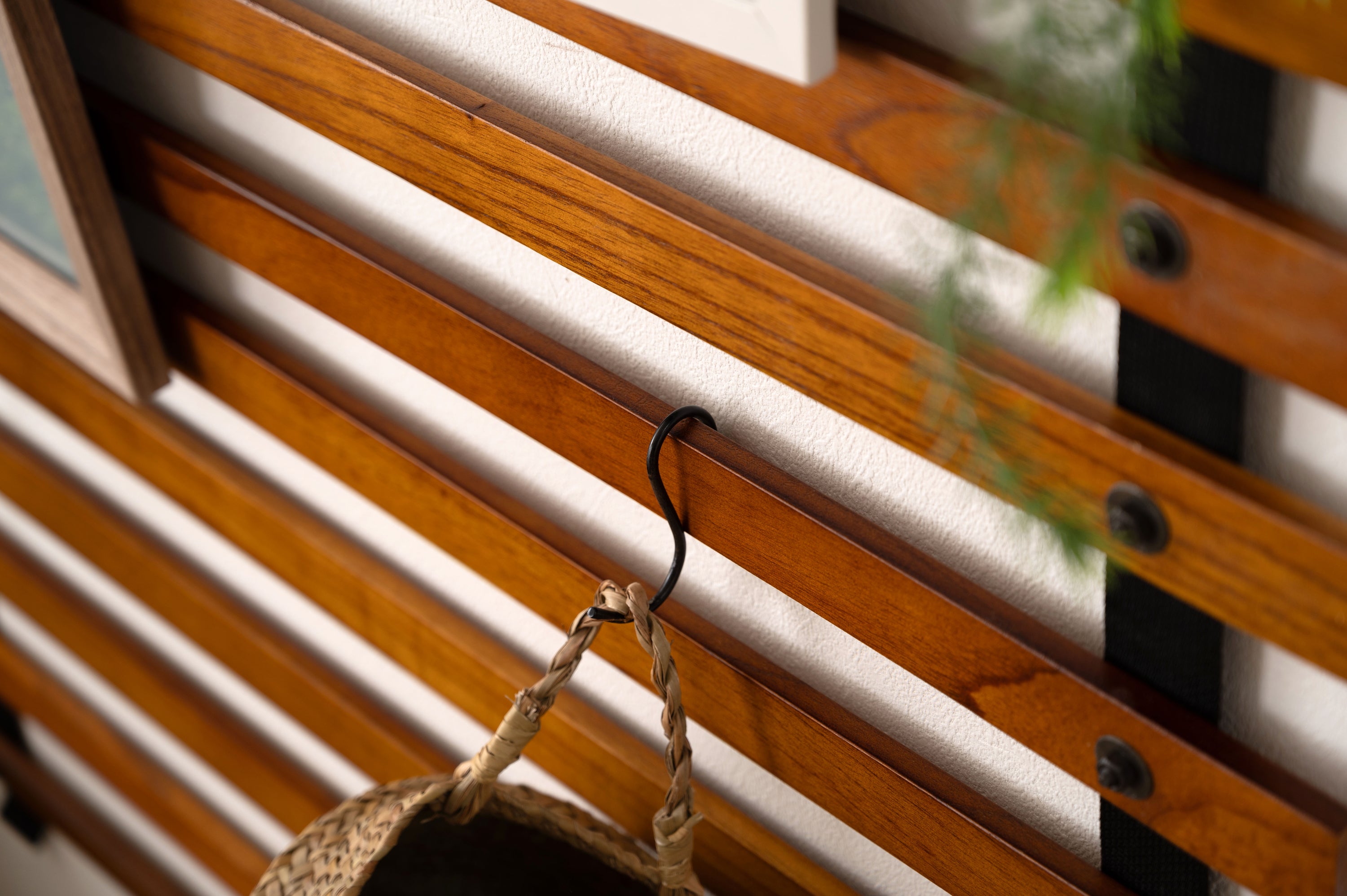 吊り下げて省スペースに設置できるパーテーション 天然木の雰囲気溢れるナチュラルなパーテーション。 空間を区切る間仕切りとして使うだけでなく、ディスプレイとしても活躍します。 自然な色味でどんなインテリアにも馴染みやすく、ウッドのぬくもりある風合いが空間にやさしさをプラスしてくれます。