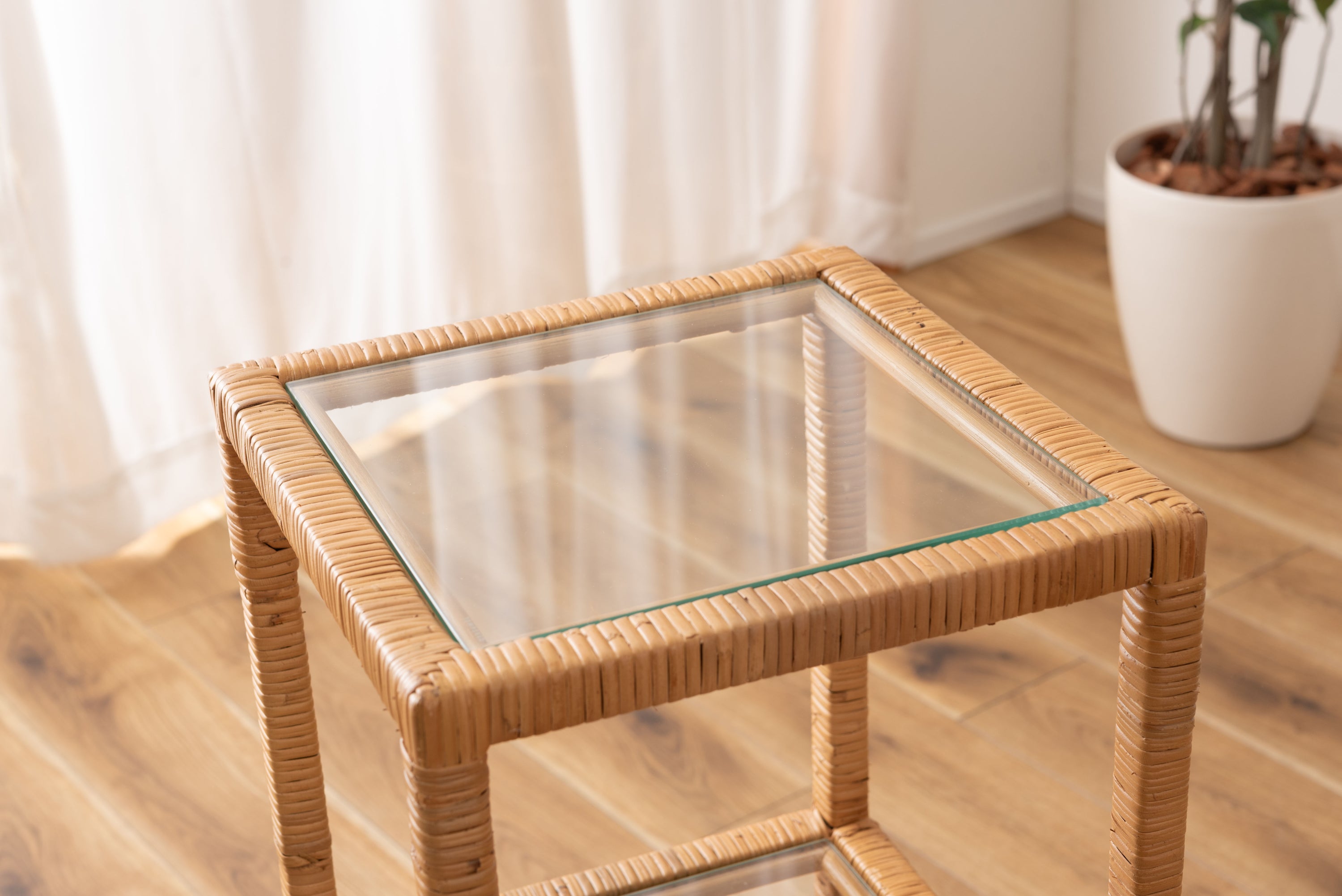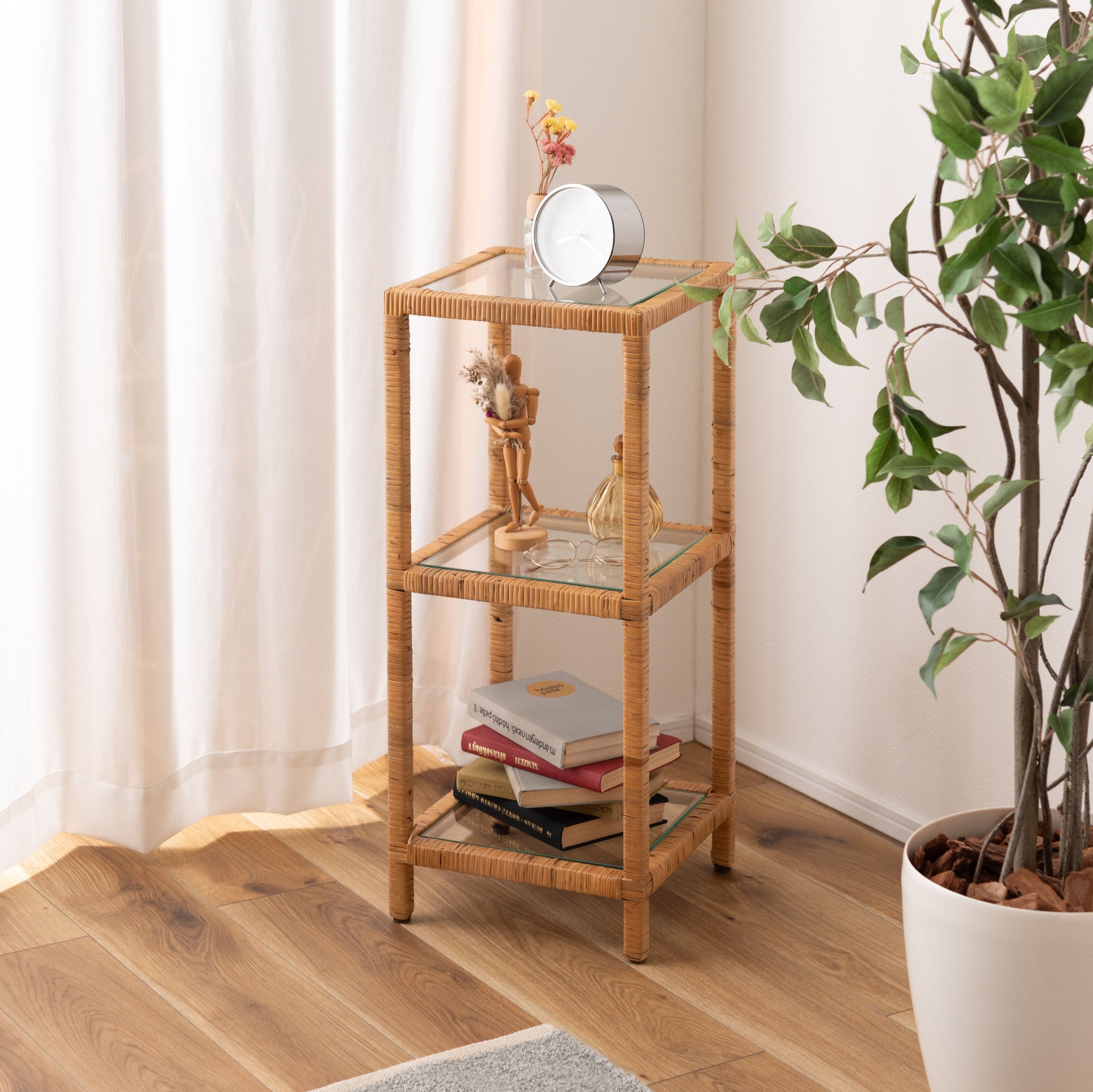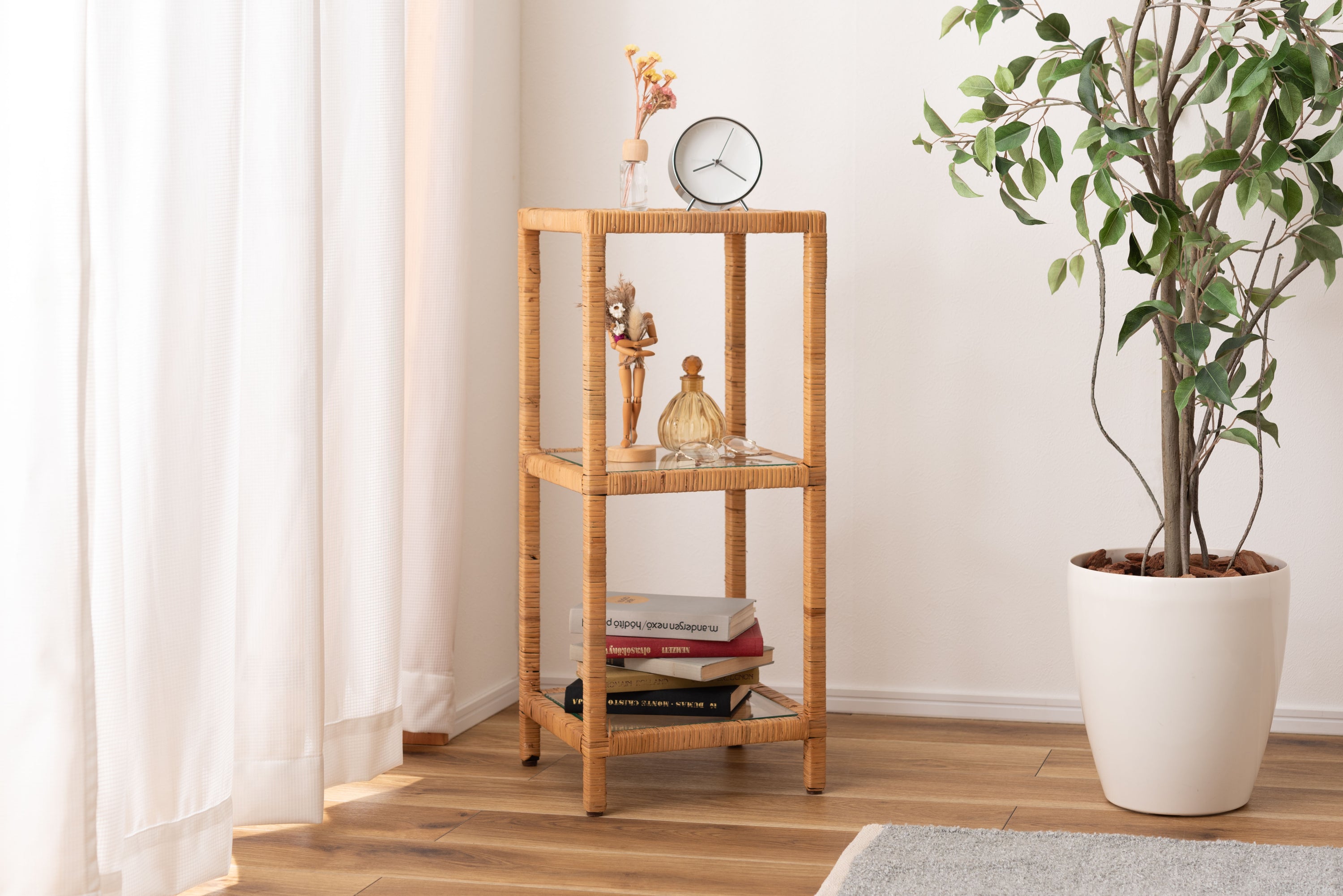 透明感が美しい取り外し可能なガラスと、スチールフレームに巻いた天然ラタンの相性がぴったりなガラスシェルフです。オープンタイプの為壁面に設置するだけでなく、お部屋の間仕切りとしてもご使用いただけます。リビングやベッドサイドだけでなく、ディスプレイ台としても活躍します。