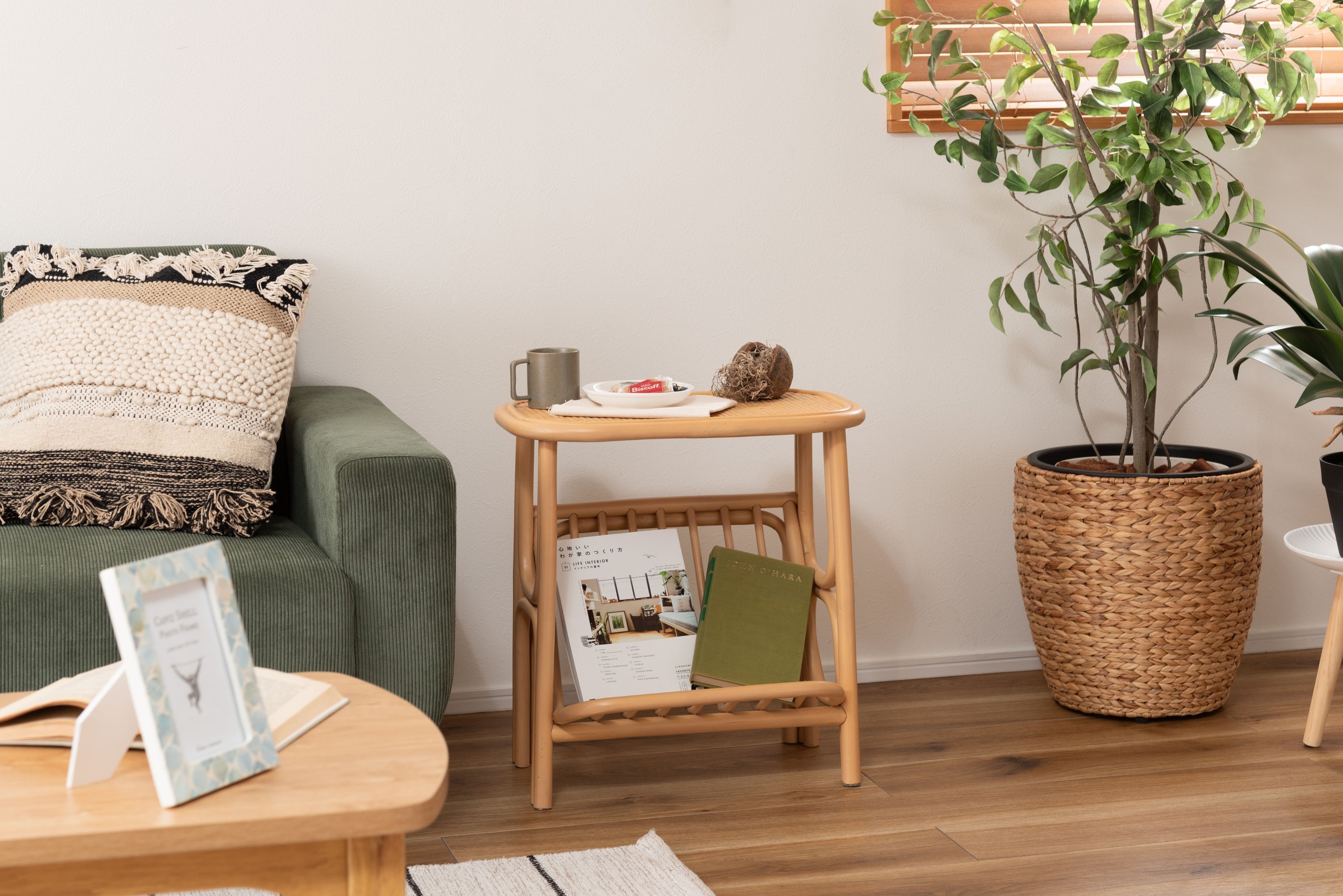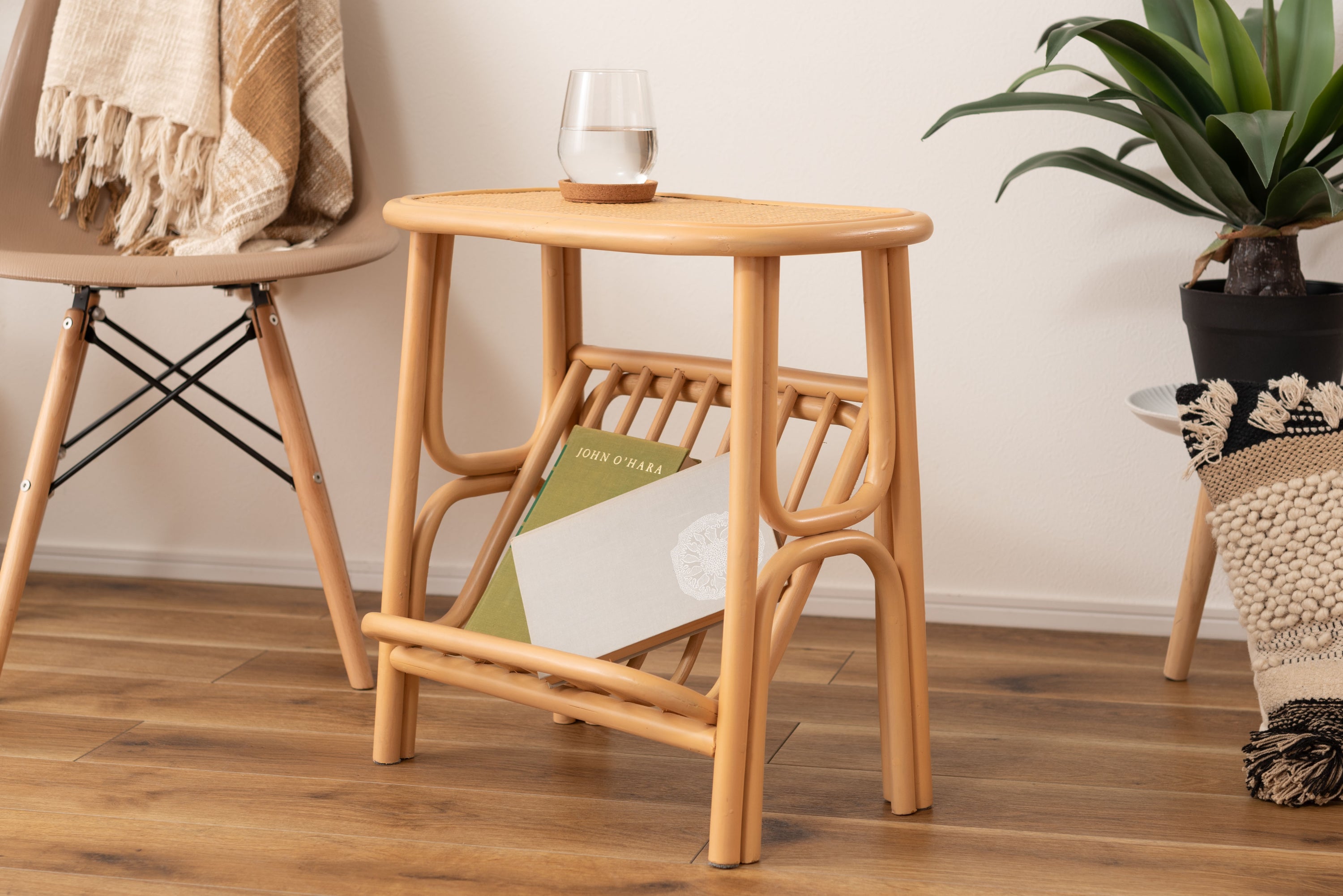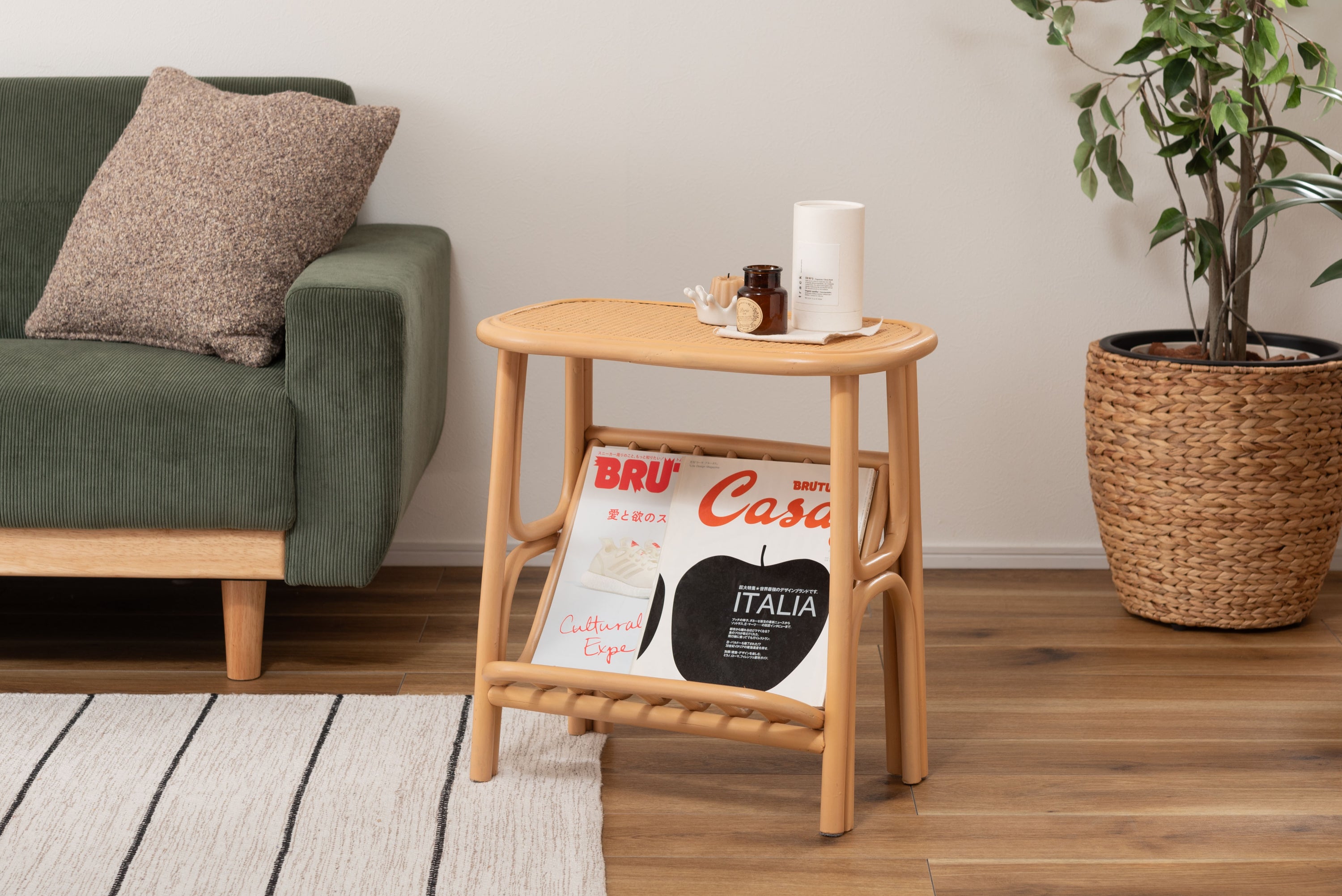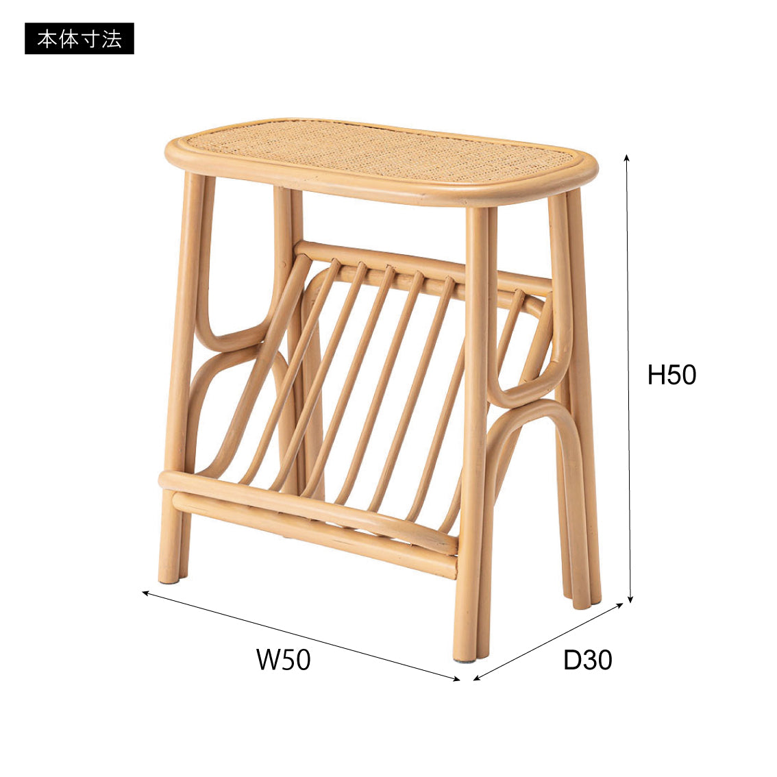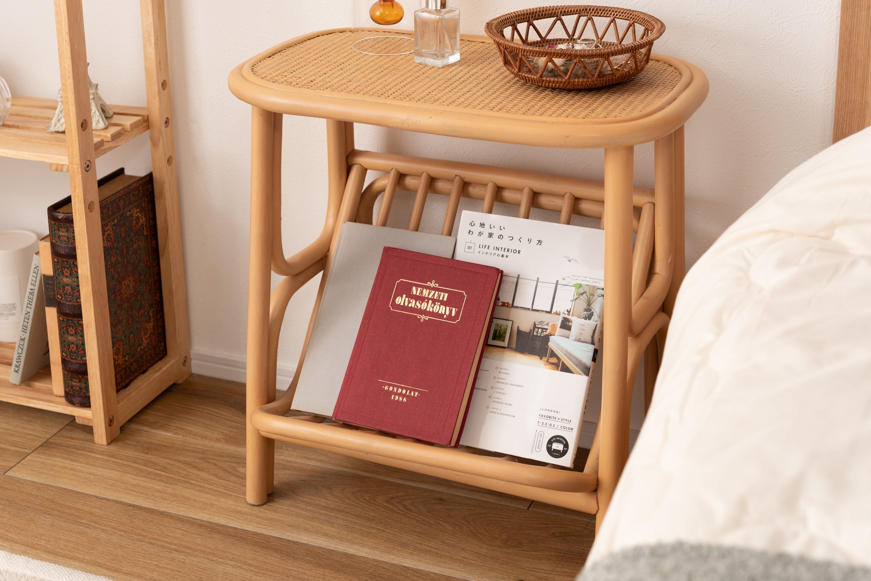 天然ラタンを使用したマガジンラック付きサイドテーブル。ソファ横やベッド横に置いてサイドテーブルとして使いやすい高さ設計。お気に入りの雑誌や、すぐに取り出したい小物などを置いておくのに便利なラック付き。玄関先に置いてスリッパラック兼小物置きとしても。軽くて丈夫な天然ラタンを使用し、ひとつひとつ表情が違う個体差も魅力の一つ。※個体差あり。本製品は天然ラタンを使用しておりますので、色や風合いに一点一点個体差がございます。また、とげ状のささくれ(網目の繋ぎ目なども含)ができることがあります。身体や衣服などを傷つけないようにご注意ください。尚、ささくれは使い込んでいく過程でも発生することもございます。はさみ等で取り除くか、ボンドなどで固定いただいてご使用ください。