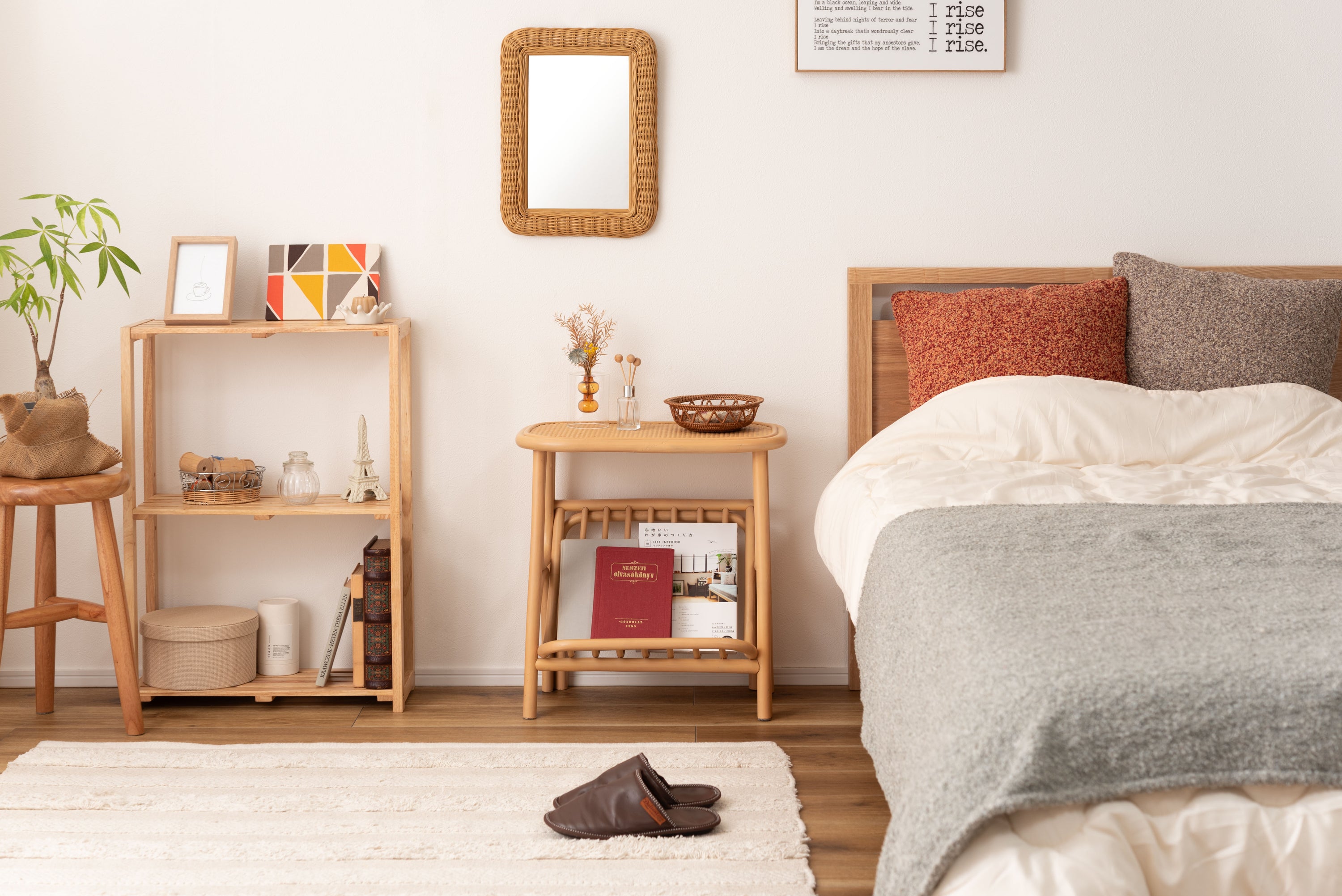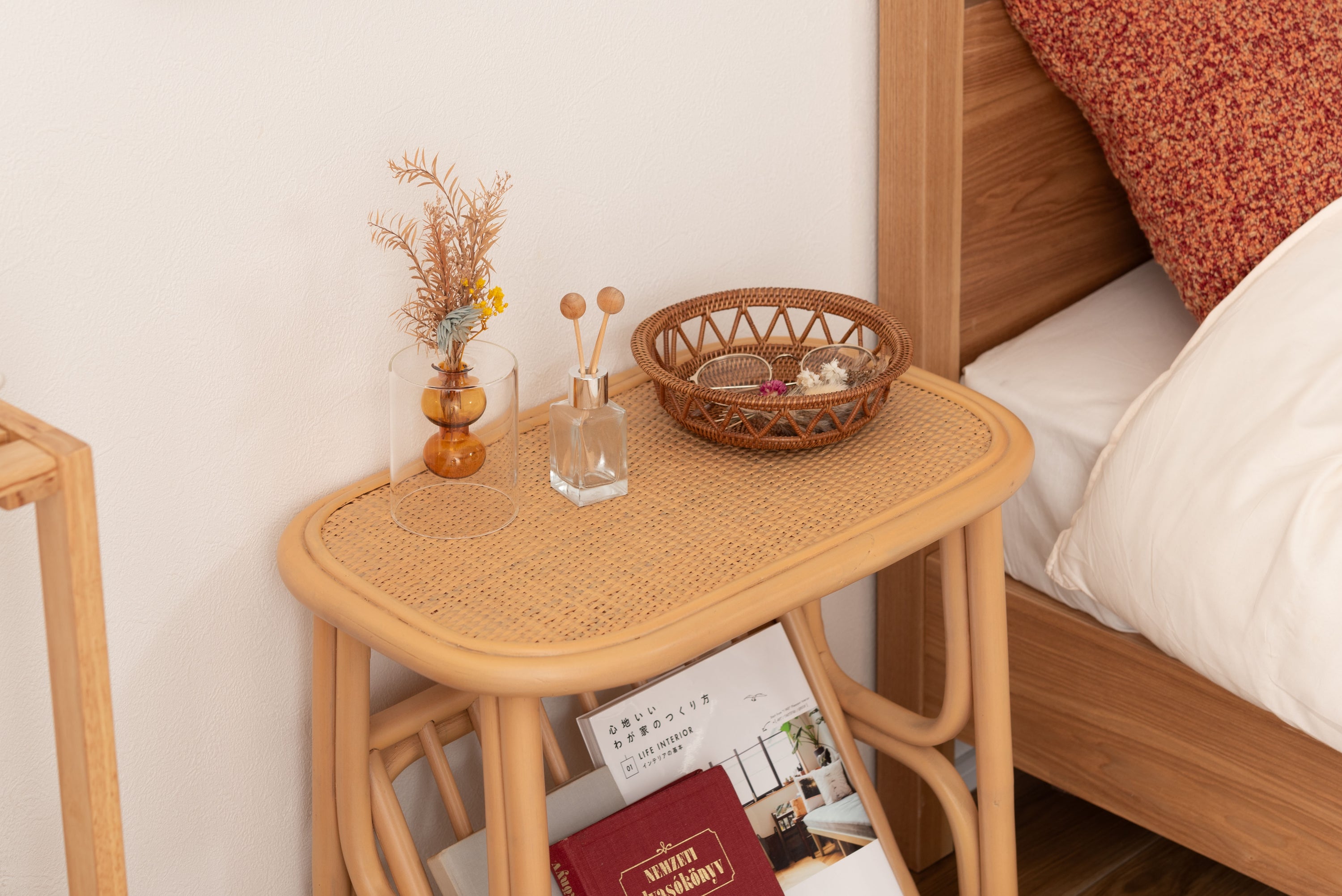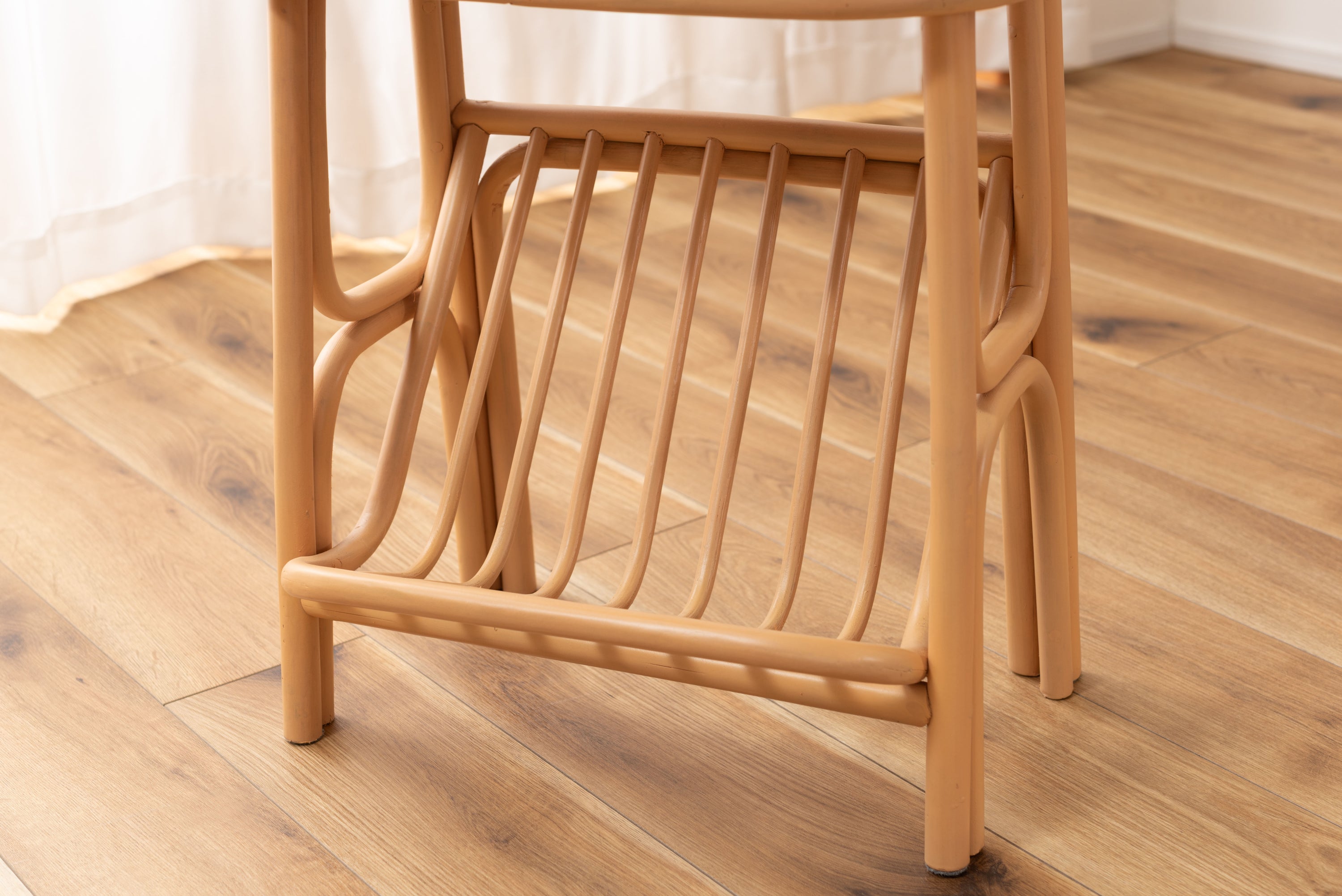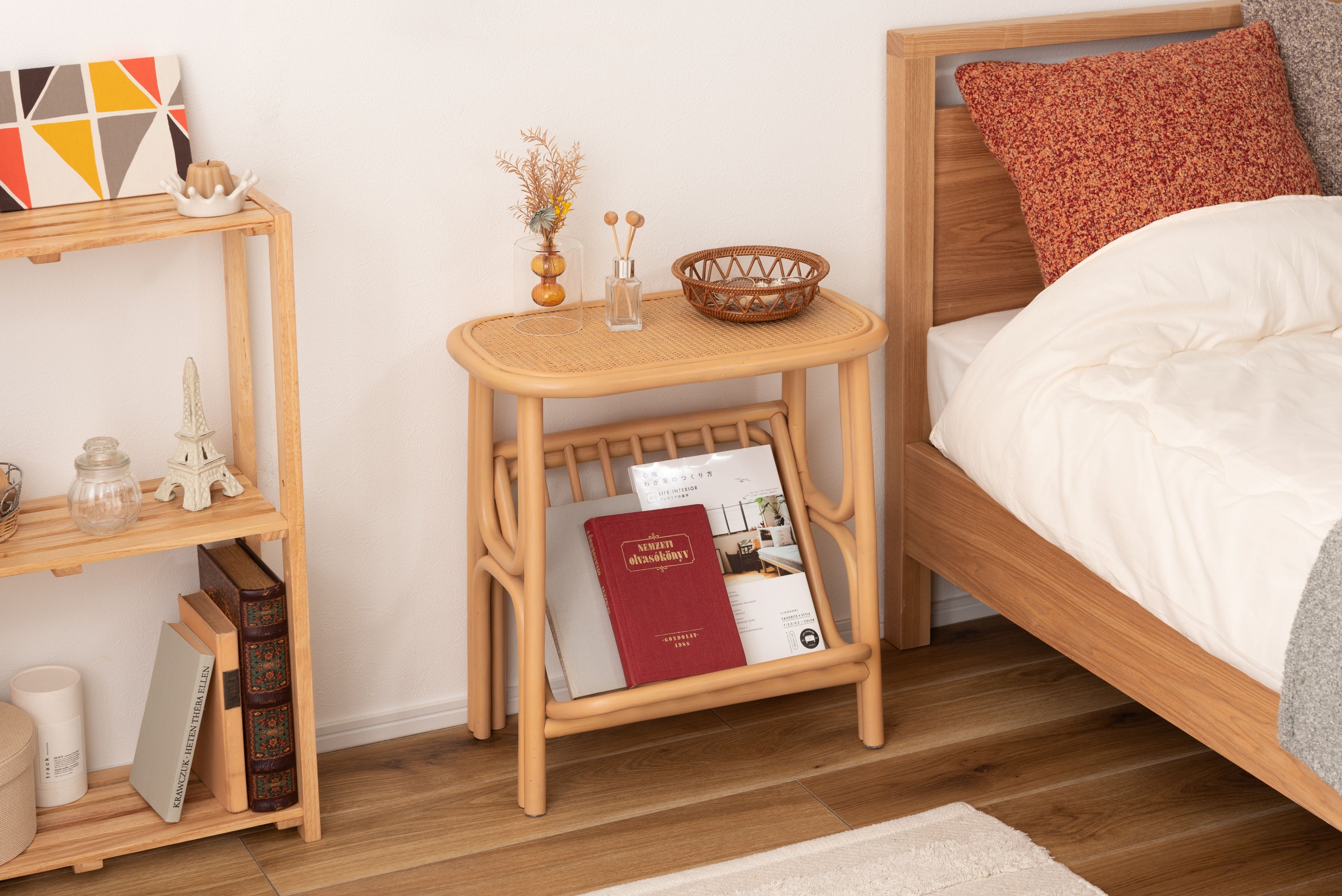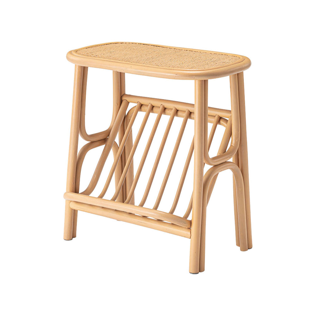 天然ラタンを使用したマガジンラック付きサイドテーブル。ソファ横やベッド横に置いてサイドテーブルとして使いやすい高さ設計。お気に入りの雑誌や、すぐに取り出したい小物などを置いておくのに便利なラック付き。玄関先に置いてスリッパラック兼小物置きとしても。軽くて丈夫な天然ラタンを使用し、ひとつひとつ表情が違う個体差も魅力の一つ。※個体差あり。本製品は天然ラタンを使用しておりますので、色や風合いに一点一点個体差がございます。また、とげ状のささくれ(網目の繋ぎ目なども含)ができることがあります。身体や衣服などを傷つけないようにご注意ください。尚、ささくれは使い込んでいく過程でも発生することもございます。はさみ等で取り除くか、ボンドなどで固定いただいてご使用ください。