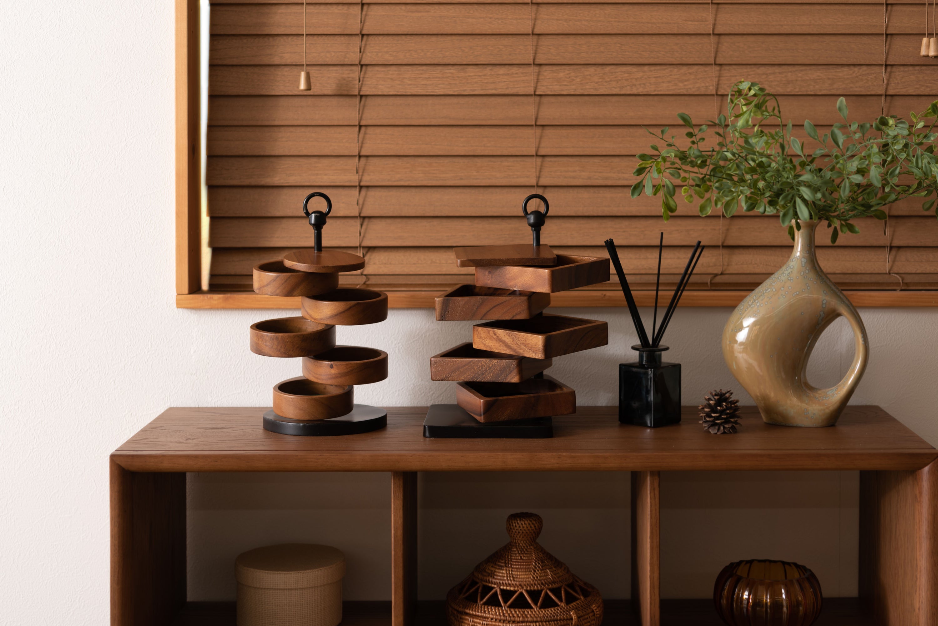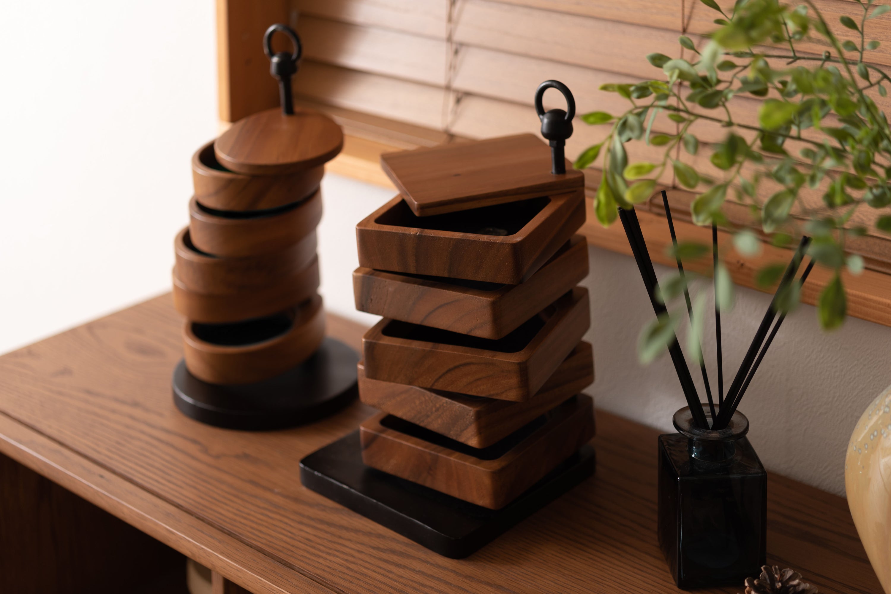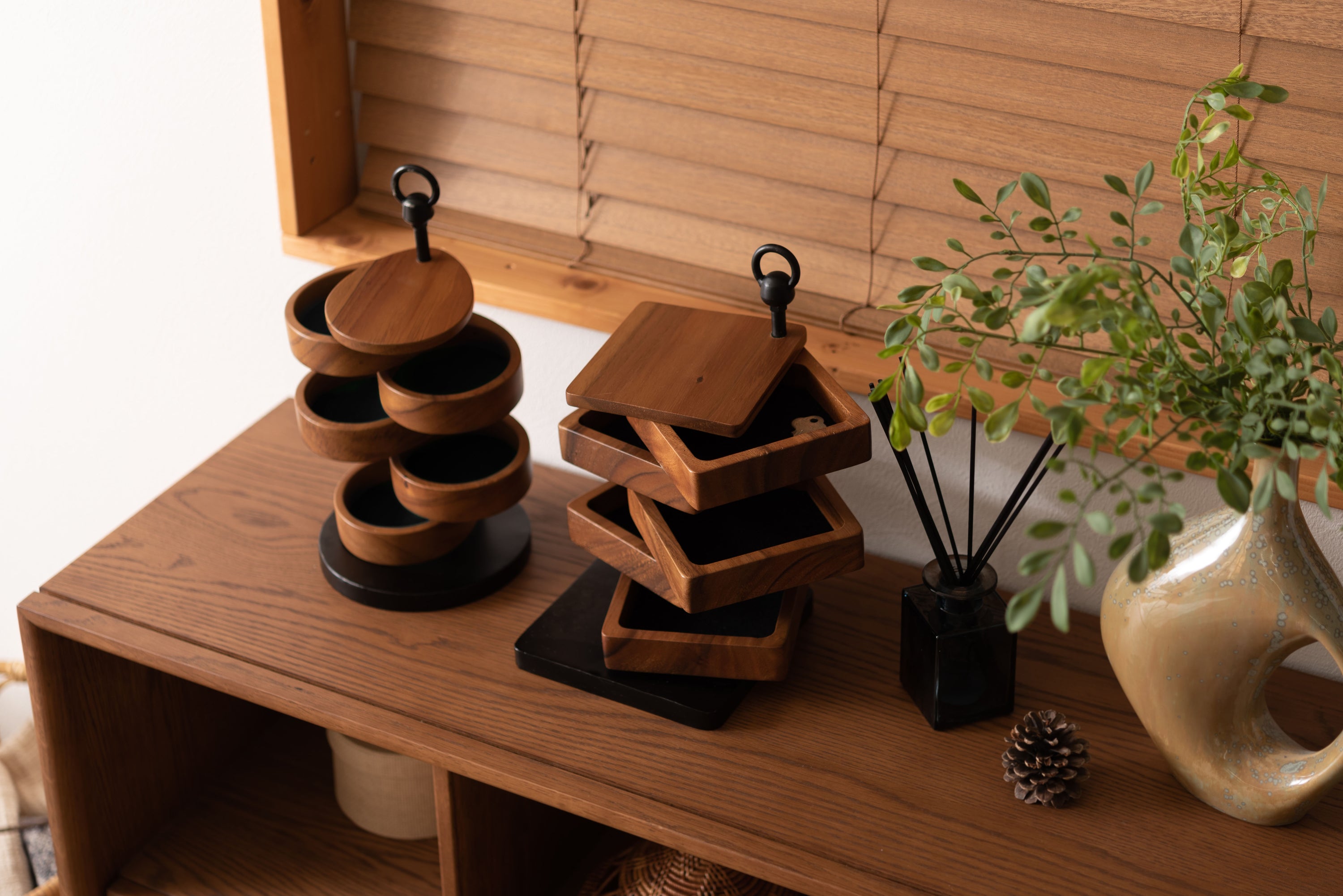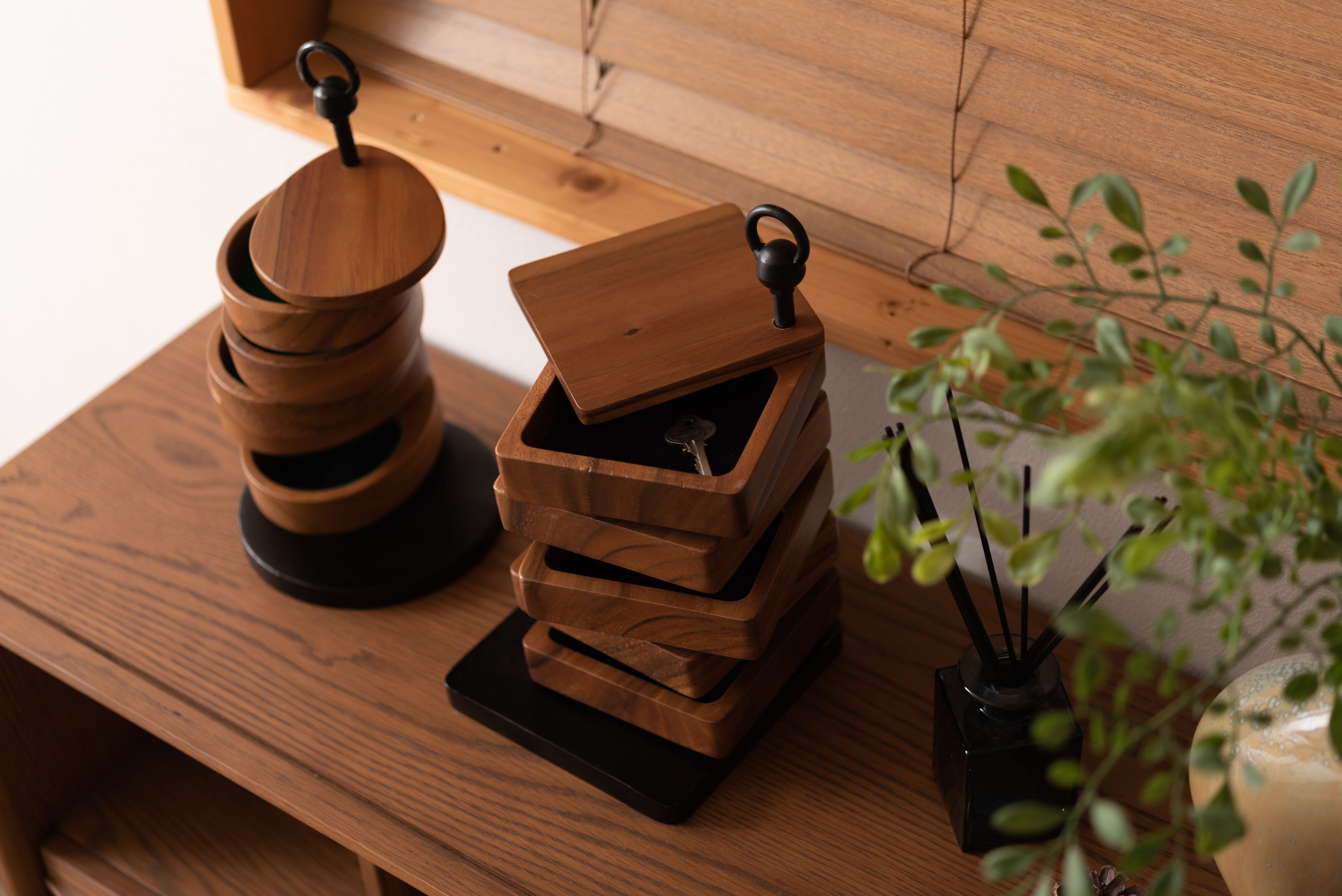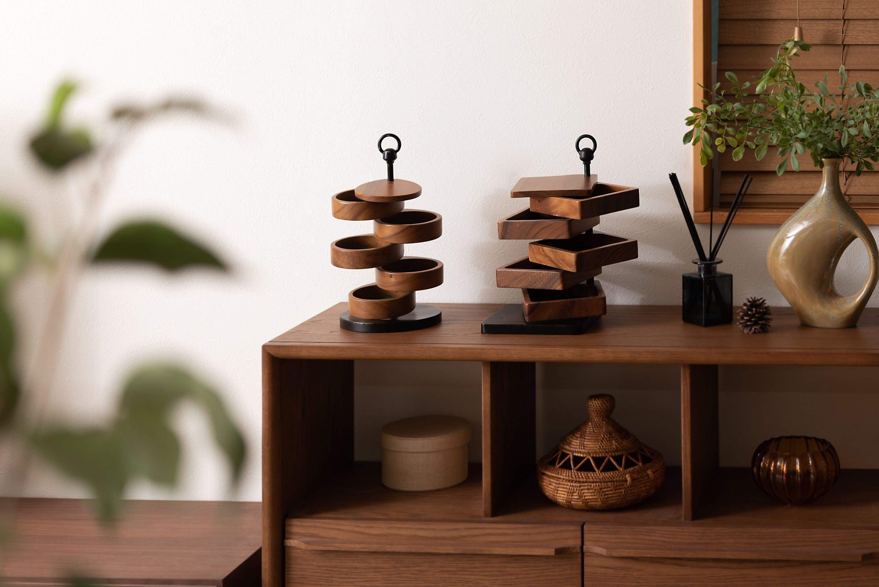 天然木の質感とシルエットが特徴的な小物入れ。収納力とデザイン性を兼ね備えた仕上がりで空間を引き立てます。1本のスチールに取り付けられた5個の収納ケースが幾何学的に動く、デザイン性溢れる卓上ケース。書斎やリビング、玄関回りのヴィンテージテイストのオブジェとしてもおすすめ。収納ケースの内側底面は高級感のあるベロア生地を使用。アクセサリー等の収納にも。