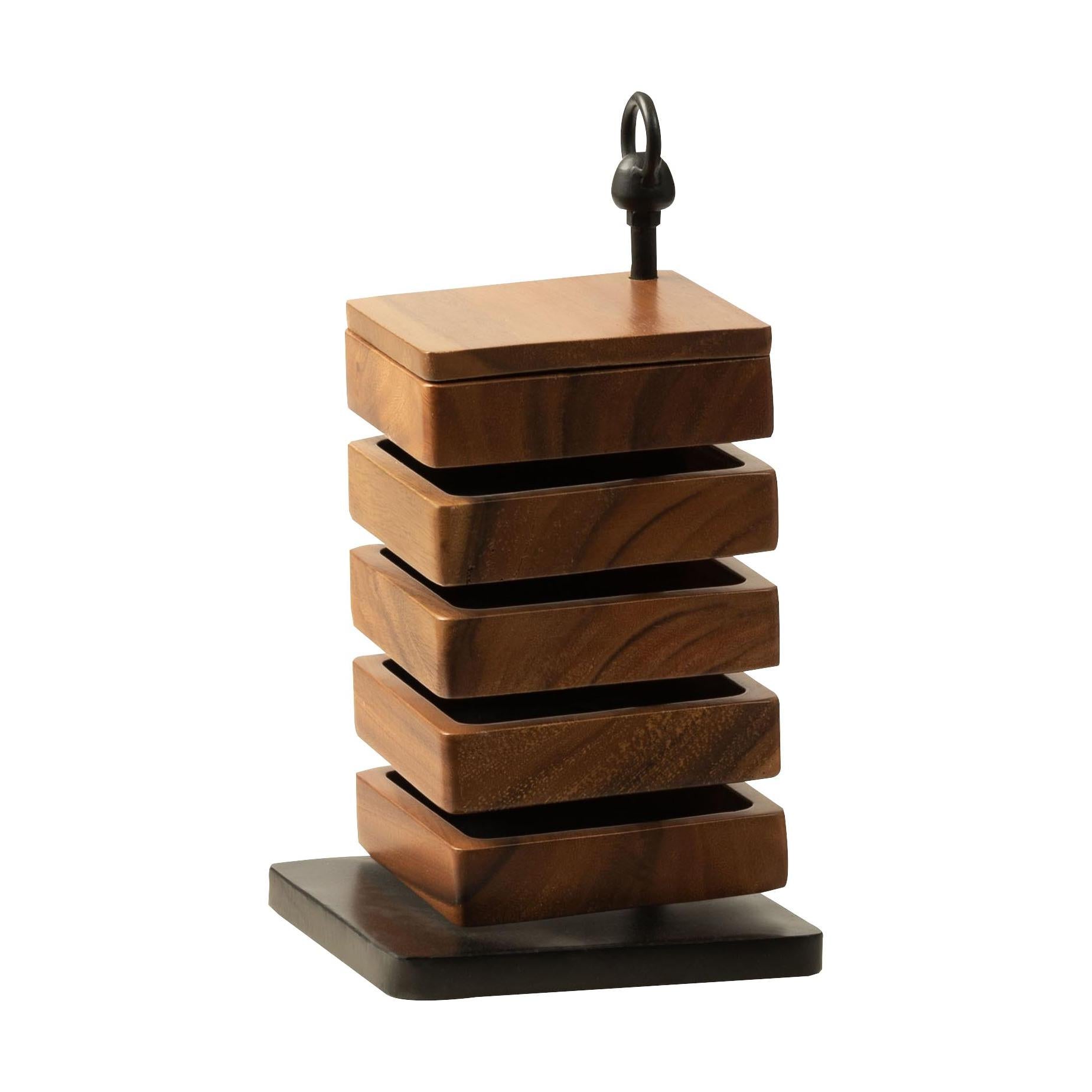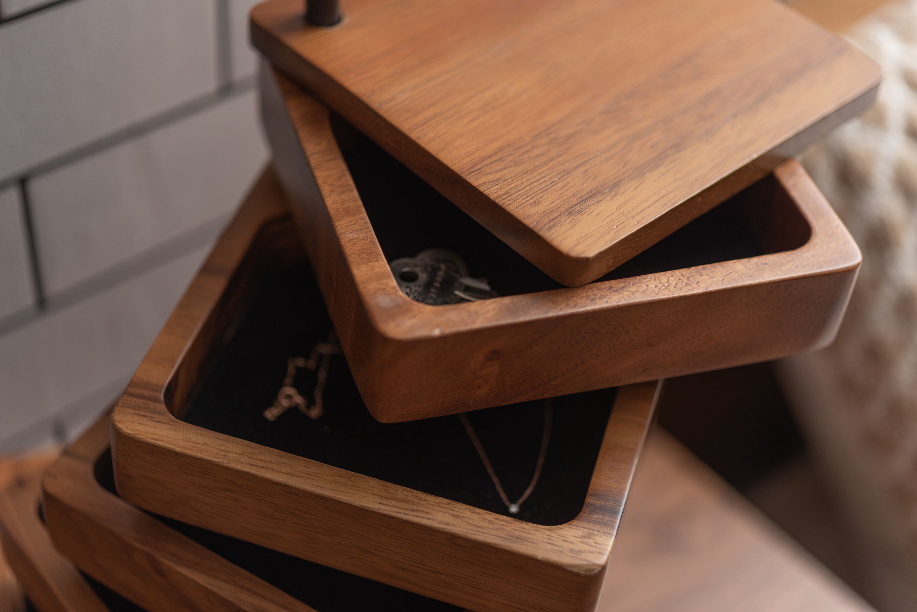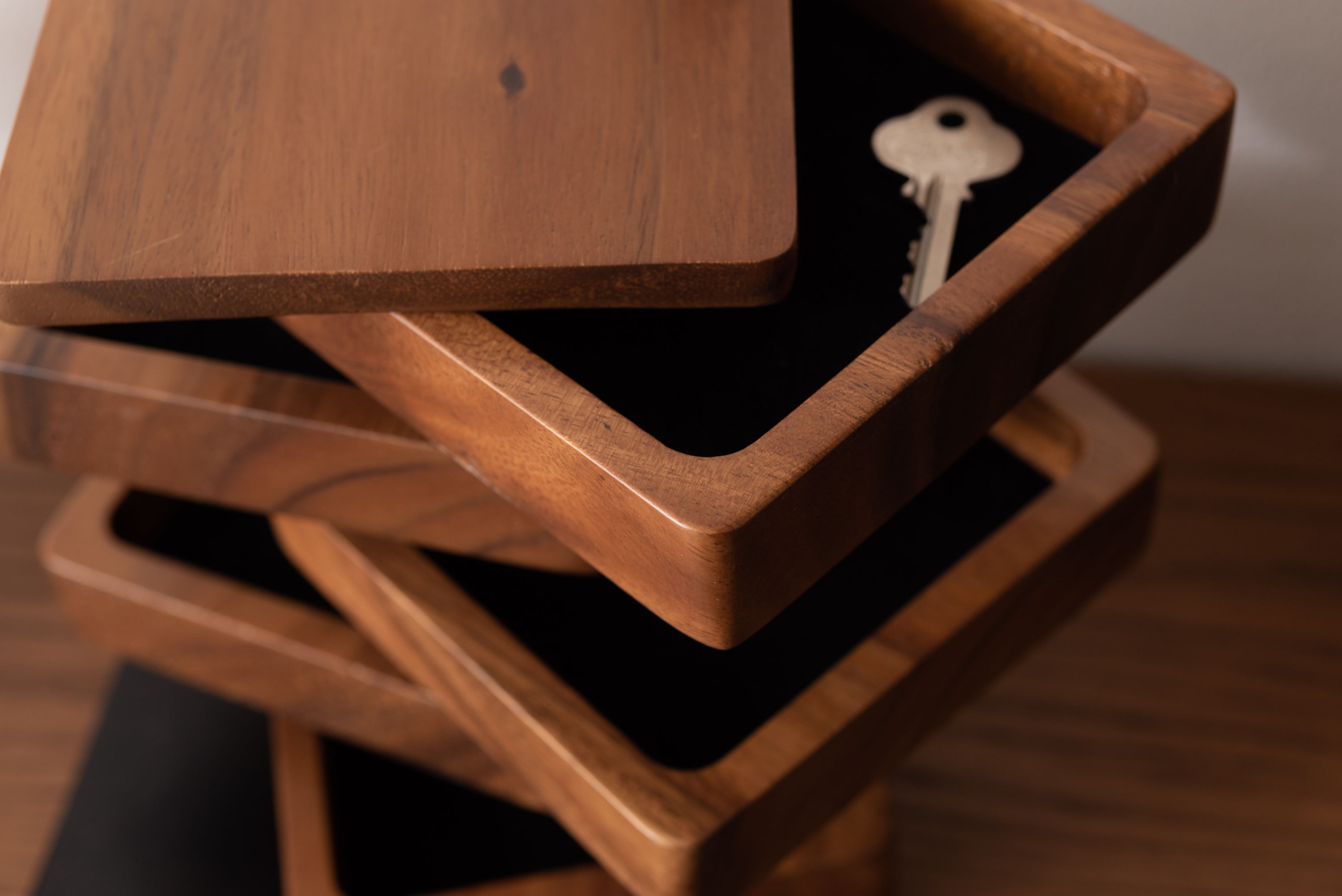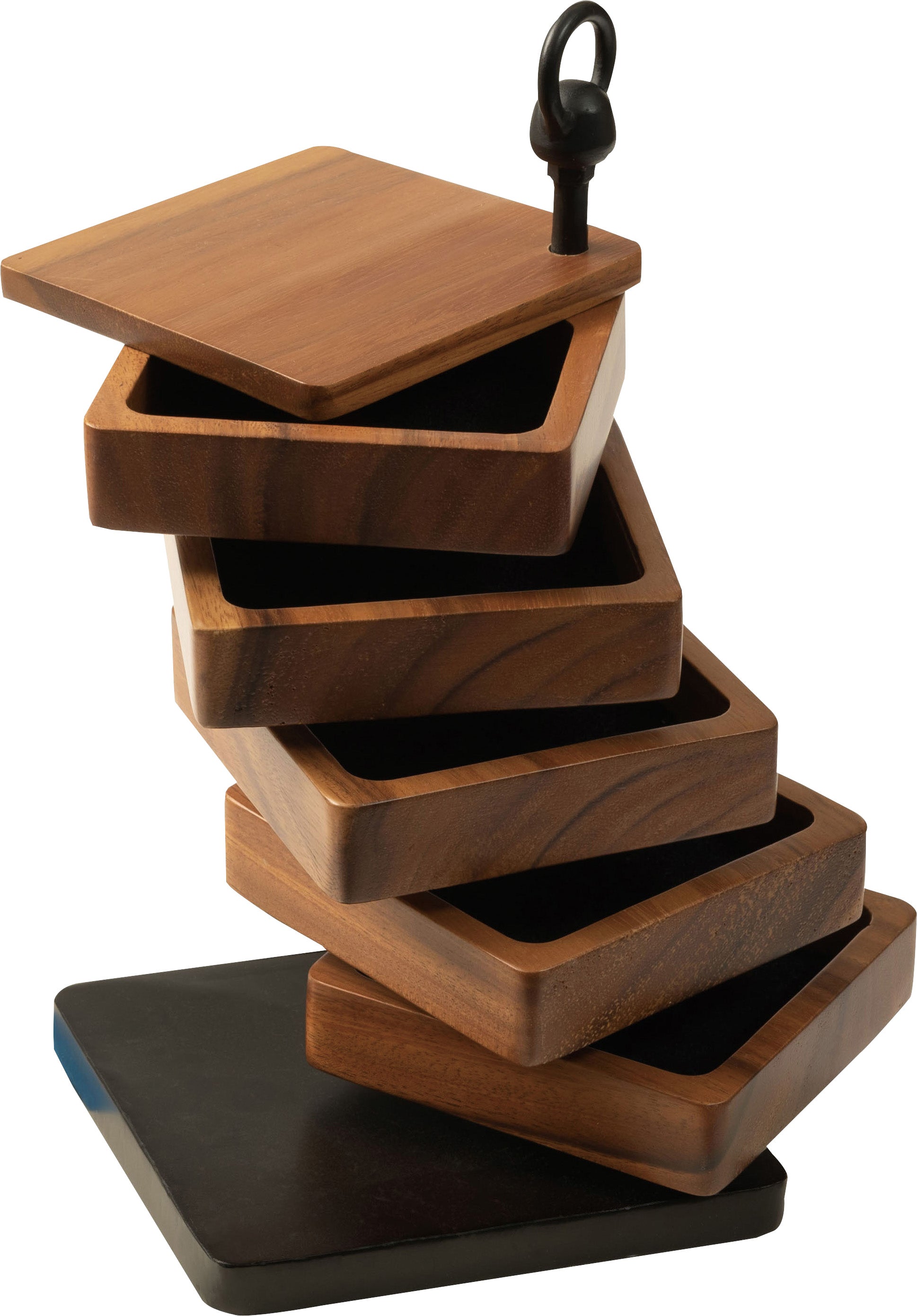 天然木の質感とシルエットが特徴的な小物入れ。収納力とデザイン性を兼ね備えた仕上がりで空間を引き立てます。1本のスチールに取り付けられた5個の収納ケースが幾何学的に動く、デザイン性溢れる卓上ケース。書斎やリビング、玄関回りのヴィンテージテイストのオブジェとしてもおすすめ。収納ケースの内側底面は高級感のあるベロア生地を使用。アクセサリー等の収納にも。