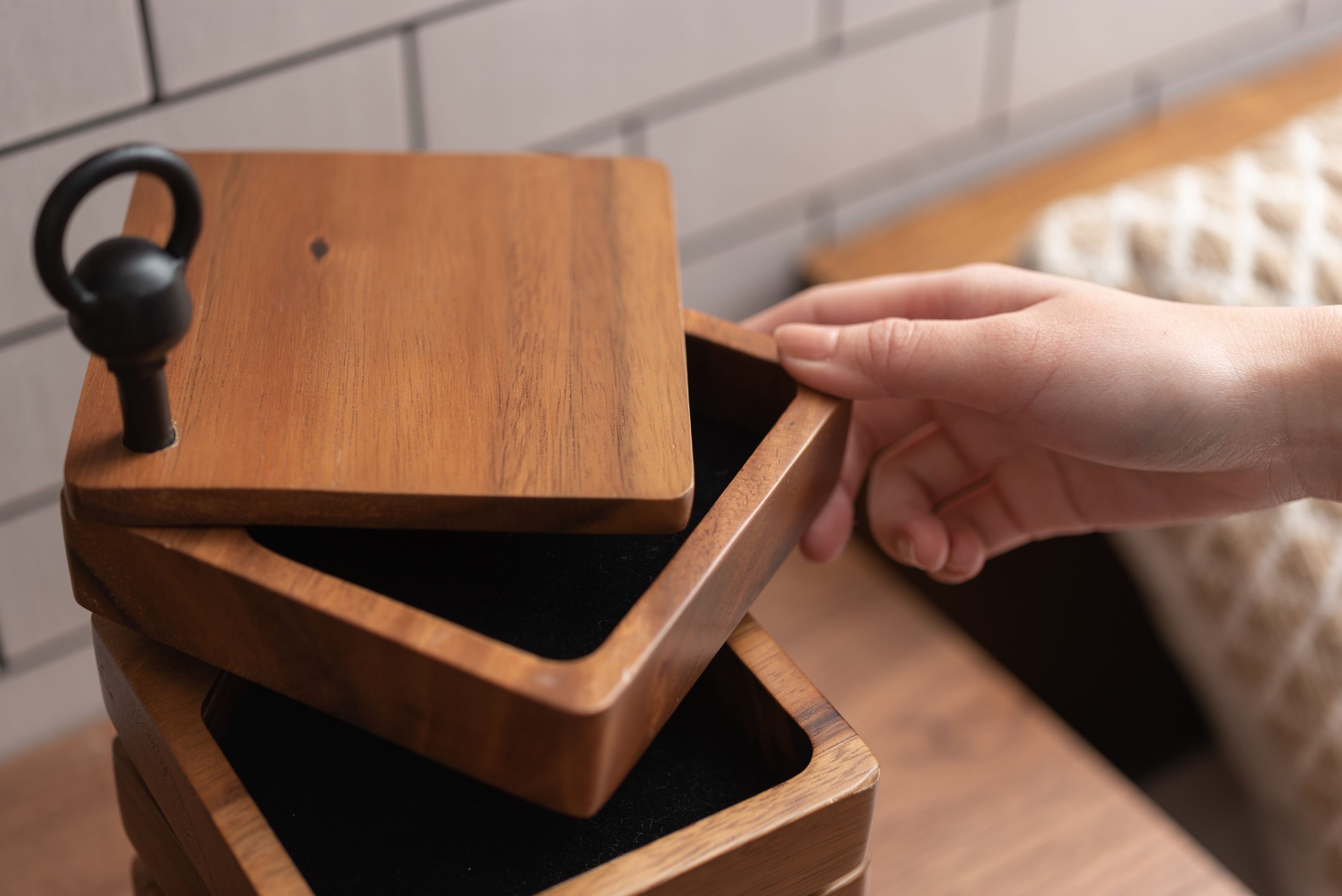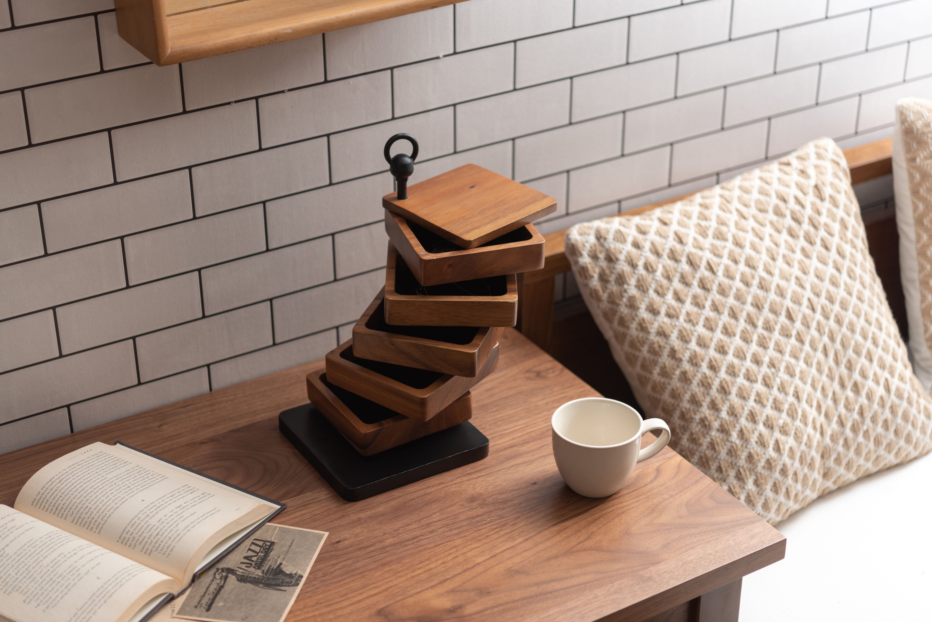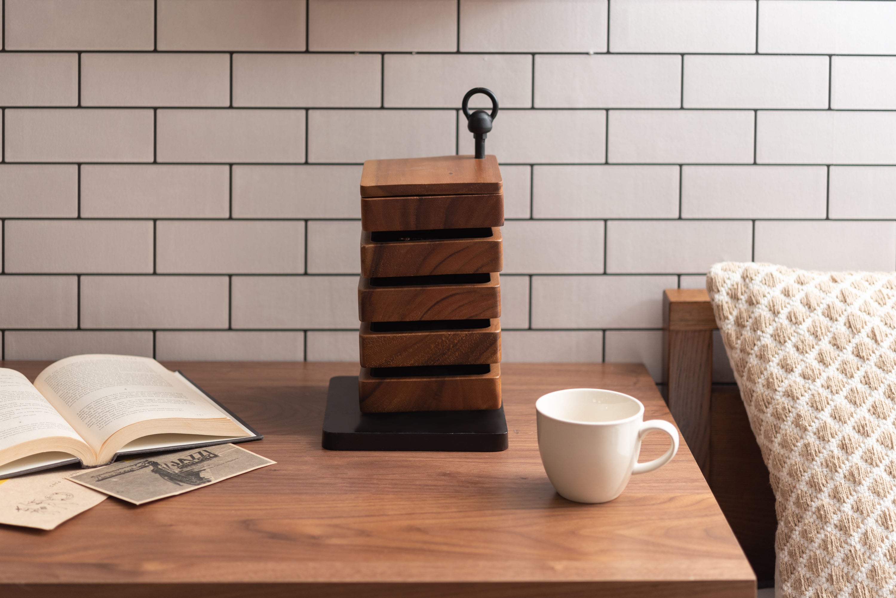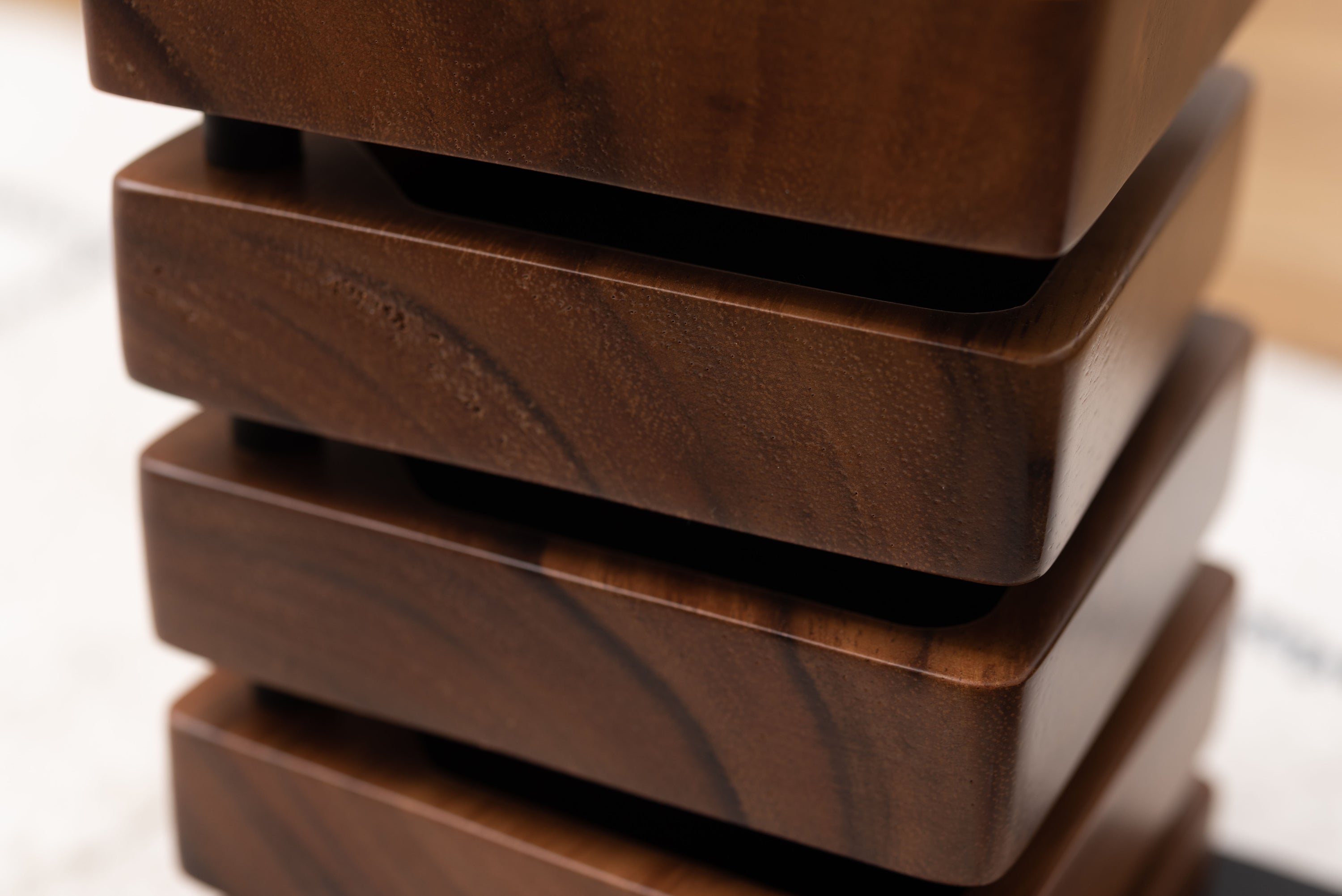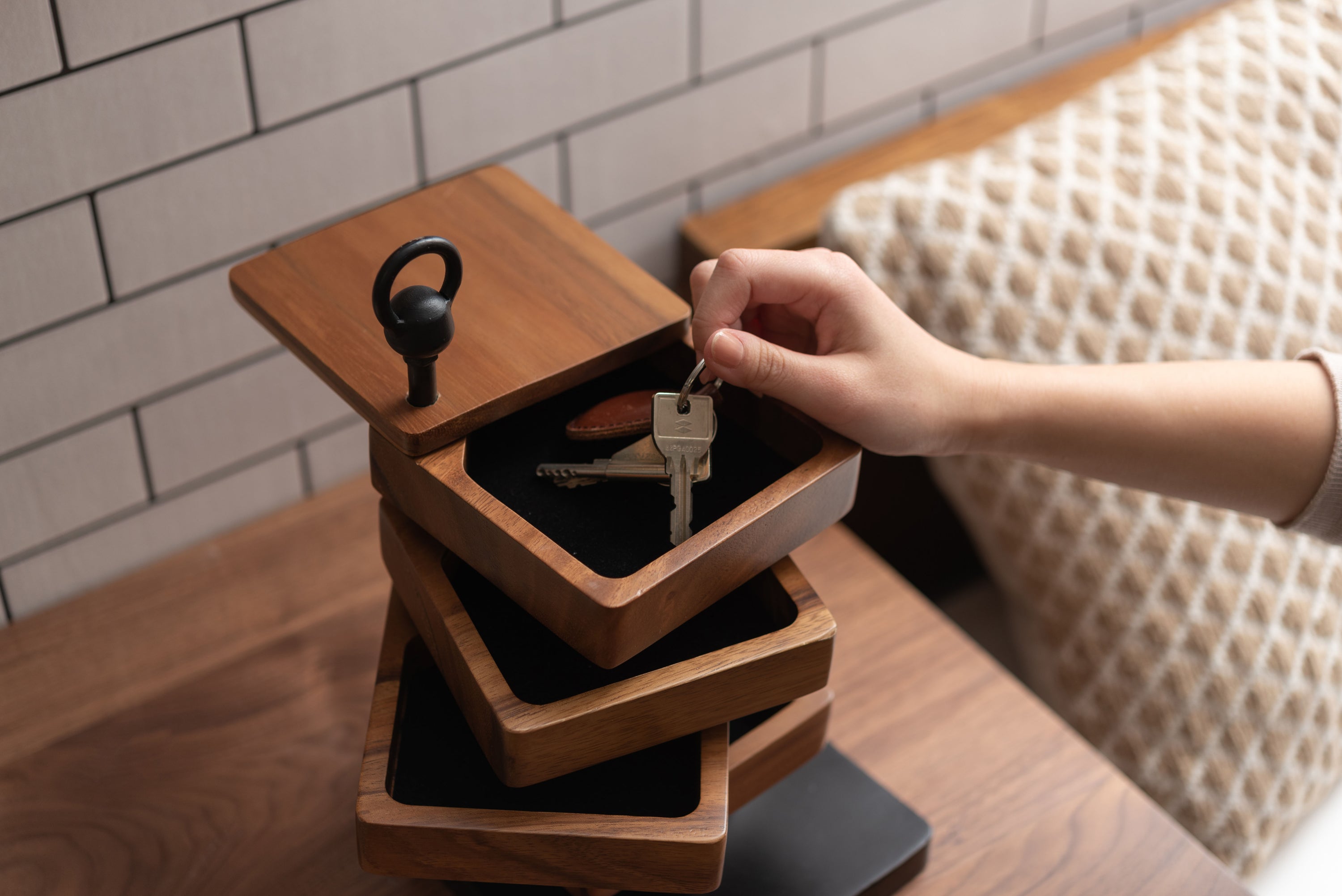 天然木の質感とシルエットが特徴的な小物入れ。収納力とデザイン性を兼ね備えた仕上がりで空間を引き立てます。1本のスチールに取り付けられた5個の収納ケースが幾何学的に動く、デザイン性溢れる卓上ケース。書斎やリビング、玄関回りのヴィンテージテイストのオブジェとしてもおすすめ。収納ケースの内側底面は高級感のあるベロア生地を使用。アクセサリー等の収納にも。