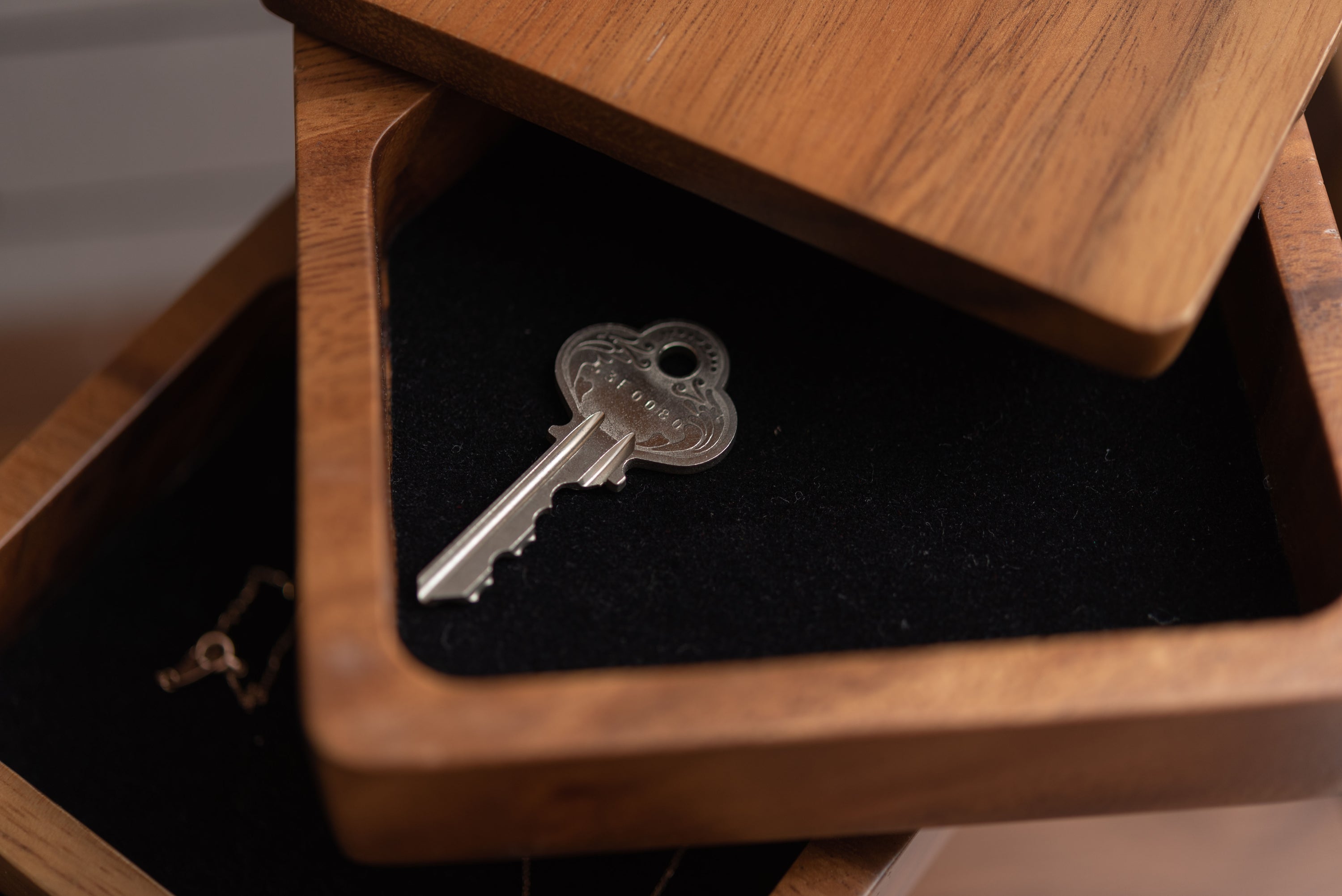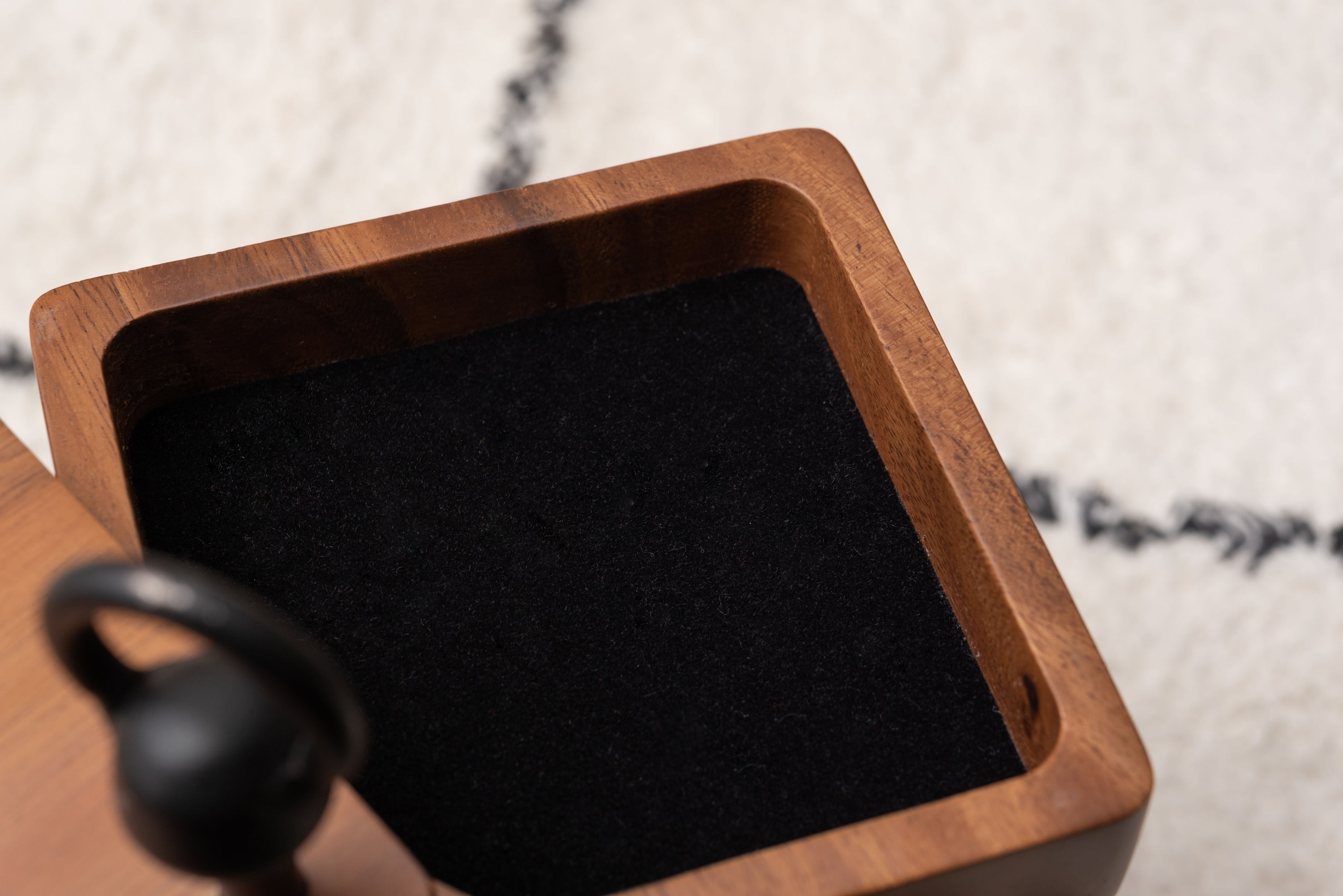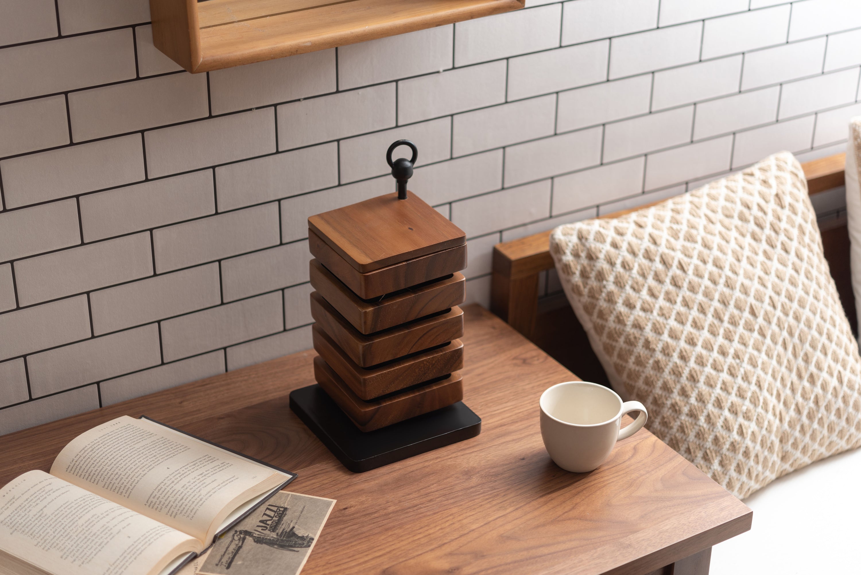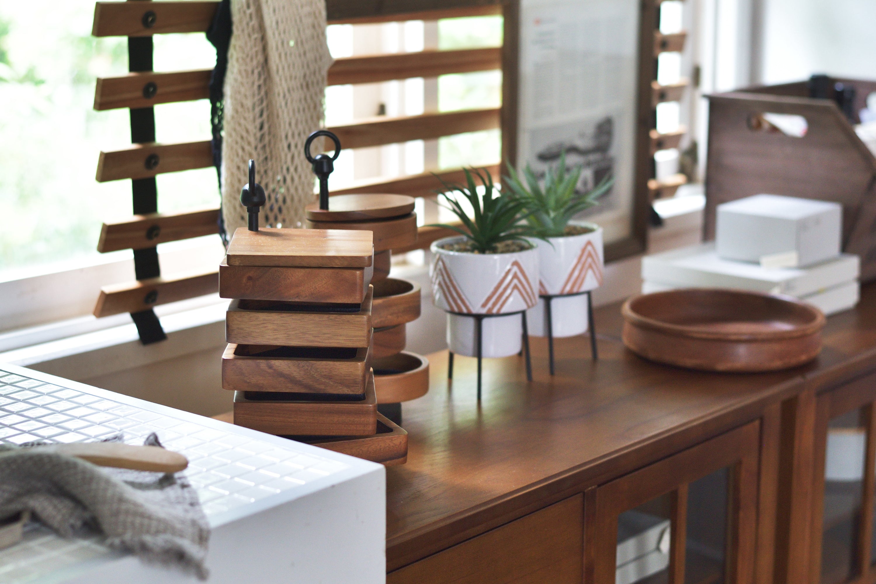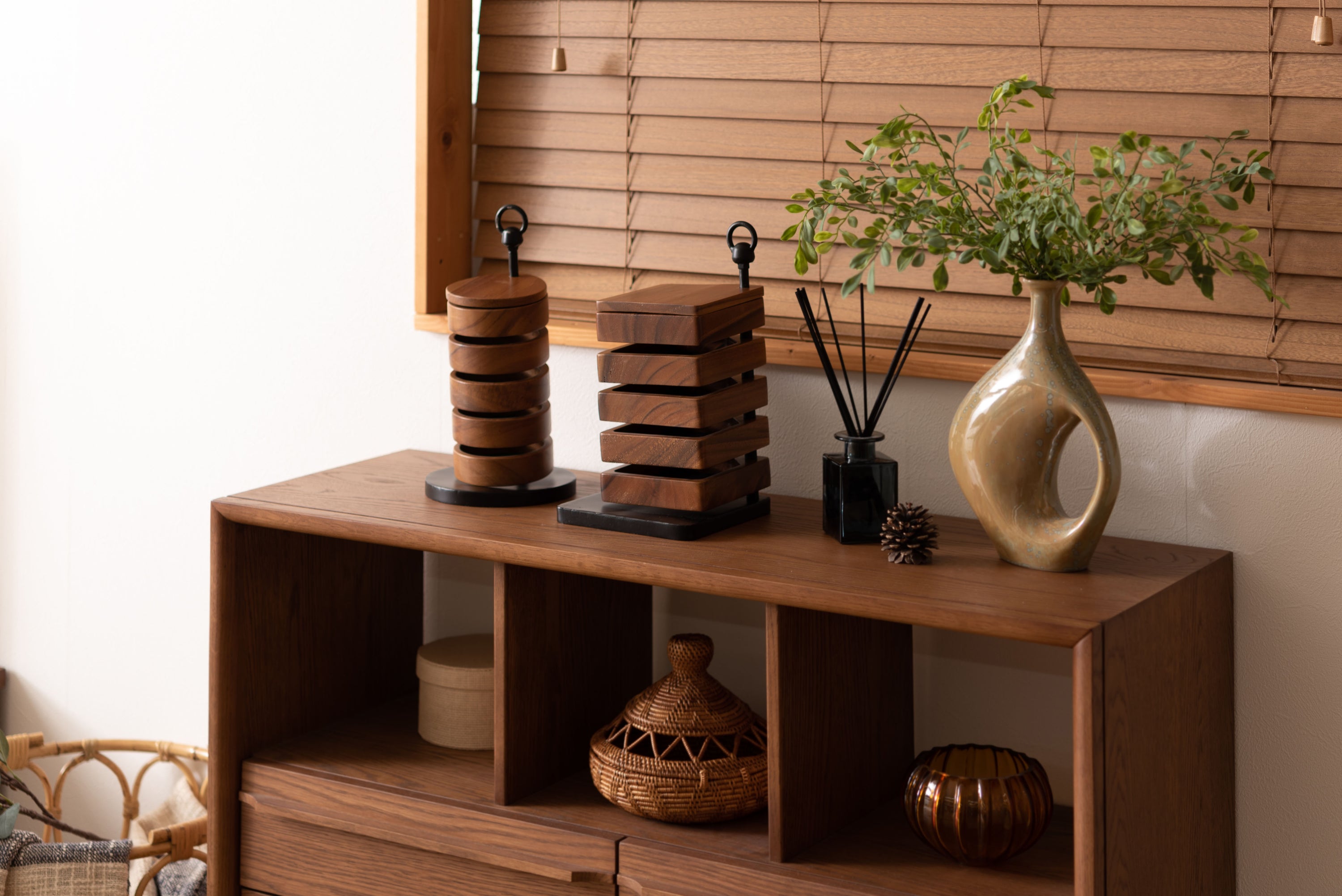 天然木の質感とシルエットが特徴的な小物入れ。収納力とデザイン性を兼ね備えた仕上がりで空間を引き立てます。1本のスチールに取り付けられた5個の収納ケースが幾何学的に動く、デザイン性溢れる卓上ケース。書斎やリビング、玄関回りのヴィンテージテイストのオブジェとしてもおすすめ。収納ケースの内側底面は高級感のあるベロア生地を使用。アクセサリー等の収納にも。