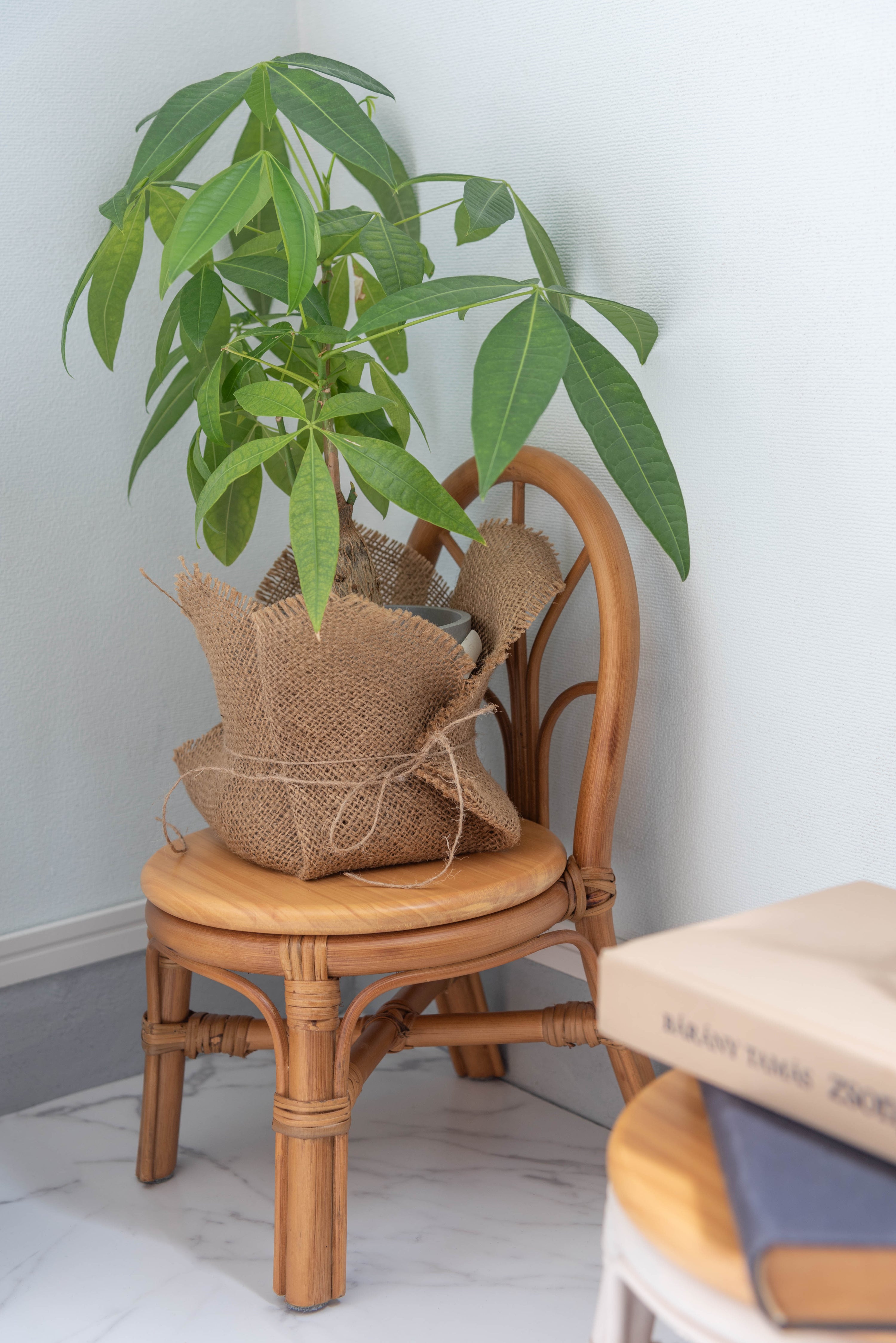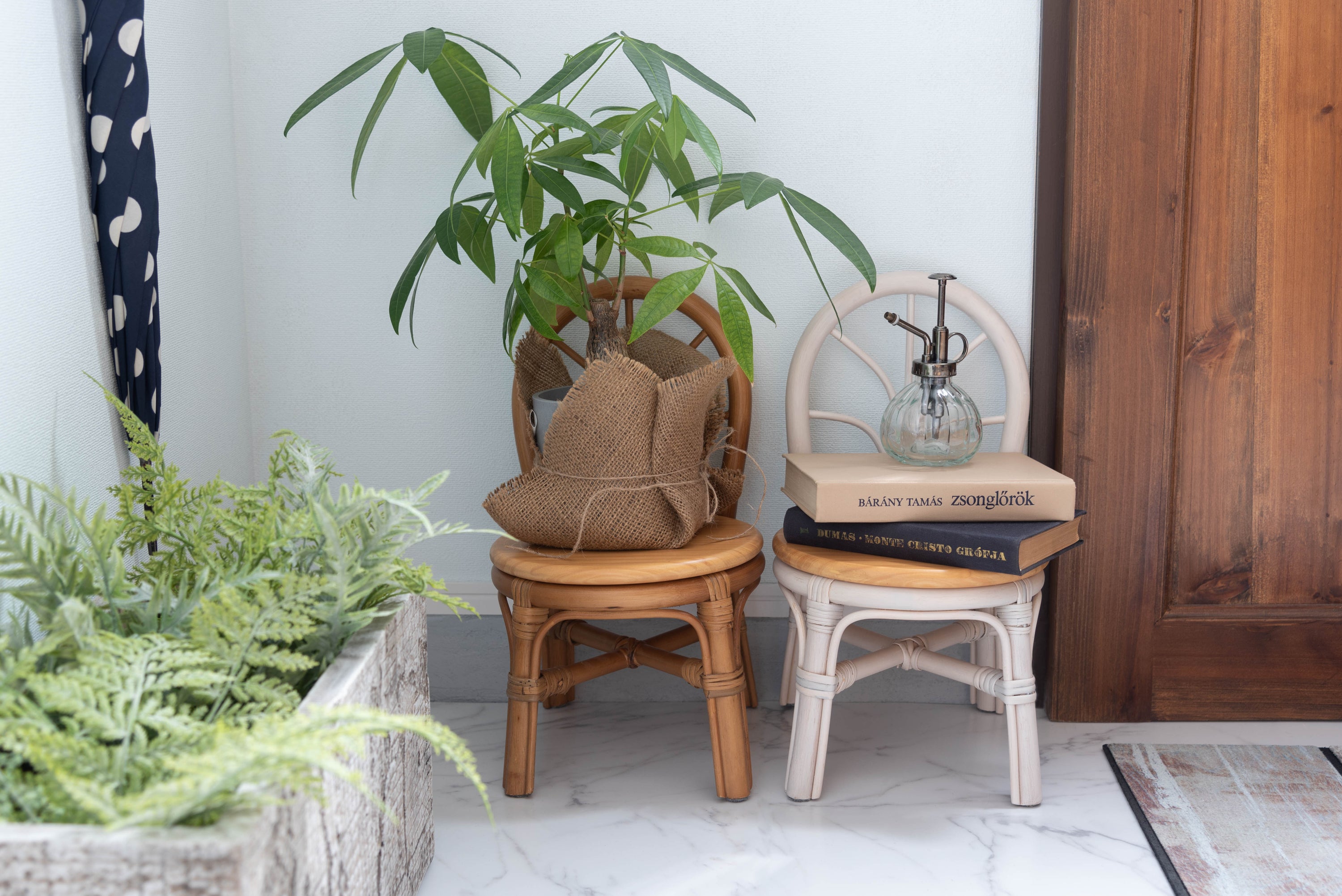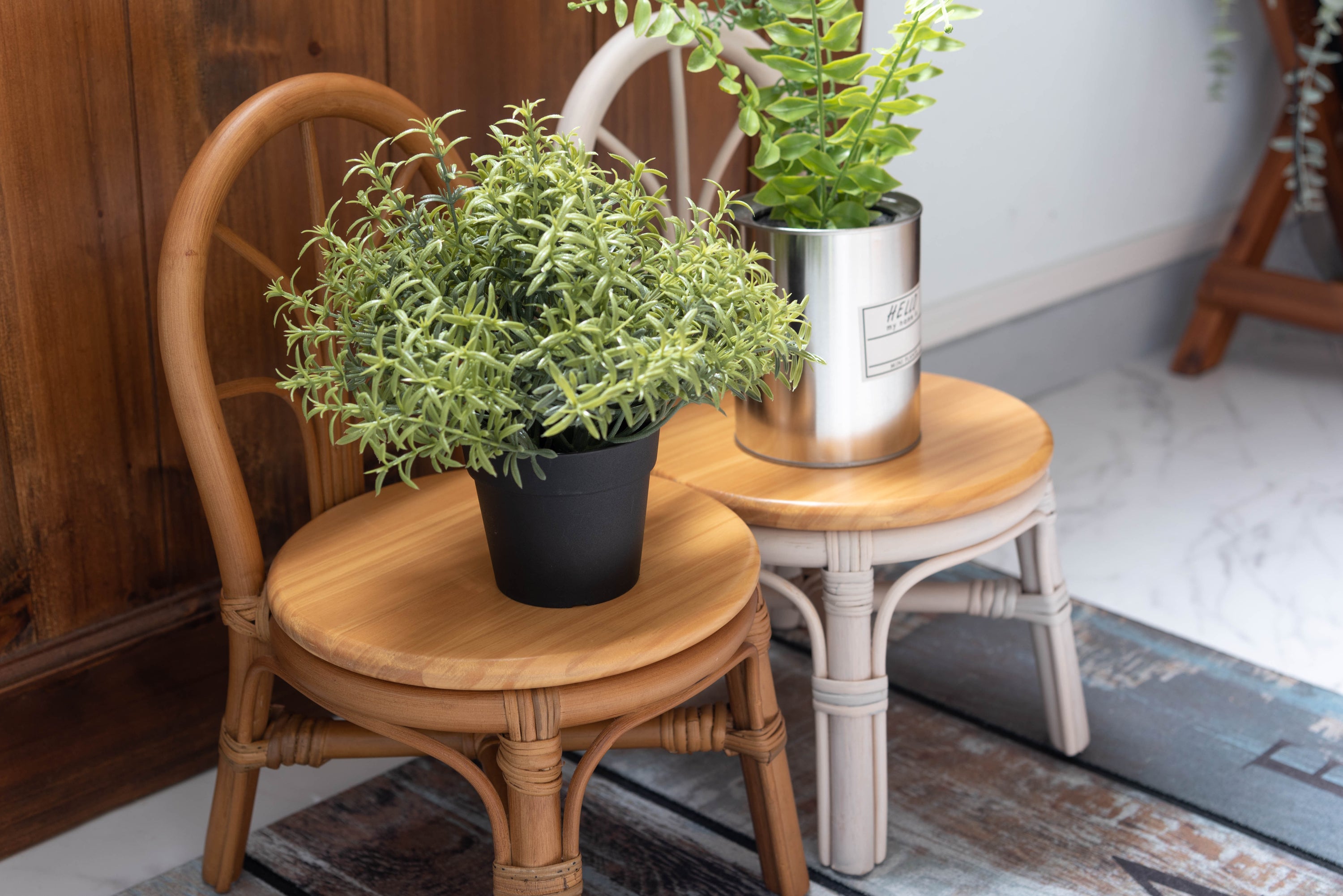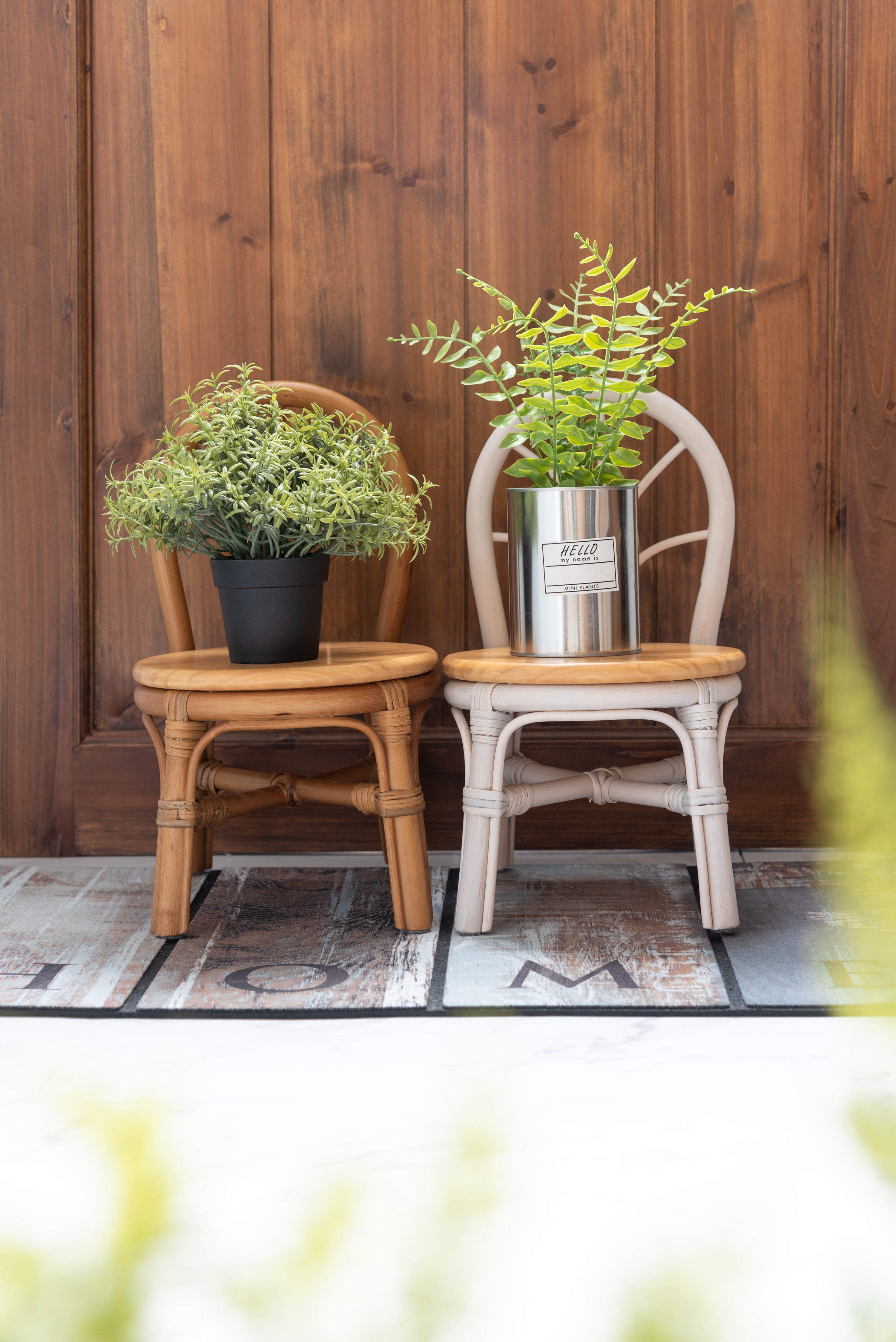 小さくてかわいらしいチェア型プランター。ラタンと天然木を組み合わせた人気のデザインです。フラットな天板はより安定し、植物や小物を置いたりそのままインテリアとして飾ることもできます。