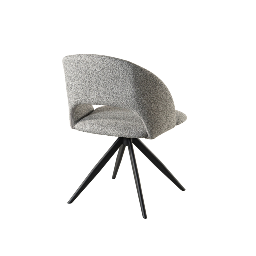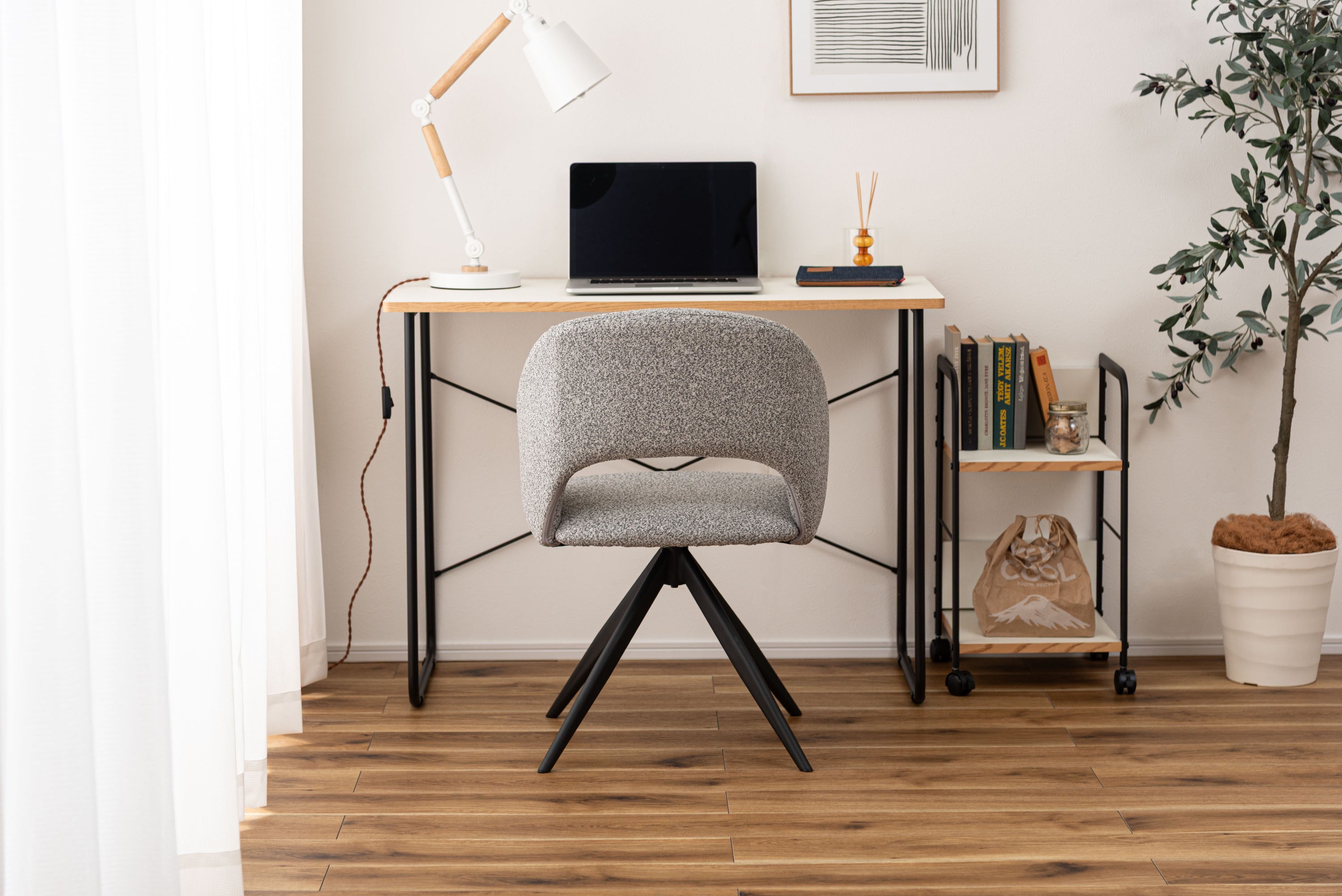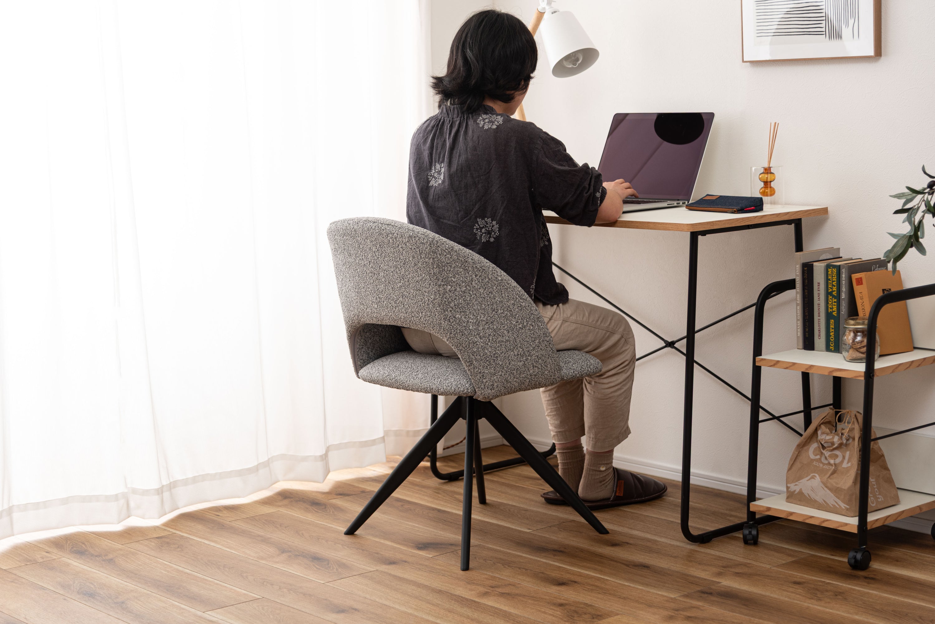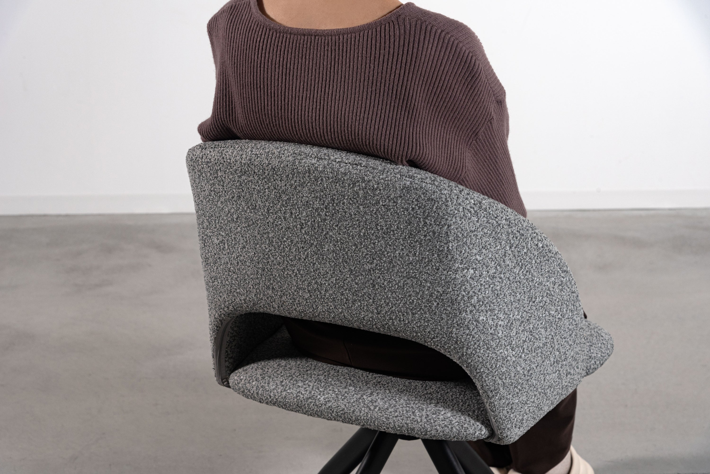 デザインと利便性を兼ね備えた回転チェア。曲線を活かしたボリューム感のある本体と、放射状に伸びた軽快な印象を感じさせる脚部が融合した回転チェア。腰部に抜きを作ることにより重量感を軽減。座面が回転するので座ったまま身体の向きを変えることができ、テーブルへの出入りもしやすくなります。座面が360度回転する仕様。立ち座りの動作もスムーズ。緩やかに湾曲した背面が身体にフィット。柔らかすぎず硬すぎない程よいクッション性で、長時間座っても疲れにくい仕様。細身のスチール脚が全体の印象を引き締めスタイリッシュさを演出。