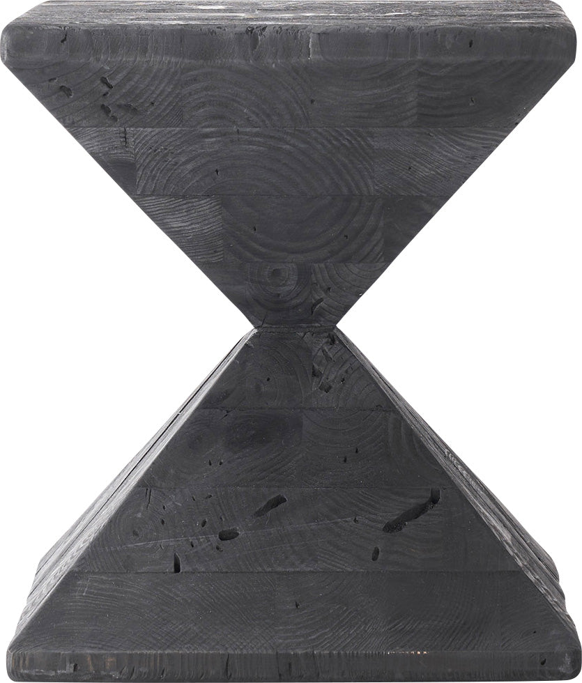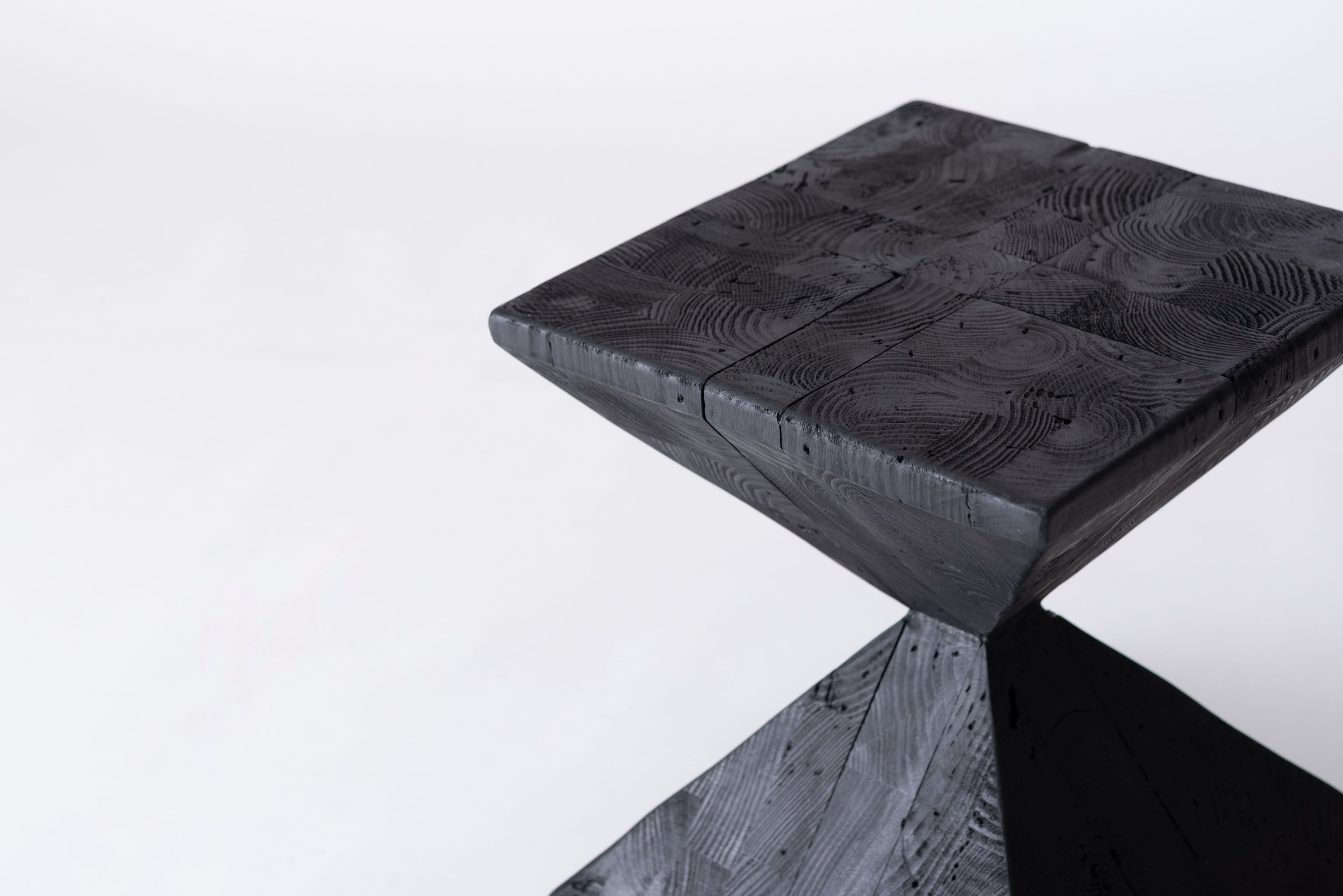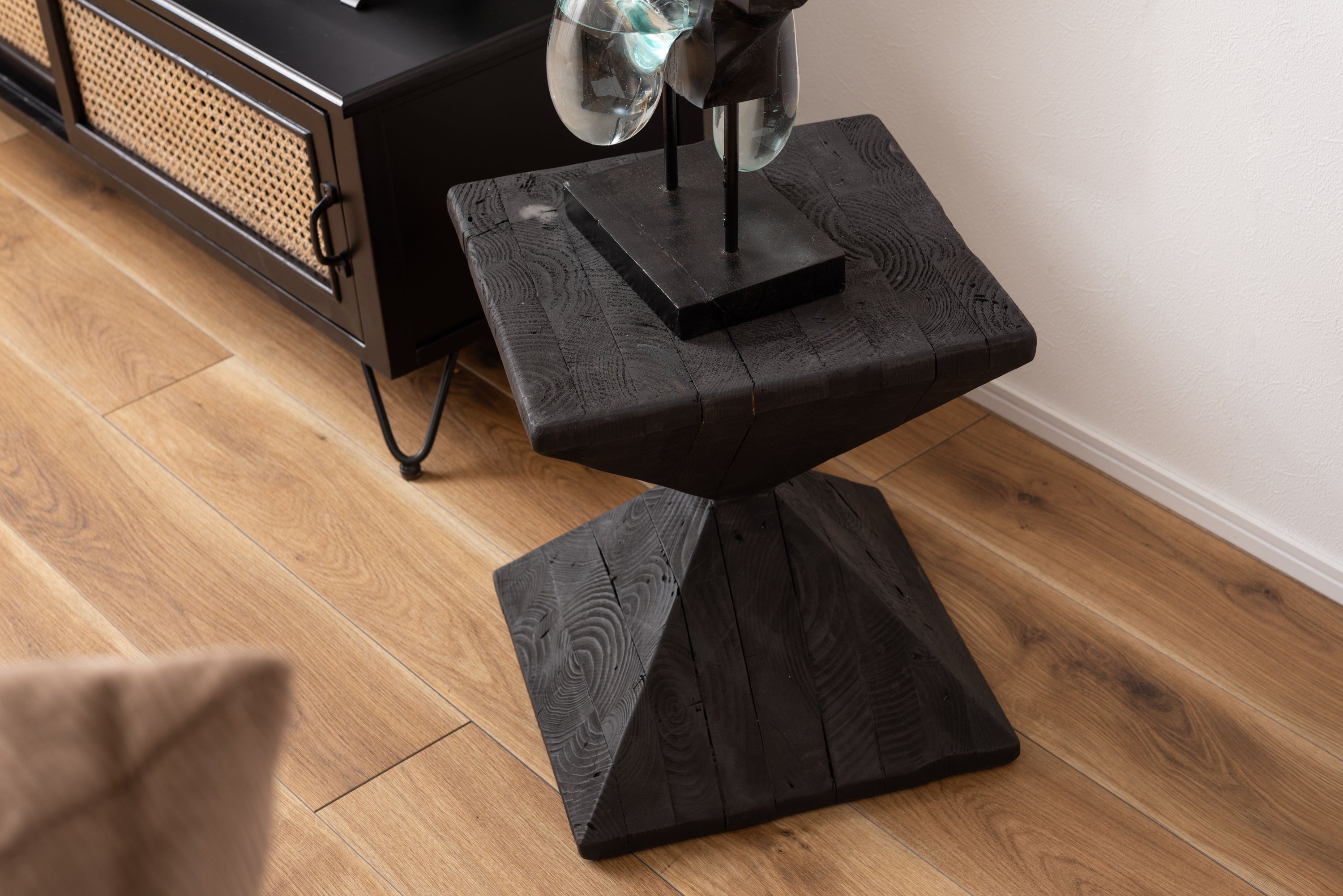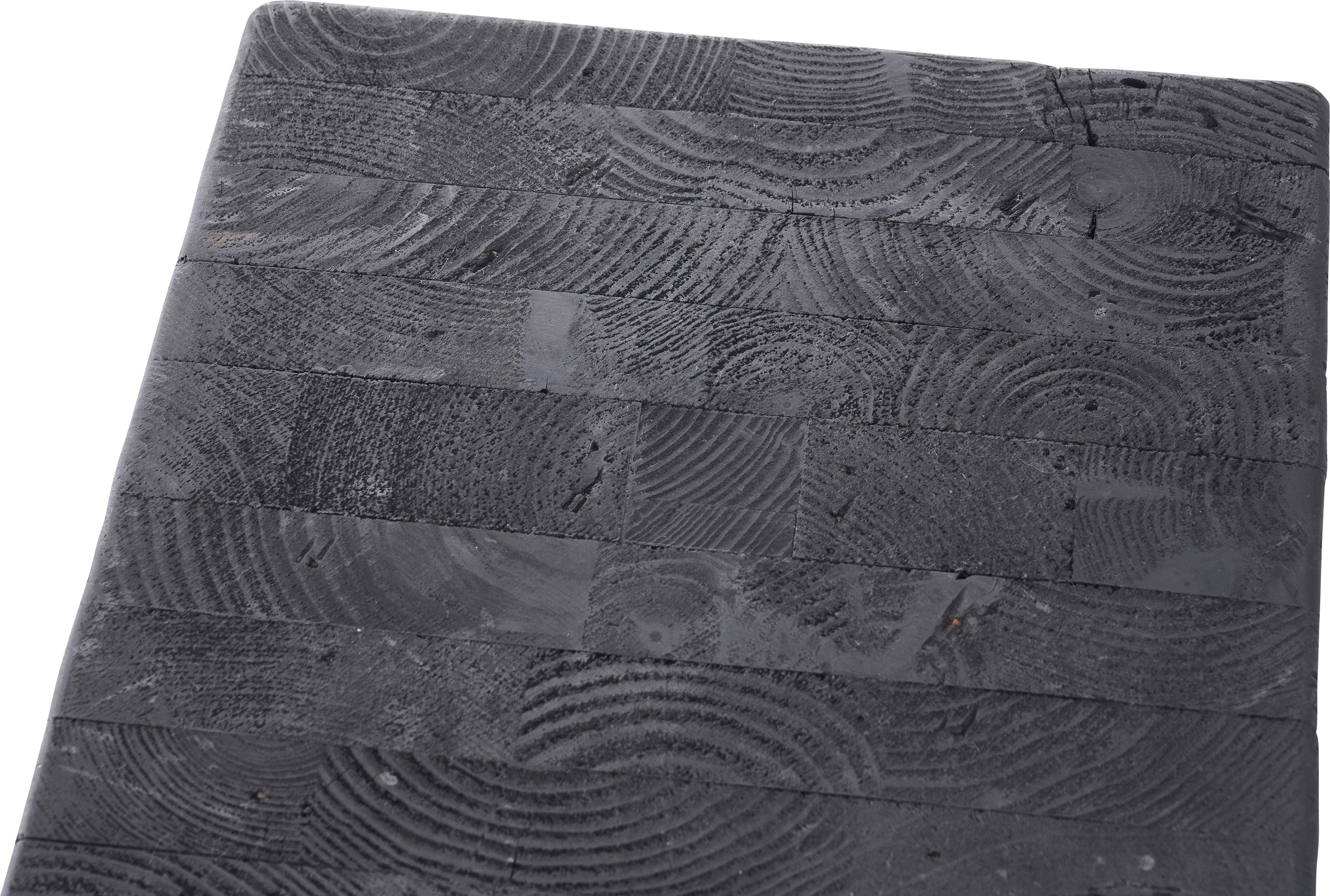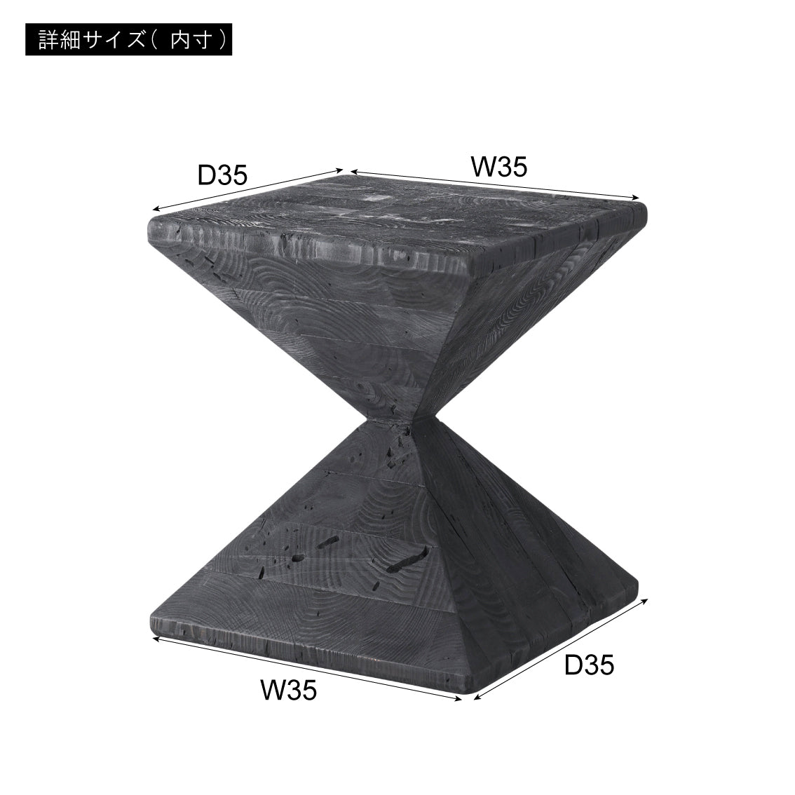パイン古材×黒×線の美しさのバランス。インテリアのひとつとして置くだけでも存在感を放つサイドテーブル。表情の異なるパイン古材の質感と独特の形状が上質な空間を演出。ディスプレイ棚やスツールとしても使うことができます。ゆったりと使える上面。裏面に滑り止めフェルト付き。