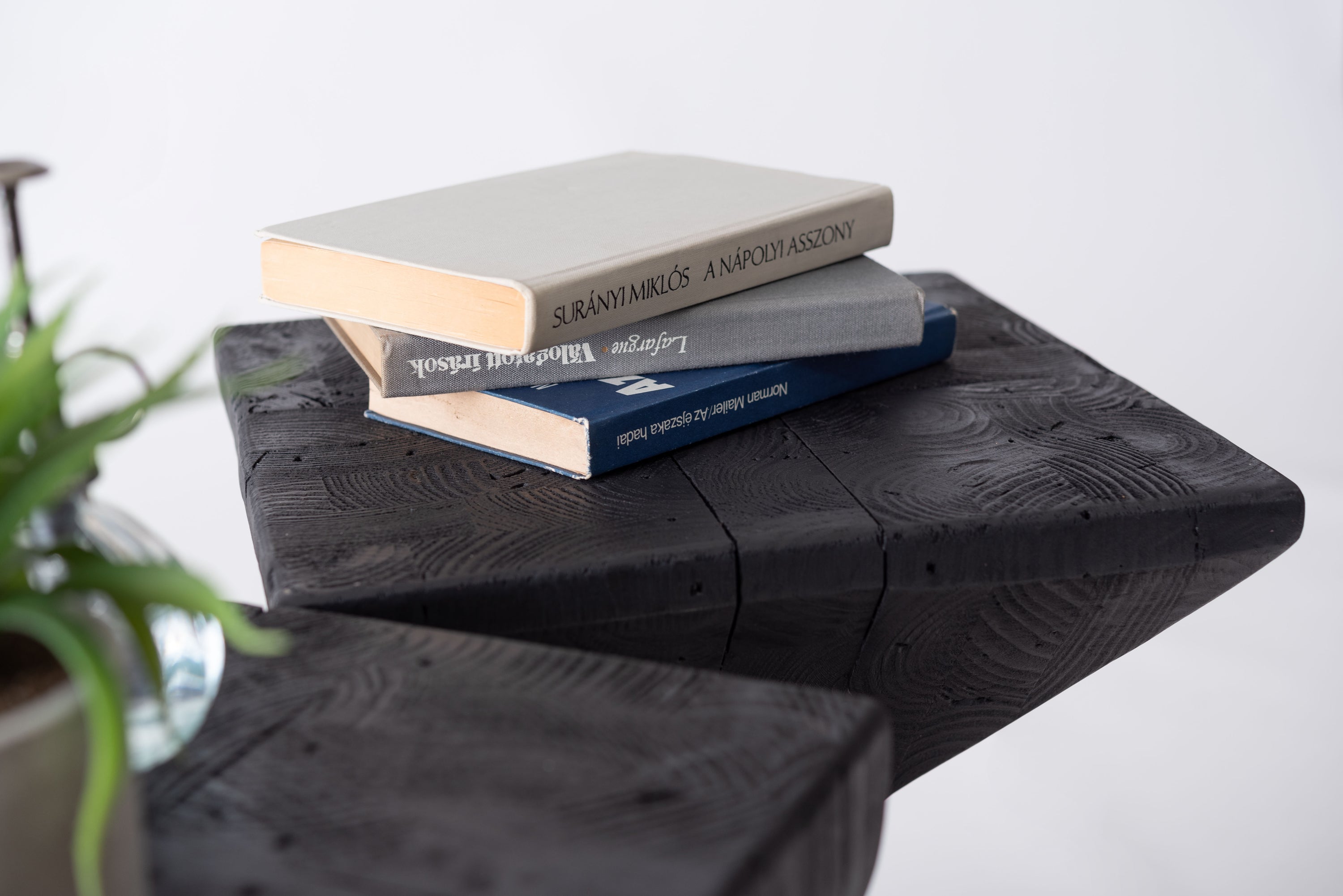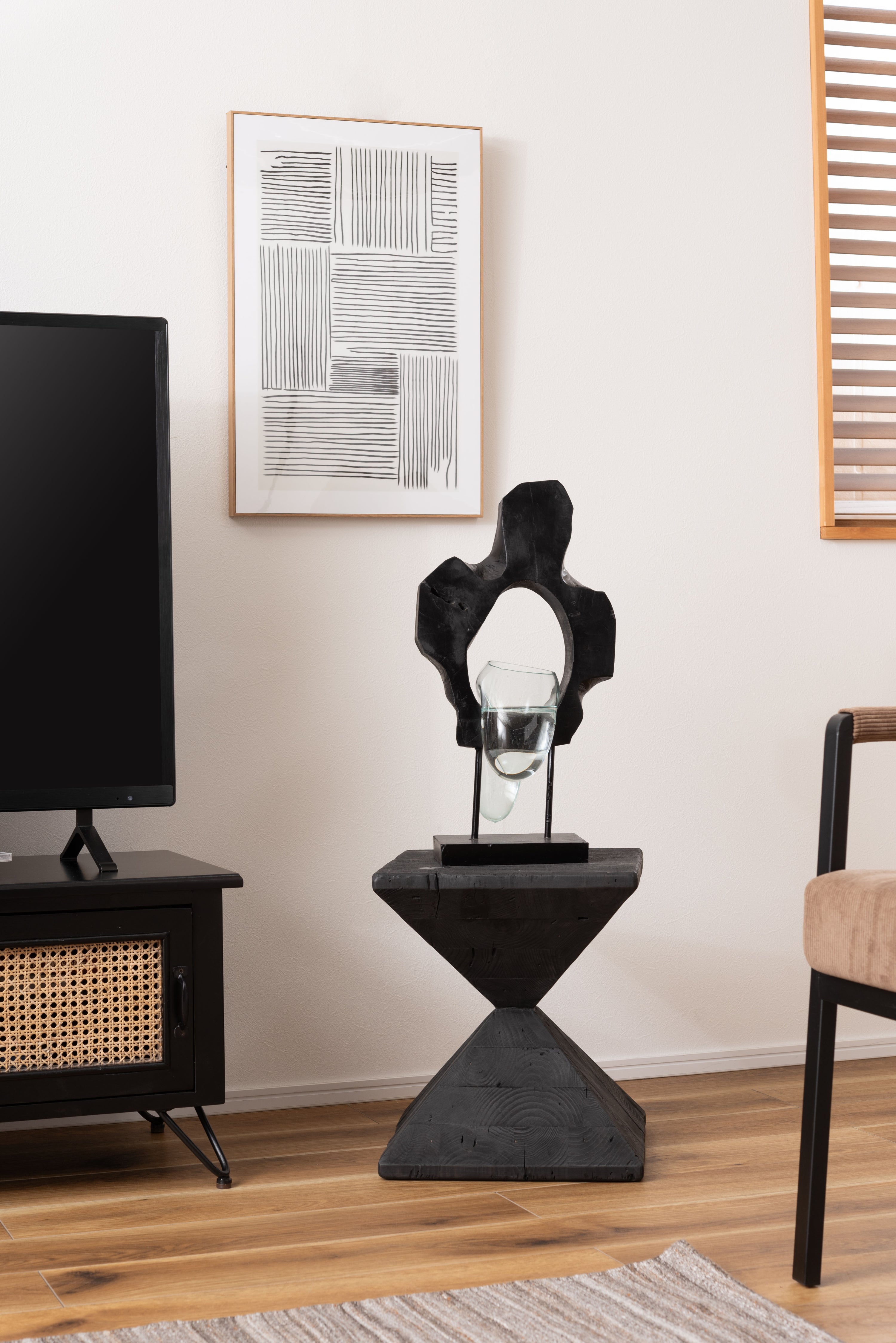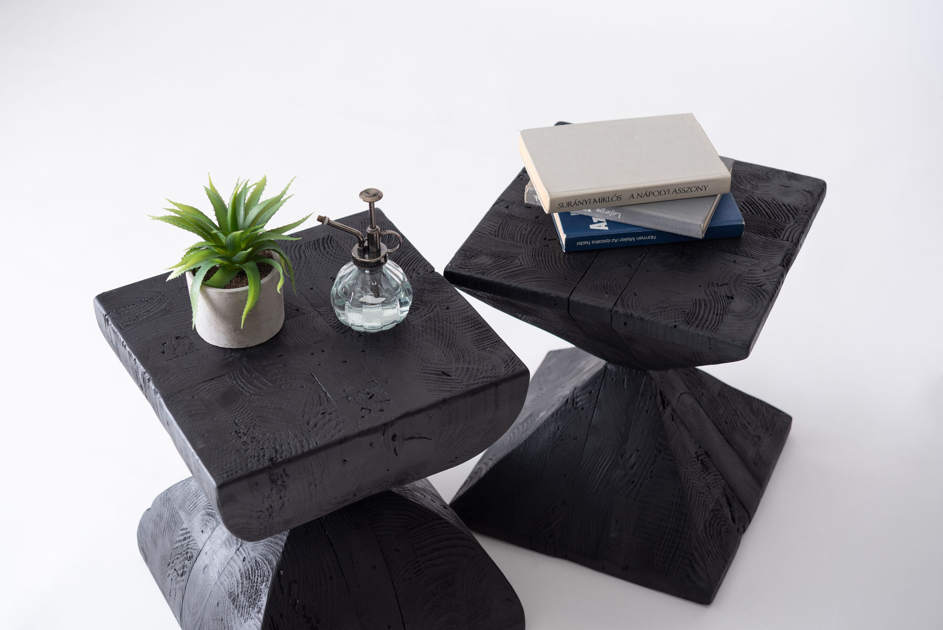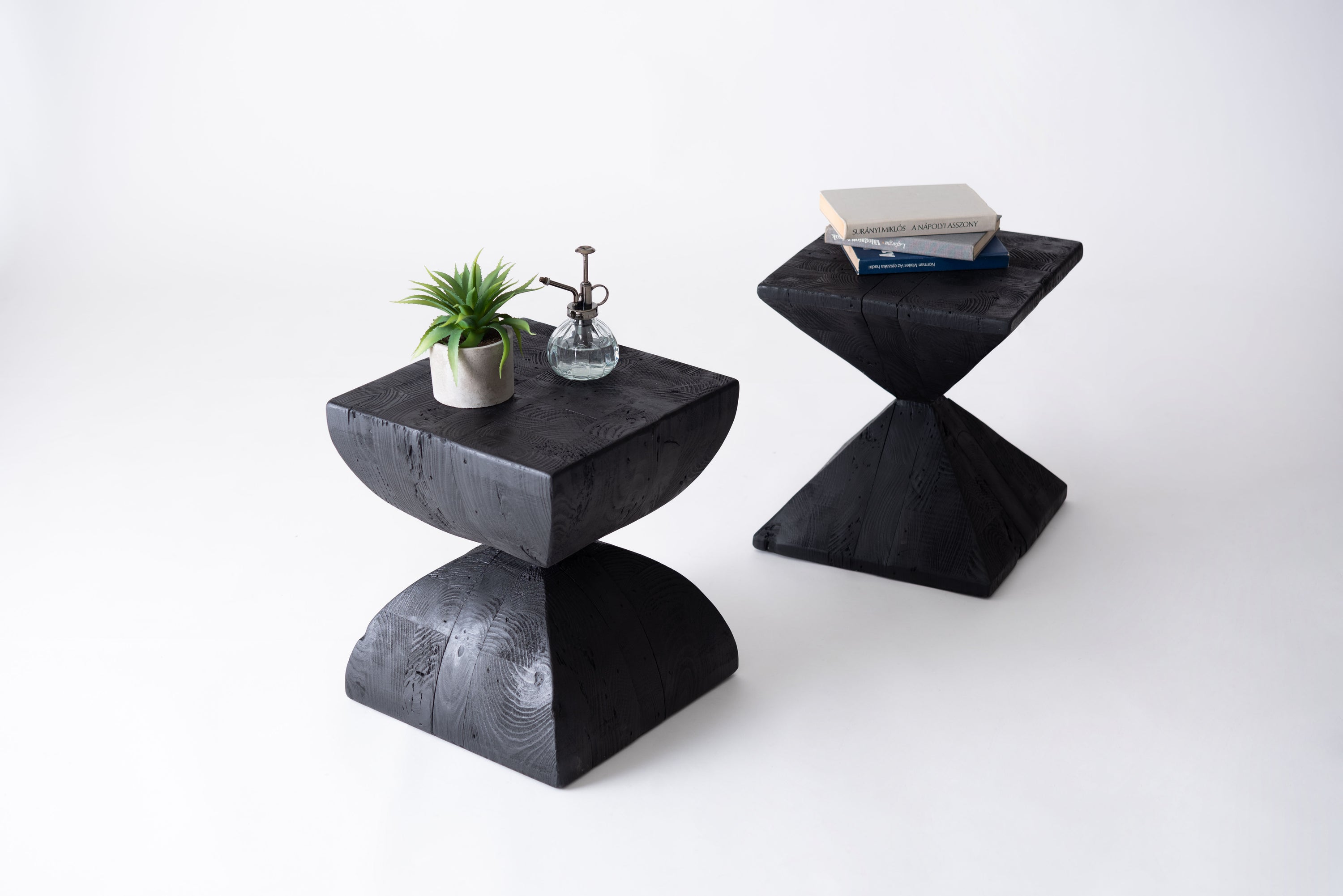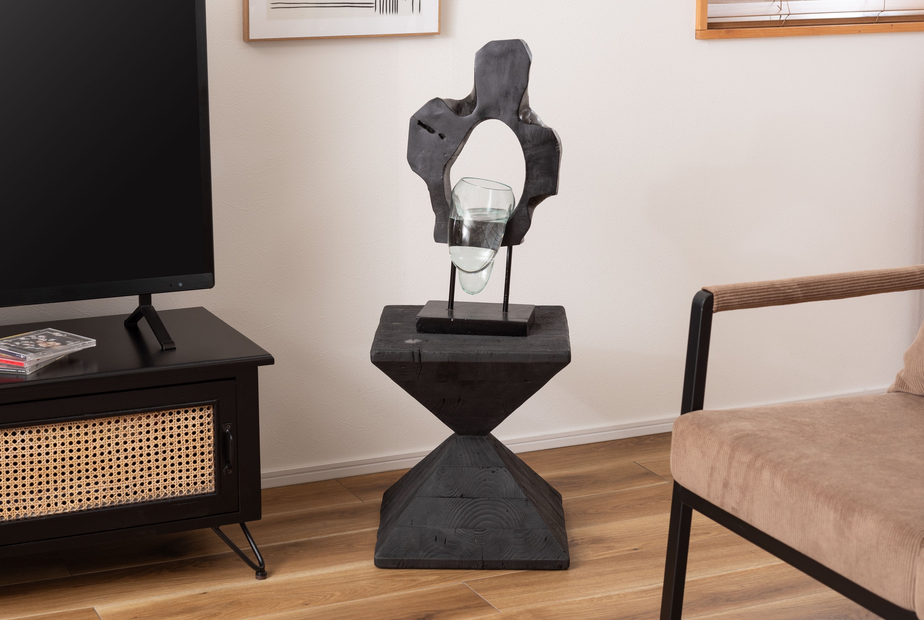 パイン古材×黒×線の美しさのバランス。インテリアのひとつとして置くだけでも存在感を放つサイドテーブル。表情の異なるパイン古材の質感と独特の形状が上質な空間を演出。ディスプレイ棚やスツールとしても使うことができます。ゆったりと使える上面。裏面に滑り止めフェルト付き。