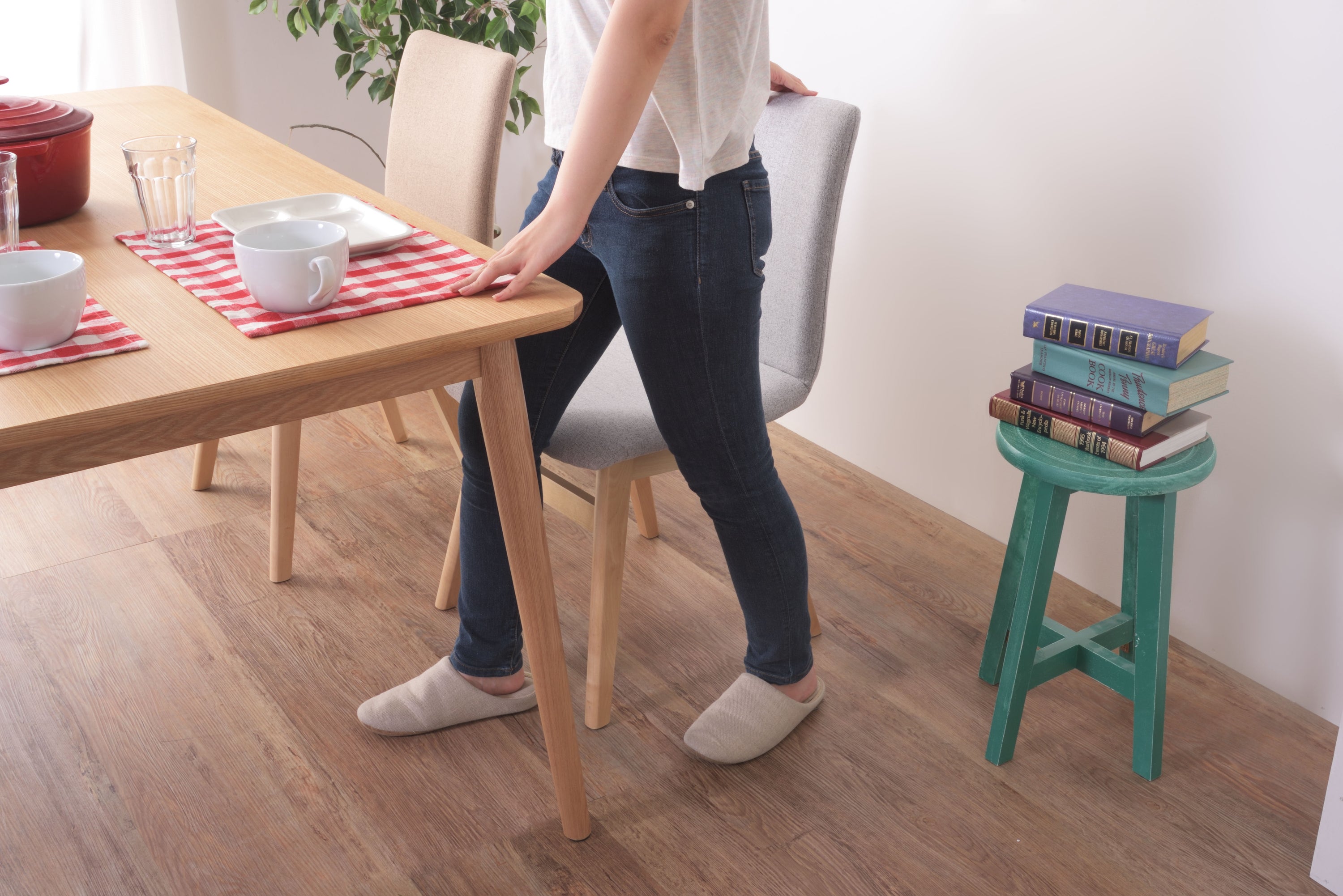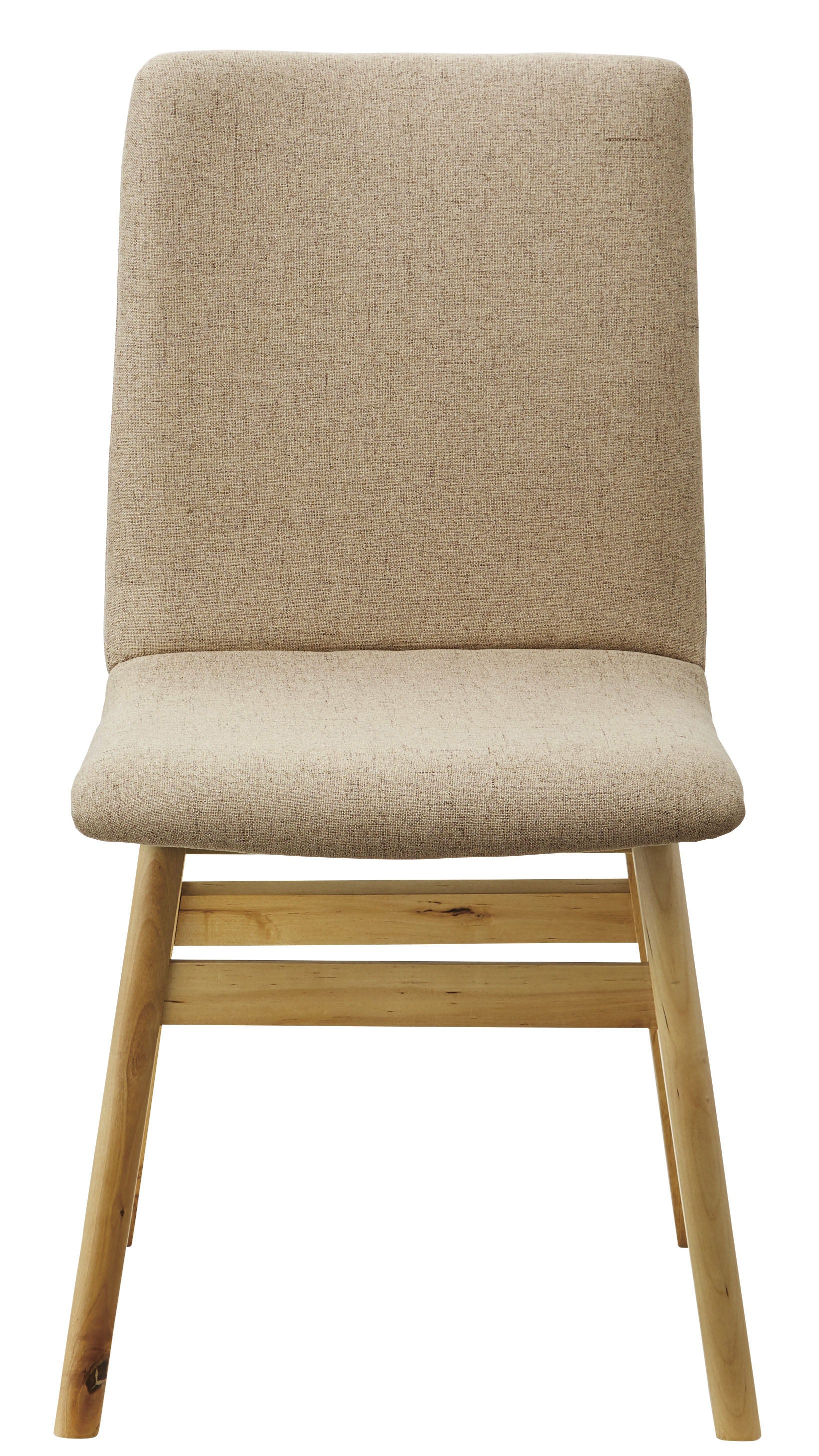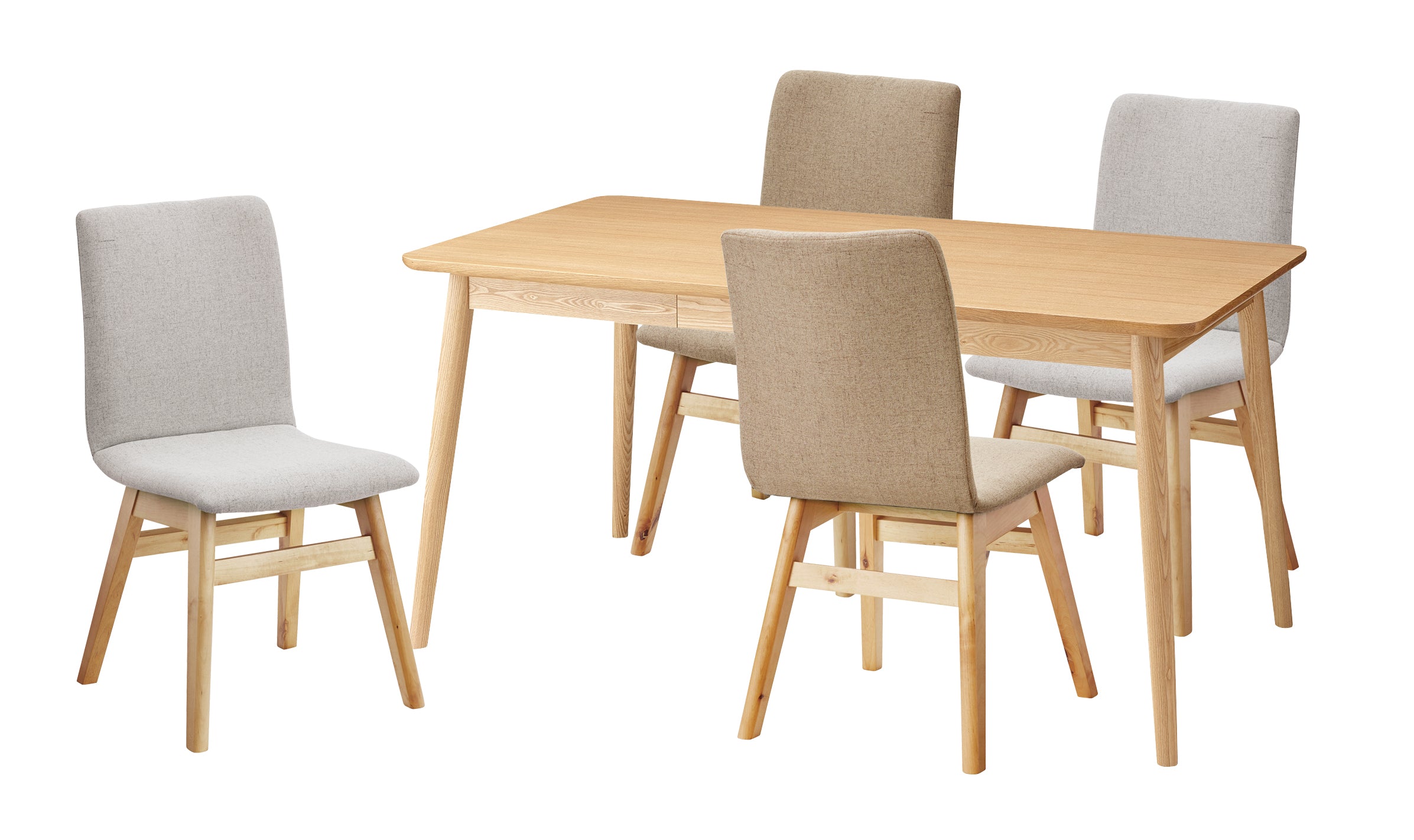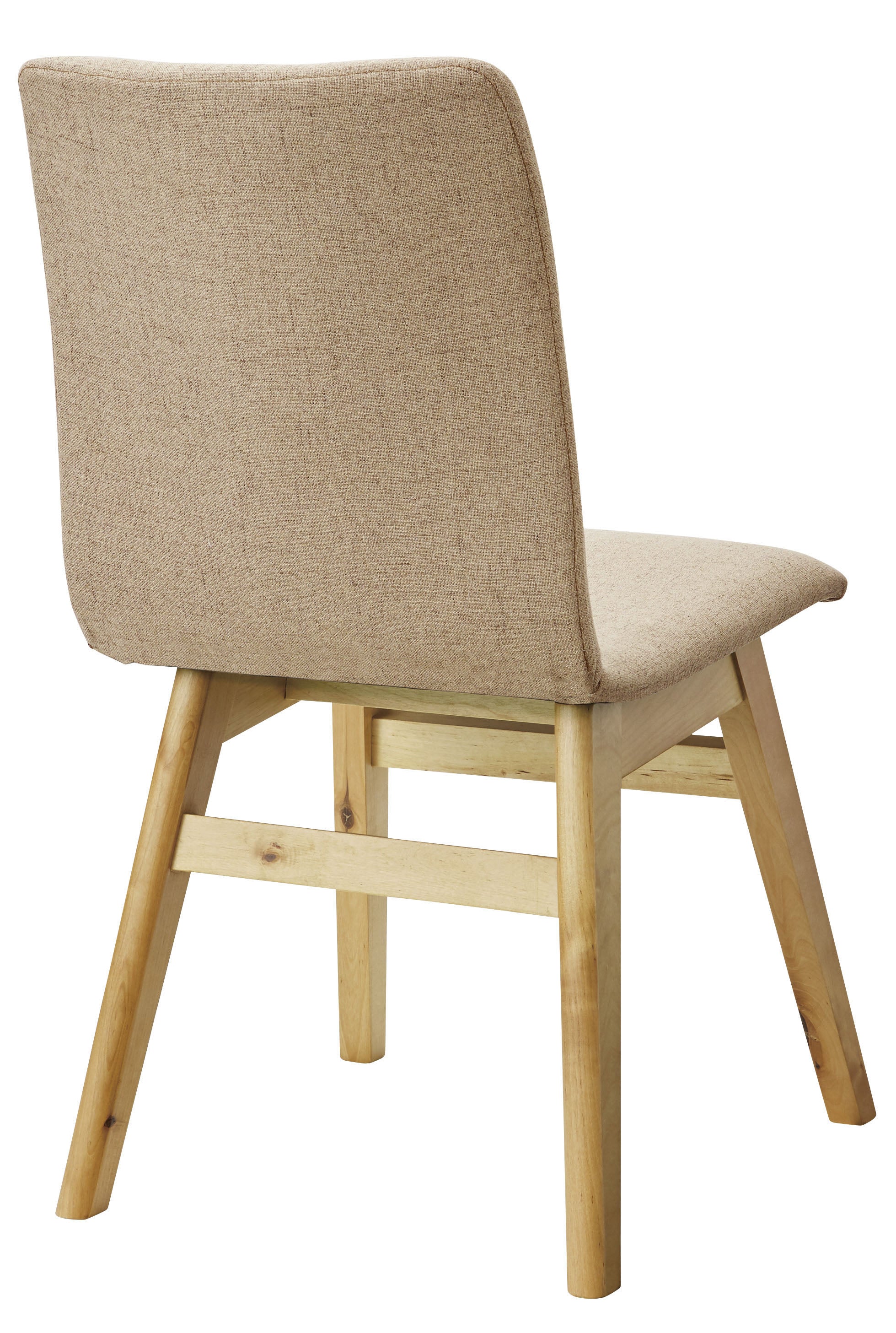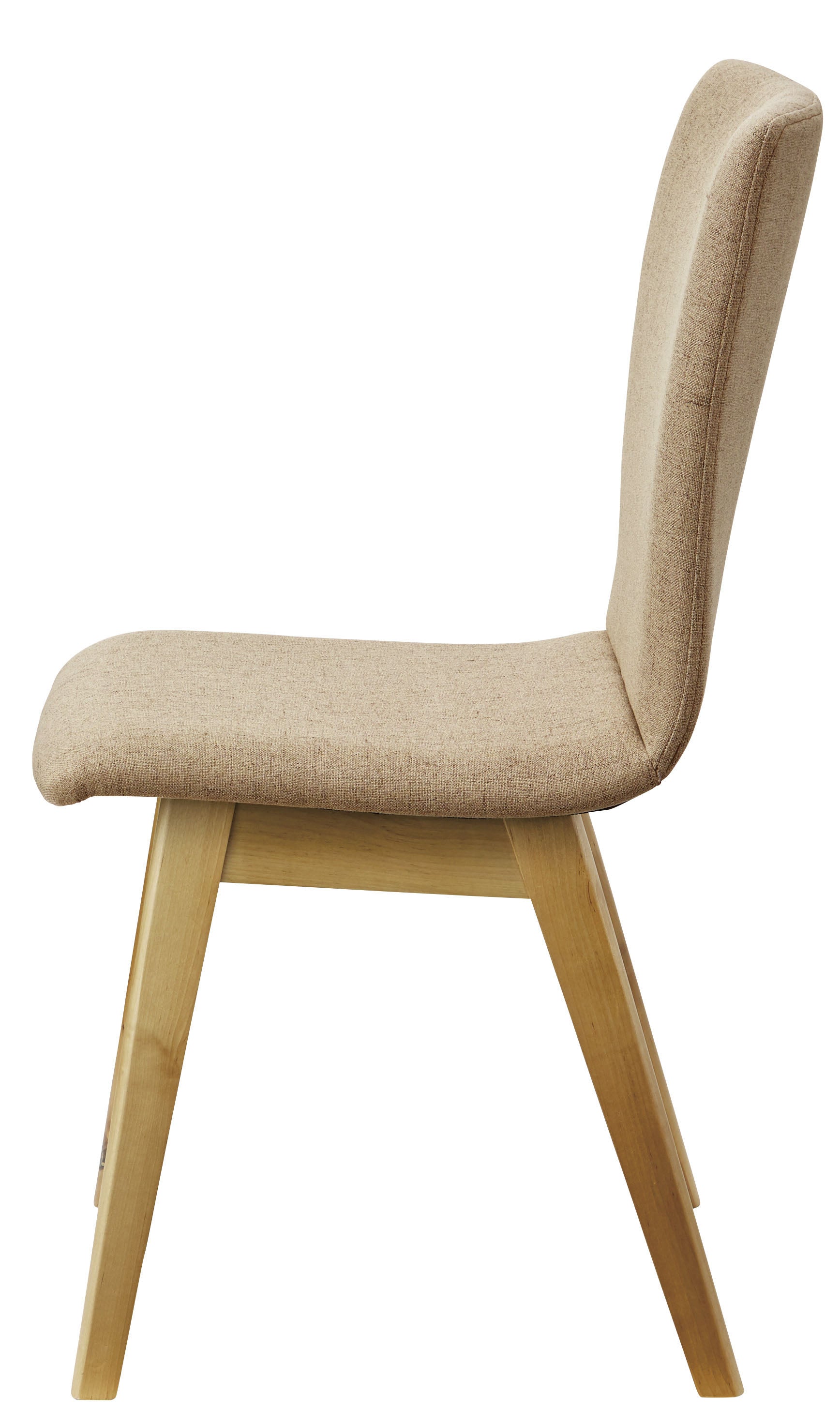 目の細かい淡い色合いのファブリック生地が特徴のダイニングチェア。 ハの字に広がる脚は、北欧の定番デザインで、天然木のダイニングテーブルとの相性もピッタリ。 座面・背もたれは1枚の合板から作られているので、座ったときに背もたれが緩やかにしなる 座り心地のいい構造になっています。