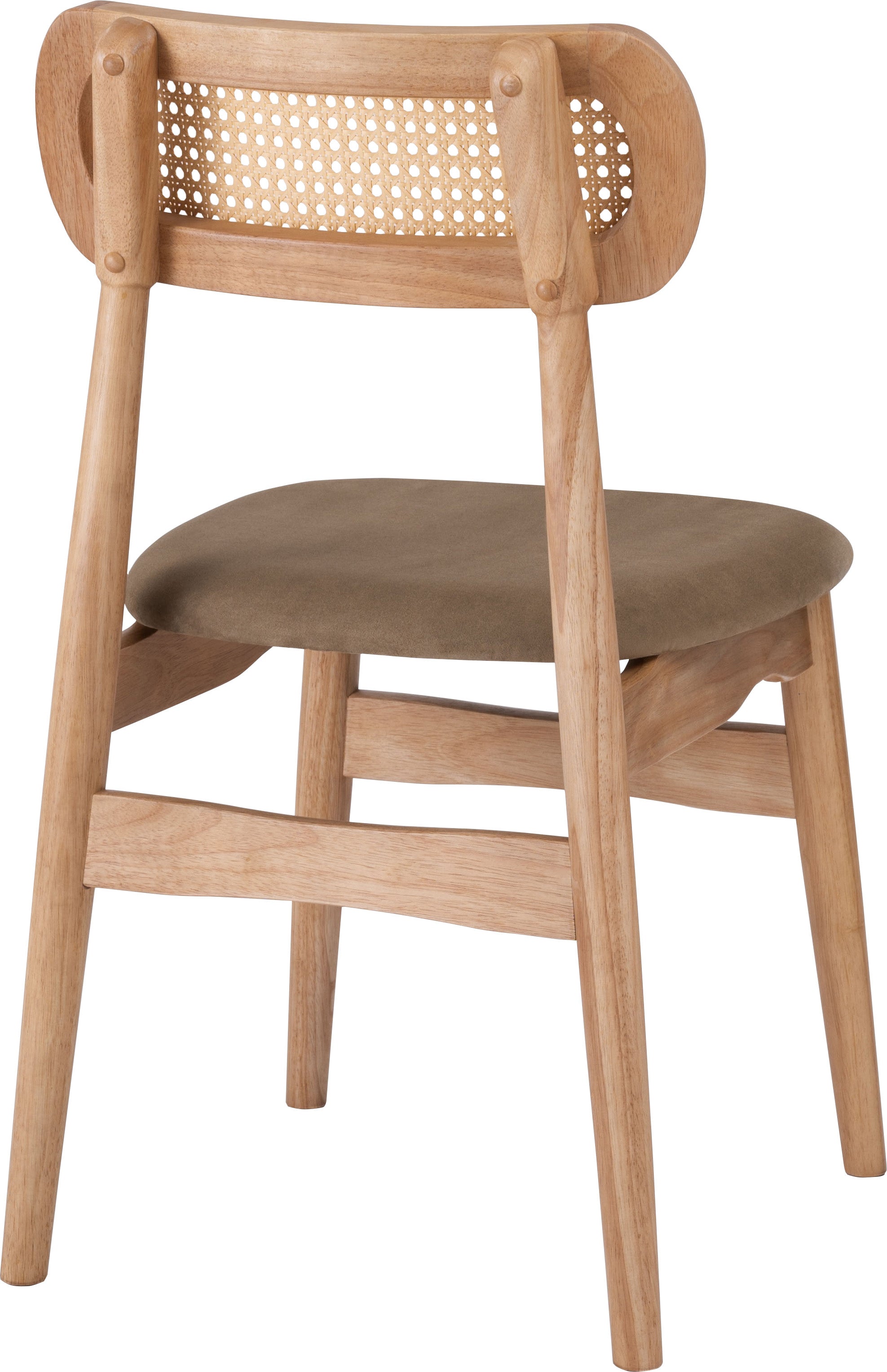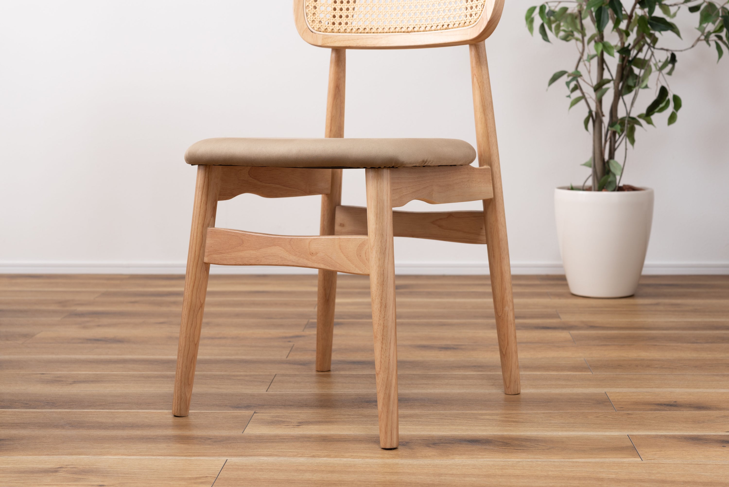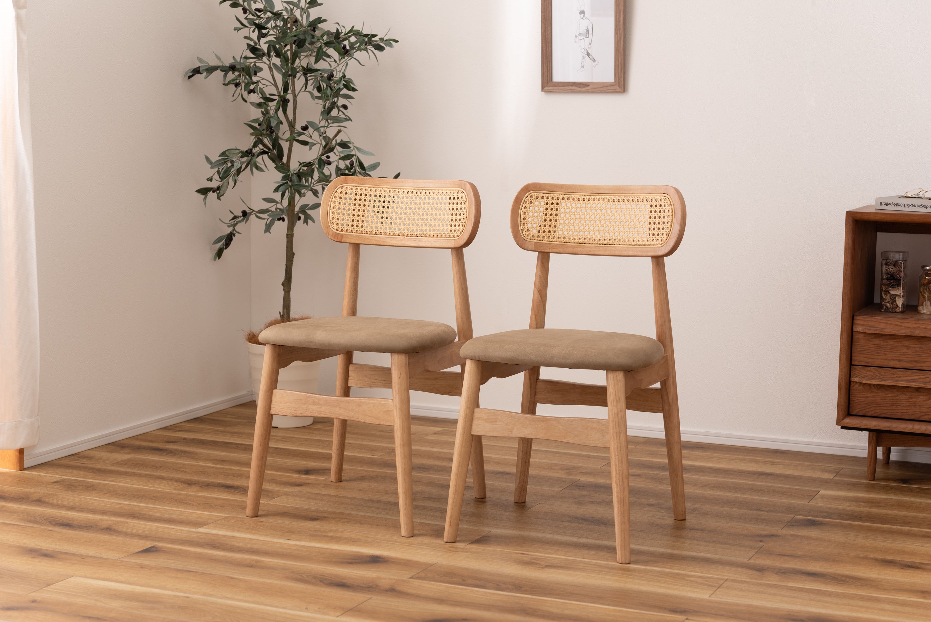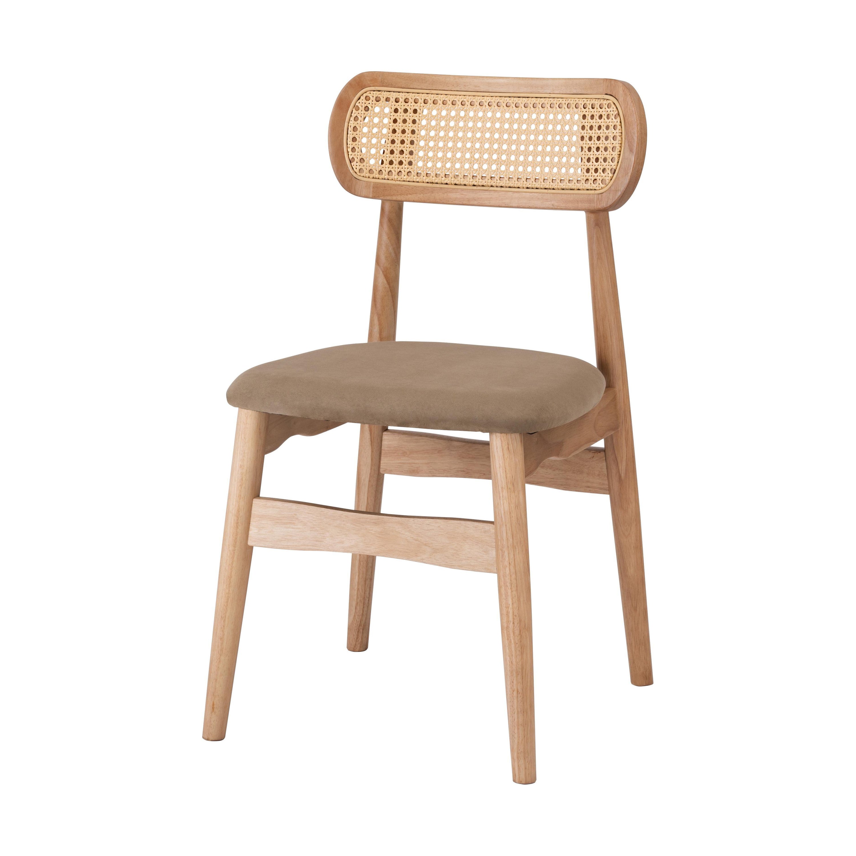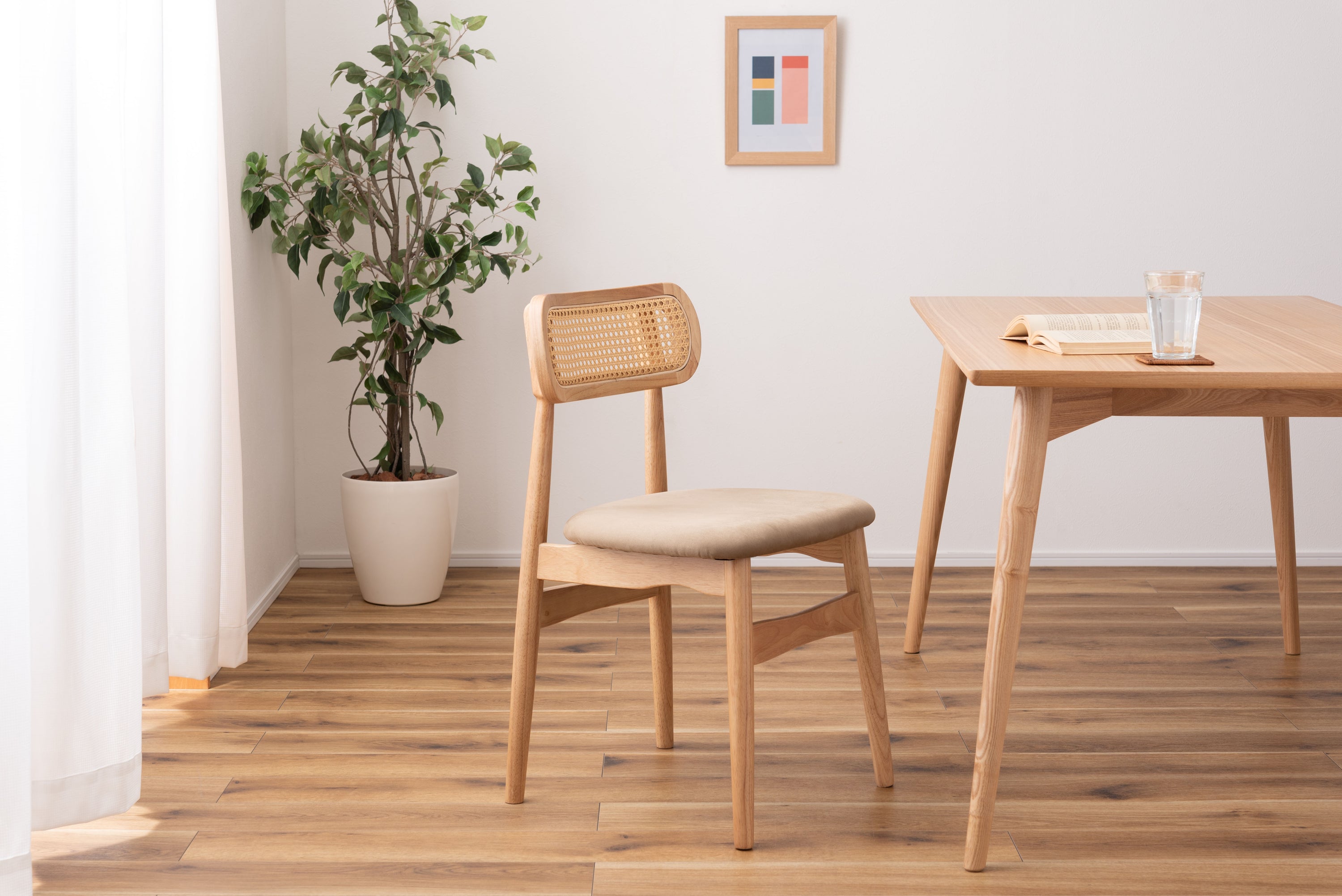 高級感のあるスエード調の座面×天然木×ポリプロピレン素材の人口ラタンが優しい雰囲気を作り出してくれるチェア。 角の無い丸みのあるデザインでどんなインテリアにもなじみます。 ささくれが無いため衣類の繊維が絡みません 単色でありながら表情豊かなスエード調の生地 天然木を使用した木フレーム