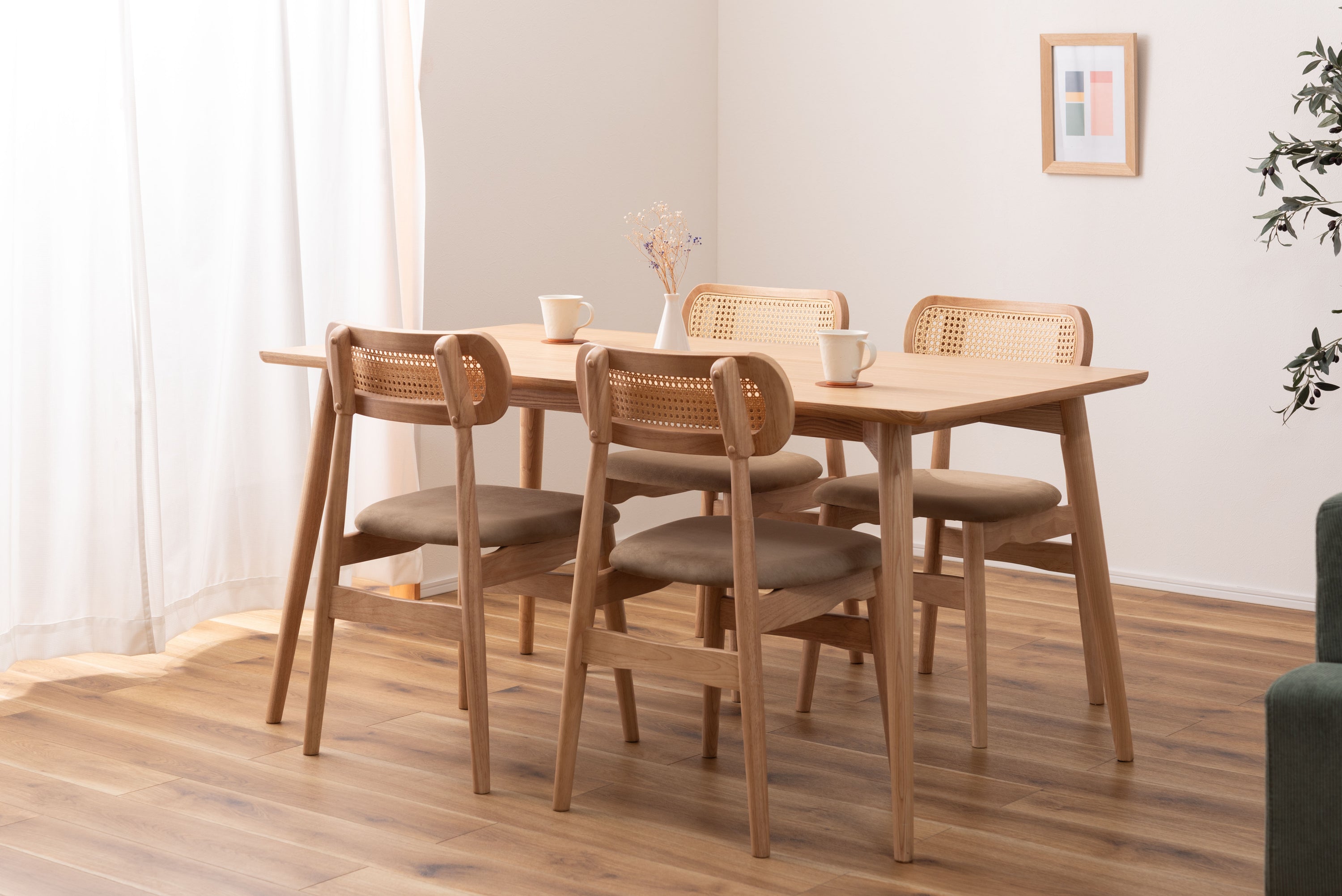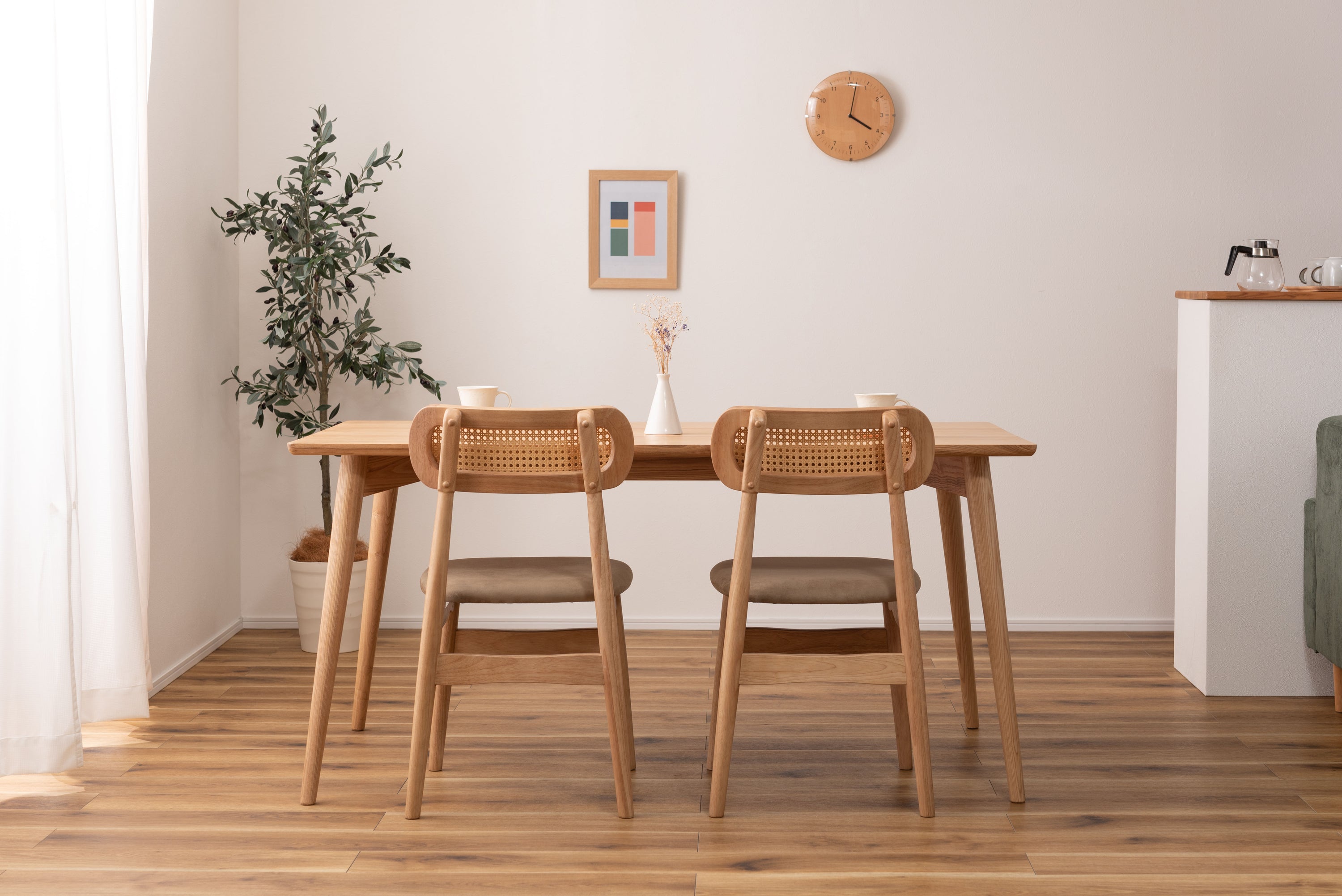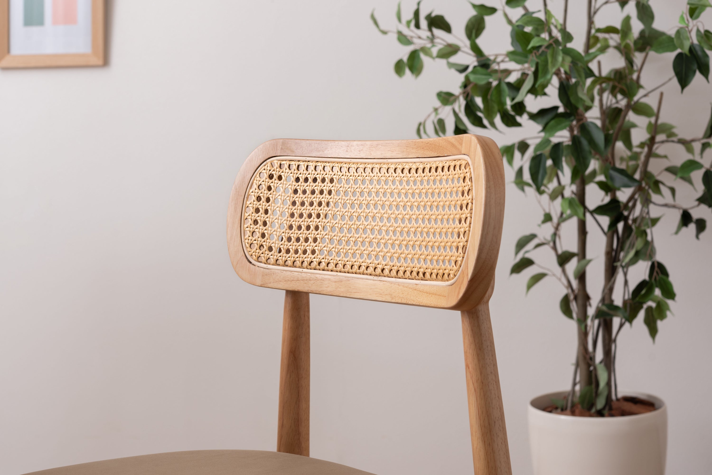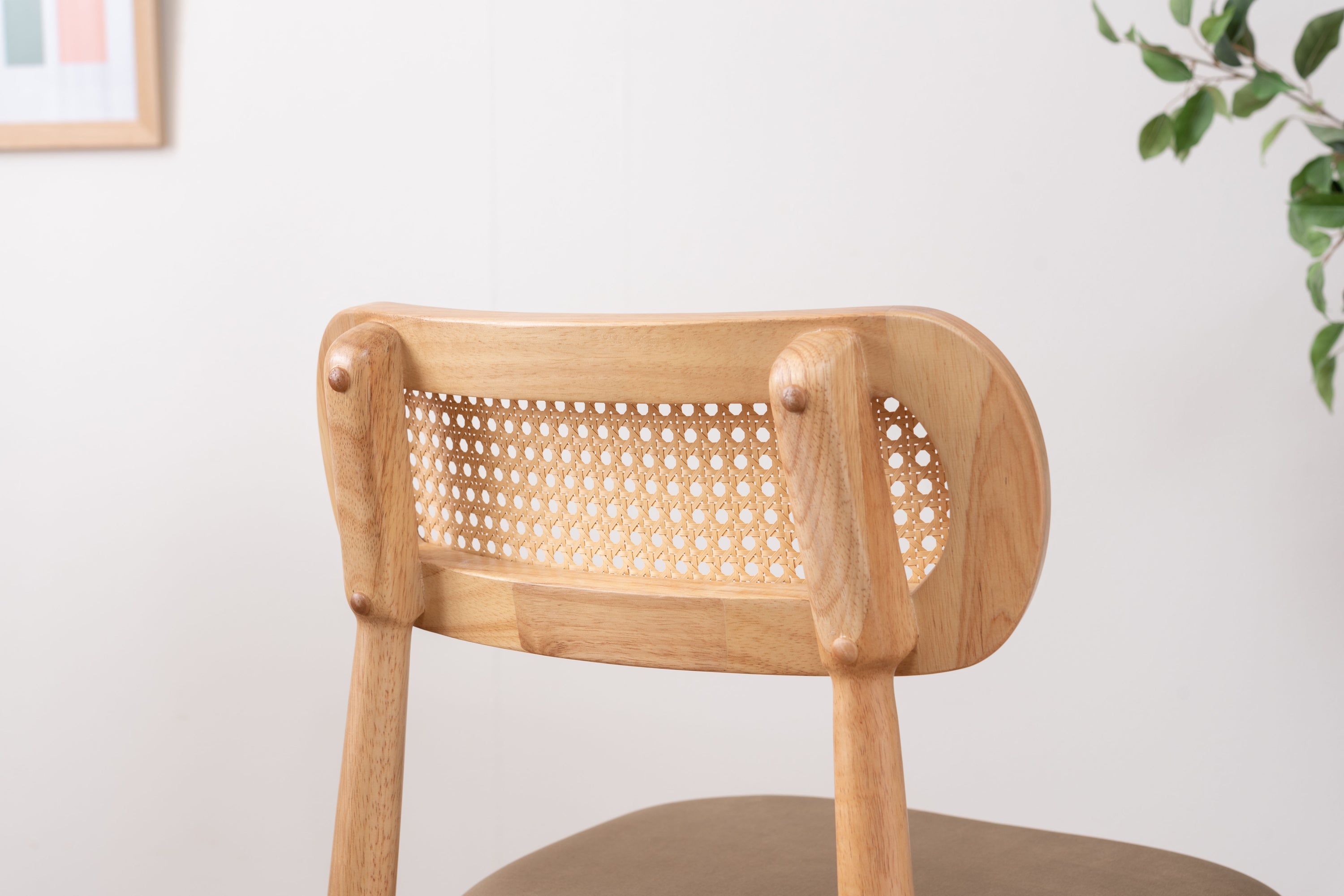 高級感のあるスエード調の座面×天然木×ポリプロピレン素材の人口ラタンが優しい雰囲気を作り出してくれるチェア。 角の無い丸みのあるデザインでどんなインテリアにもなじみます。 ささくれが無いため衣類の繊維が絡みません 単色でありながら表情豊かなスエード調の生地 天然木を使用した木フレーム