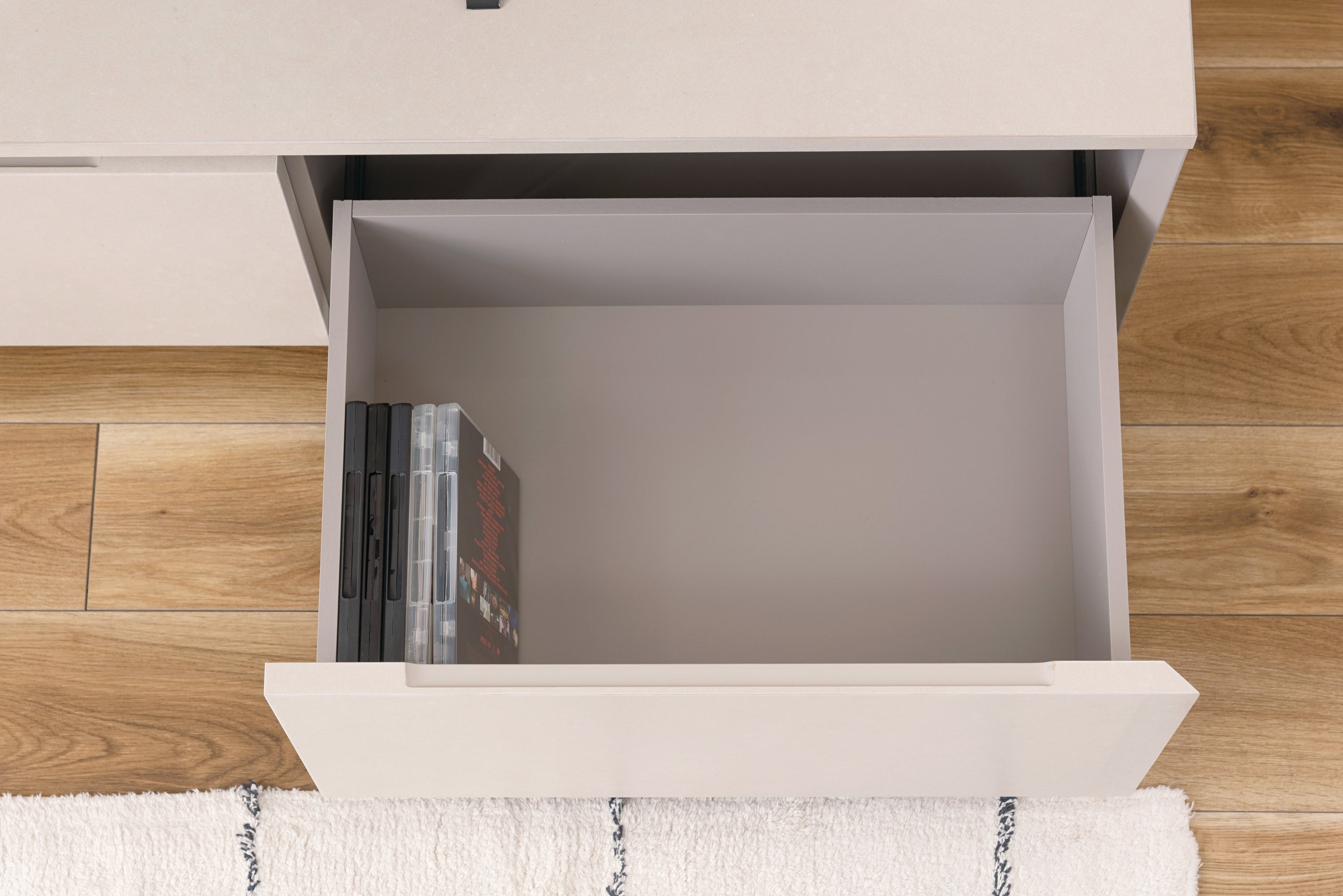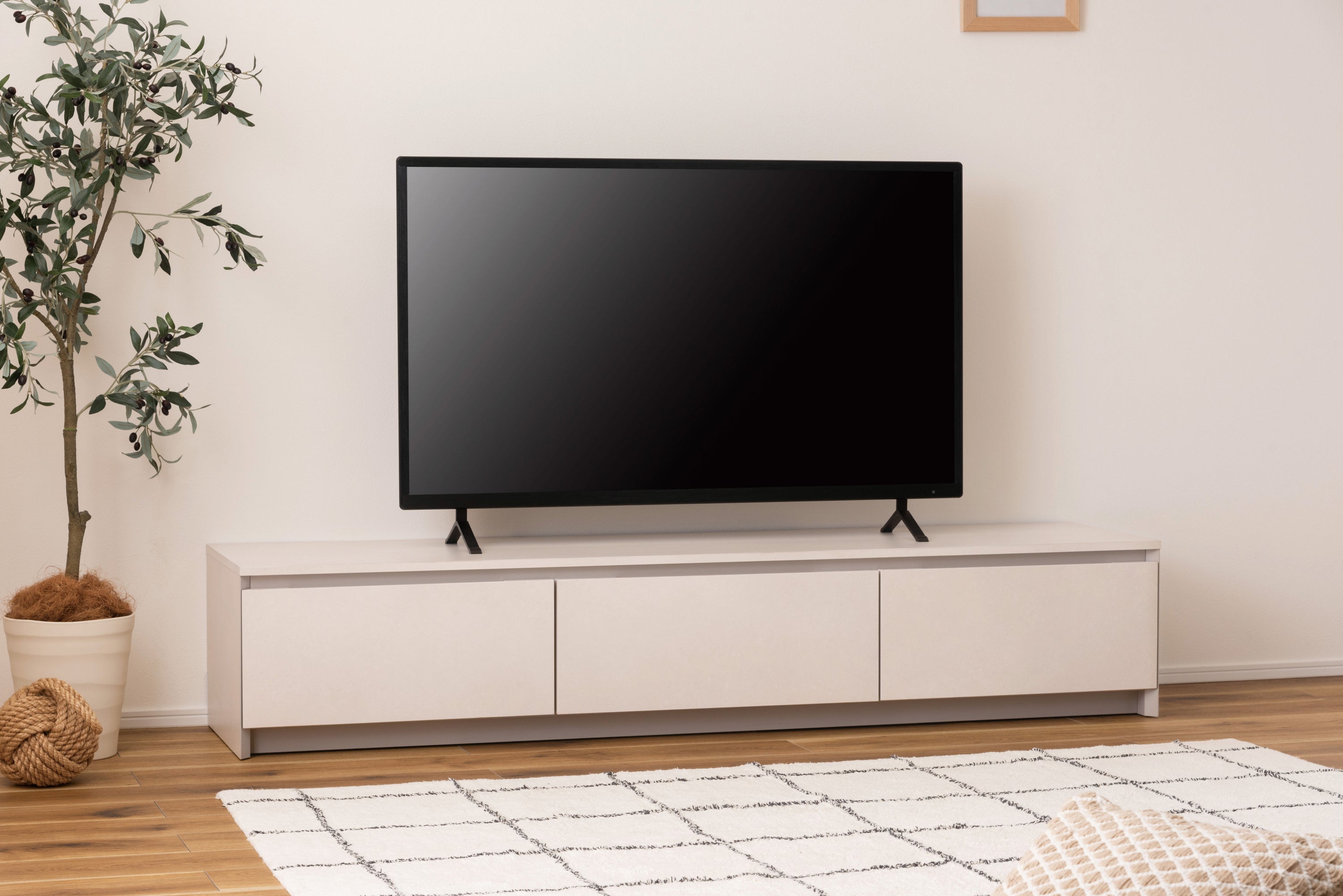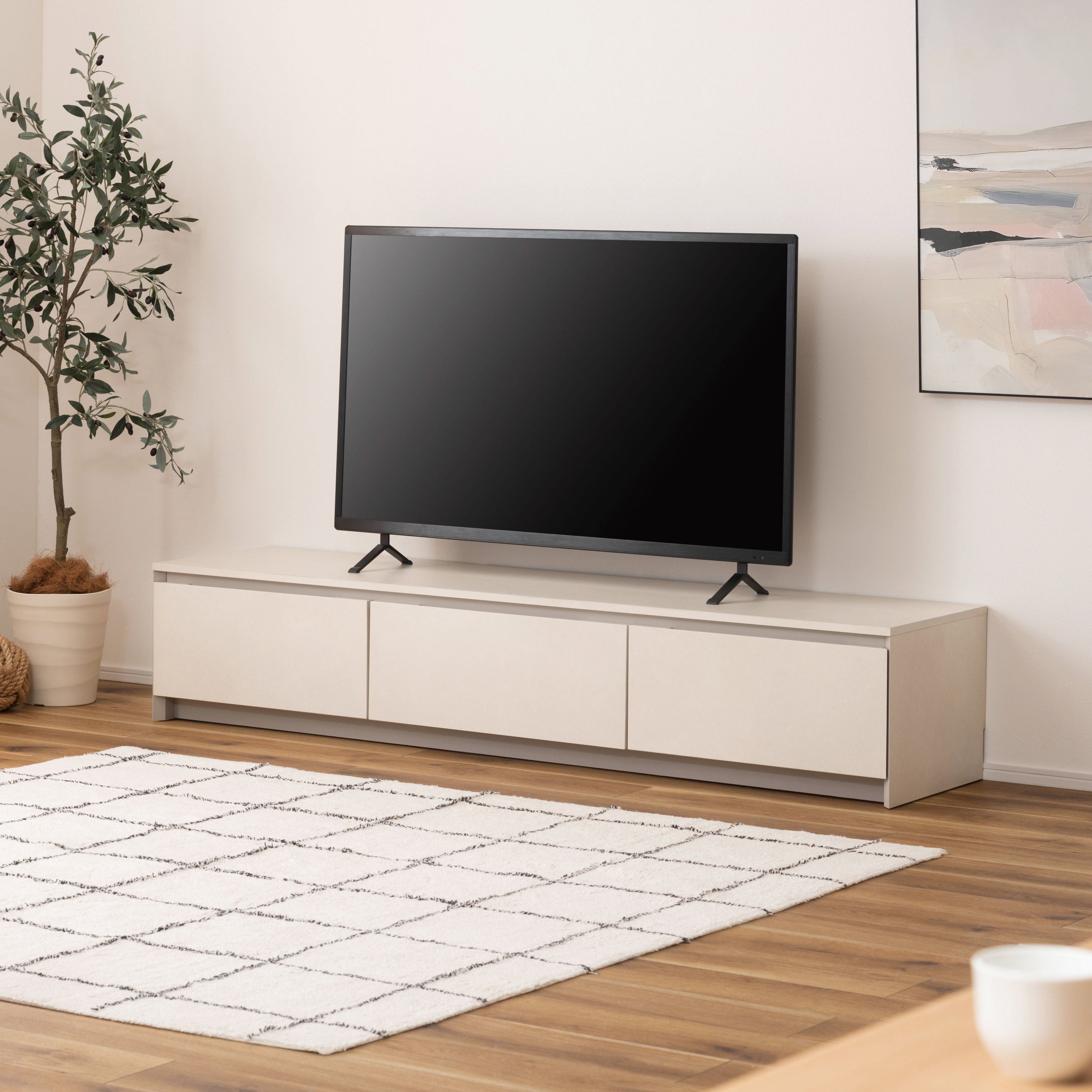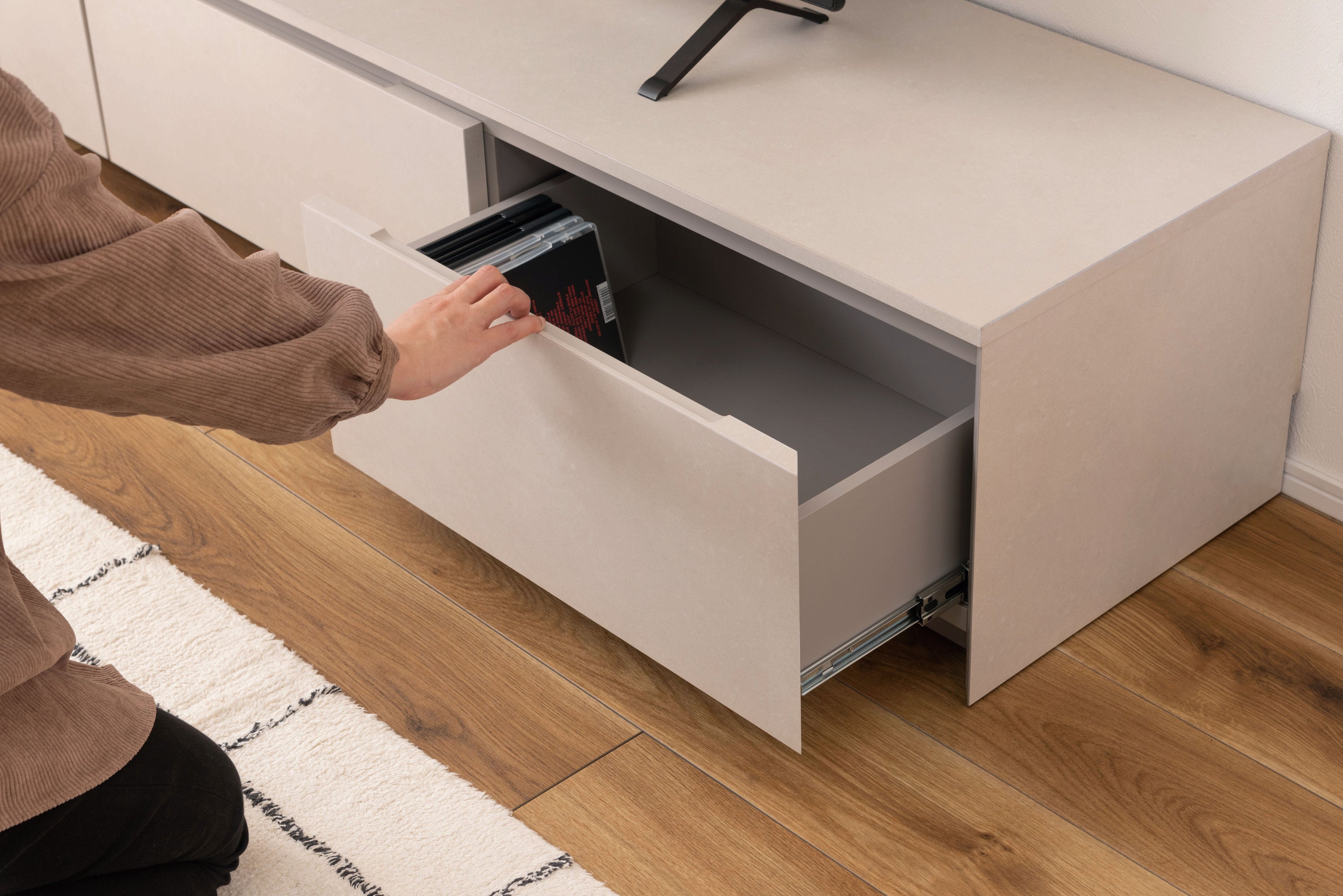 インテリアの主役にもなる存在感抜群のテレビボードです。●収納力も、デザイン性と機能性を兼ね備えています。●こだわりが詰まった高品質の日本製。●本体の左右は引き出しタイプの収納スペース。スライドレール仕様で手前までしっかりと引き出せるので収納物の出し入れが楽にでき、引き出し奥までしっかりと収納する事ができます。●中央部分はフラップ扉タイプの収納スペース。AVデッキ等の収納に最適。●また、3段階の高さ調整が可能な棚板が付いています。●フラップ扉を開ける時のスピードを調節できるソフトダウンステー調整機能付き。●中央スペースの背面にはコード通し穴が上下に2箇所付いているので、AVデッキ類の配線処理もらくらく。●天板背面にはコードスリットが付いているので、TVのコードをスッキリ綺麗に処理できます。●側面の後ろ側にも巾木除けにもなるコードスリットが付いているので、綺麗に壁へ寄せての設置が可能です。●本体の表面部分はストーン調のメラミン化粧板仕上げ。メラミン化粧板は表面硬度が高く、対汚染性・耐摩耗性・耐熱性・耐水性に優れた特徴を持っています。