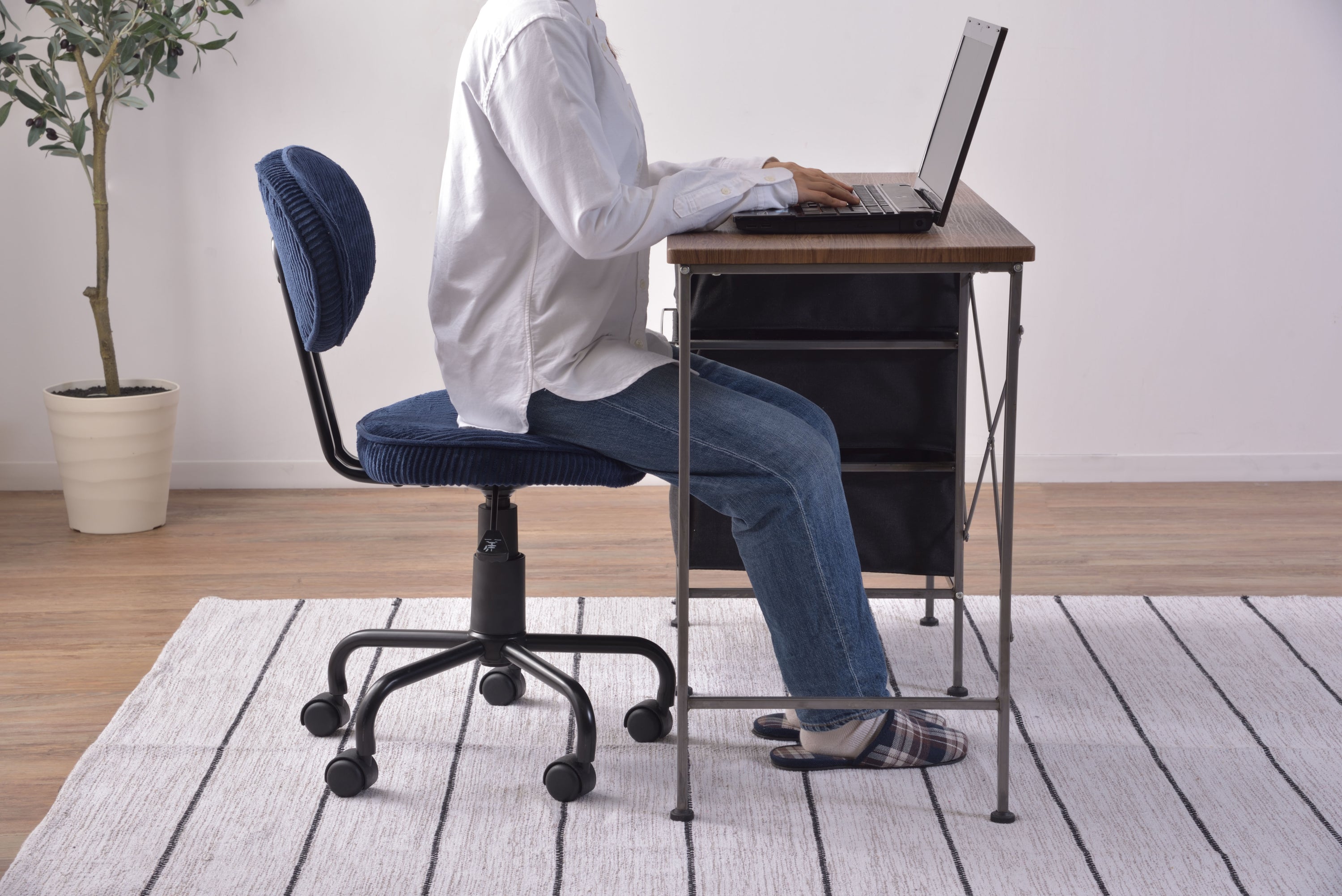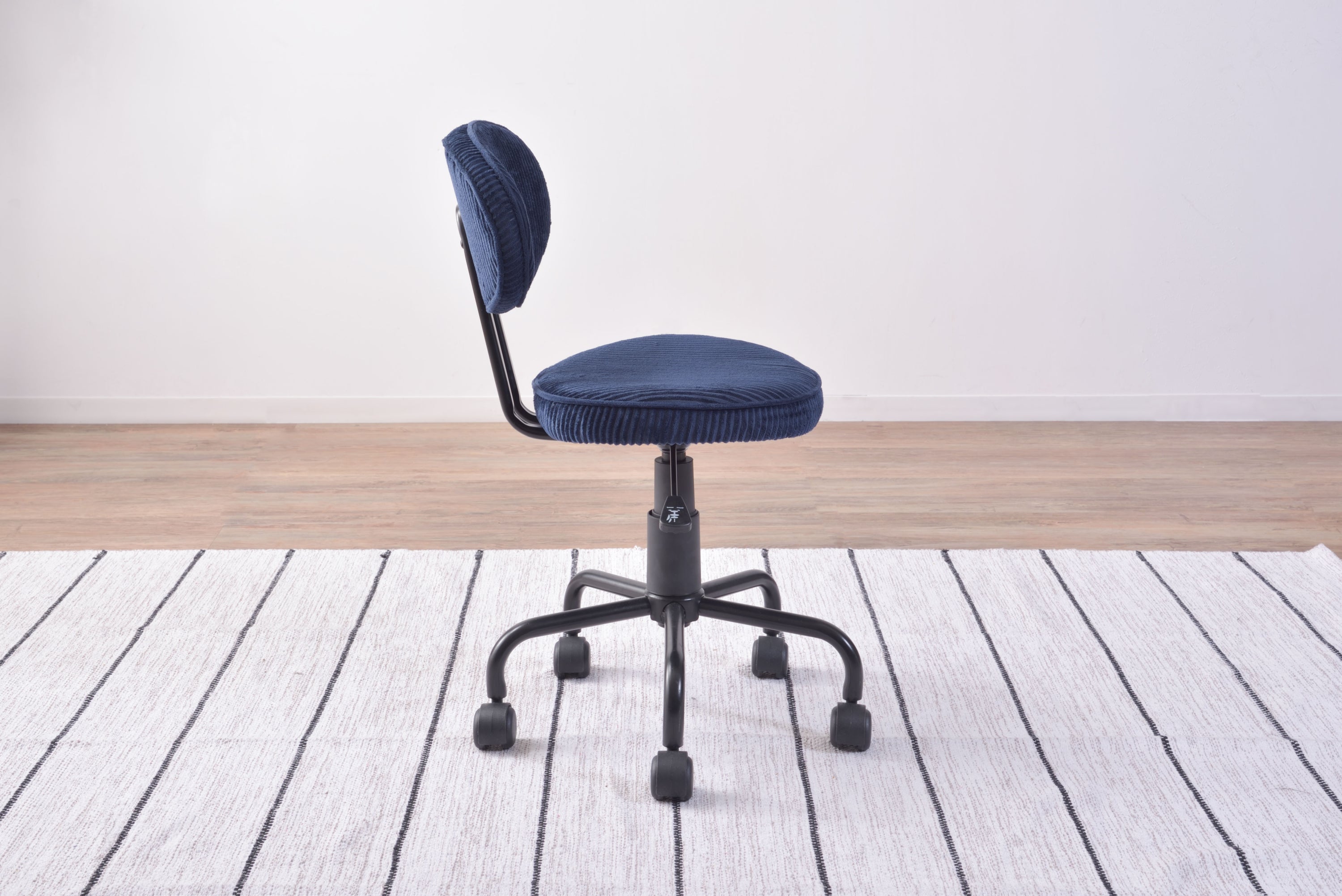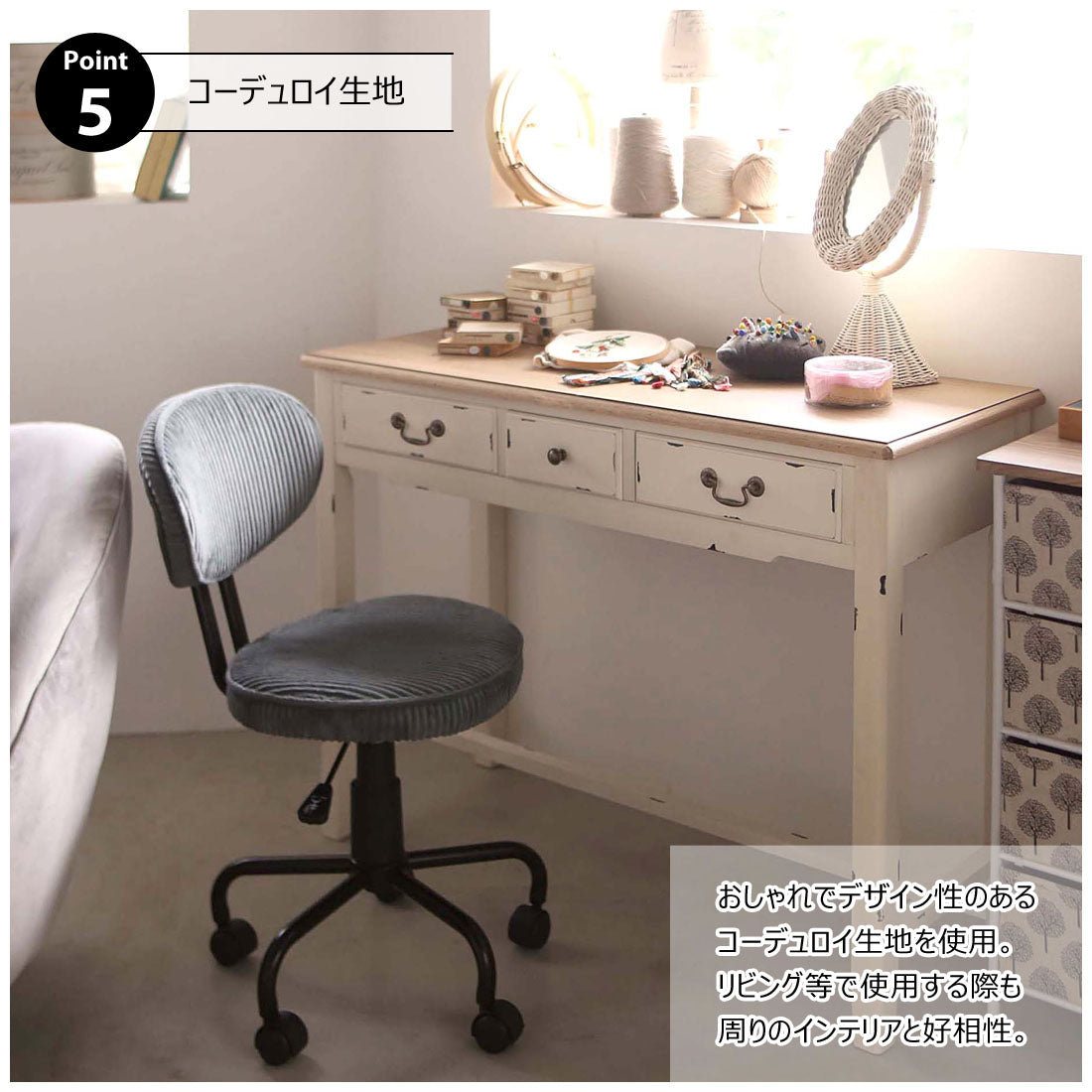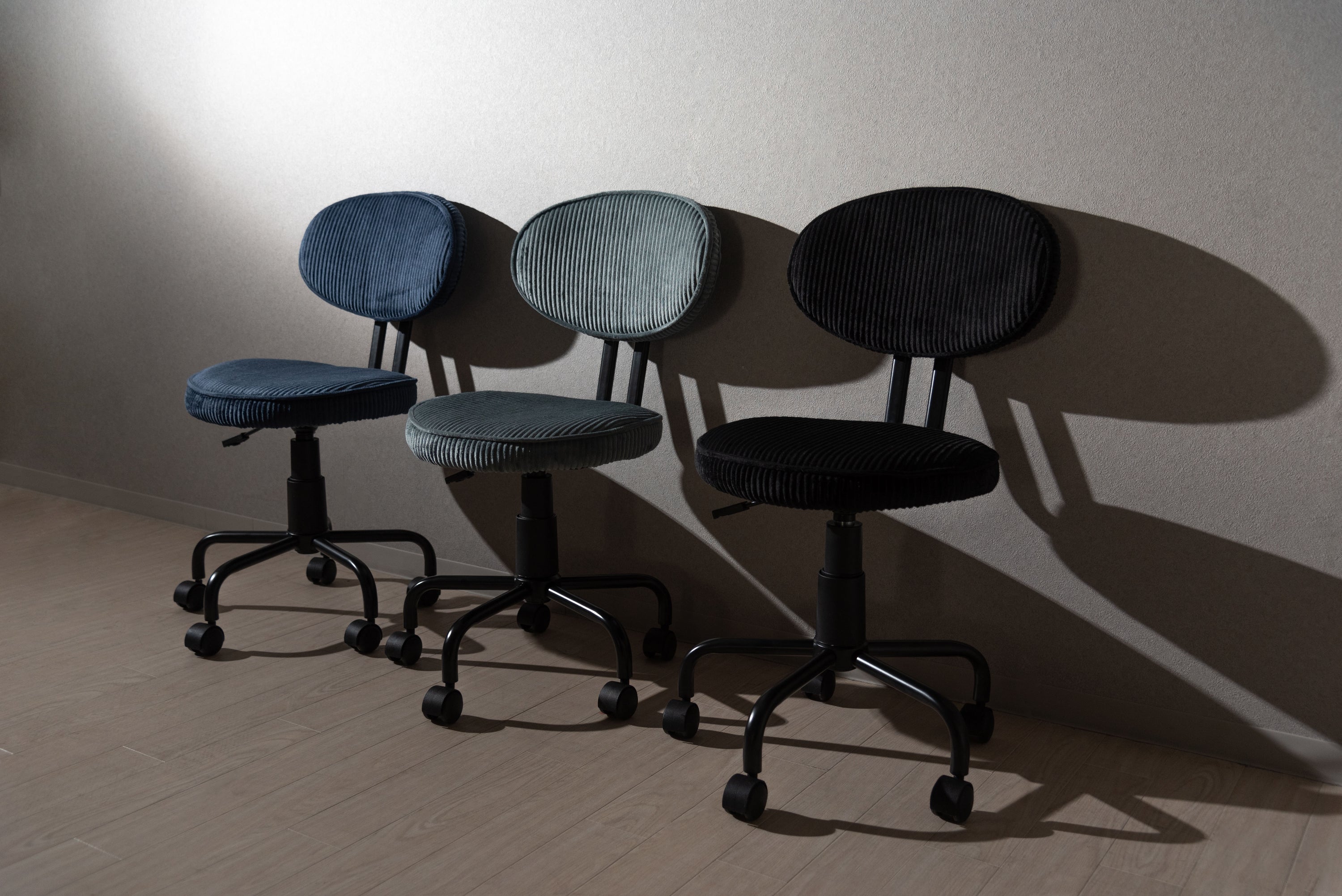 コンパクトサイズでデザイン性の高いおしゃれなデスクチェア。スリムサイズなのでリビングやベッドサイドなど狭い空間での使用に便利。スリムサイズのデスクにもピッタリフィットする使い勝手のよいデスクチェア。ガス圧シリンダーの昇降式なので、座面下のレバーで高さ調整可能。座面回転式でキャスター付き。背もたれと座面にはウレタンクッション入り。おしゃれでデザイン性のあるコーデュロイ生地を使用。リビング等で使用する際も周りのインテリアと好相性。シェアオフィスやデザイナーズオフィス等での使用もおススメ。