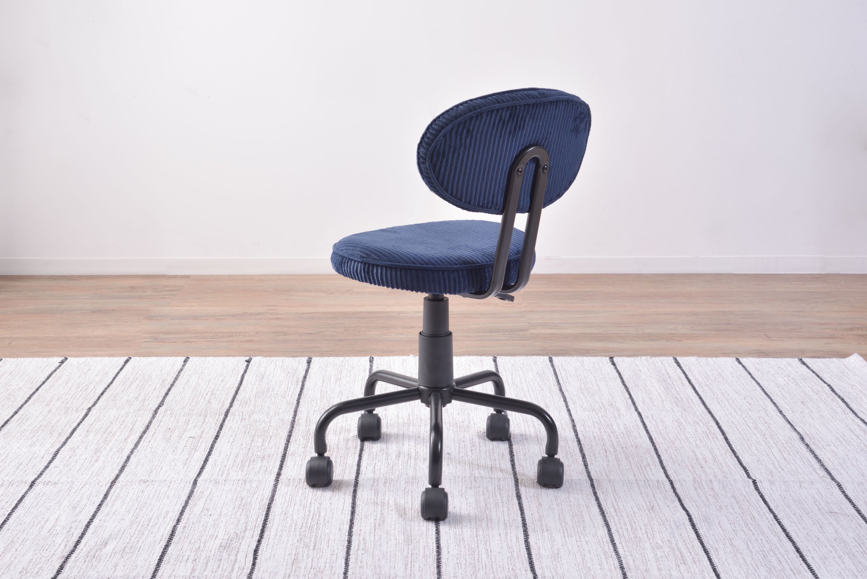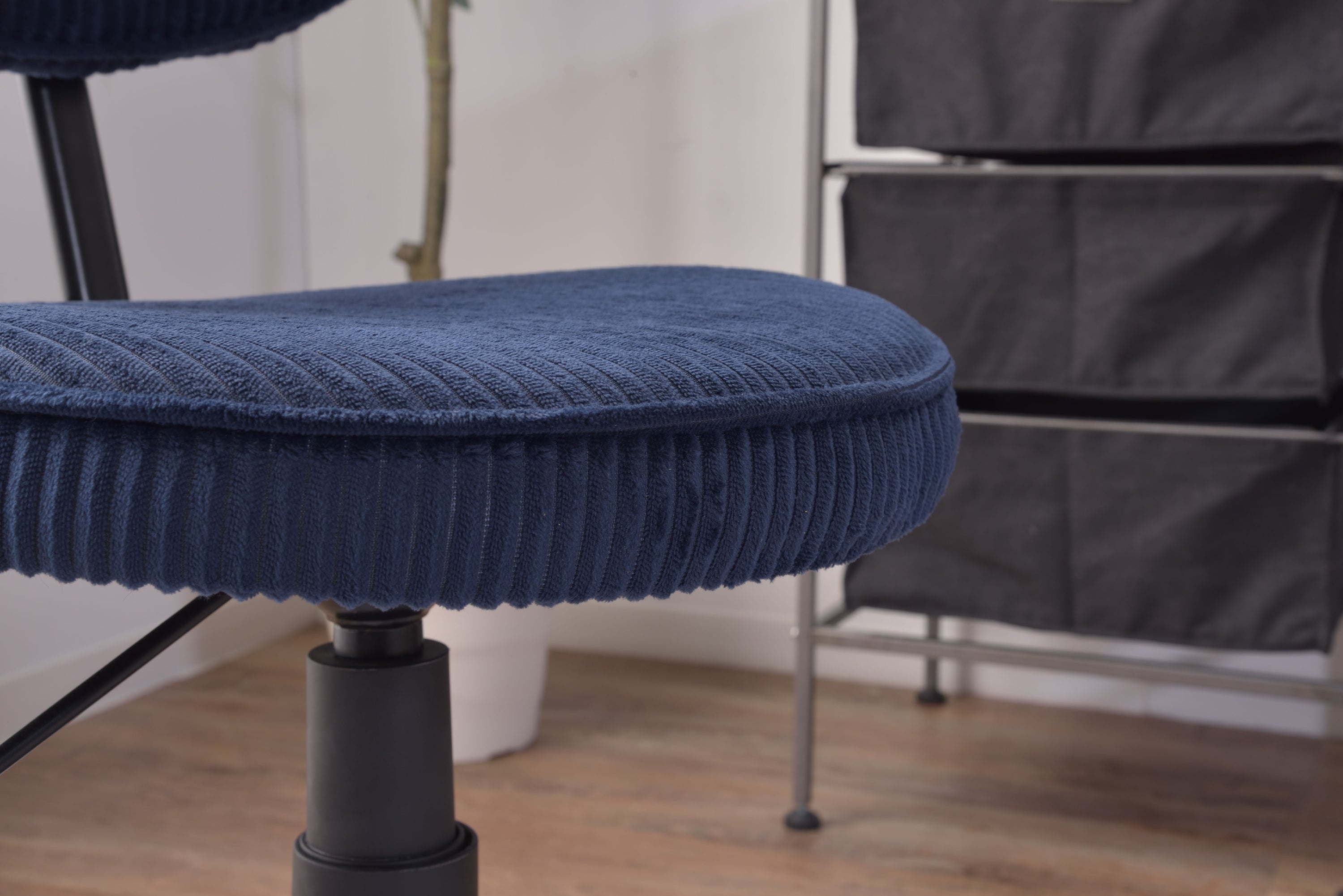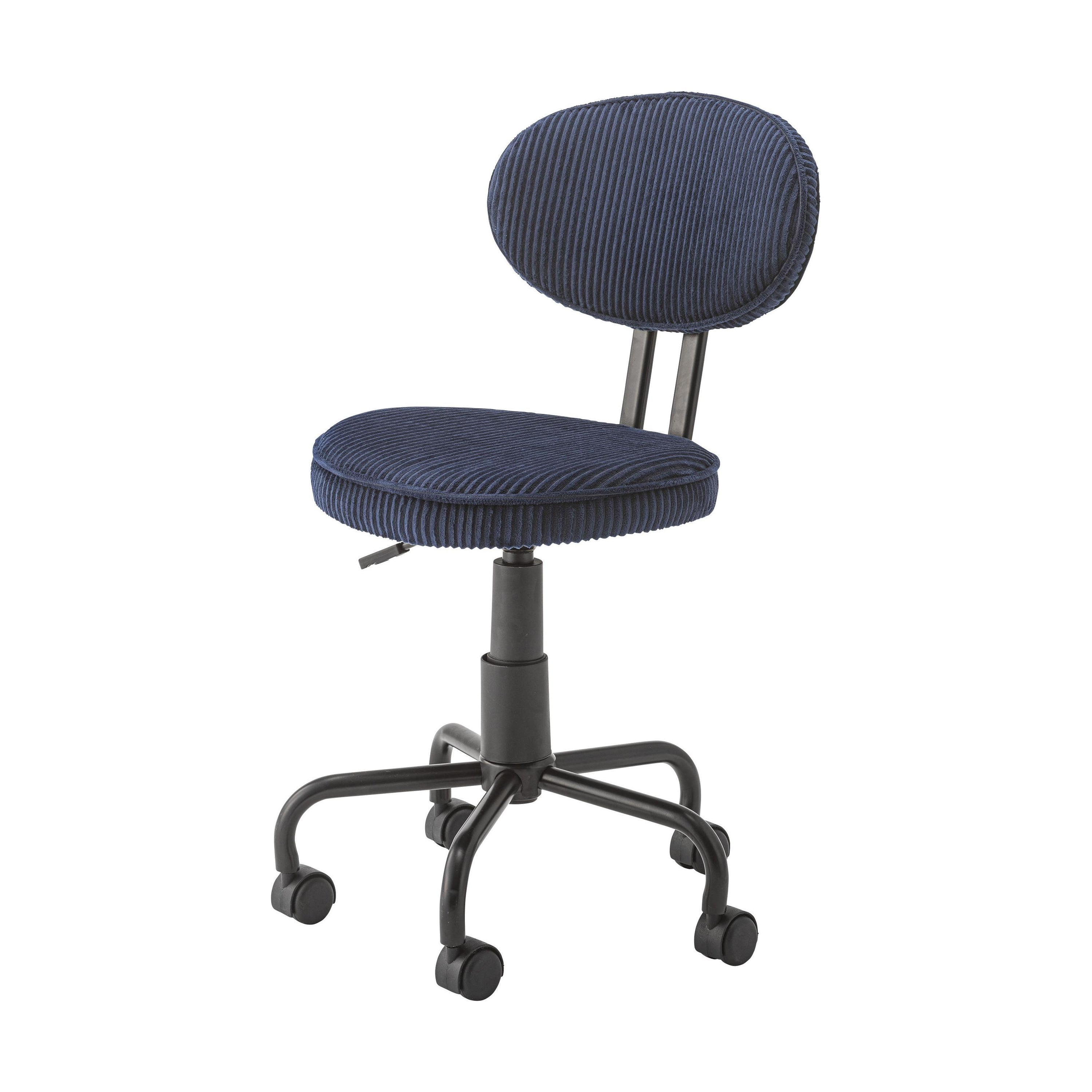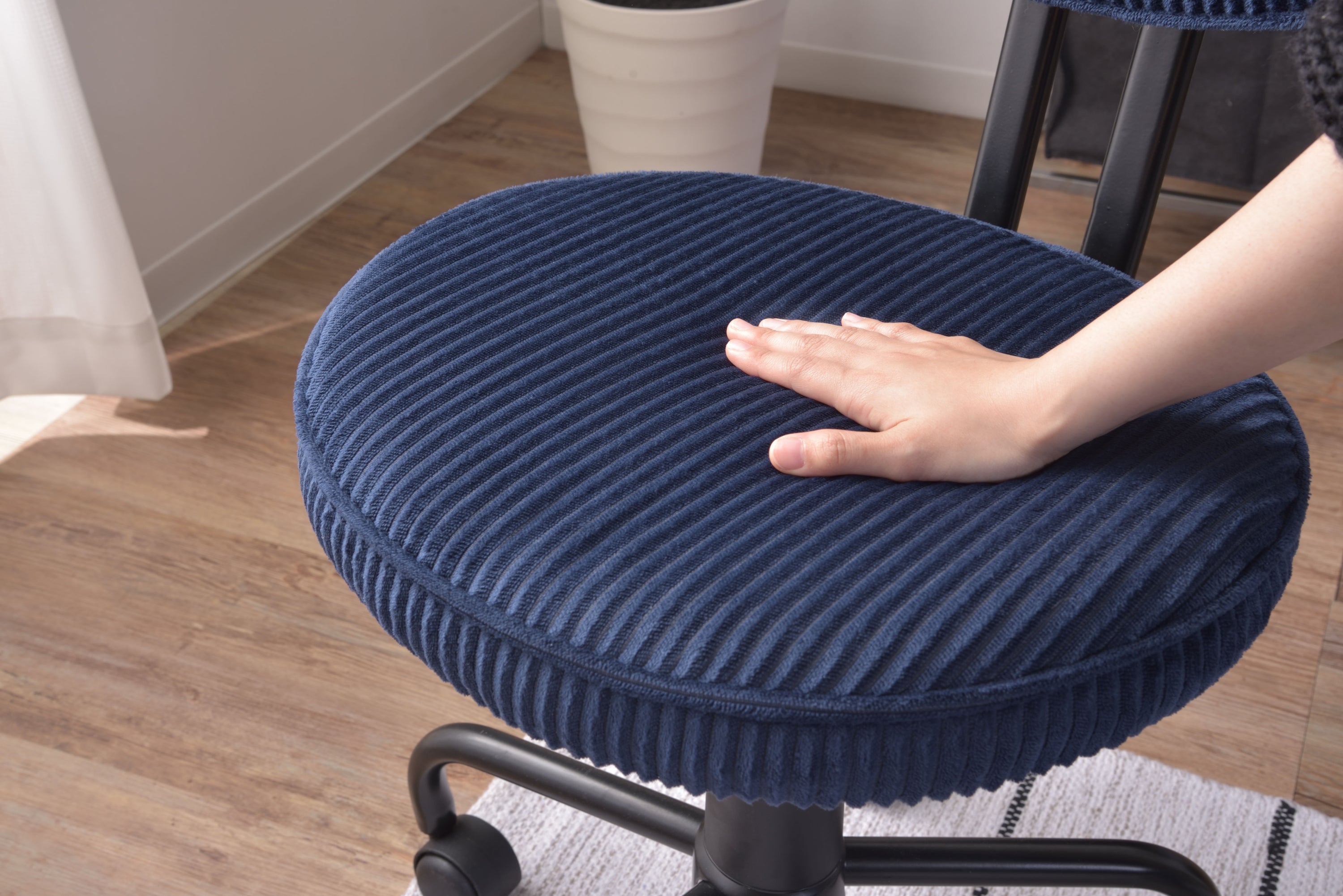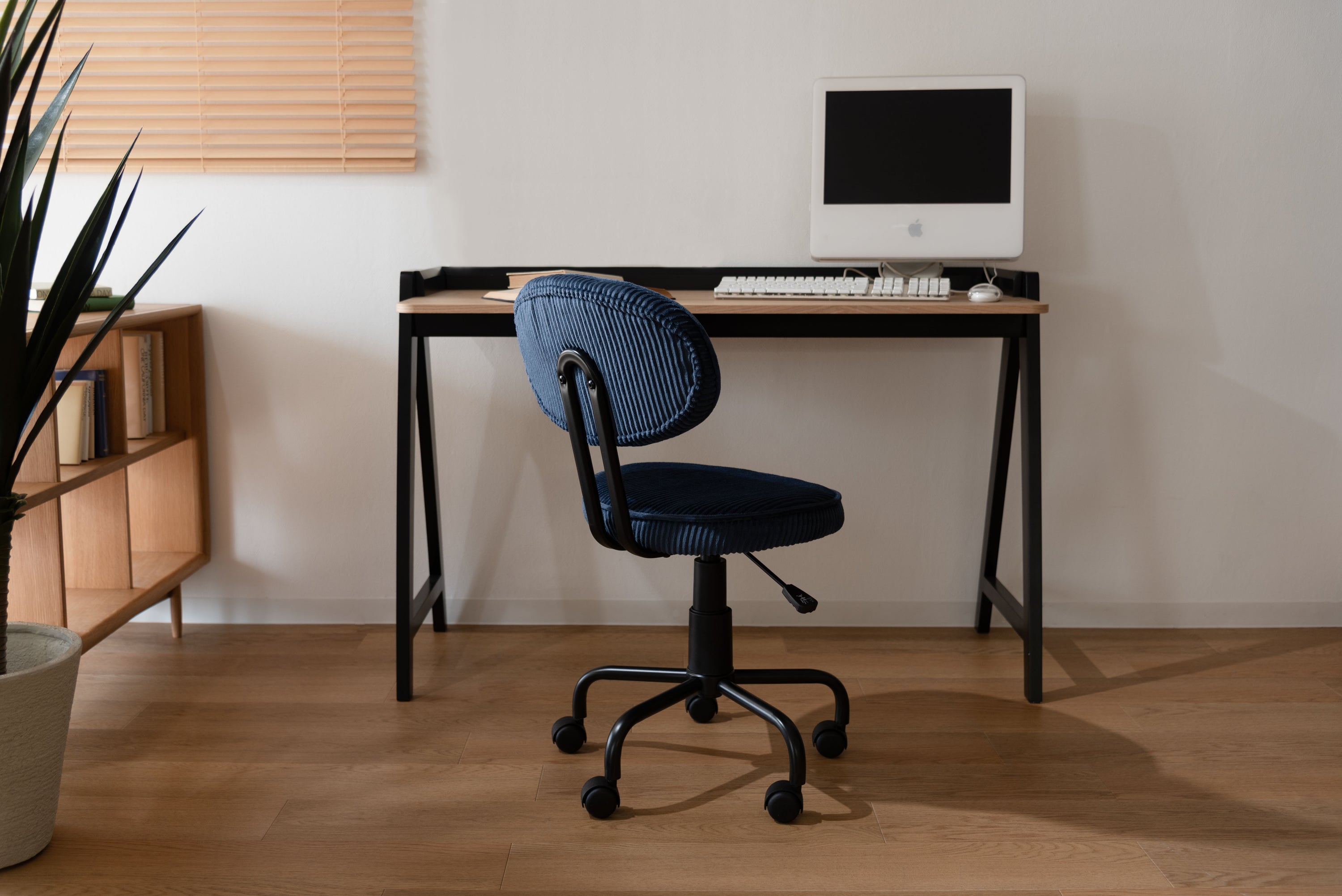 コンパクトサイズでデザイン性の高いおしゃれなデスクチェア。スリムサイズなのでリビングやベッドサイドなど狭い空間での使用に便利。スリムサイズのデスクにもピッタリフィットする使い勝手のよいデスクチェア。ガス圧シリンダーの昇降式なので、座面下のレバーで高さ調整可能。座面回転式でキャスター付き。背もたれと座面にはウレタンクッション入り。おしゃれでデザイン性のあるコーデュロイ生地を使用。リビング等で使用する際も周りのインテリアと好相性。シェアオフィスやデザイナーズオフィス等での使用もおススメ。