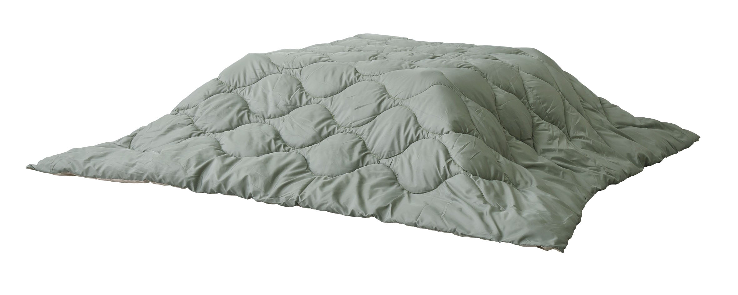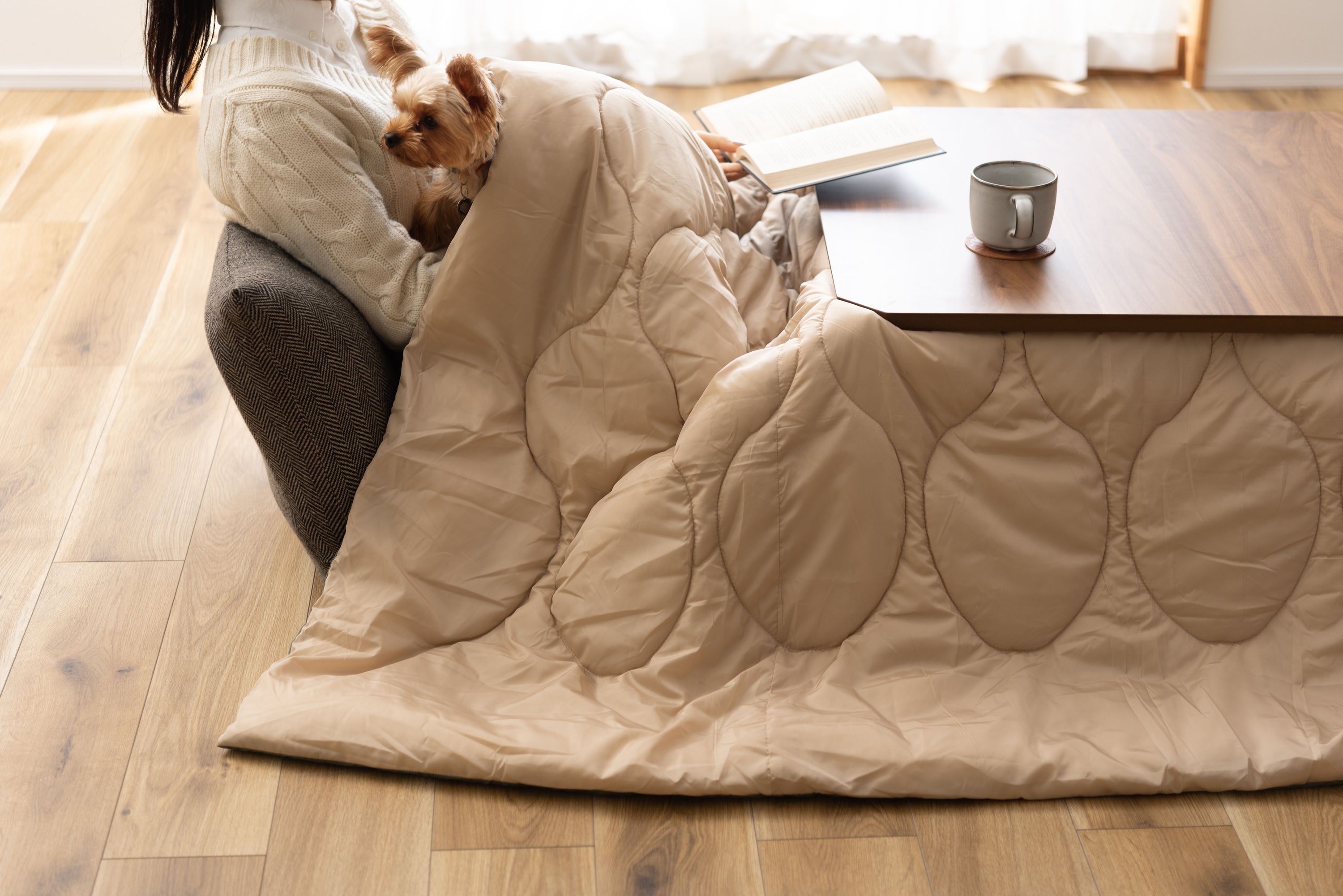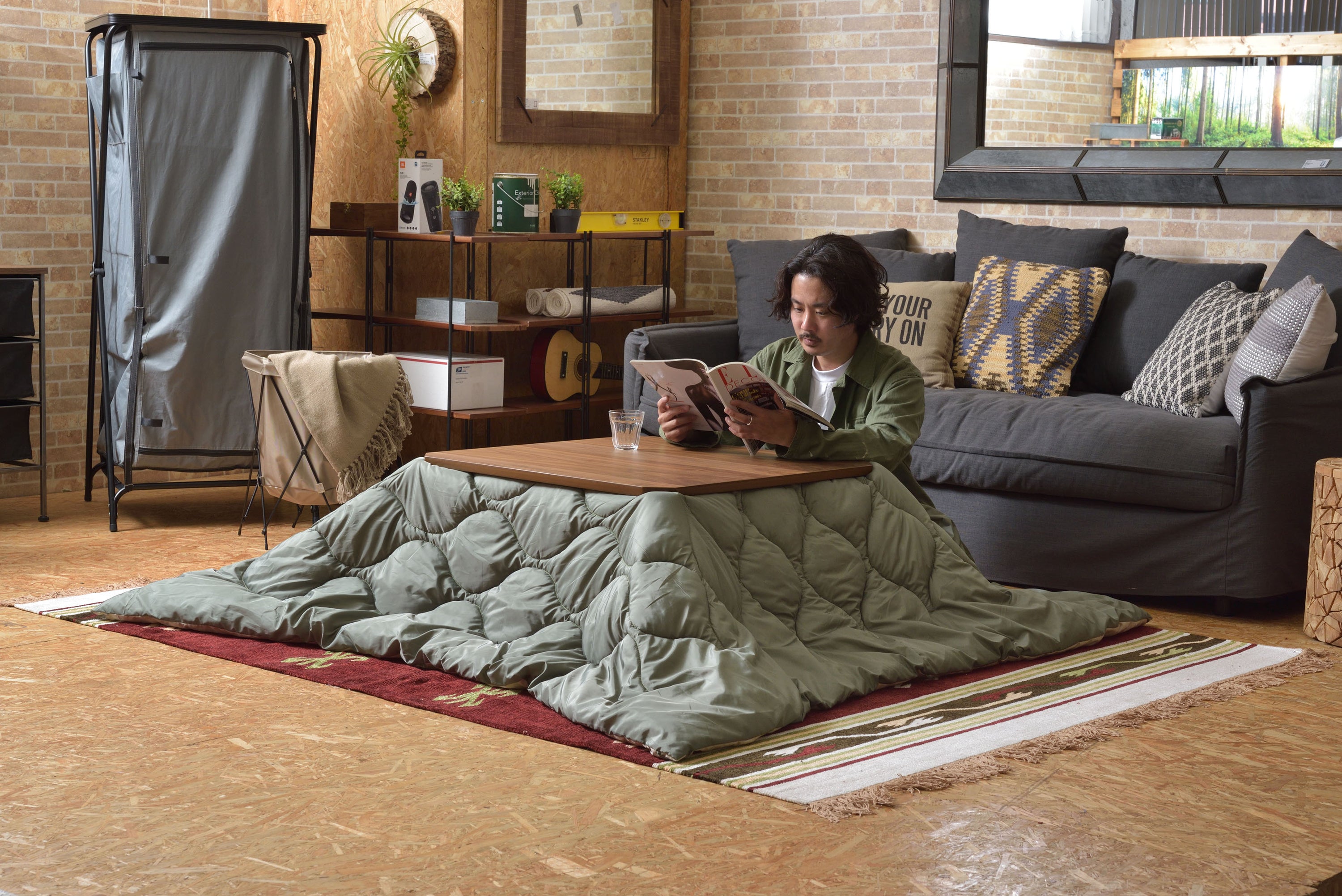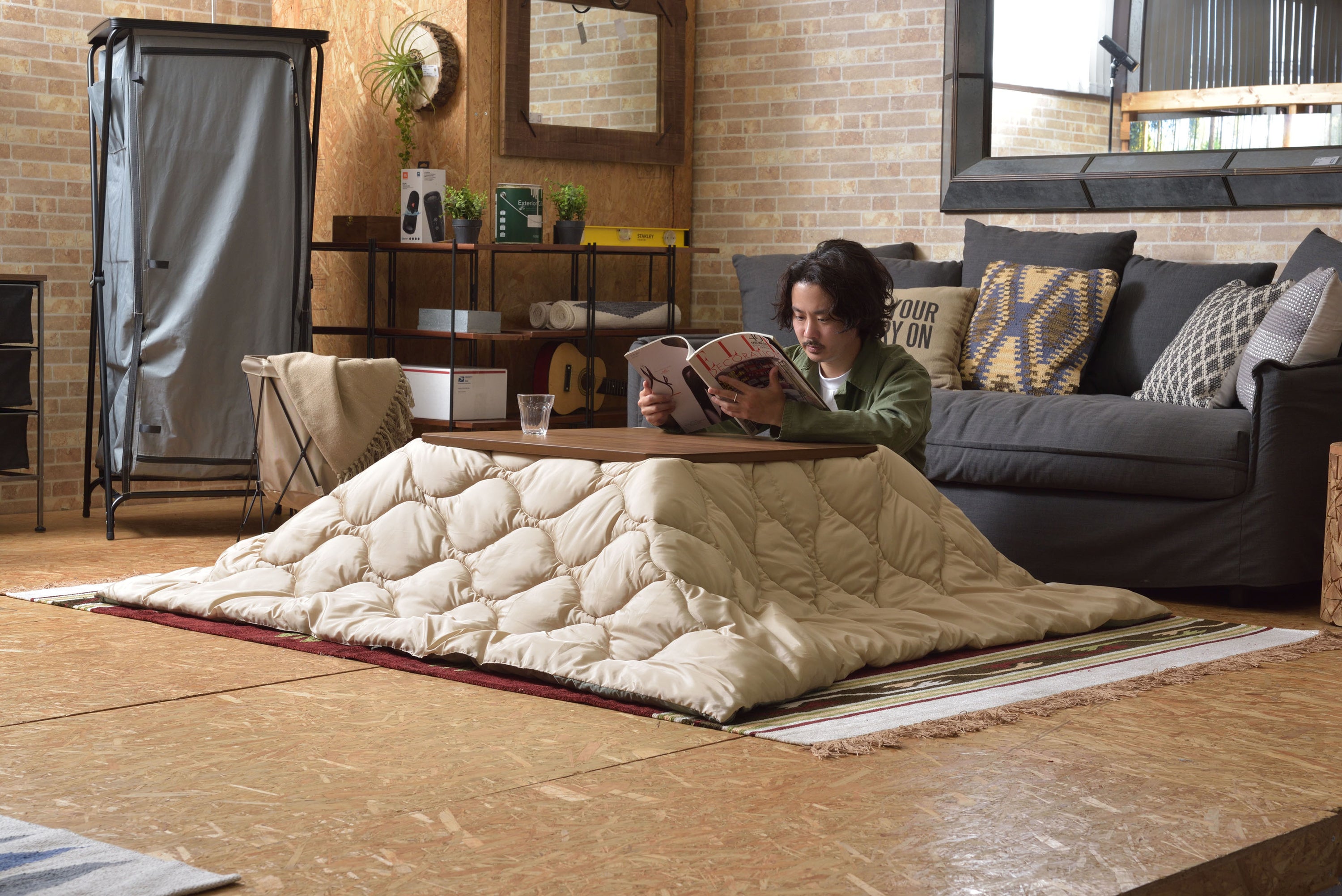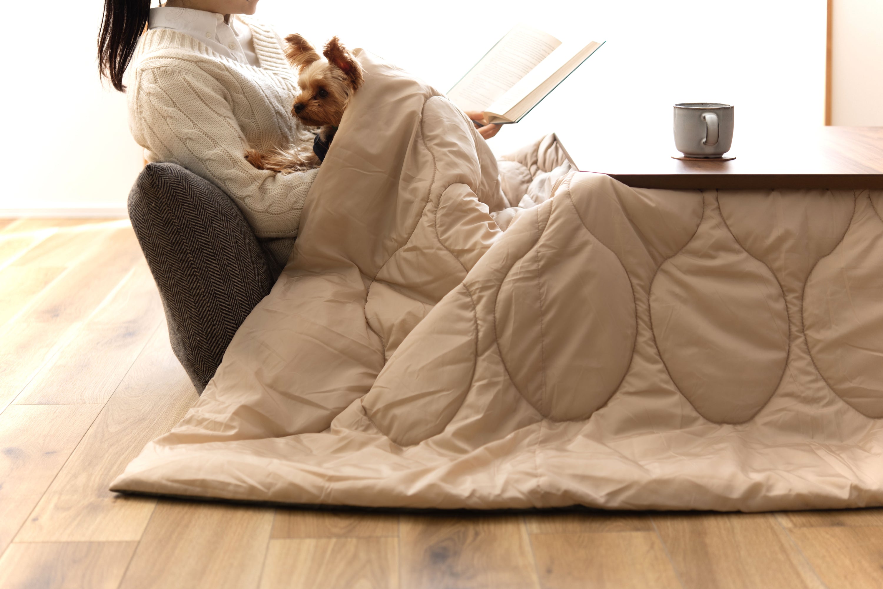 撥水加工を施したコタツ布団は、飲み物をこぼした時など汚れを弾くのでお手入れカンタン。 持ち運びに便利な寝袋のような収納バック付で、キャンプなどのアウトドアでも活躍します。