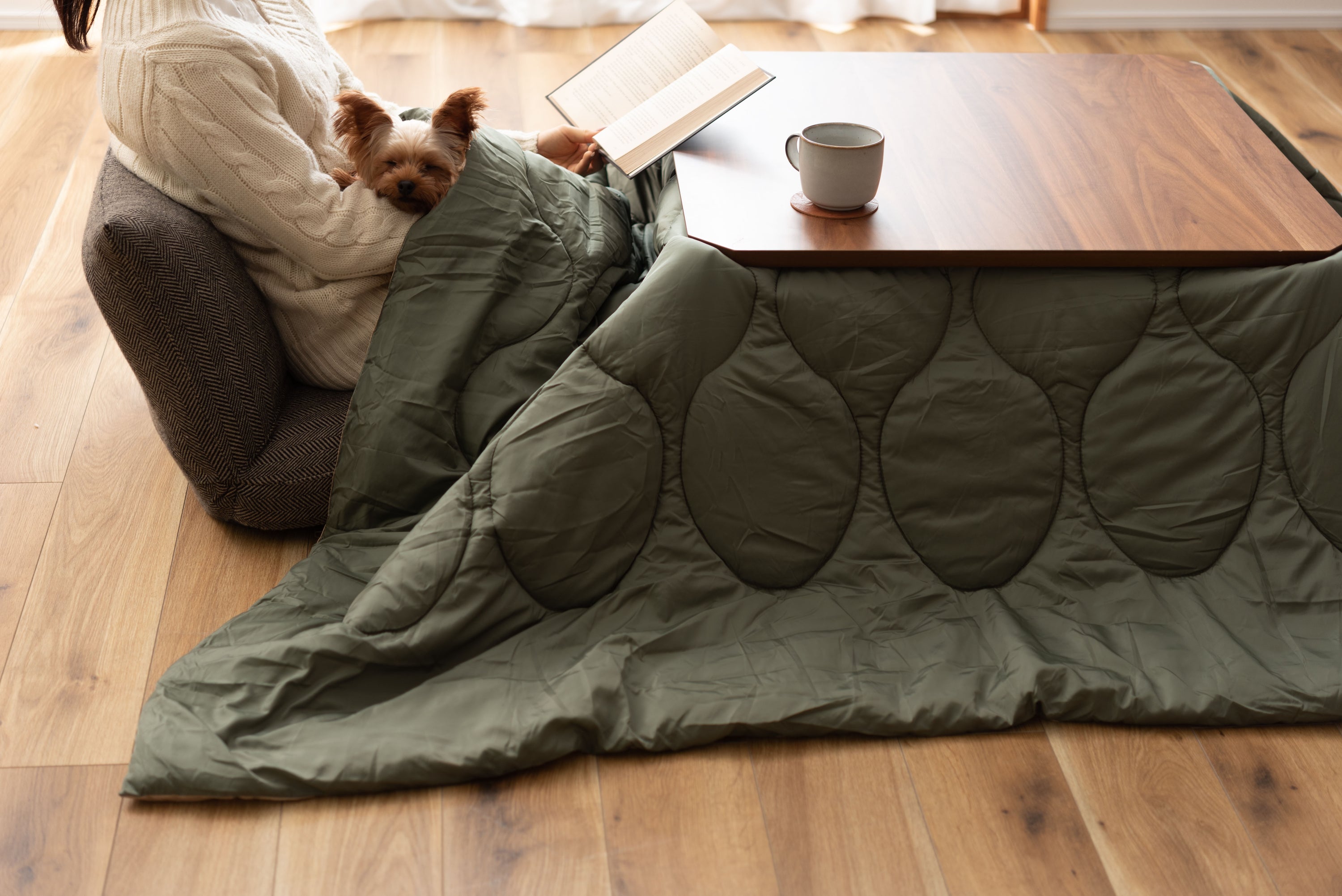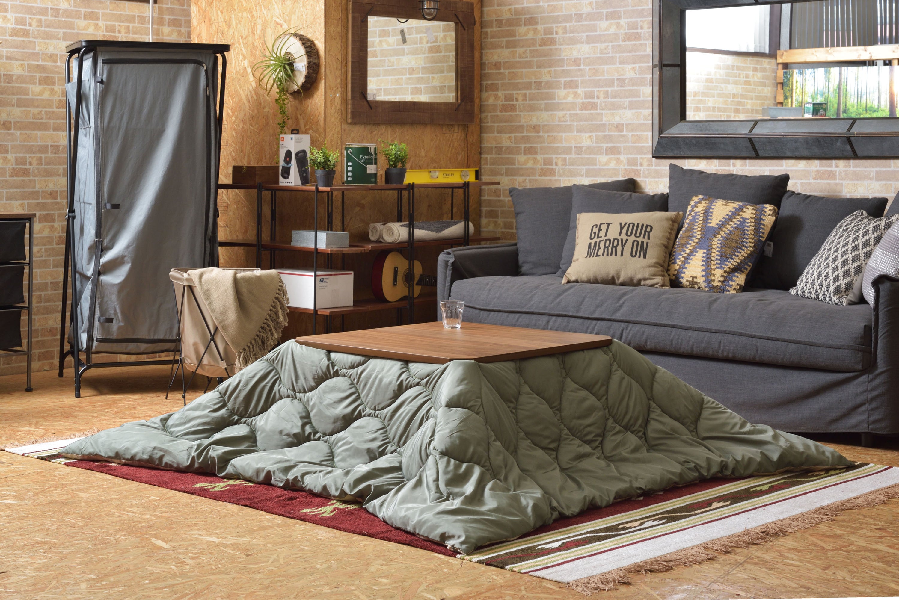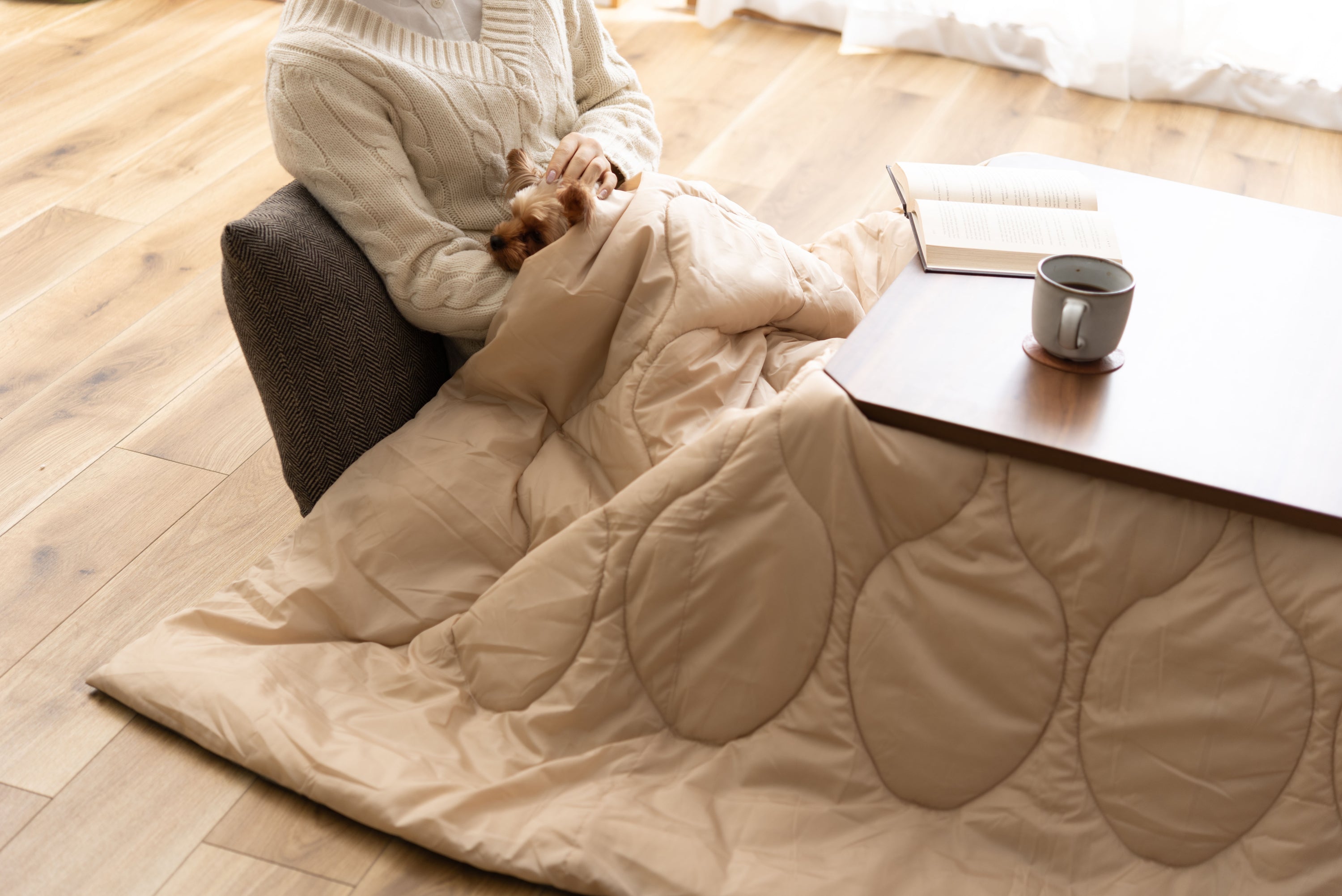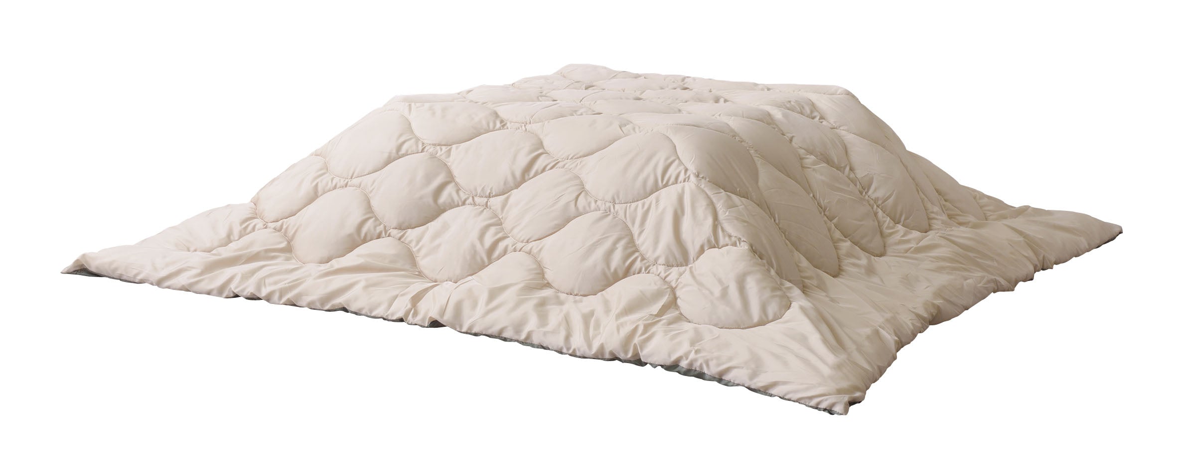 撥水加工を施したコタツ布団は、飲み物をこぼした時など汚れを弾くのでお手入れカンタン。 持ち運びに便利な寝袋のような収納バック付で、キャンプなどのアウトドアでも活躍します。
