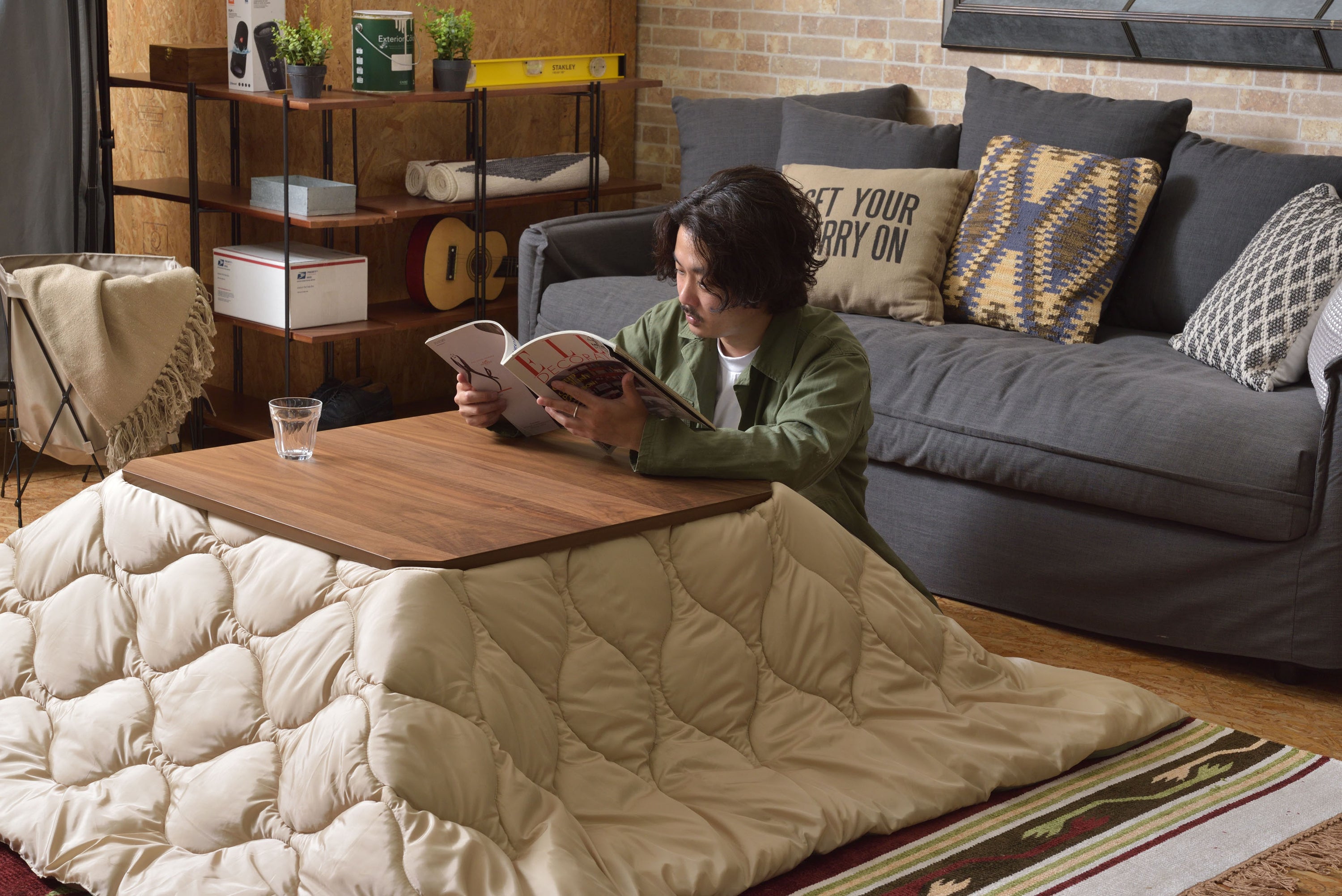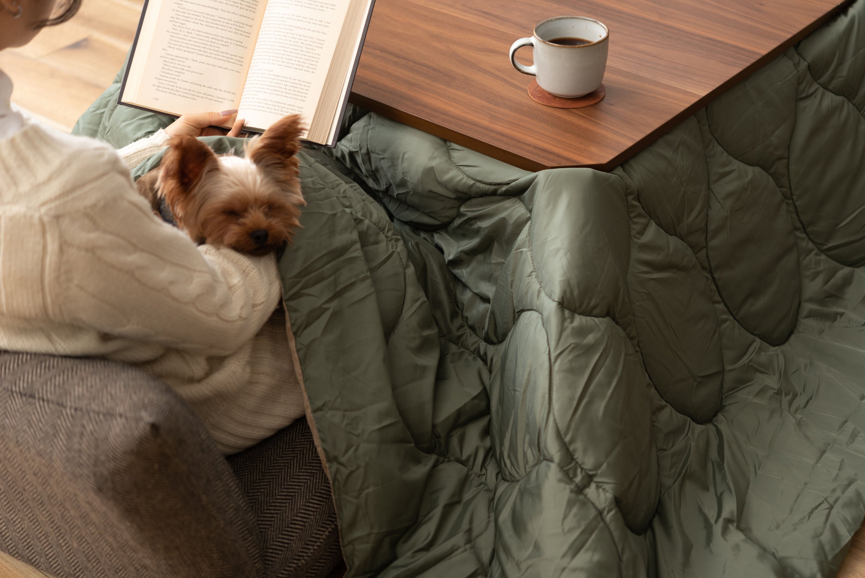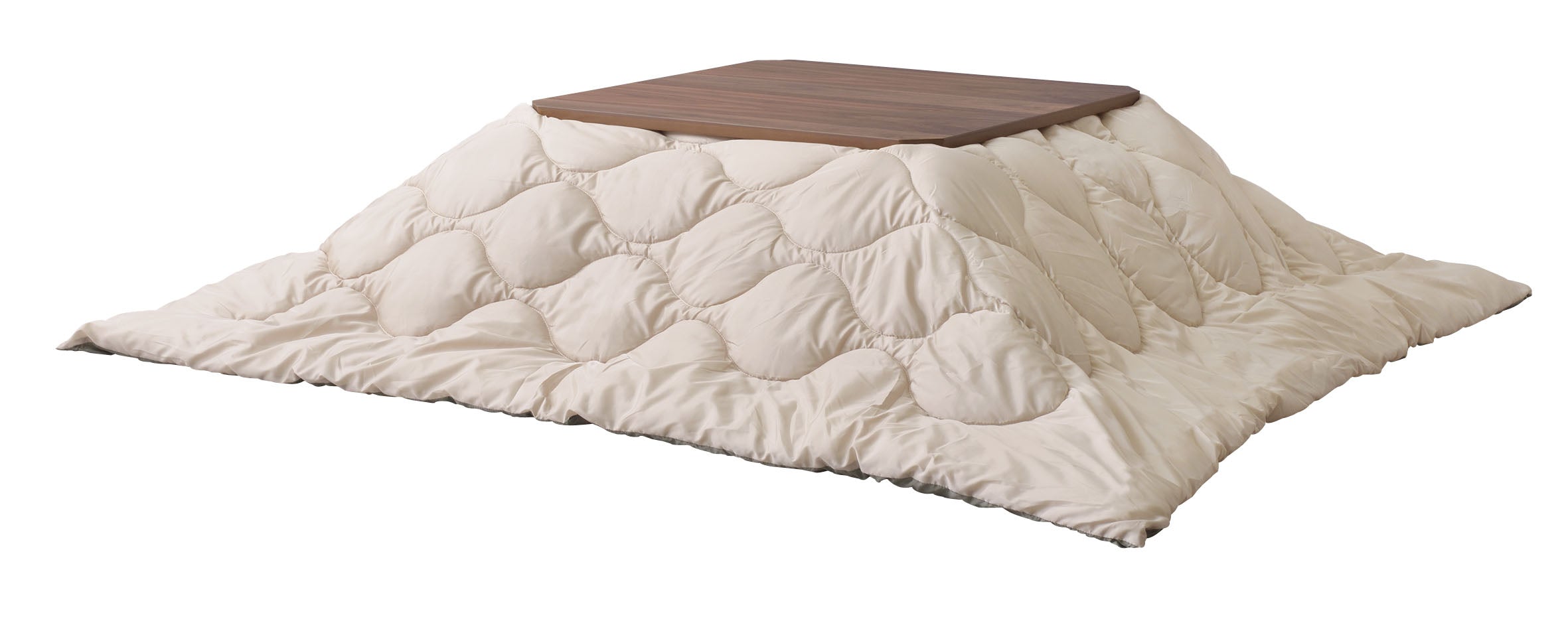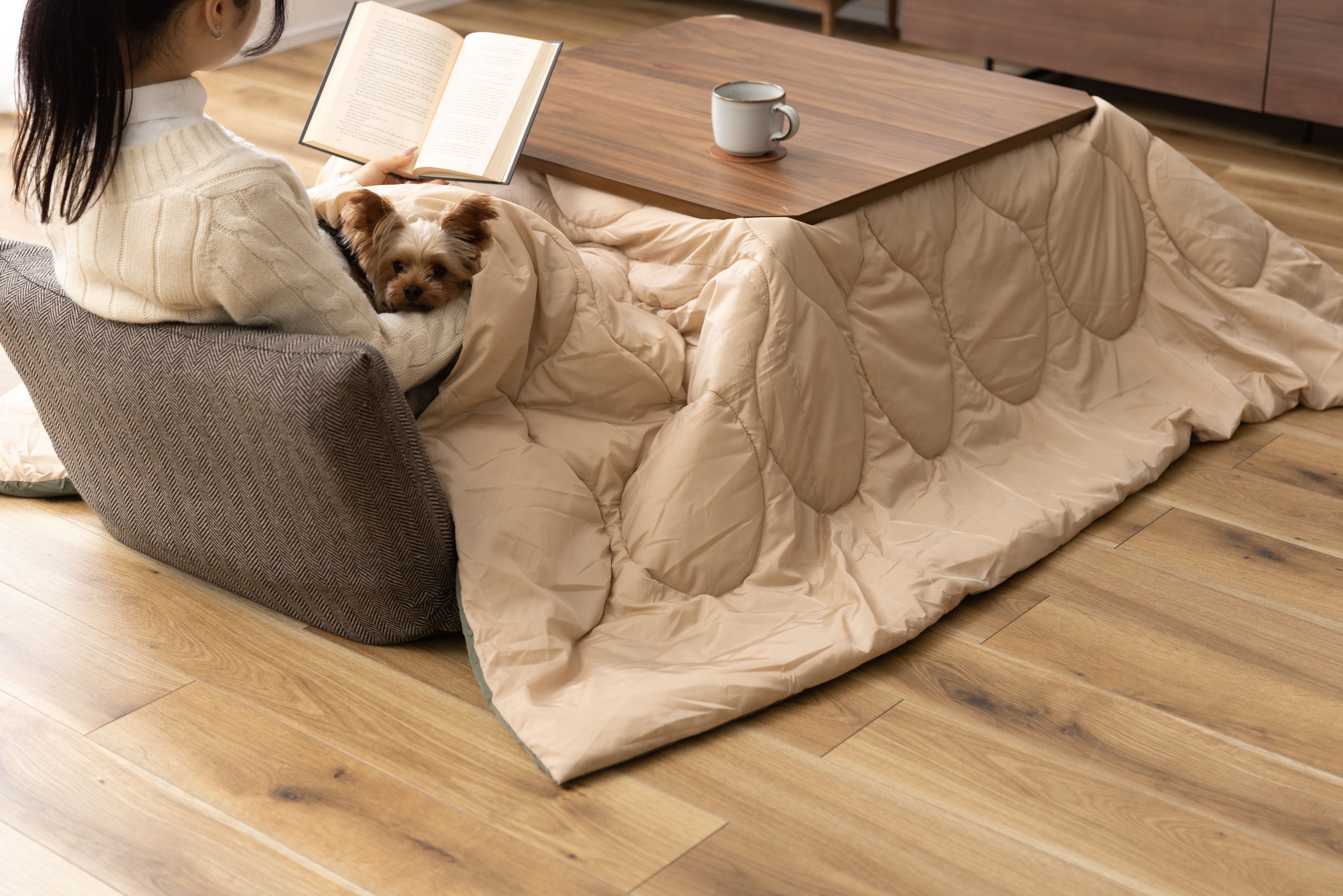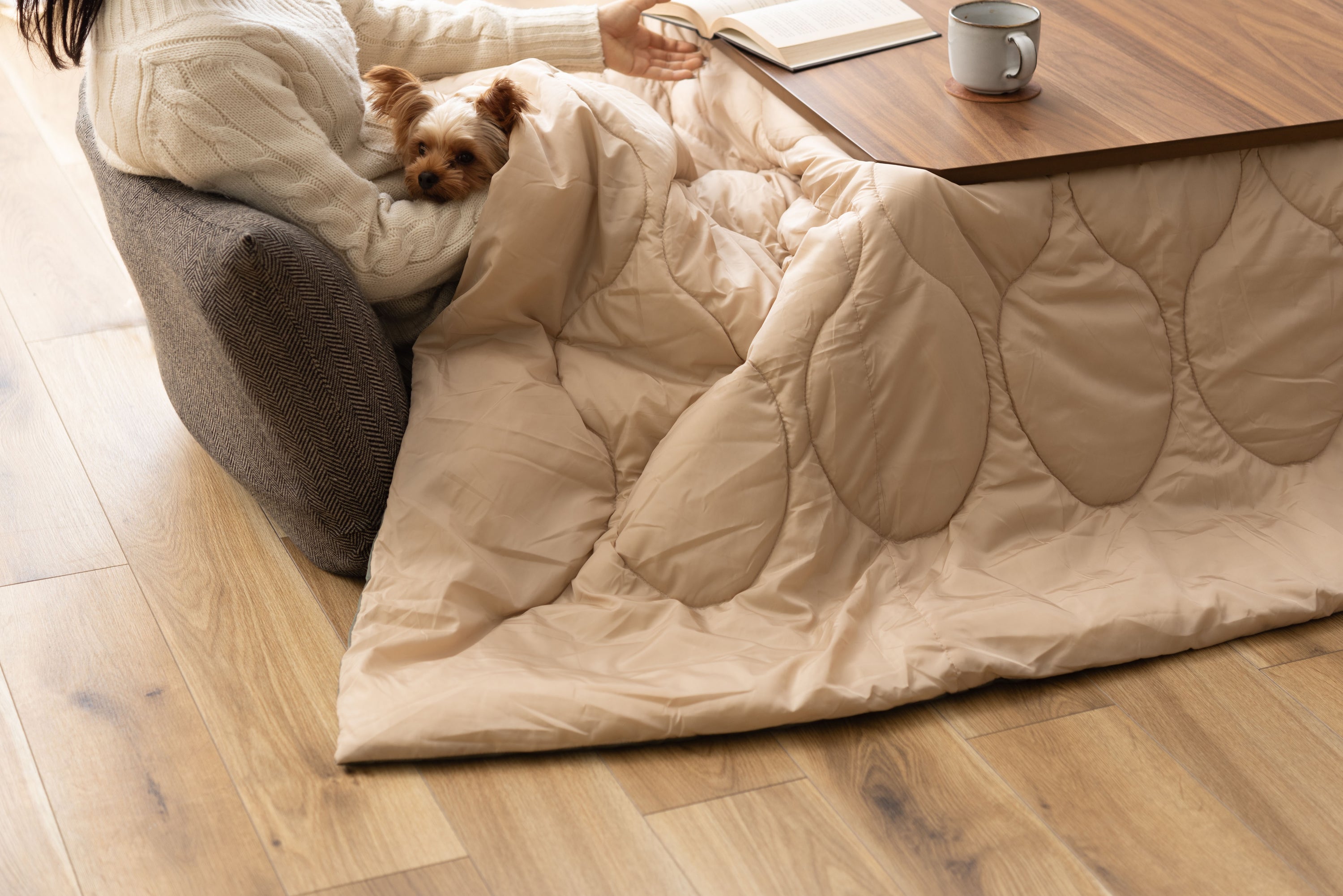撥水加工を施したコタツ布団は、飲み物をこぼした時など汚れを弾くのでお手入れカンタン。 持ち運びに便利な寝袋のような収納バック付で、キャンプなどのアウトドアでも活躍します。