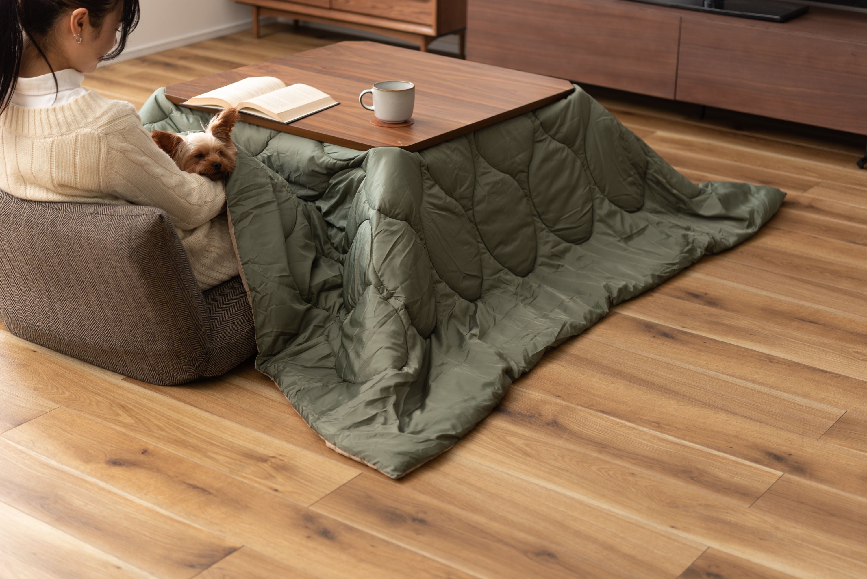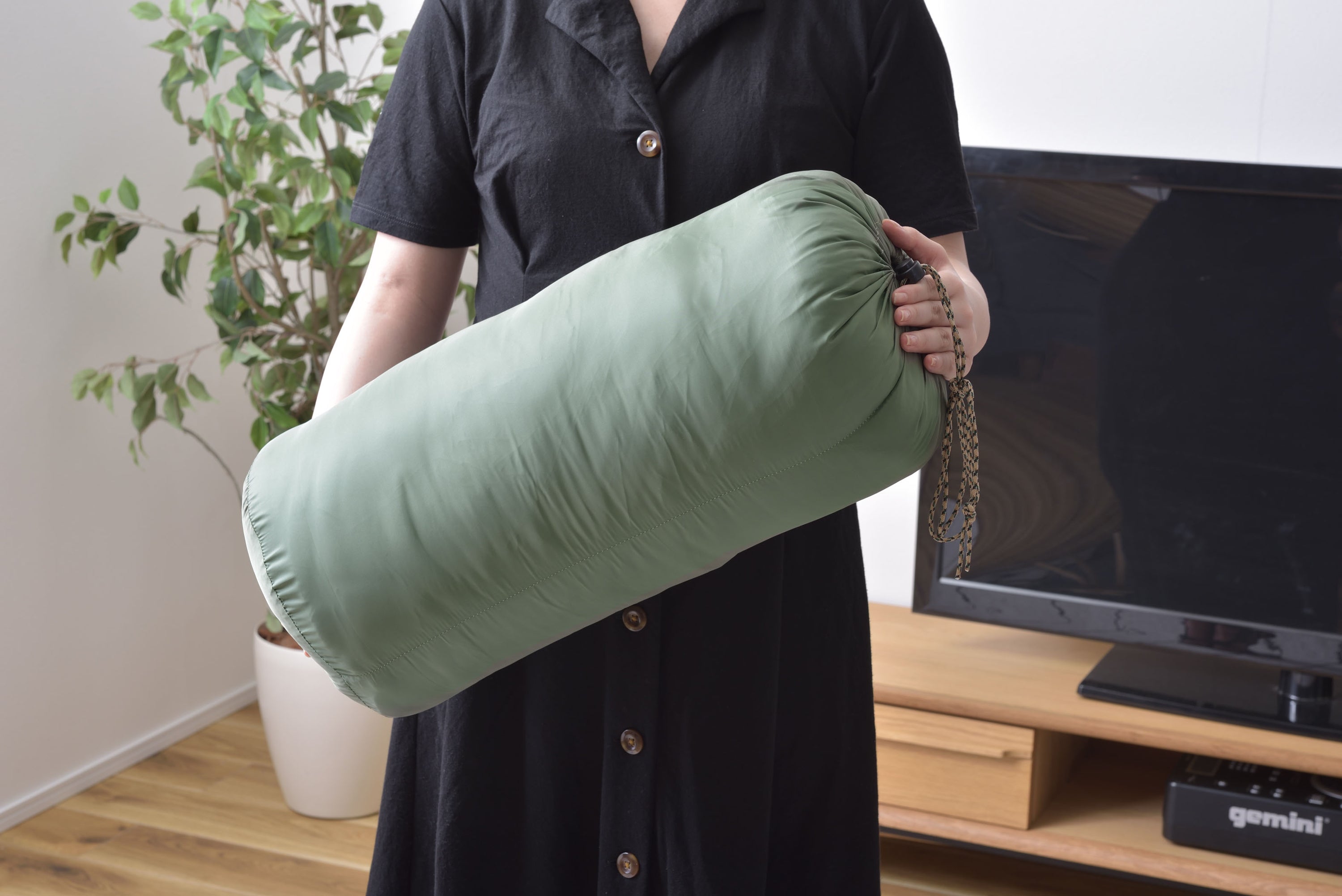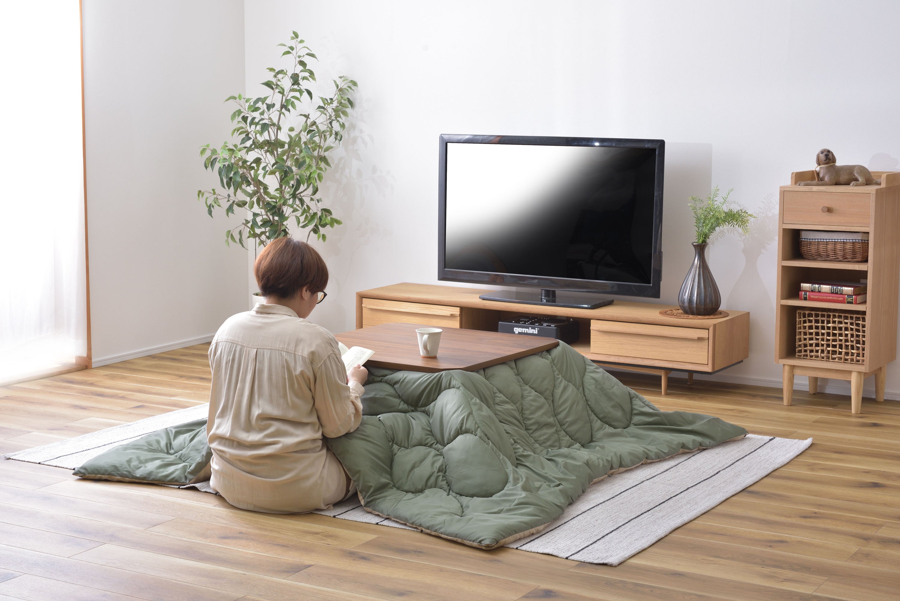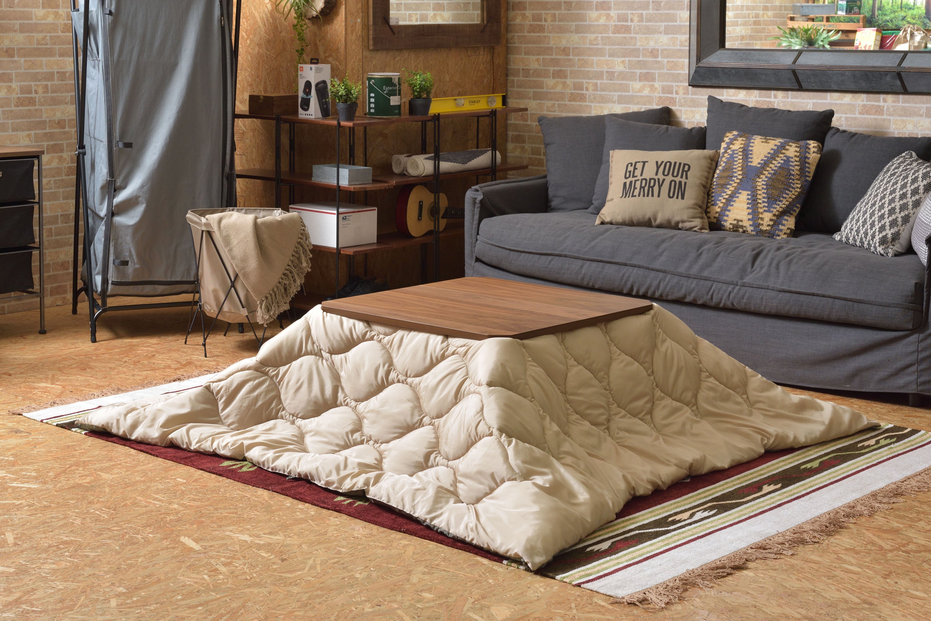 撥水加工を施したコタツ布団は、飲み物をこぼした時など汚れを弾くのでお手入れカンタン。 持ち運びに便利な寝袋のような収納バック付で、キャンプなどのアウトドアでも活躍します。