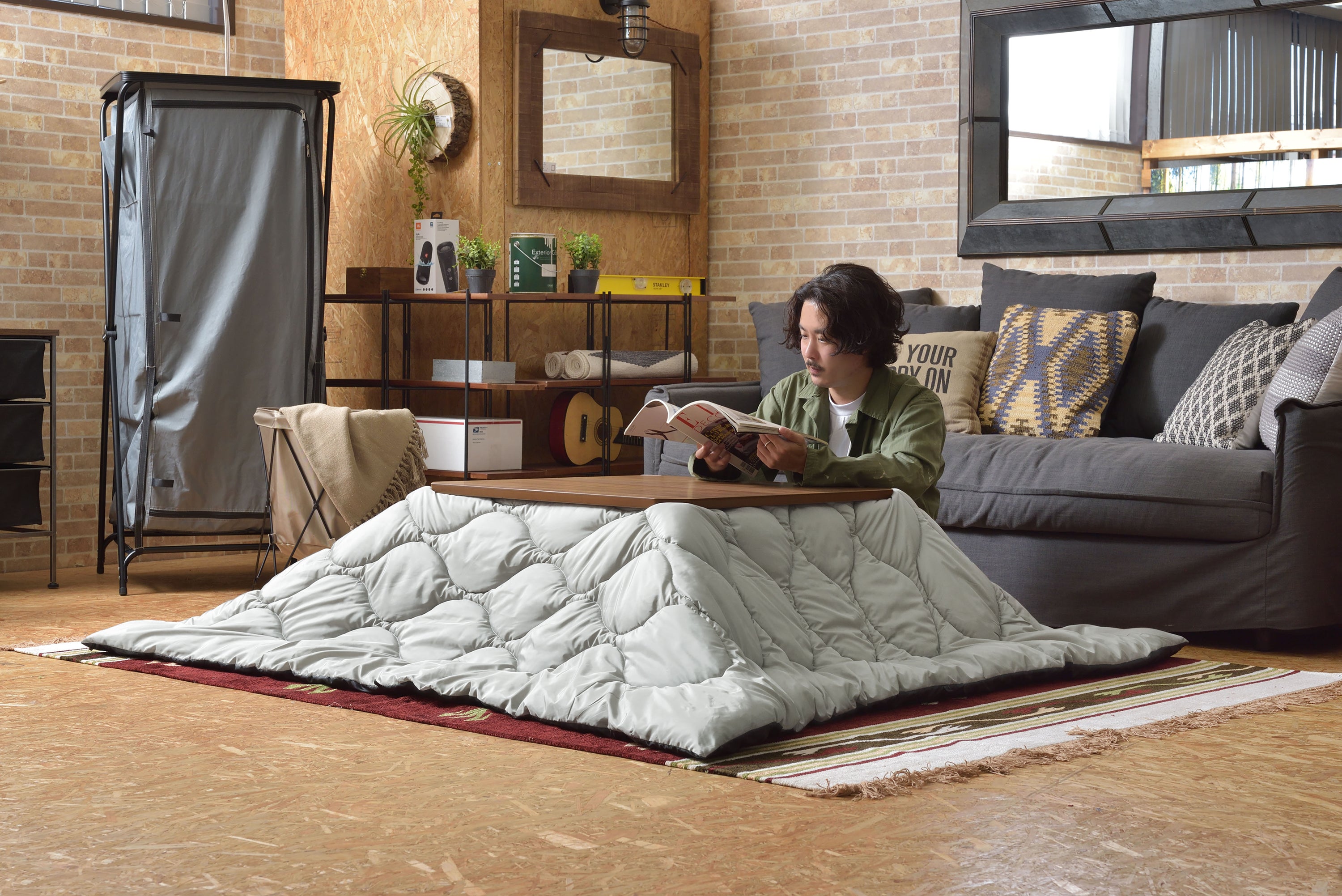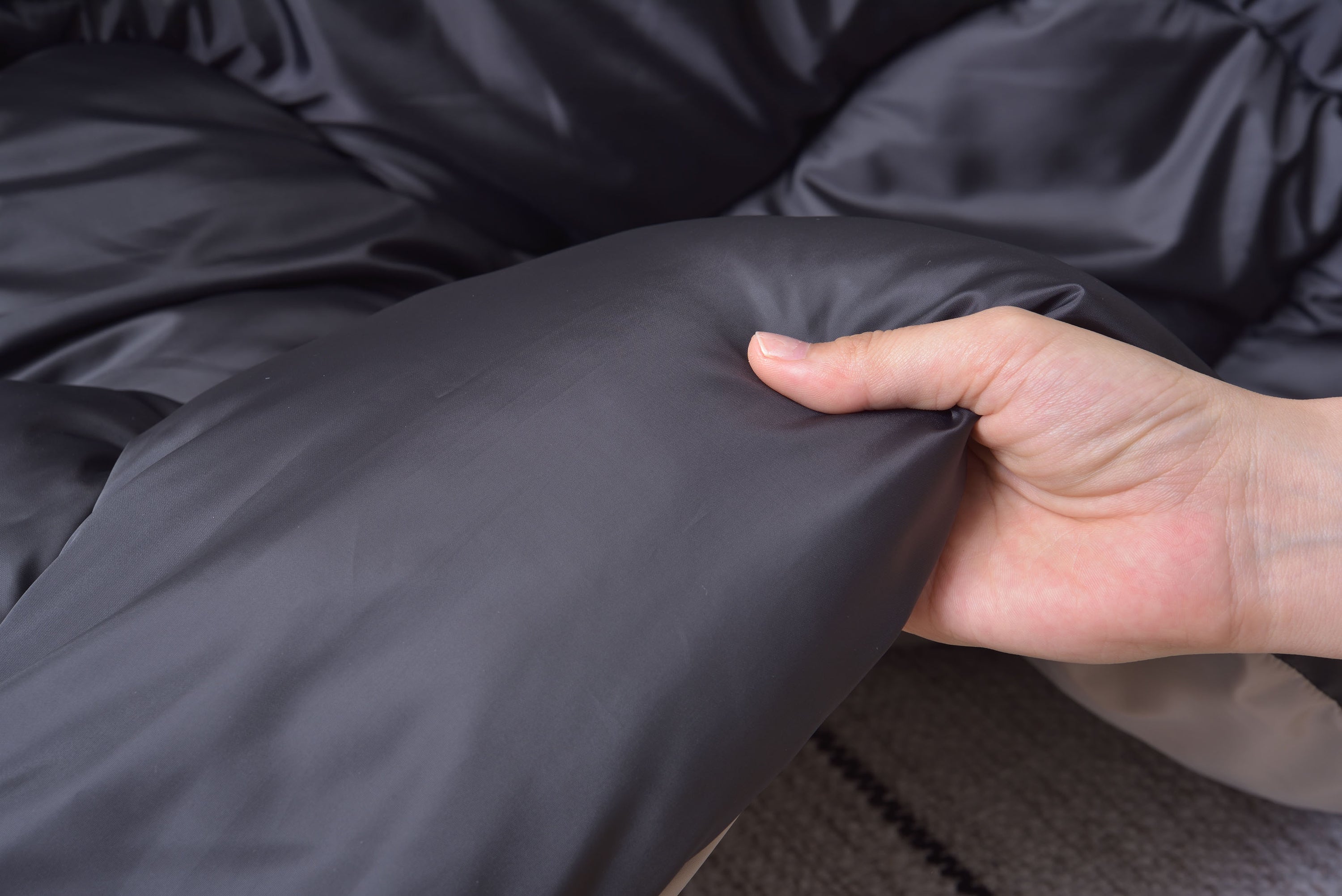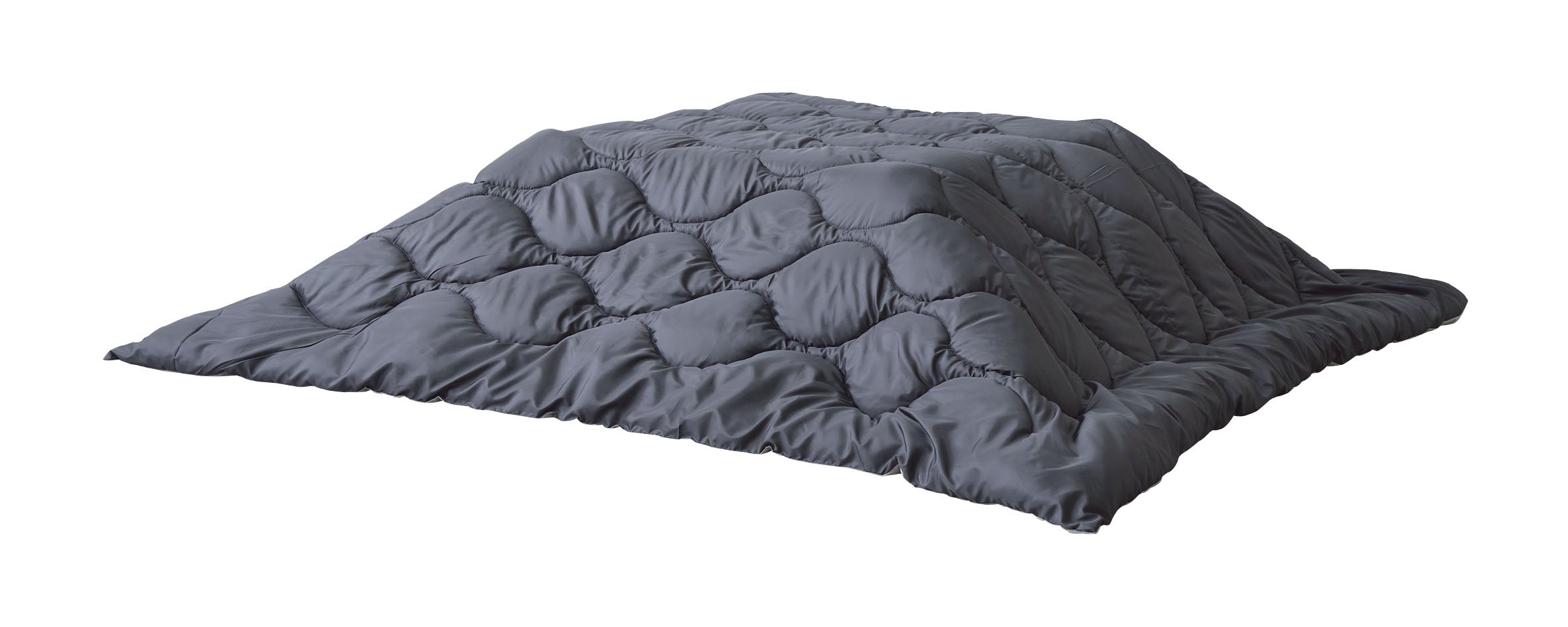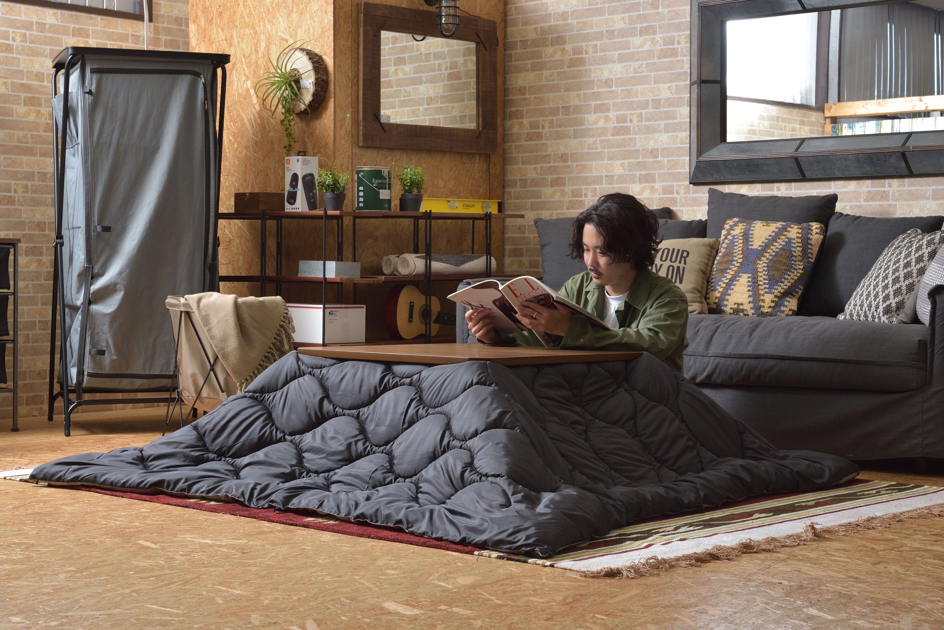 撥水加工を施したコタツ布団は、飲み物をこぼした時など汚れを弾くのでお手入れカンタン。 持ち運びに便利な寝袋のような収納バック付で、キャンプなどのアウトドアでも活躍します。