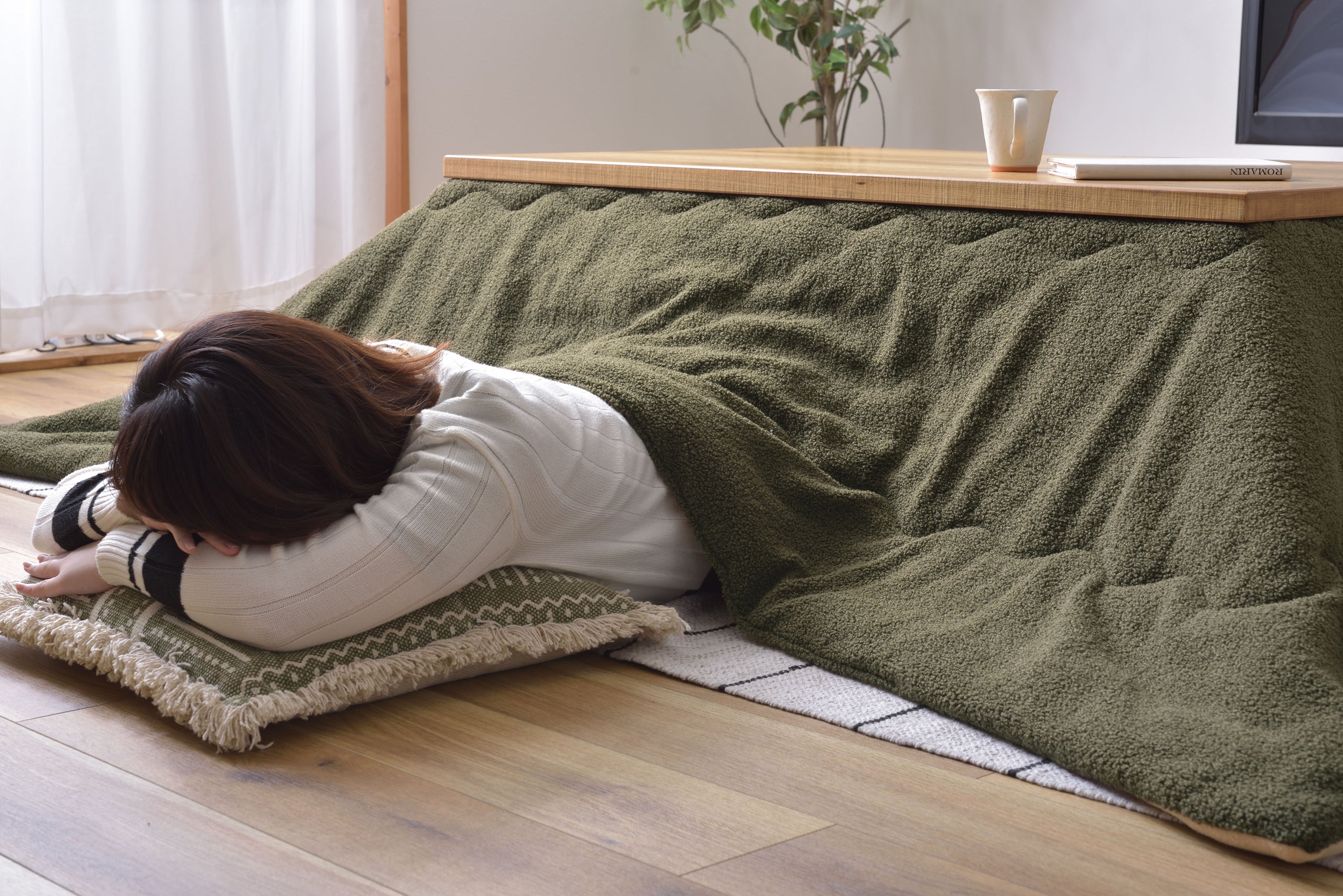 肌触りが良い触感にこだわったコタツ布団です。 まるで羊のようなふんわりとした心地良いさらフワ触感が 極上のやすらぎを与えてくれます。 色はベーシックで何でも合わせやすい温かみのあるCBR(チャコールブラウン)と、 深い森をイメージさせ、“沈静色”の性質を持っているKH(カーキ)の2色展開となります。 生地感、色ともにリラックスできる仕様で仕上げました。