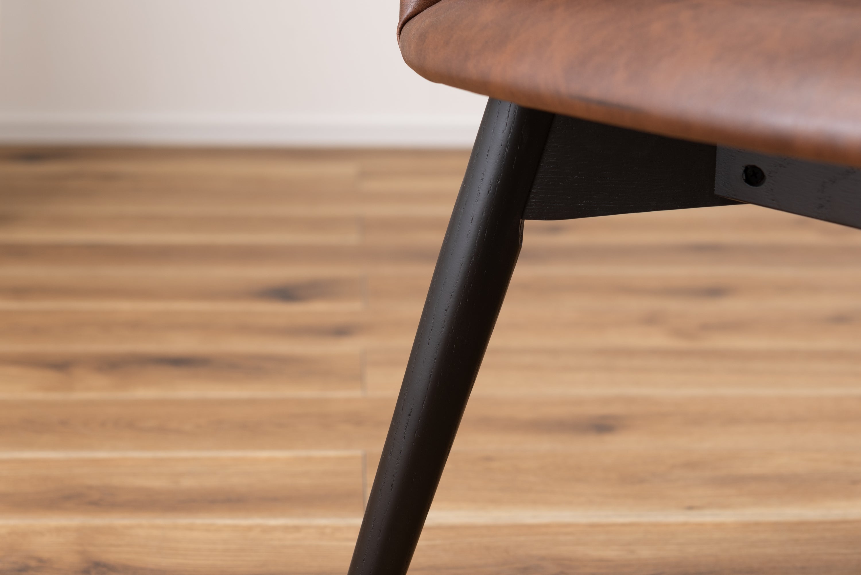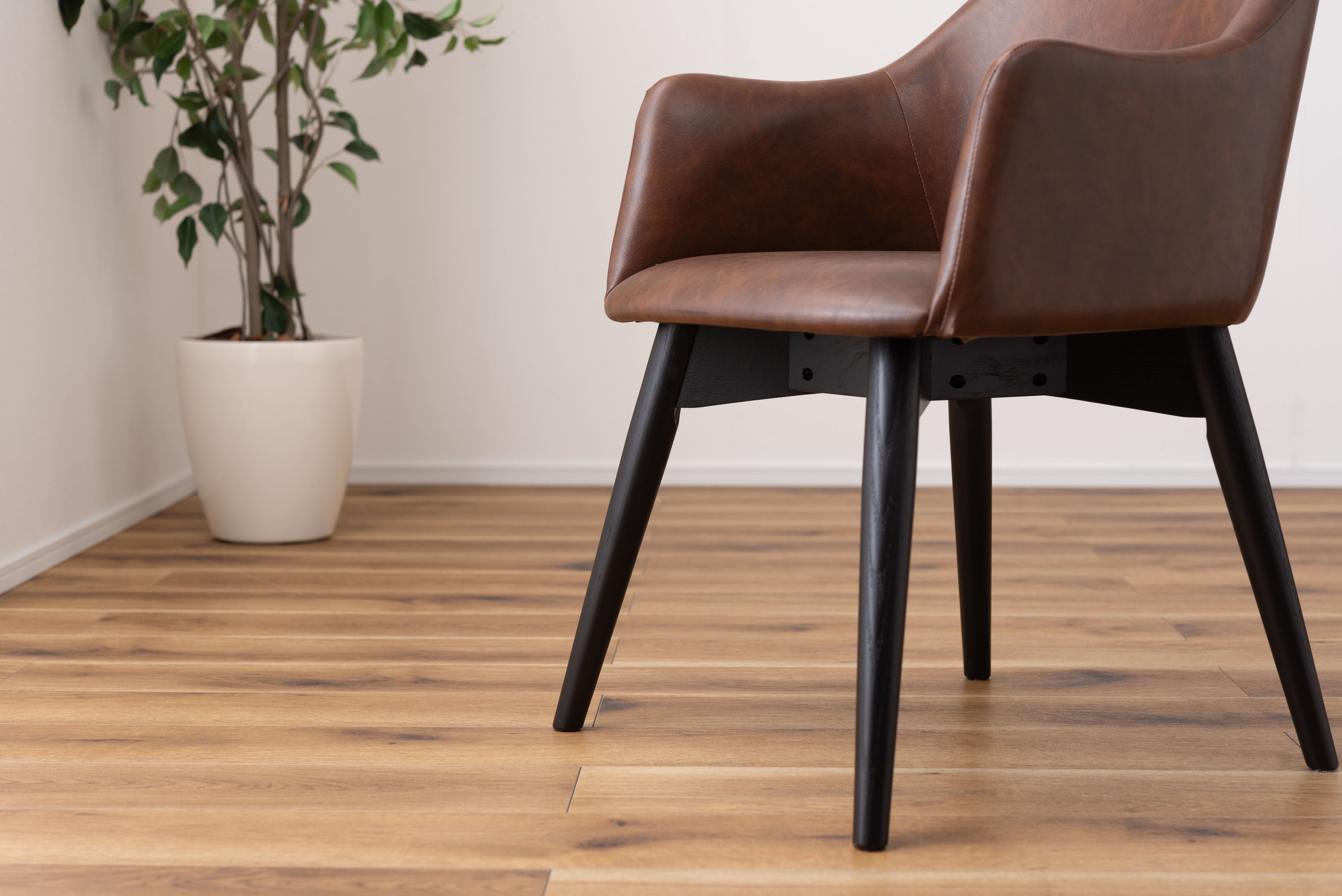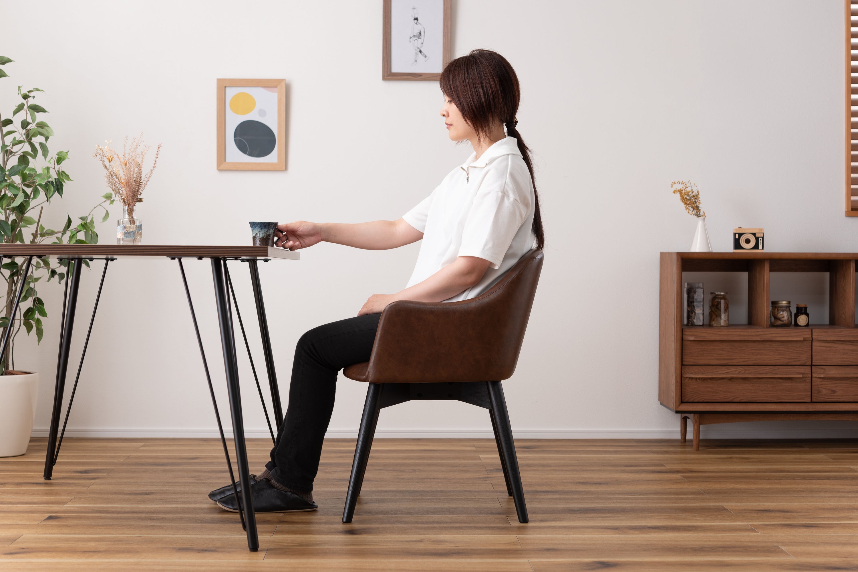 カラメリシリーズのダイニングチェアに黒脚タイプが登場。 木目の優しさはそのままに、シックなカラーが空間を引き締めてくれます。 レザー(合皮)とファブリックの2種類の座面とも相性は抜群。 背もたれとアームが一体となった、包み込むように身体を支えてくれるダイニングチェア。 全体的に丸みのある優しいフォルムが「心地よい曲線」=カラメリ(造語)の由来。 カラメリチェアはSHを43cmに設計してあるので、立ち座りしやすく長時間座っていても疲れにくい仕様。 脚部は角を落とし、ハの字に設計することで、北欧ナチュラルデザインを表現した優しい印象に仕上げました。