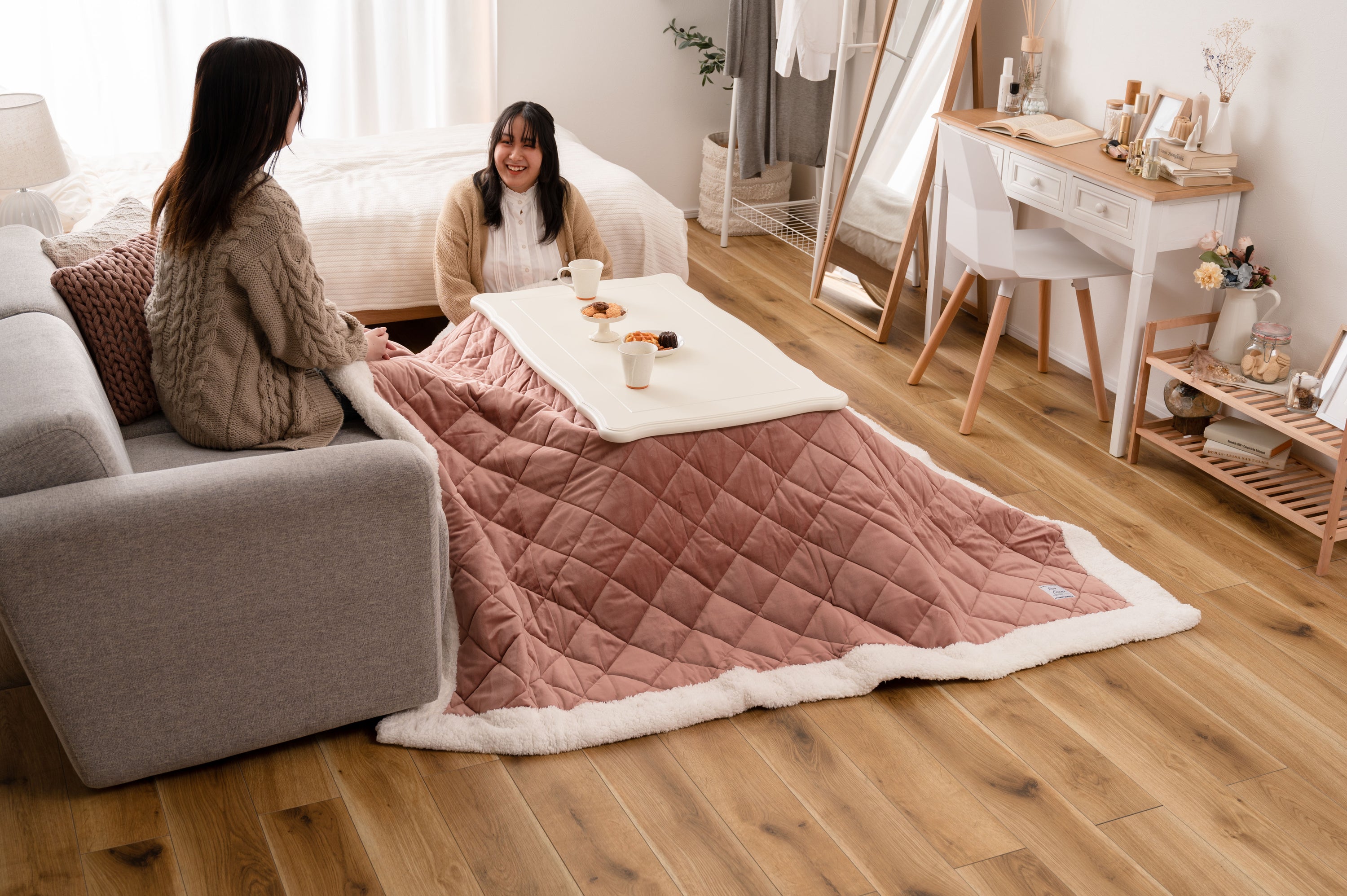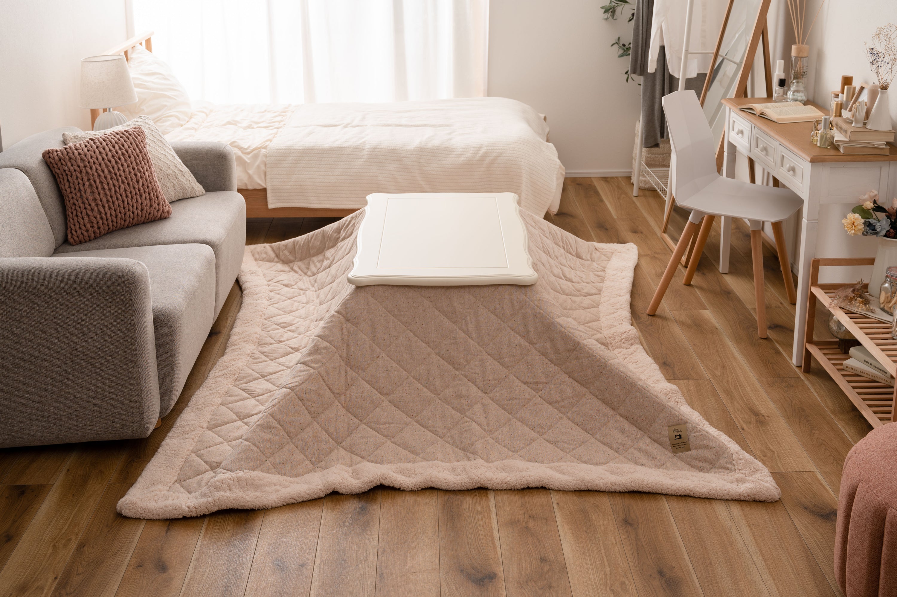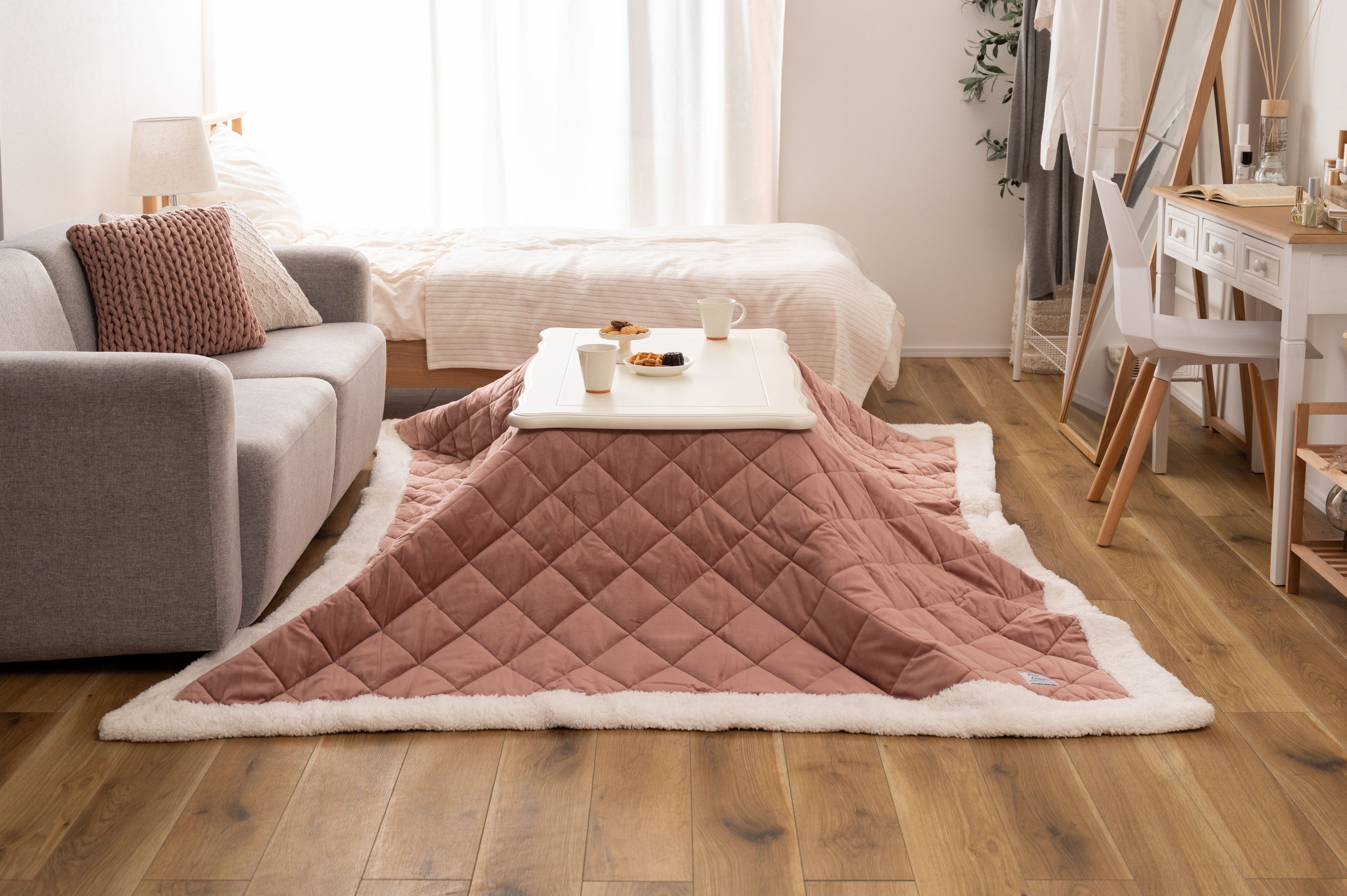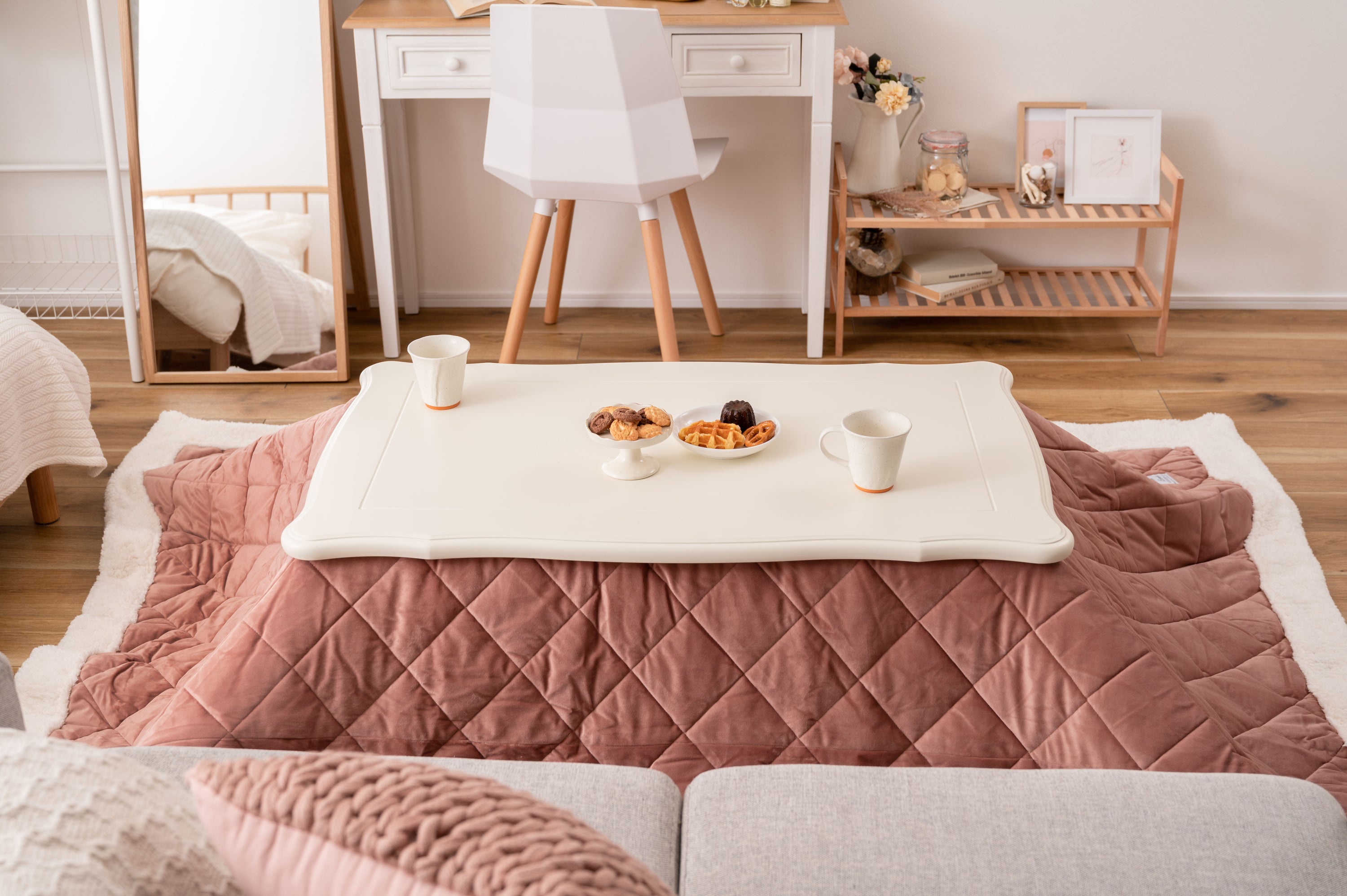 天板の装飾や猫脚のクラシカルなデザインはシーズンを選ばずお使い頂けます。ホワイトカラーと天板のデザインは、布団を掛けても元々のイメージはそのままに、クラシカルでガーリーな雰囲気を演出してくれます。天板や脚の細部にもこだわった猫脚コタツ。テーブルそのものとしてのデザイン性が高く、オフシーズンもインテリアに馴染みます。リビングテーブルに近いサイズなので圧迫感なく使えます。間取りにとらわれないコンパクト設計なので、TVボードを置いた空間でも窮屈さを感じさせず使えます。ヒーターは天板下の幕板にスッキリと納まる設計となっているので、コタツ感のないオールシーズン使えるテーブル。正方形:4面使えるちょうど良いサイズ。コンパクトでも対面使用が出来る正方形の定番サイズ。長方形:奥行をコンパクトにしたサイズ。オフシーズンでも使えるようリビングテーブルに近いサイズ。