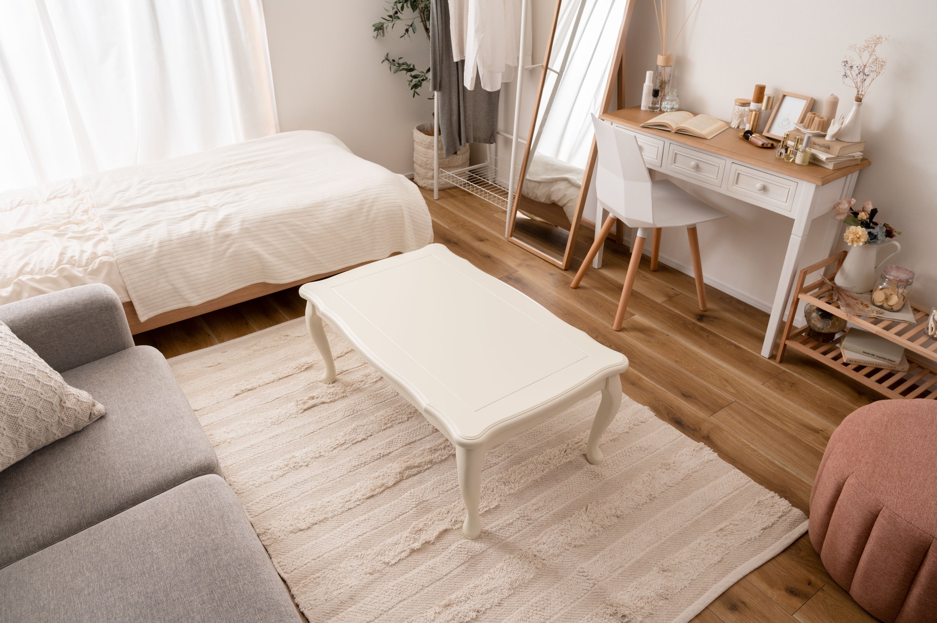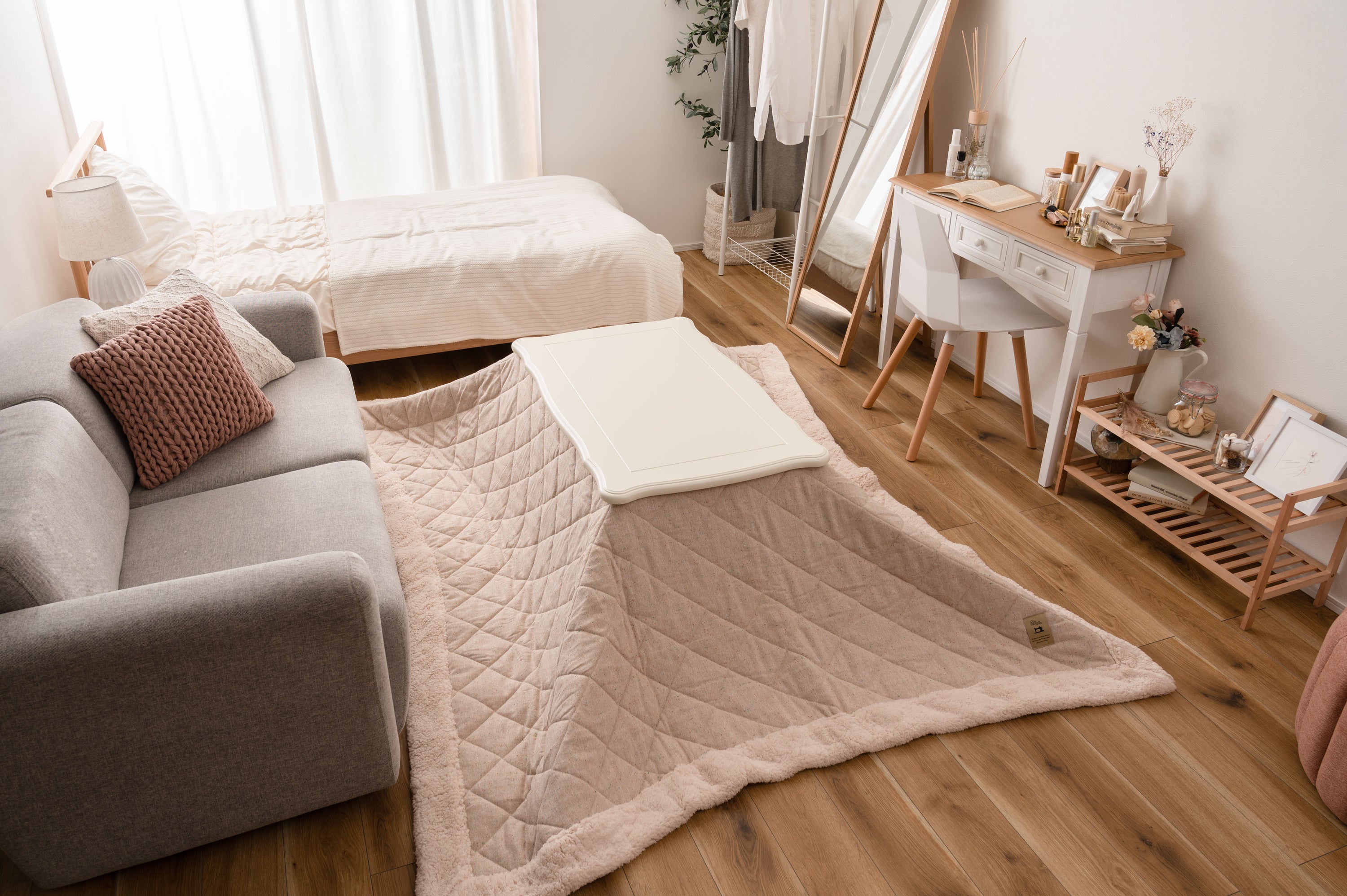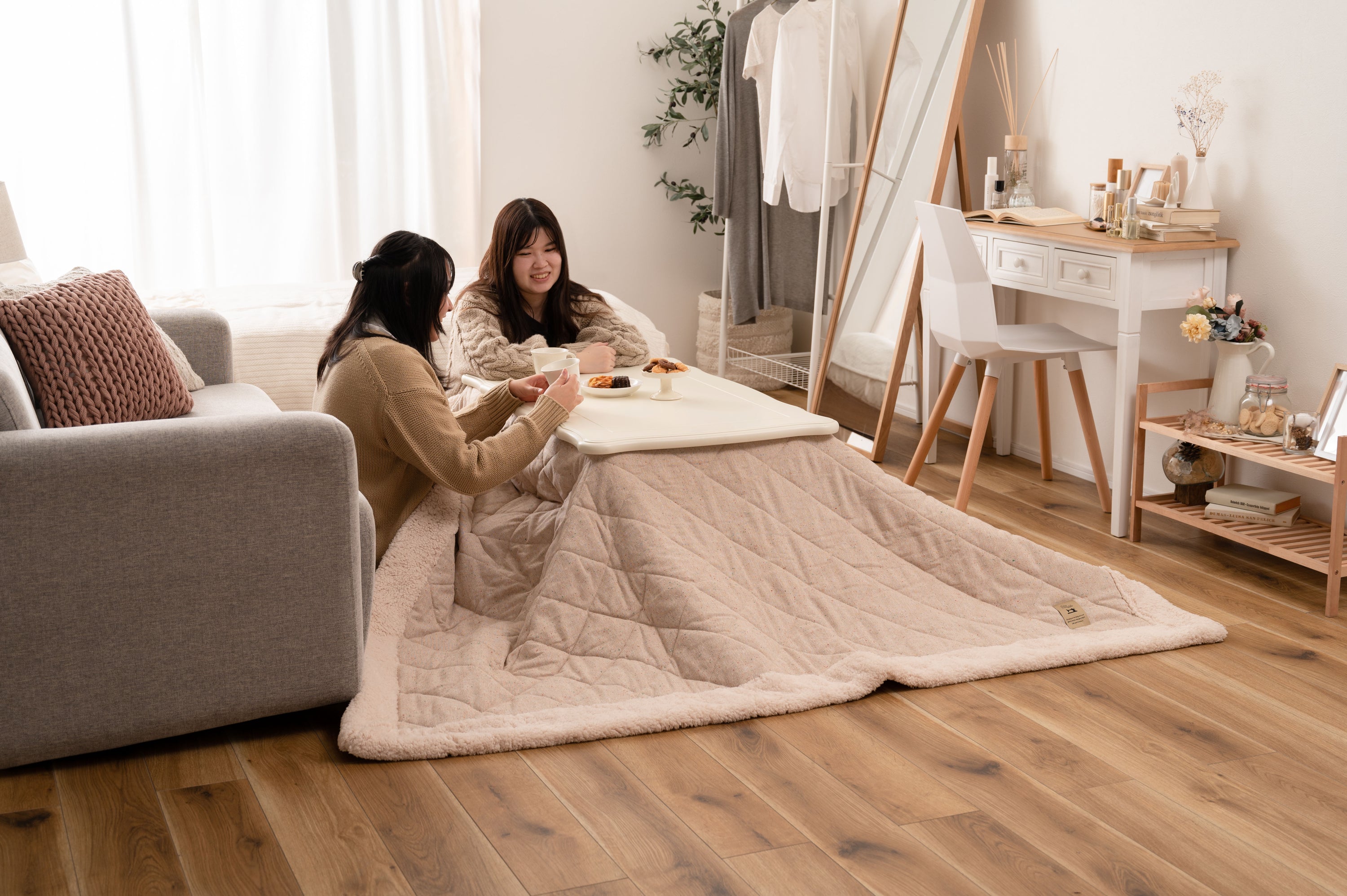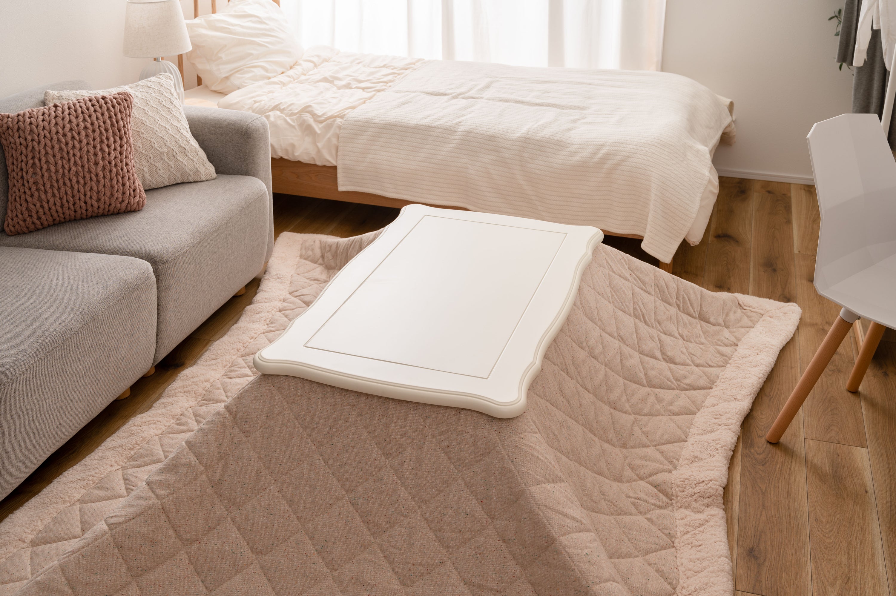 天板の装飾や猫脚のクラシカルなデザインはシーズンを選ばずお使い頂けます。ホワイトカラーと天板のデザインは、布団を掛けても元々のイメージはそのままに、クラシカルでガーリーな雰囲気を演出してくれます。天板や脚の細部にもこだわった猫脚コタツ。テーブルそのものとしてのデザイン性が高く、オフシーズンもインテリアに馴染みます。リビングテーブルに近いサイズなので圧迫感なく使えます。間取りにとらわれないコンパクト設計なので、TVボードを置いた空間でも窮屈さを感じさせず使えます。ヒーターは天板下の幕板にスッキリと納まる設計となっているので、コタツ感のないオールシーズン使えるテーブル。正方形:4面使えるちょうど良いサイズ。コンパクトでも対面使用が出来る正方形の定番サイズ。長方形:奥行をコンパクトにしたサイズ。オフシーズンでも使えるようリビングテーブルに近いサイズ。
