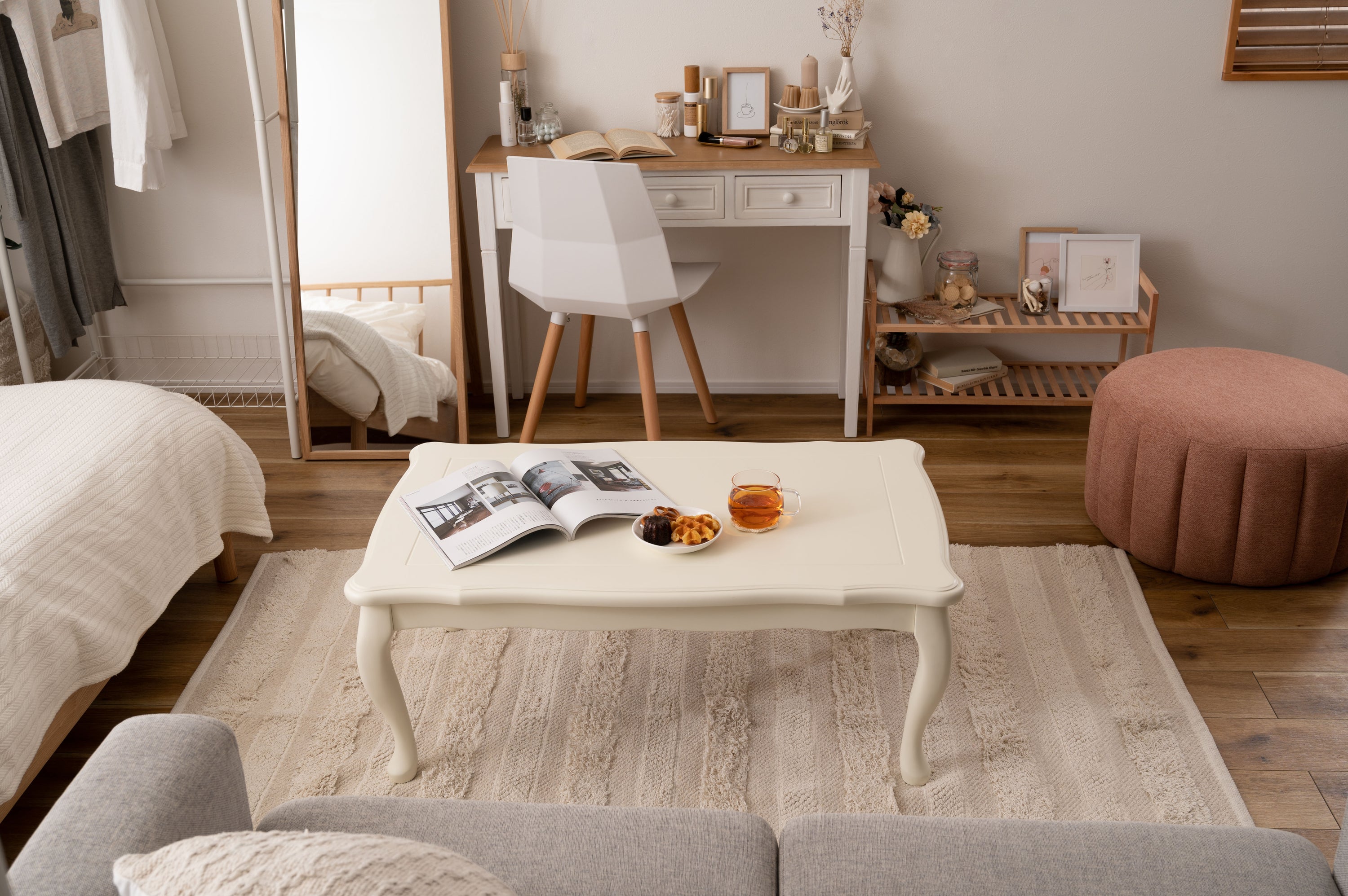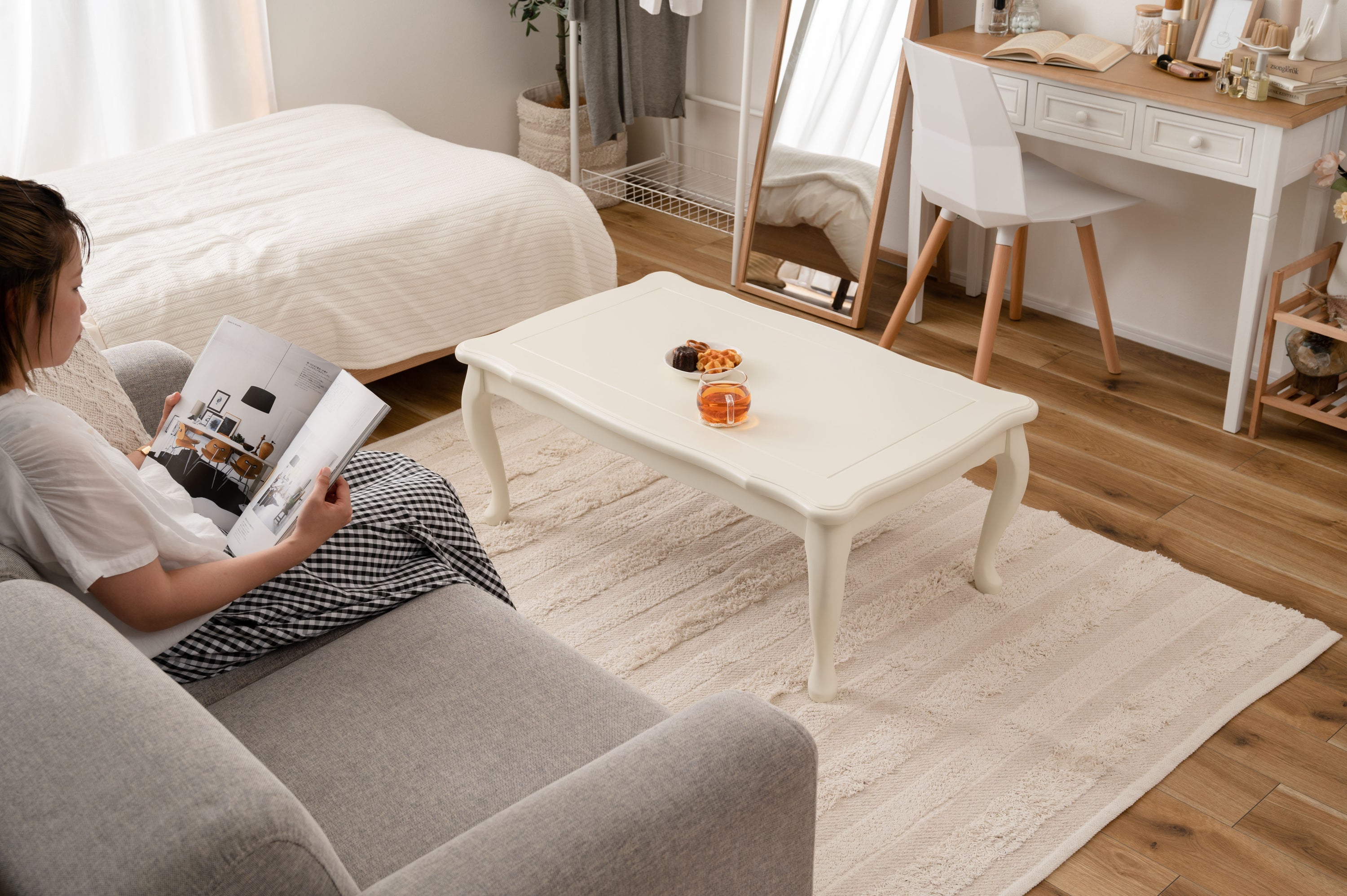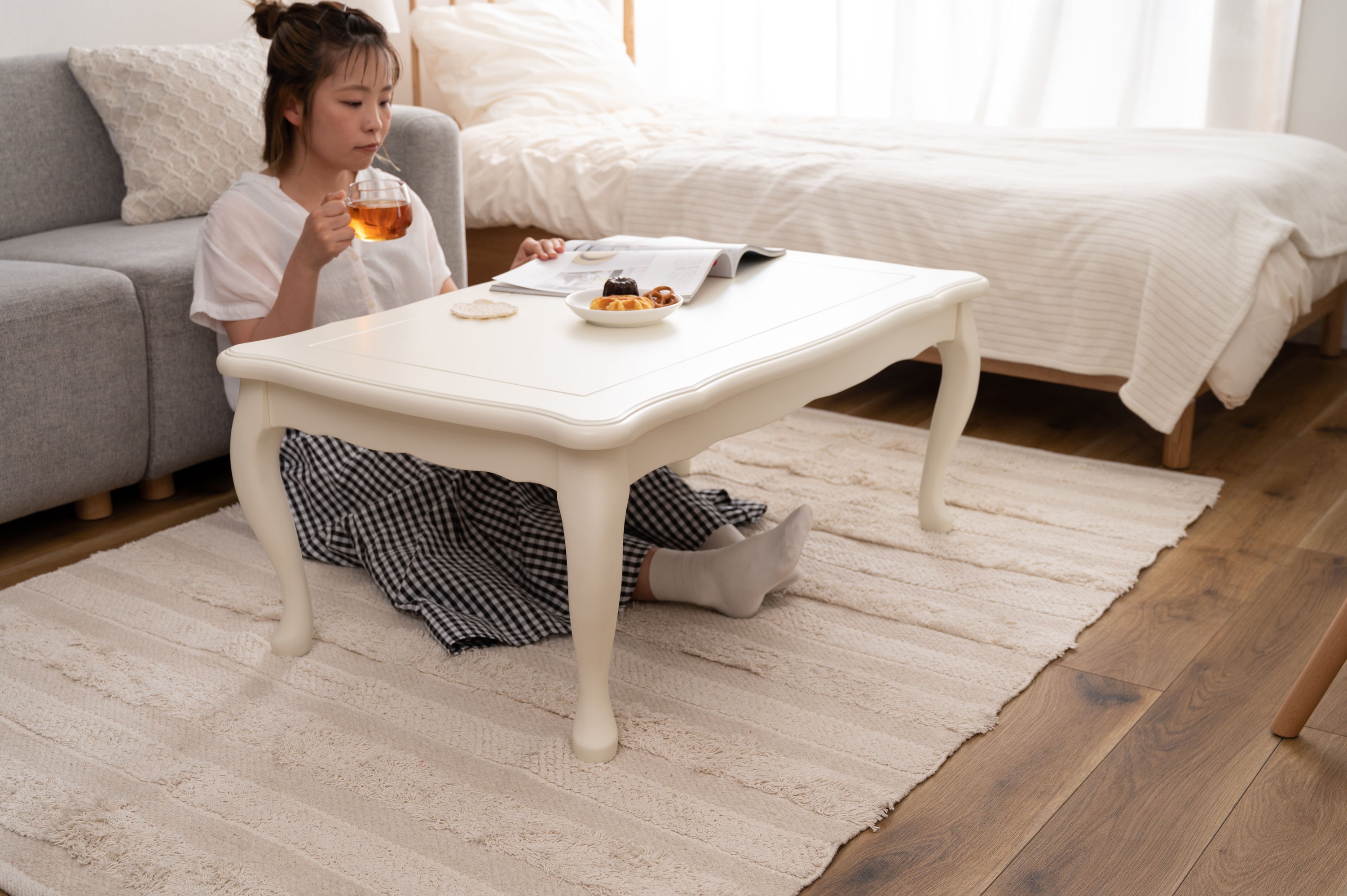 天板の装飾や猫脚のクラシカルなデザインはシーズンを選ばずお使い頂けます。ホワイトカラーと天板のデザインは、布団を掛けても元々のイメージはそのままに、クラシカルでガーリーな雰囲気を演出してくれます。天板や脚の細部にもこだわった猫脚コタツ。テーブルそのものとしてのデザイン性が高く、オフシーズンもインテリアに馴染みます。リビングテーブルに近いサイズなので圧迫感なく使えます。間取りにとらわれないコンパクト設計なので、TVボードを置いた空間でも窮屈さを感じさせず使えます。ヒーターは天板下の幕板にスッキリと納まる設計となっているので、コタツ感のないオールシーズン使えるテーブル。正方形:4面使えるちょうど良いサイズ。コンパクトでも対面使用が出来る正方形の定番サイズ。長方形:奥行をコンパクトにしたサイズ。オフシーズンでも使えるようリビングテーブルに近いサイズ。