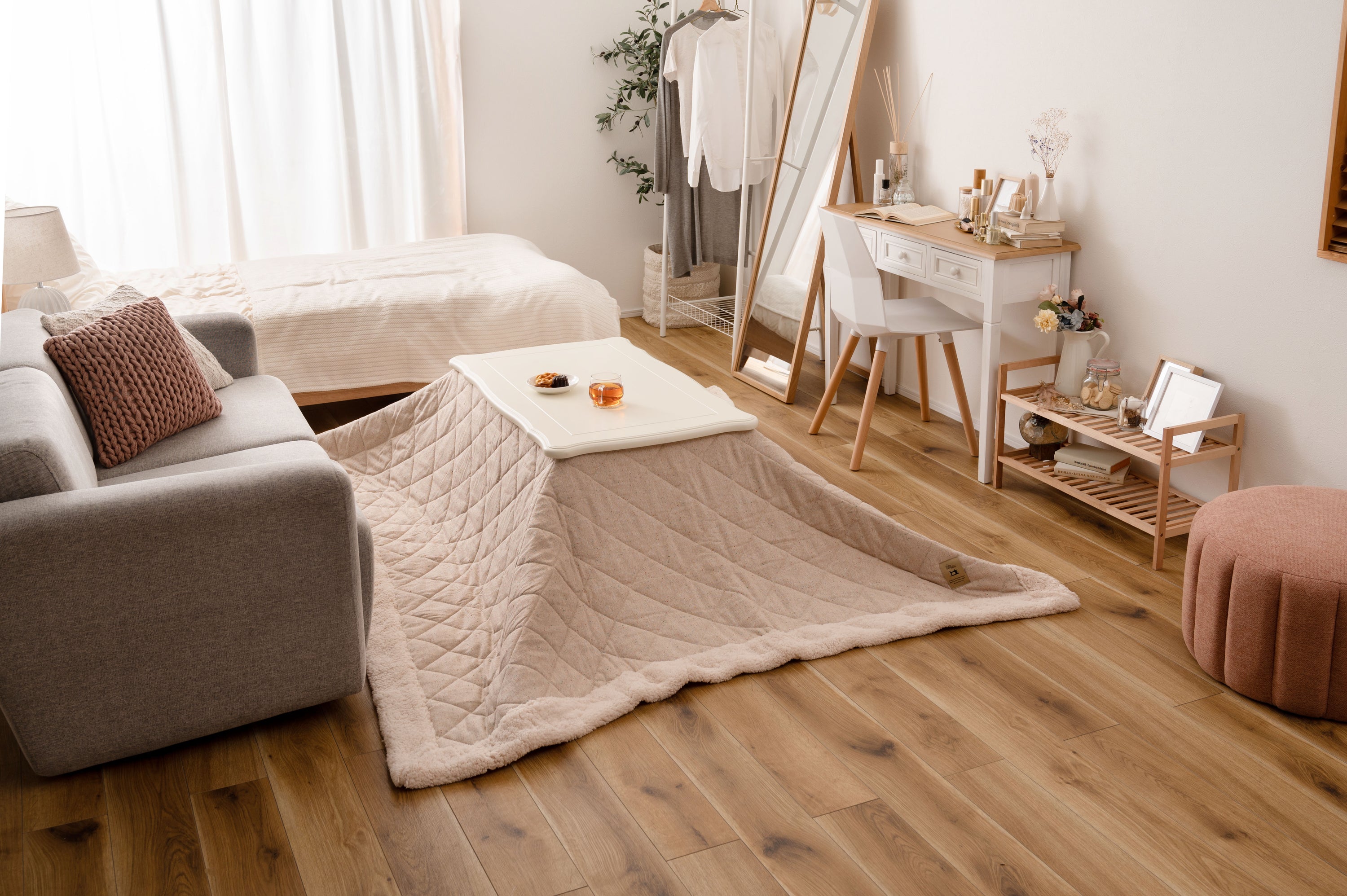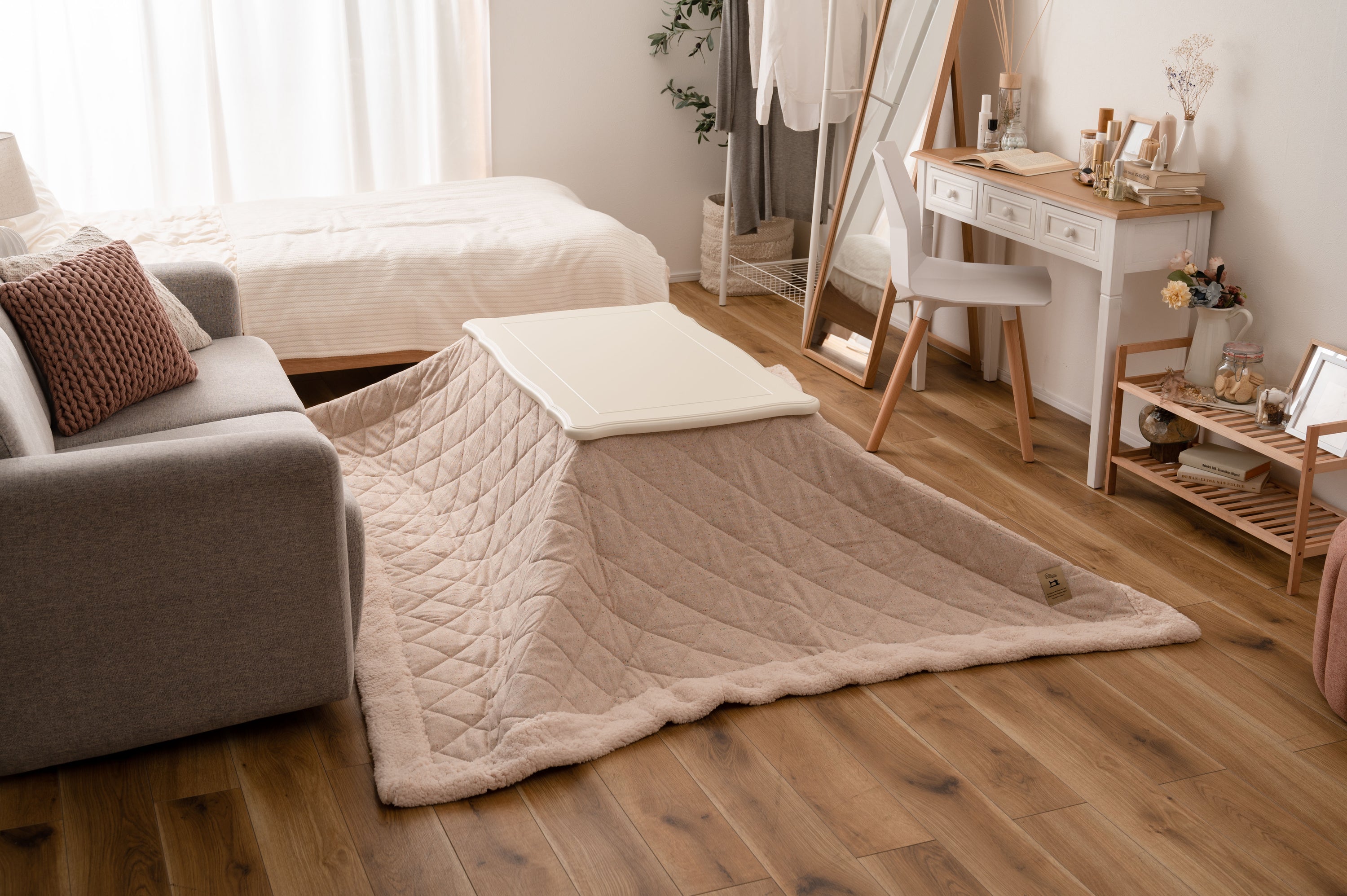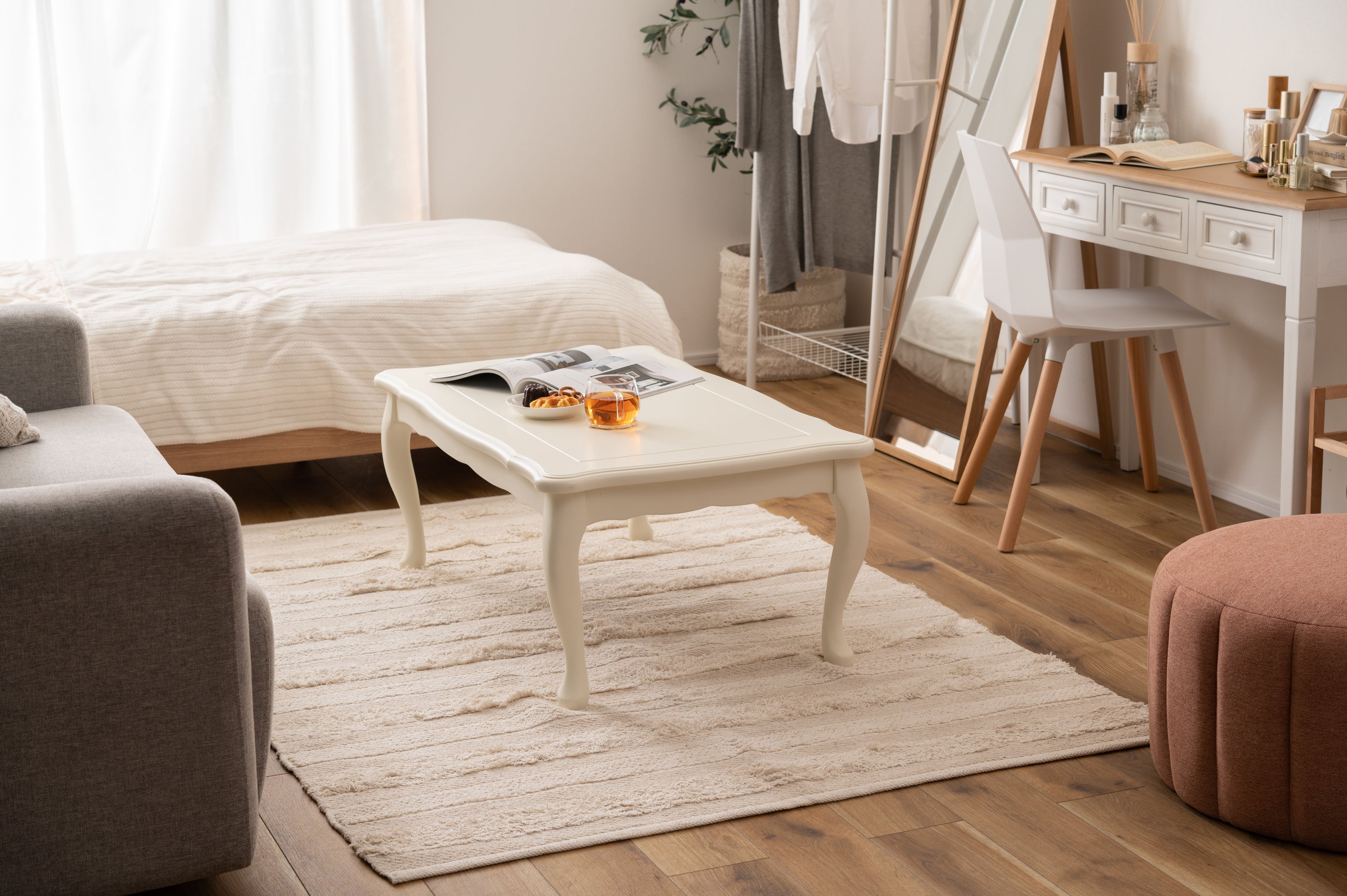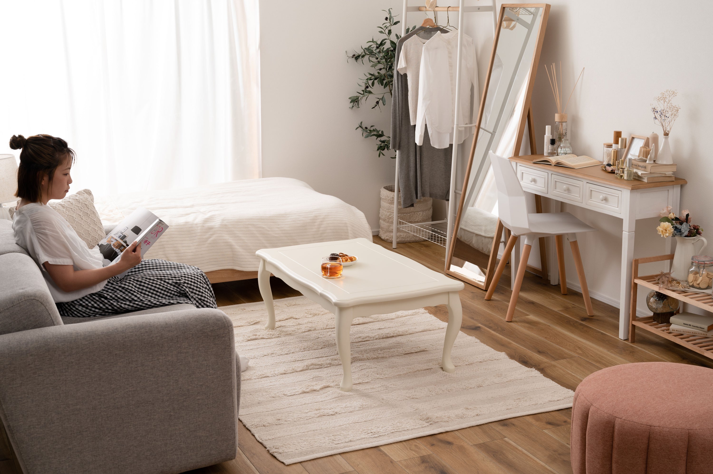天板の装飾や猫脚のクラシカルなデザインはシーズンを選ばずお使い頂けます。ホワイトカラーと天板のデザインは、布団を掛けても元々のイメージはそのままに、クラシカルでガーリーな雰囲気を演出してくれます。天板や脚の細部にもこだわった猫脚コタツ。テーブルそのものとしてのデザイン性が高く、オフシーズンもインテリアに馴染みます。リビングテーブルに近いサイズなので圧迫感なく使えます。間取りにとらわれないコンパクト設計なので、TVボードを置いた空間でも窮屈さを感じさせず使えます。ヒーターは天板下の幕板にスッキリと納まる設計となっているので、コタツ感のないオールシーズン使えるテーブル。正方形:4面使えるちょうど良いサイズ。コンパクトでも対面使用が出来る正方形の定番サイズ。長方形:奥行をコンパクトにしたサイズ。オフシーズンでも使えるようリビングテーブルに近いサイズ。