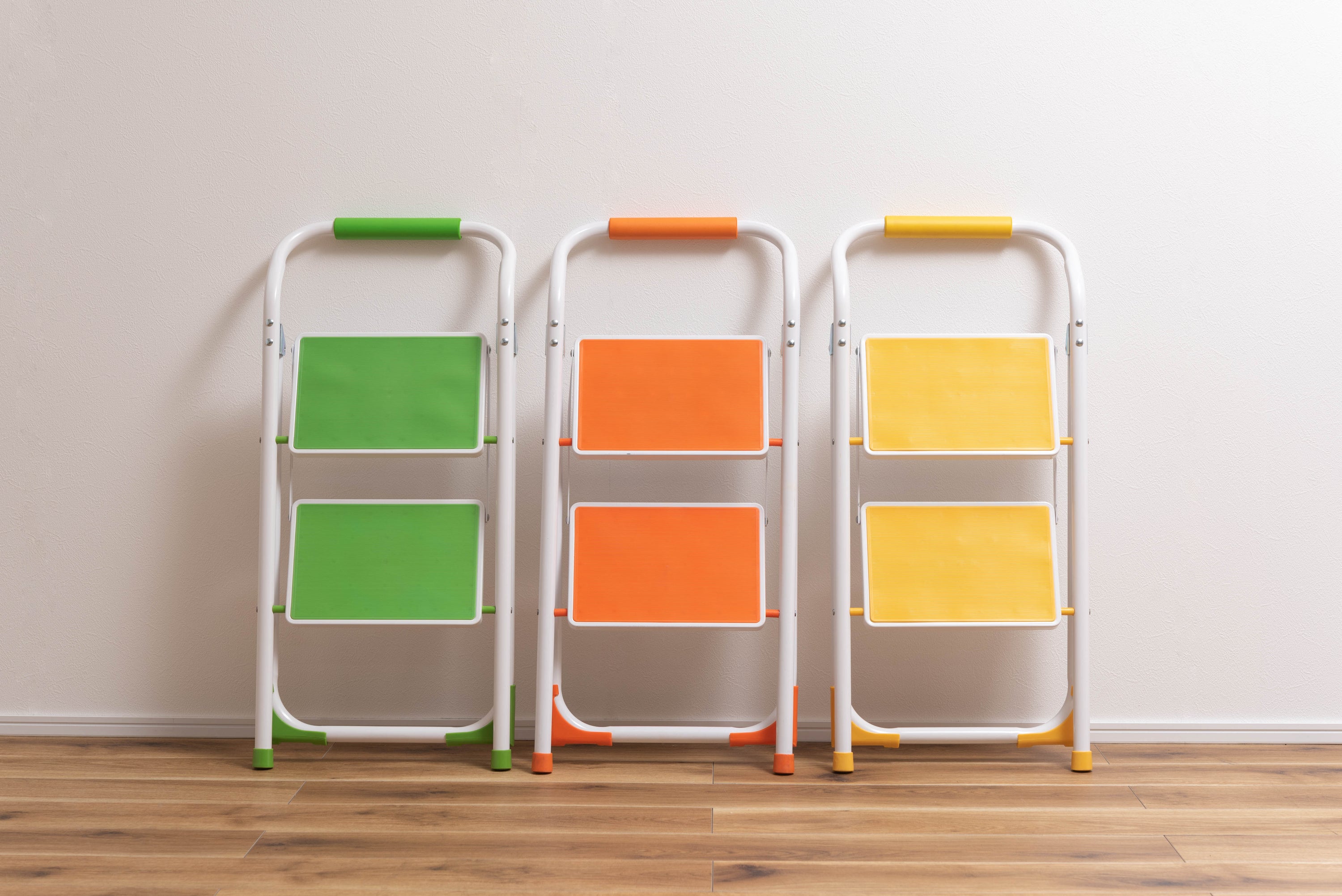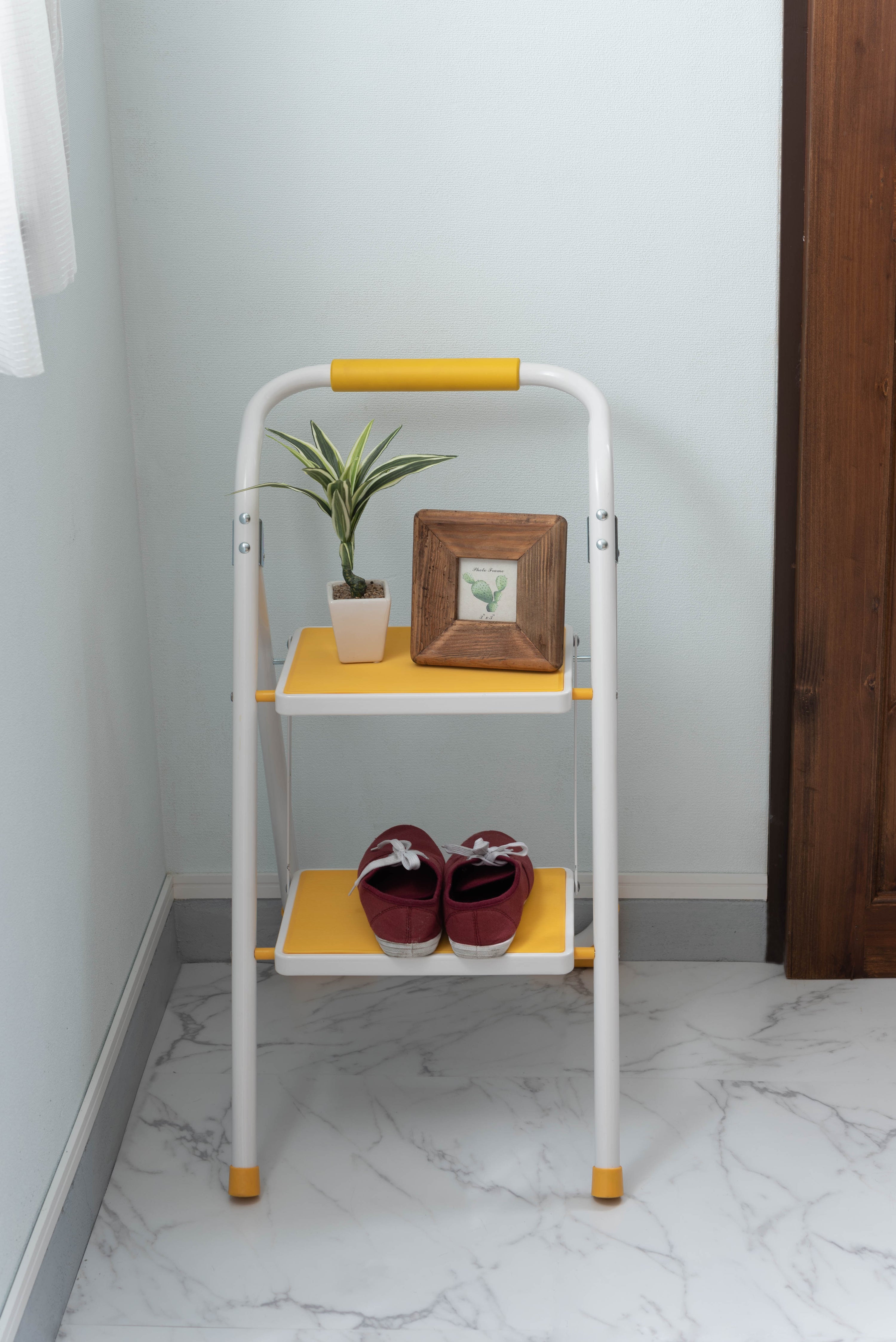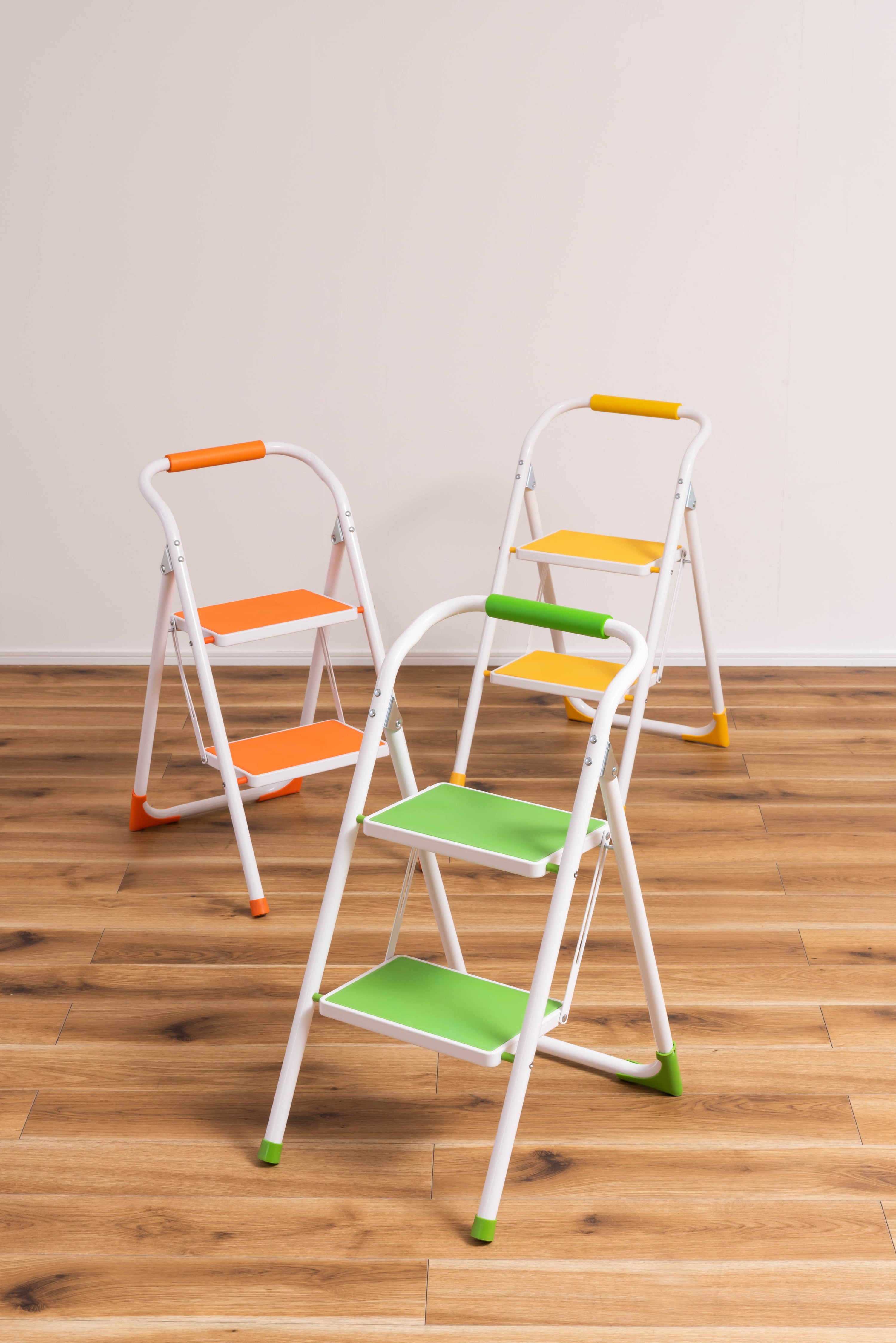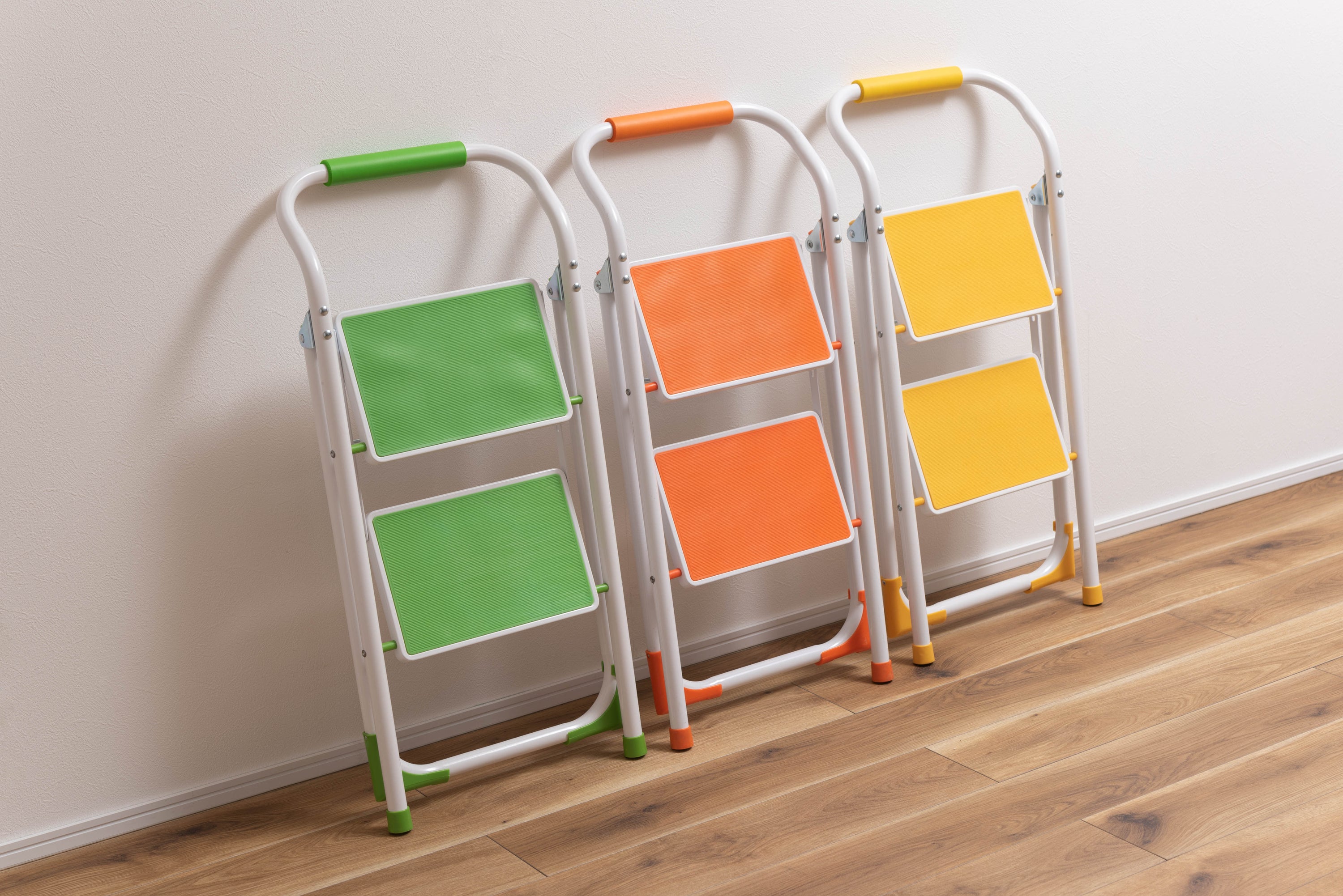 踏み台としてだけではなく様々な使い方ができる便利なステップ台。ポップな3色がお部屋にアクセントを与えてくれます。踏み台が2段付いたステップ台なので、高い場所での作業もラクラク。フレーム上段のグリップ部分は握りやすい仕様になっているので、昇り降りも安心して行なえます。ステップ部分は滑りにくいノンスリップ仕様。ステップの裏面には安全ストッパー付き。折りたたみ式なので持ち運びも簡単。ちょっとした隙間や車の荷台など、省スペース収納が可能です。