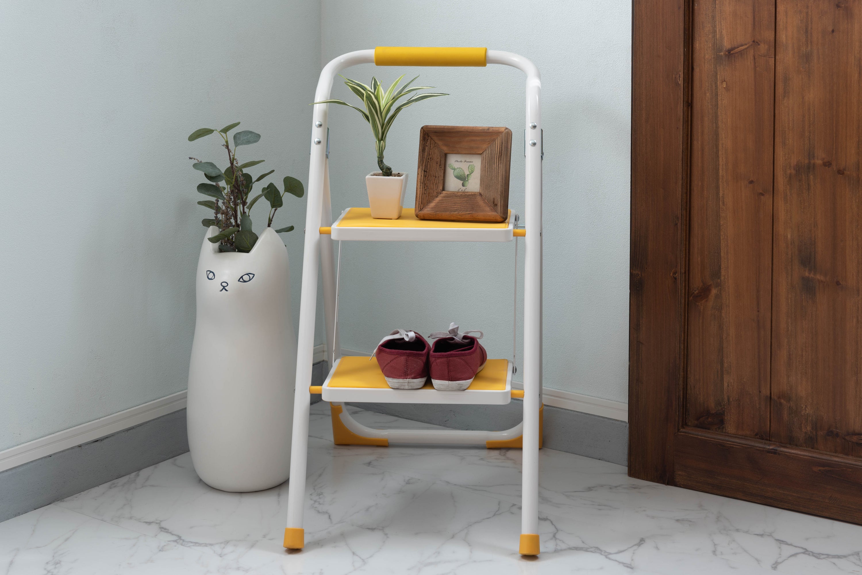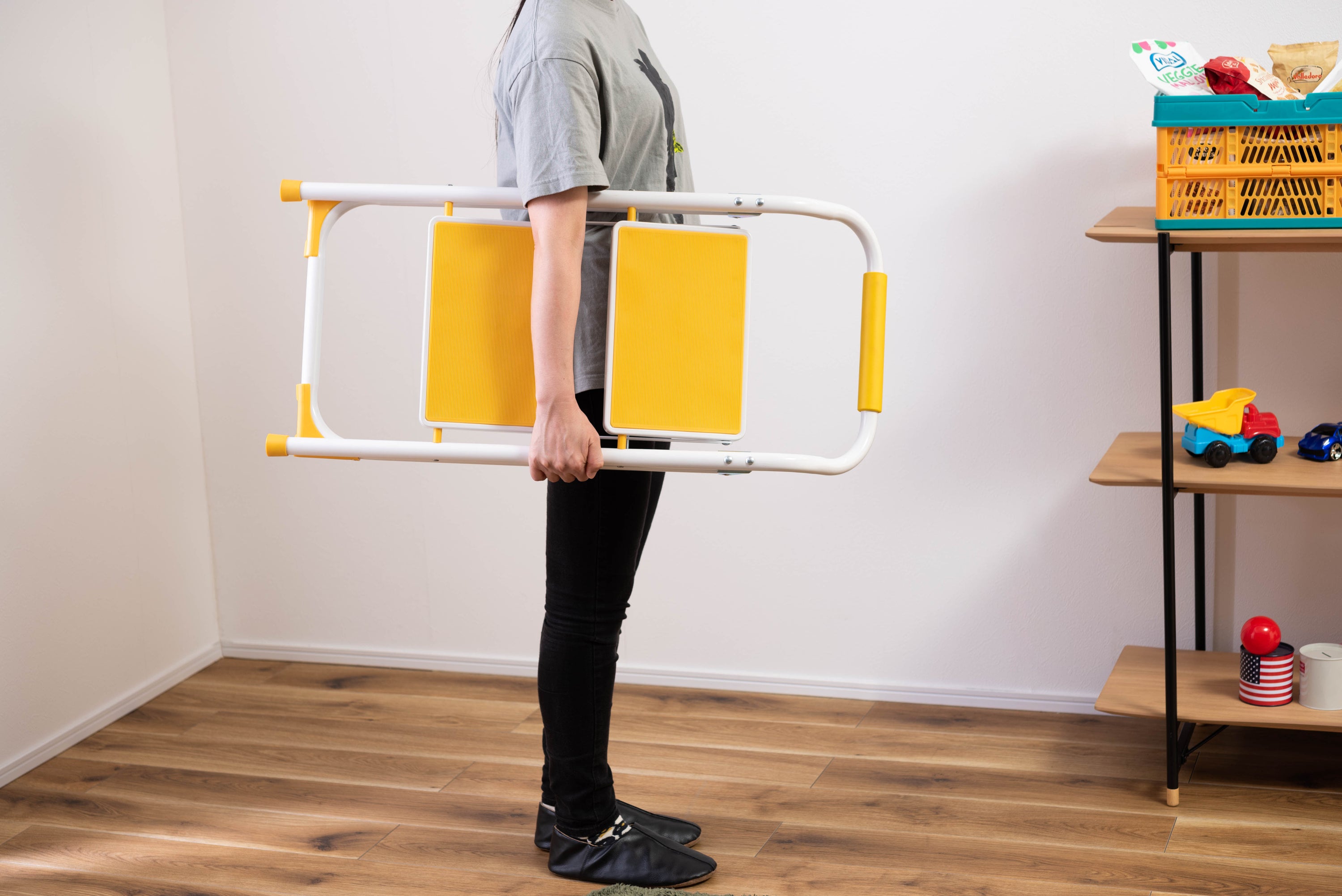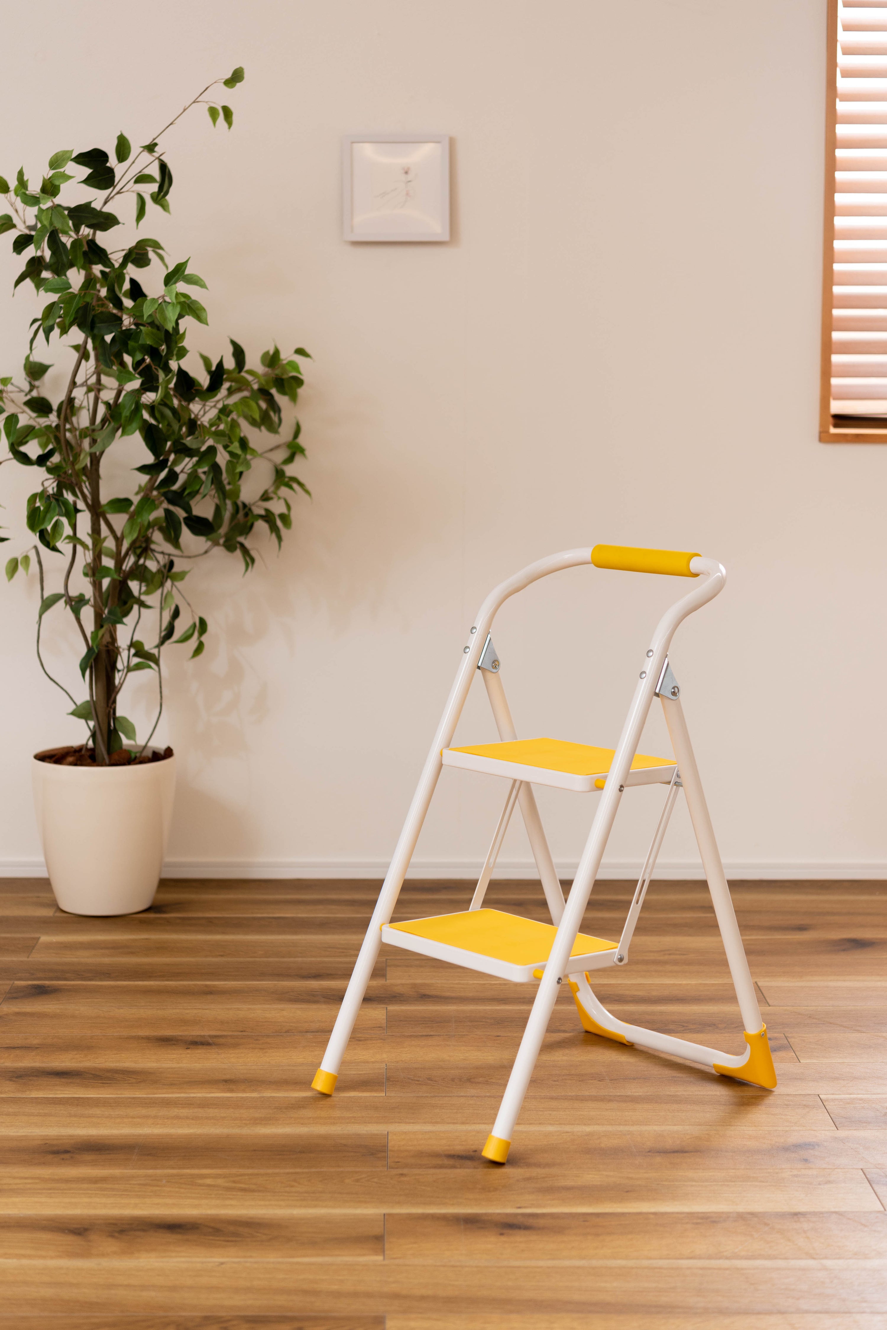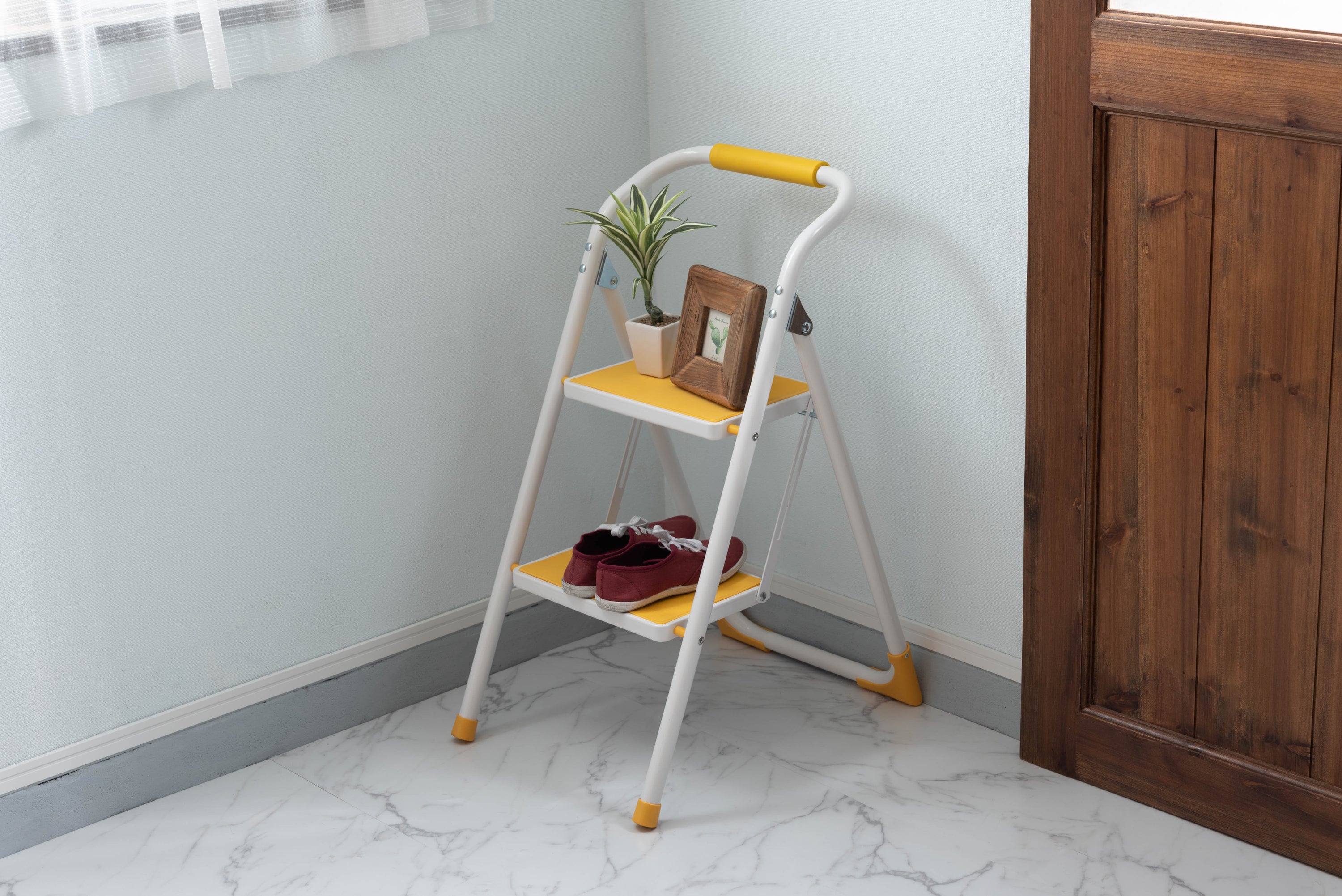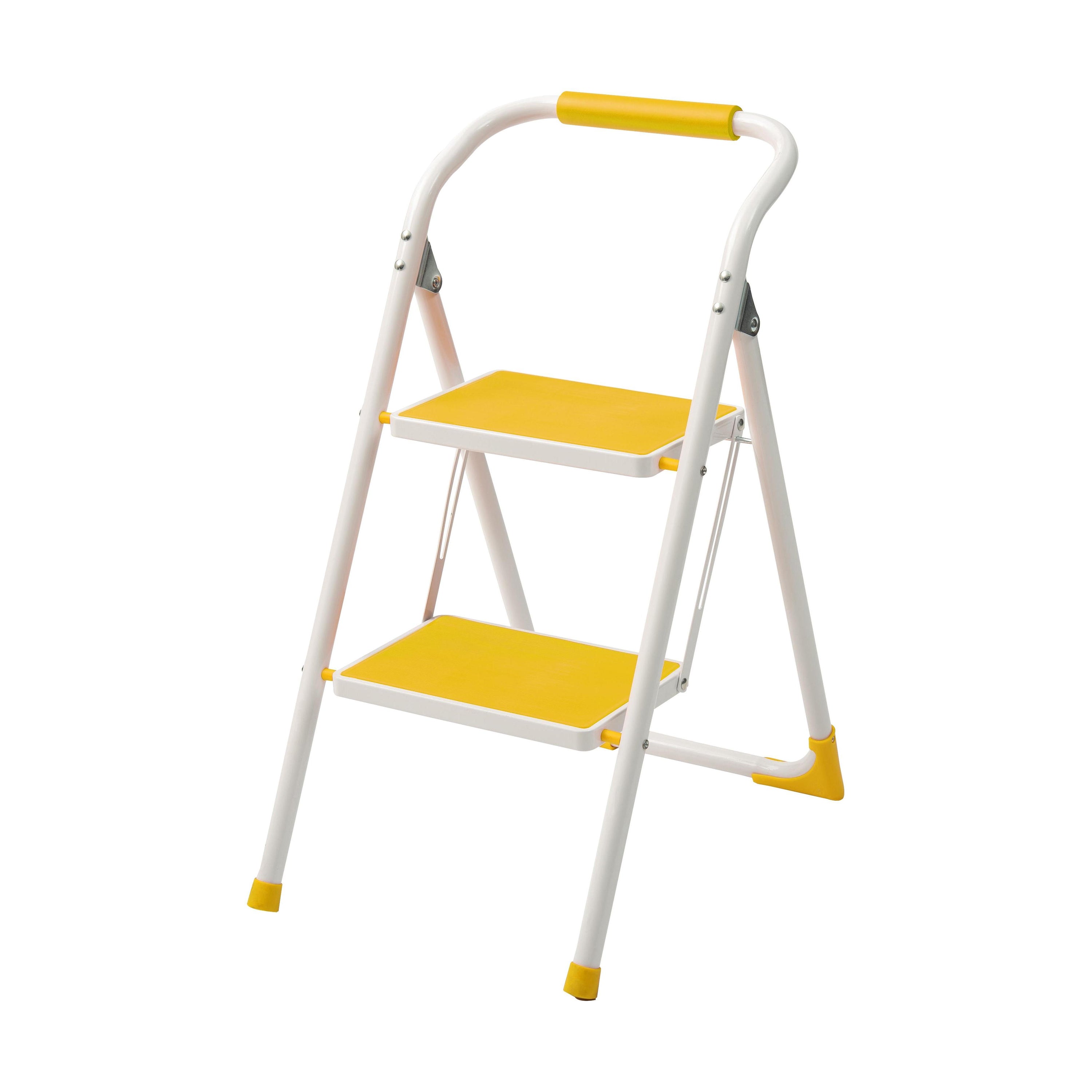 踏み台としてだけではなく様々な使い方ができる便利なステップ台。ポップな3色がお部屋にアクセントを与えてくれます。踏み台が2段付いたステップ台なので、高い場所での作業もラクラク。フレーム上段のグリップ部分は握りやすい仕様になっているので、昇り降りも安心して行なえます。ステップ部分は滑りにくいノンスリップ仕様。ステップの裏面には安全ストッパー付き。折りたたみ式なので持ち運びも簡単。ちょっとした隙間や車の荷台など、省スペース収納が可能です。