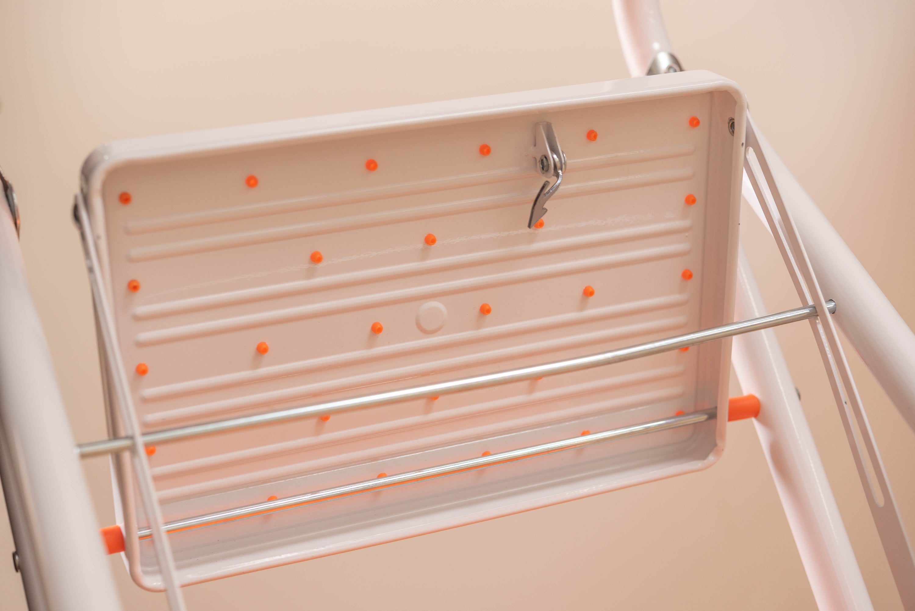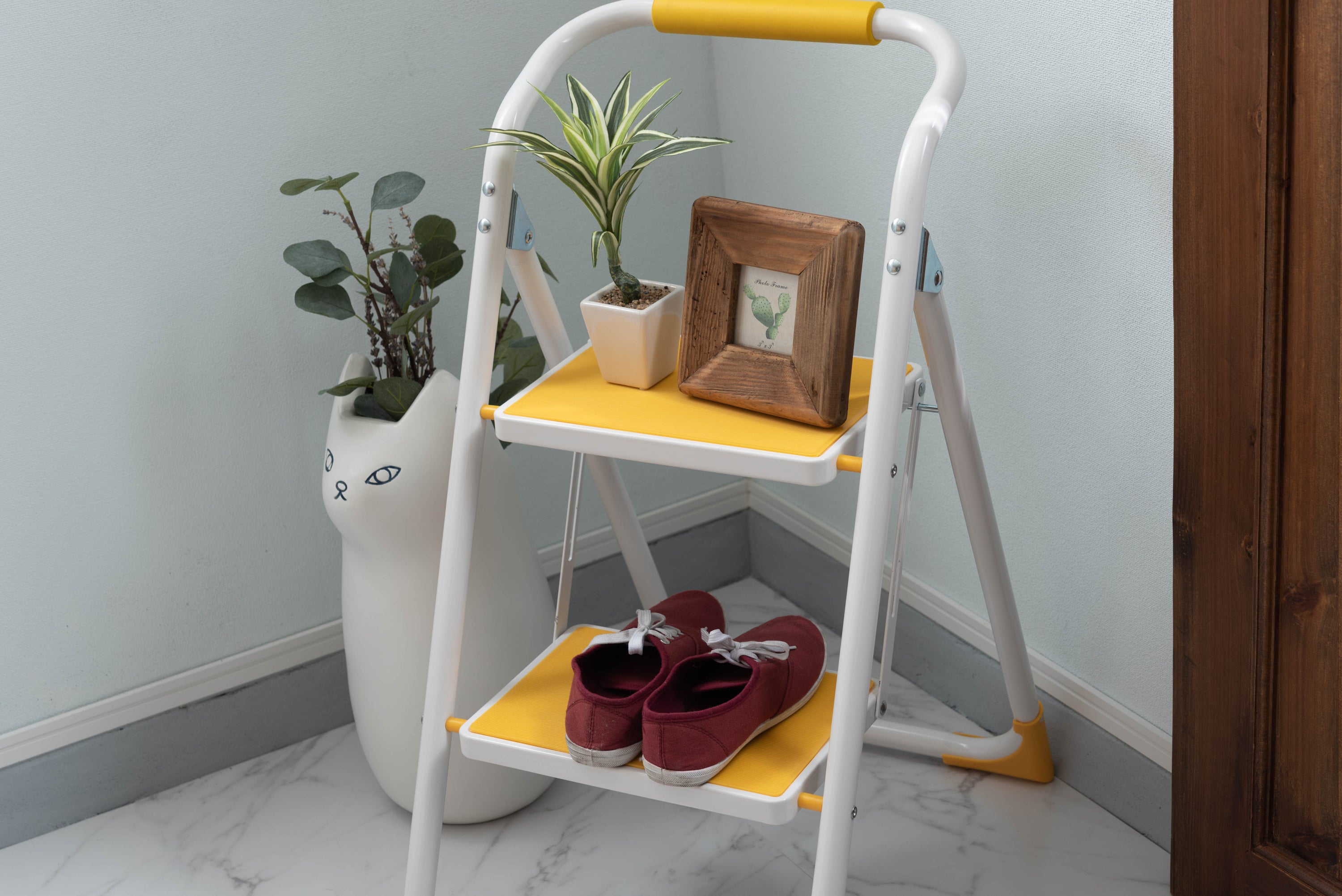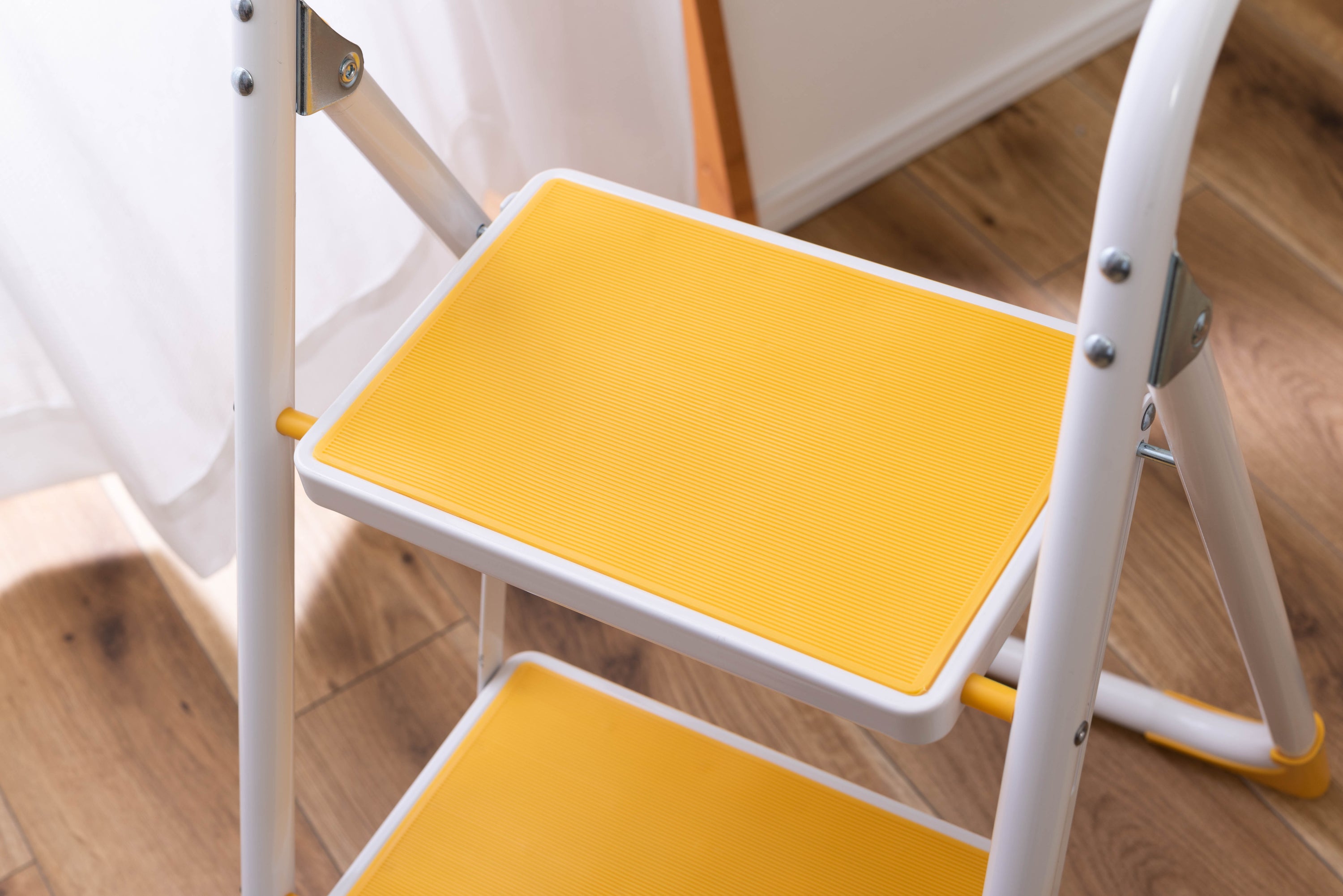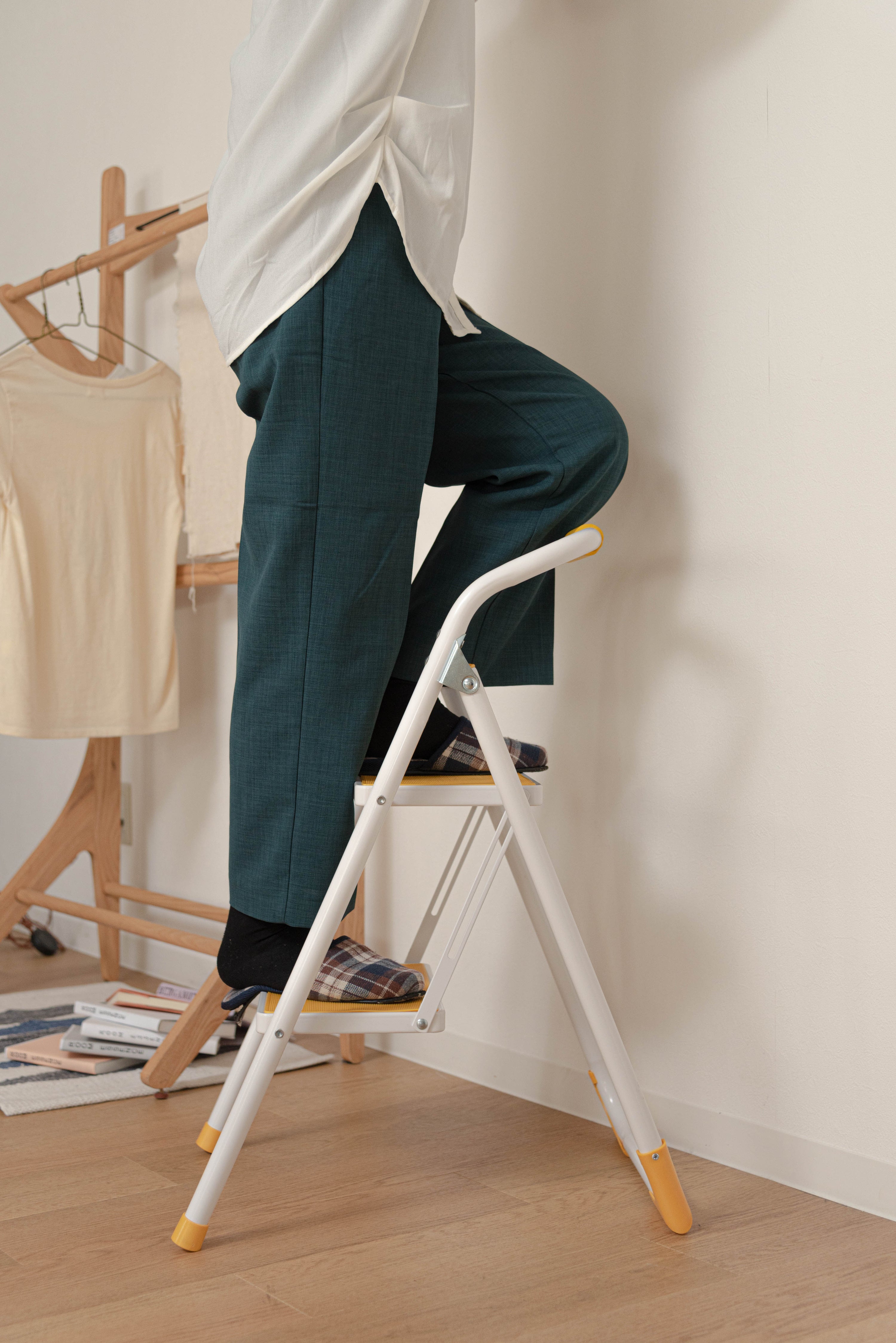 踏み台としてだけではなく様々な使い方ができる便利なステップ台。ポップな3色がお部屋にアクセントを与えてくれます。踏み台が2段付いたステップ台なので、高い場所での作業もラクラク。フレーム上段のグリップ部分は握りやすい仕様になっているので、昇り降りも安心して行なえます。ステップ部分は滑りにくいノンスリップ仕様。ステップの裏面には安全ストッパー付き。折りたたみ式なので持ち運びも簡単。ちょっとした隙間や車の荷台など、省スペース収納が可能です。