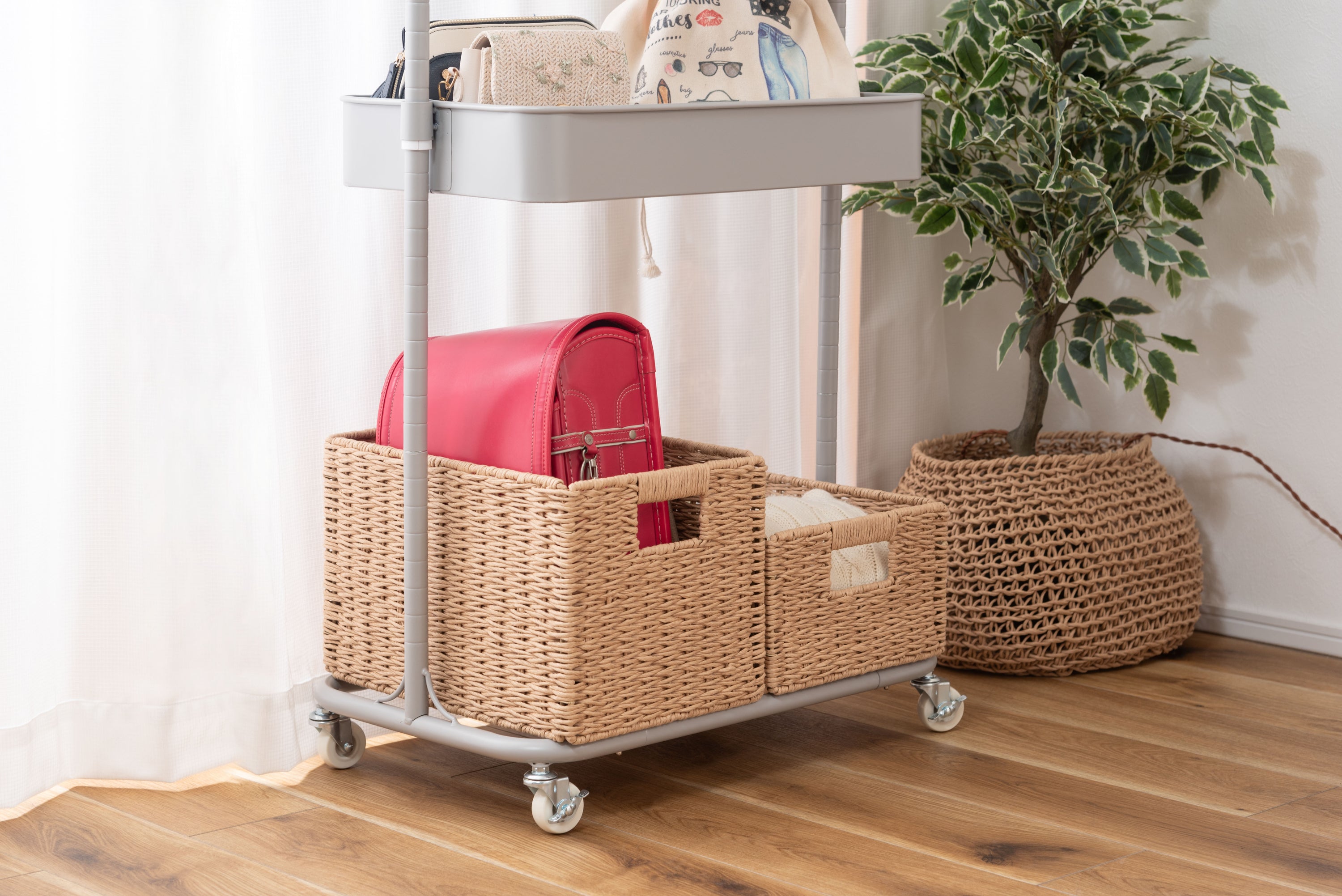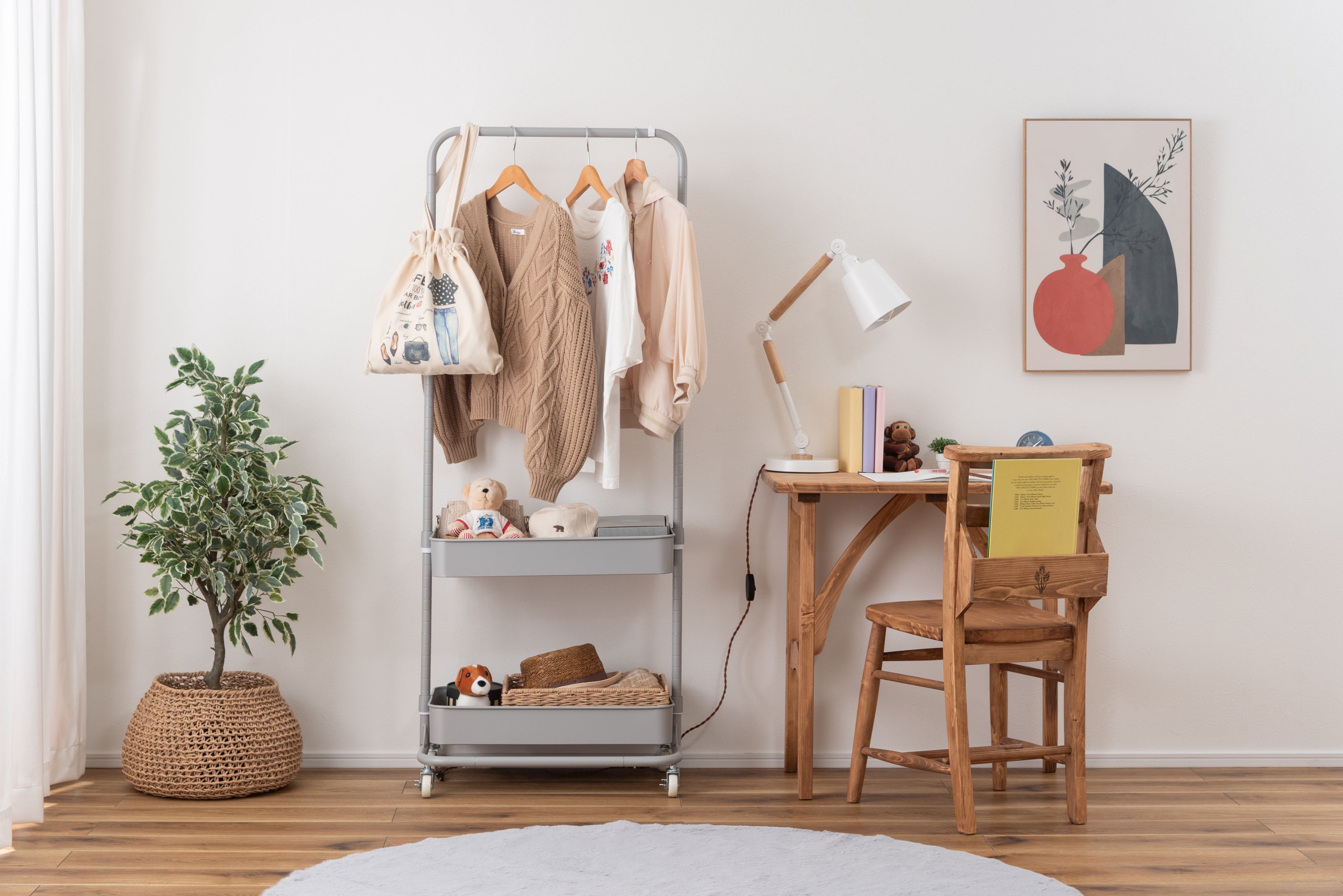 シンプルデザインで場所を選ばないハンガーワゴンです。中間ハンガーやボックスの高さを変更できるので、使いやすい形に変えて使用可能です。ポールの部品をひとつ脱着する事で、ハンガー全体の高さ調整も可能です。