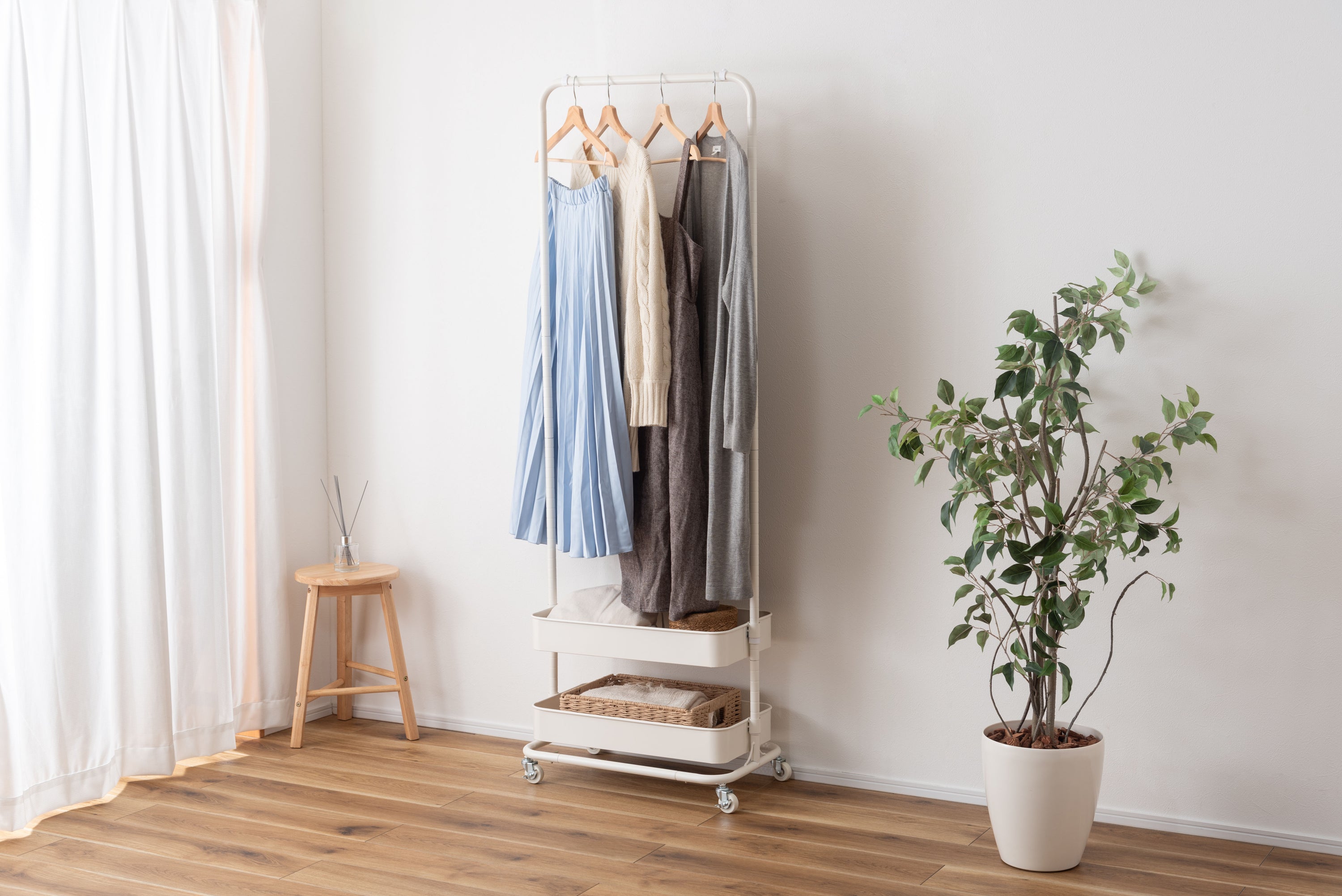 シンプルデザインで場所を選ばないハンガーワゴンです。中間ハンガーやボックスの高さを変更できるので、使いやすい形に変えて使用可能です。ポールの部品をひとつ脱着する事で、ハンガー全体の高さ調整も可能です。