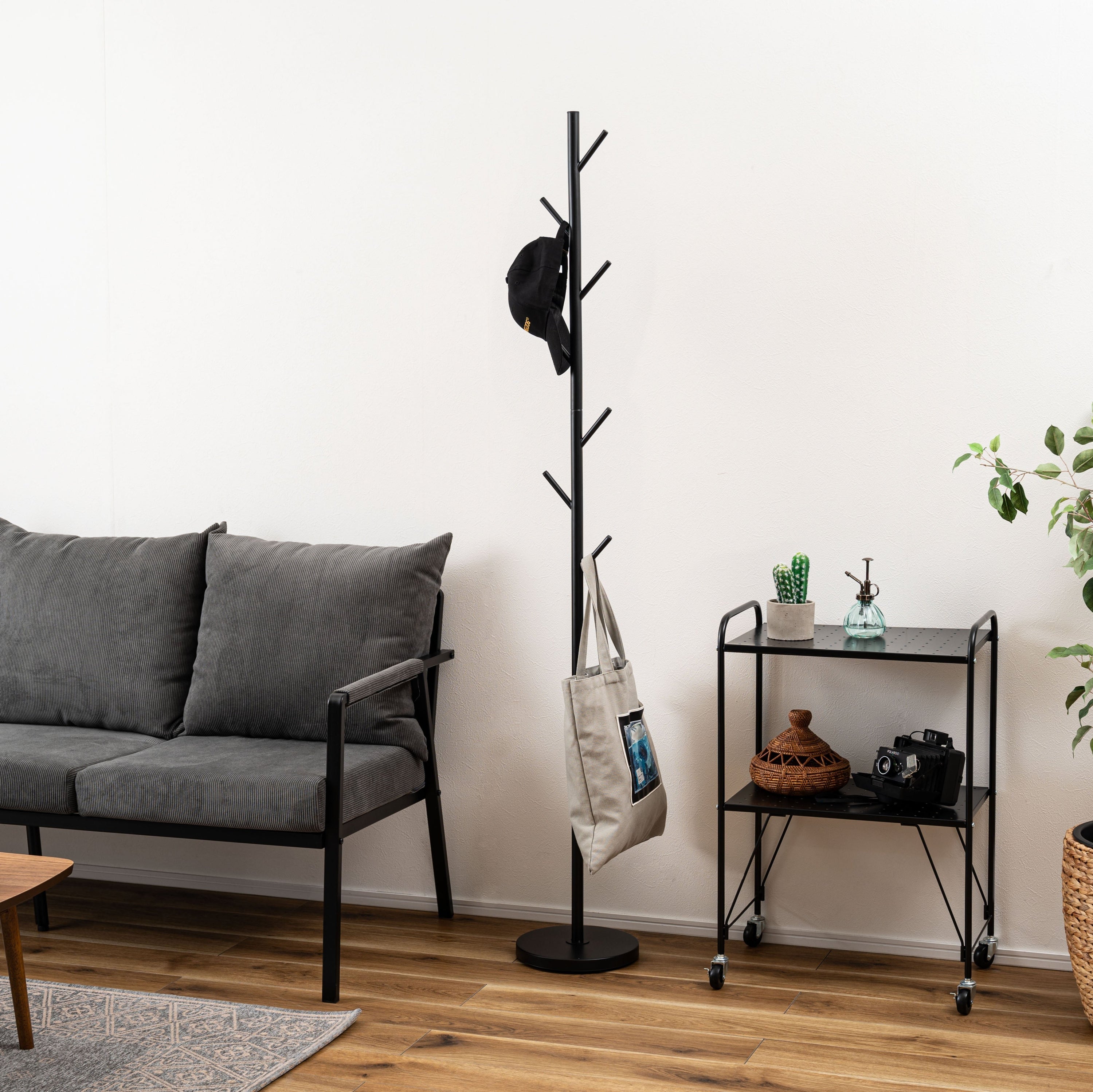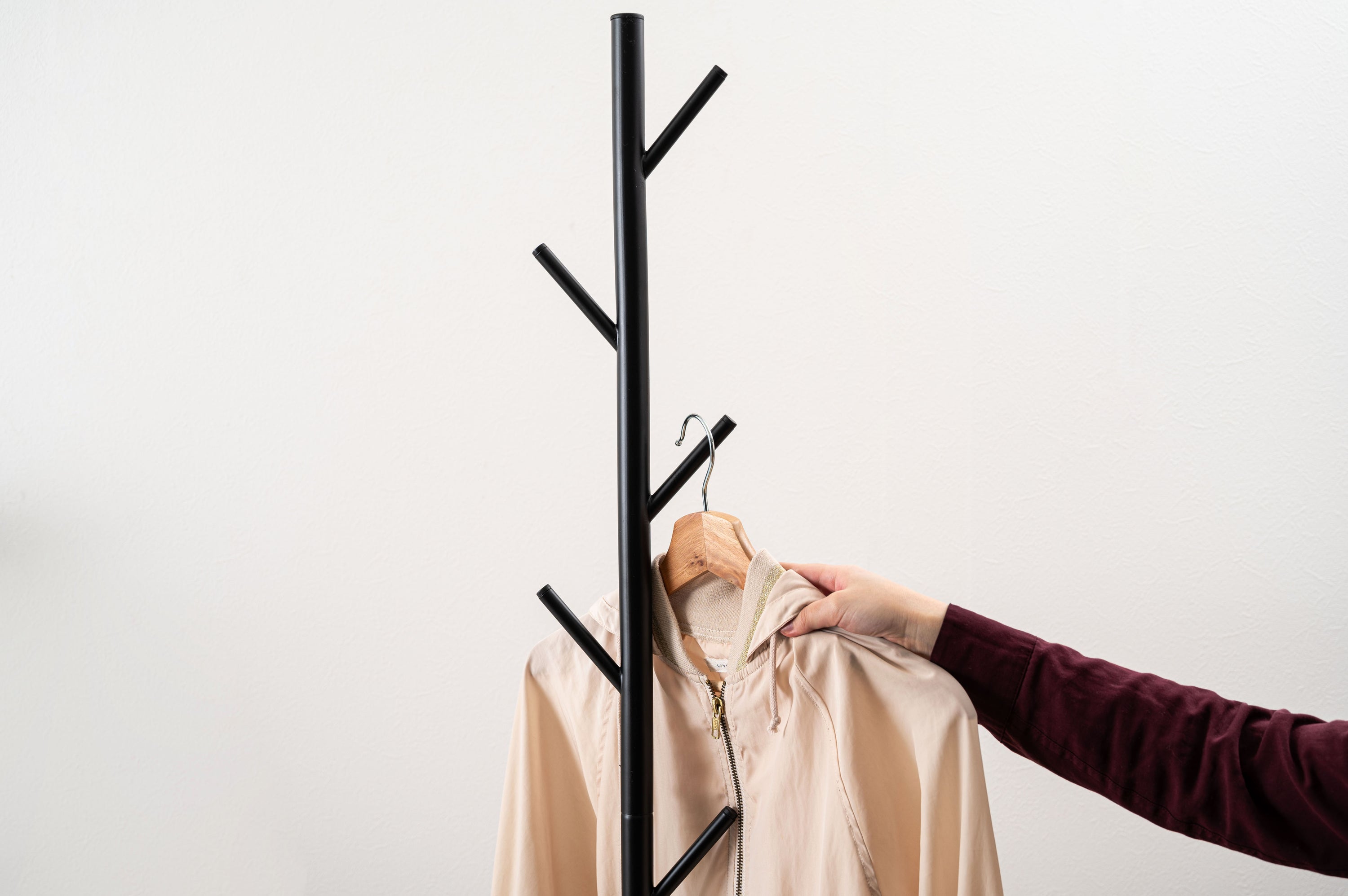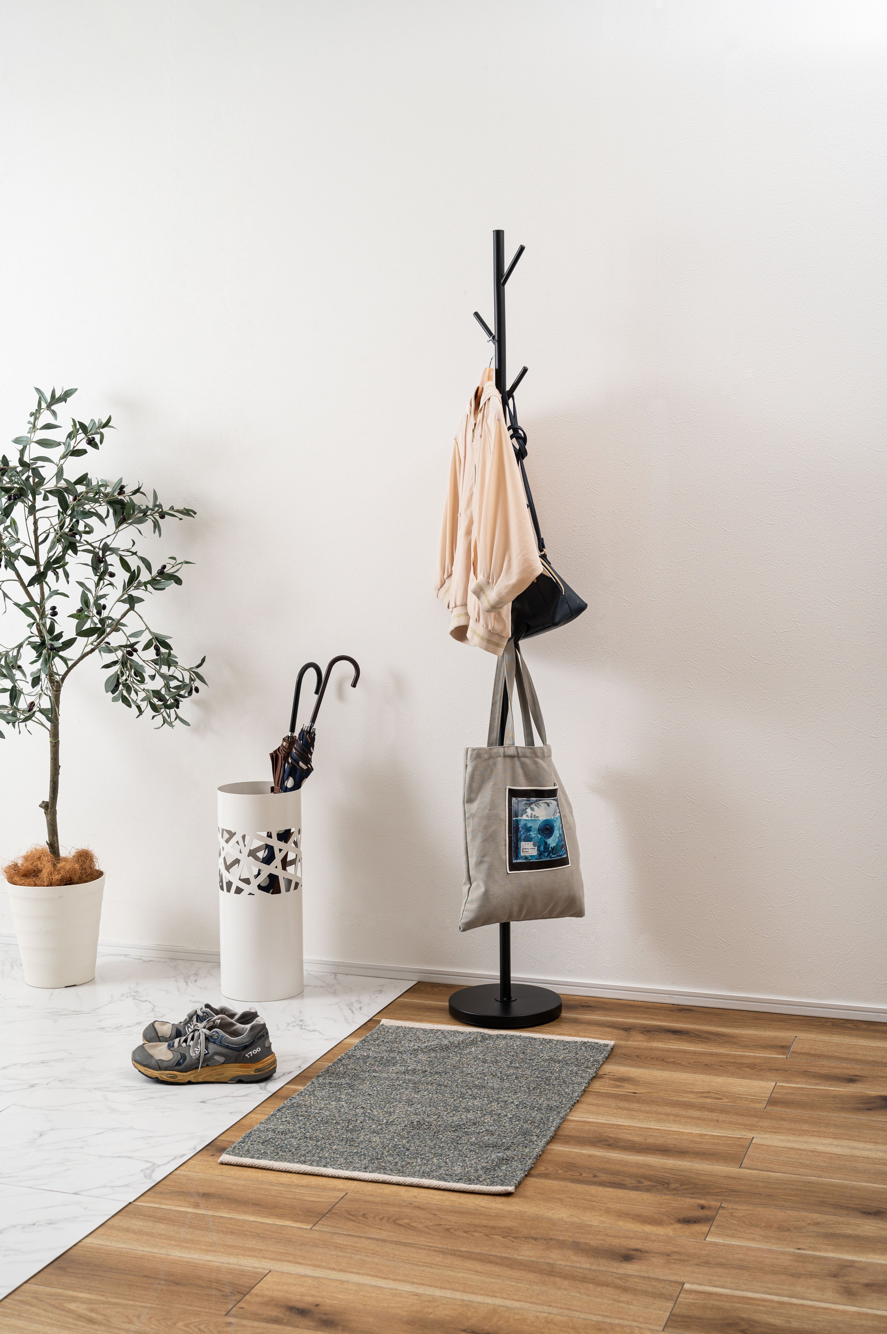シンプルですっきりとしたデザインのポールハンガーです。幅・奥行は26cmとスリム設計で場所を取らず、様々な場所で活躍します。省スペース設置が可能なのでリビング、玄関、寝室などに最適です。斜めに伸びた7本のフックに、カバンやコート、帽子などを掛けて使えます。斜めの形状なので物を掛けた時にずり落ちにくい構造になっています。