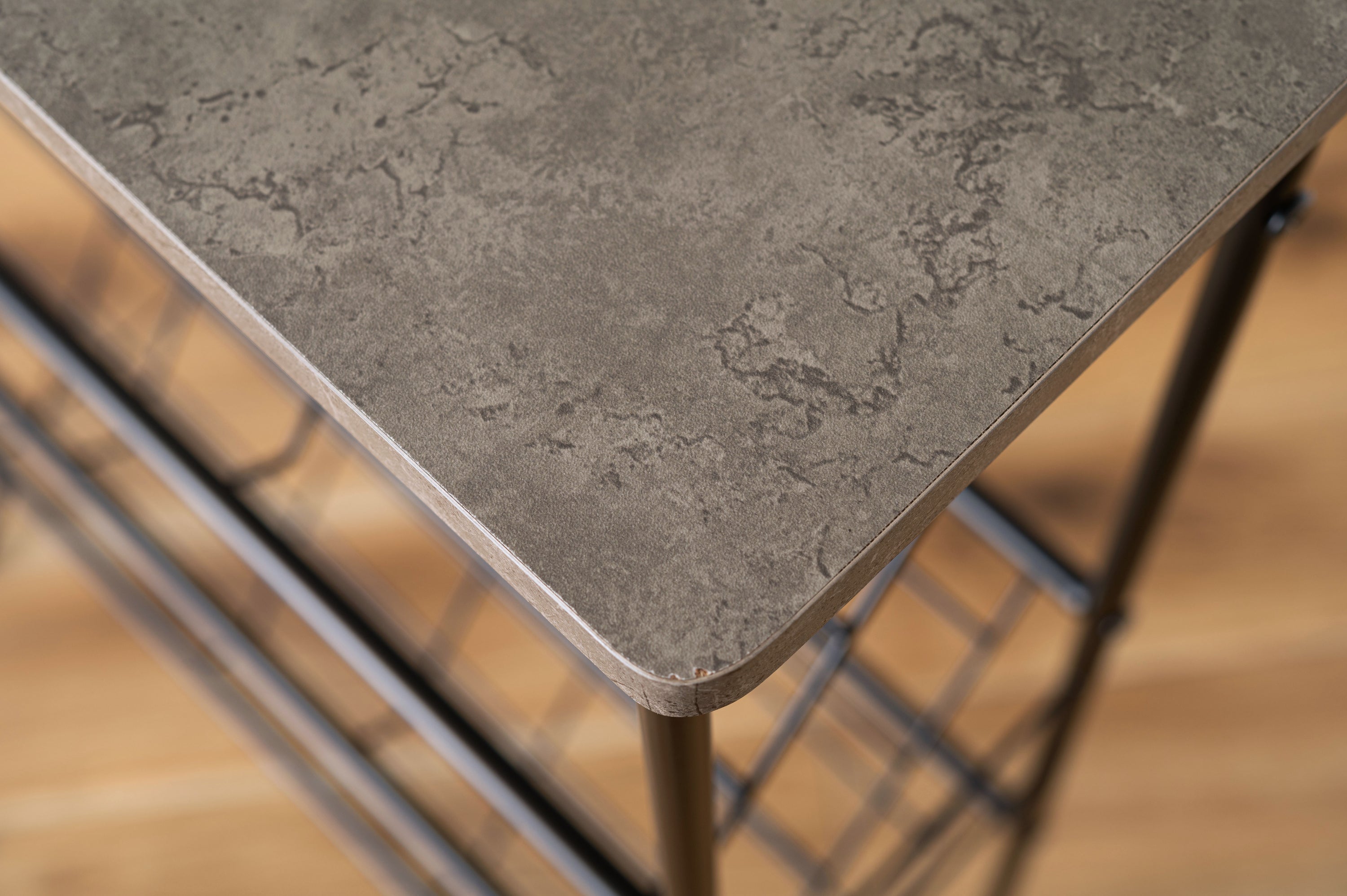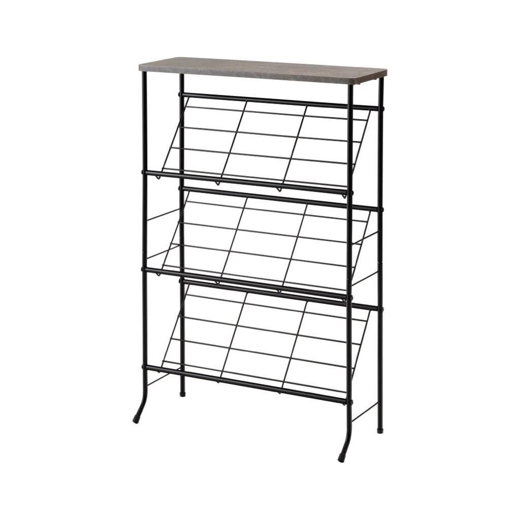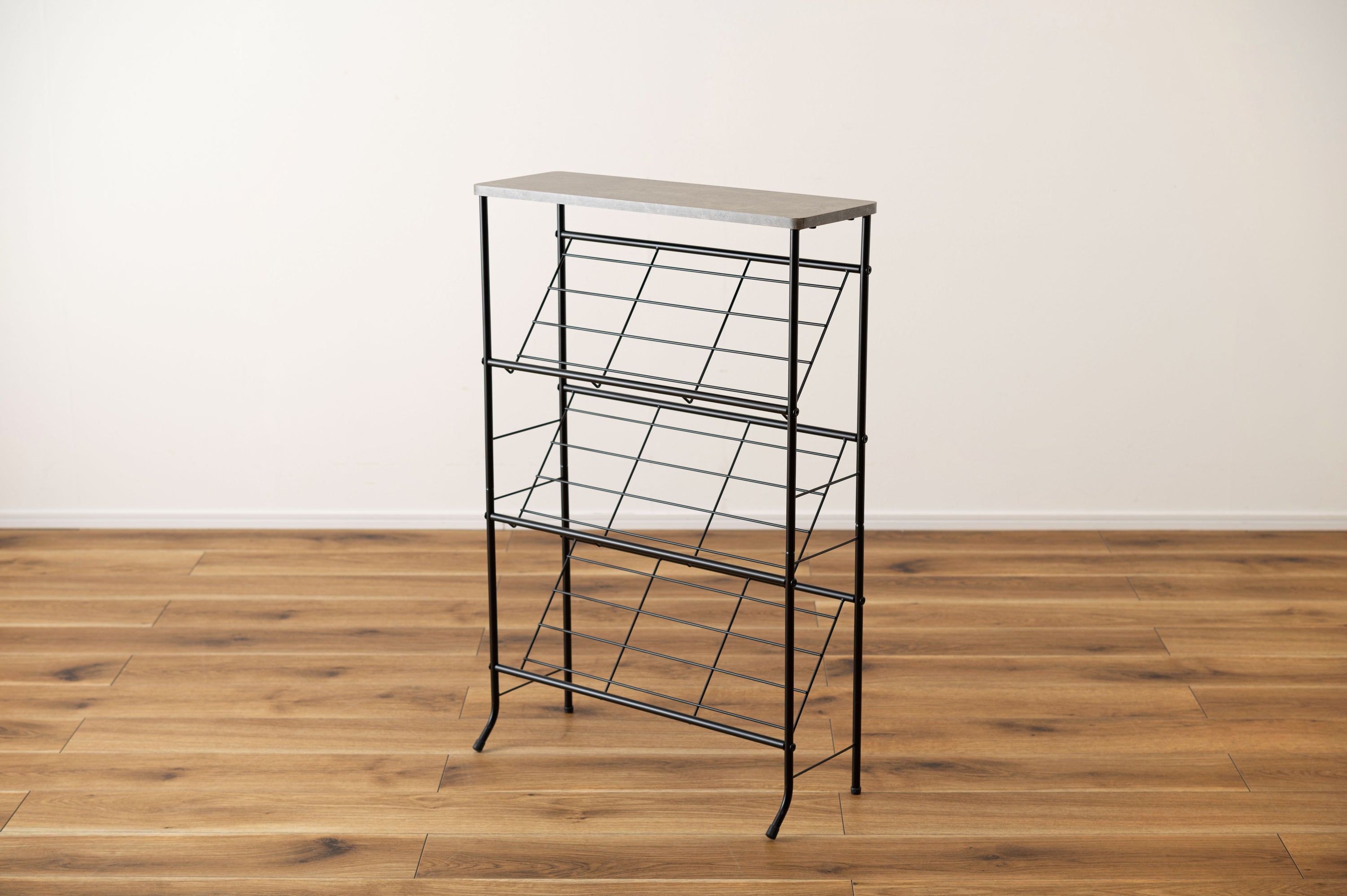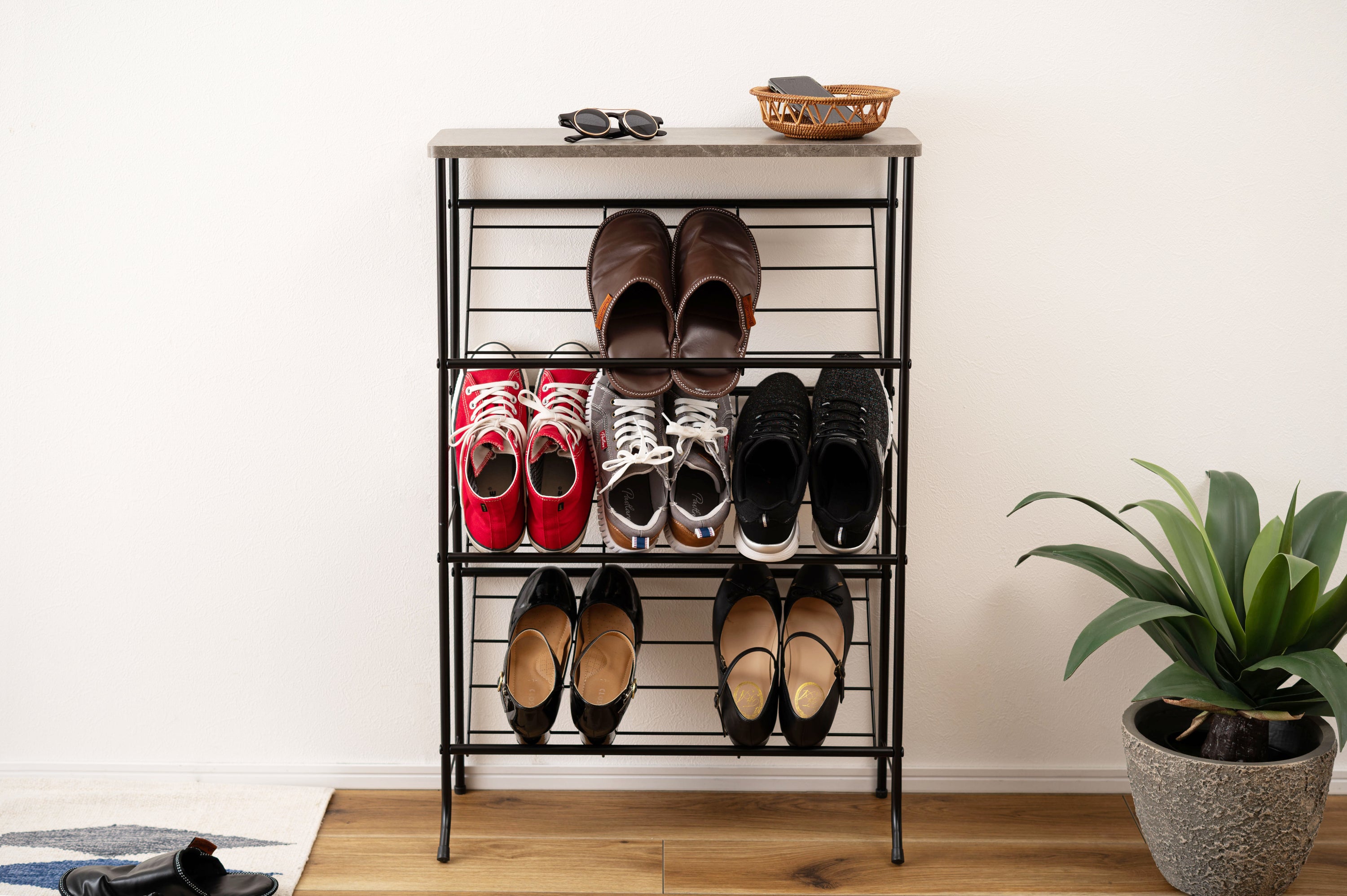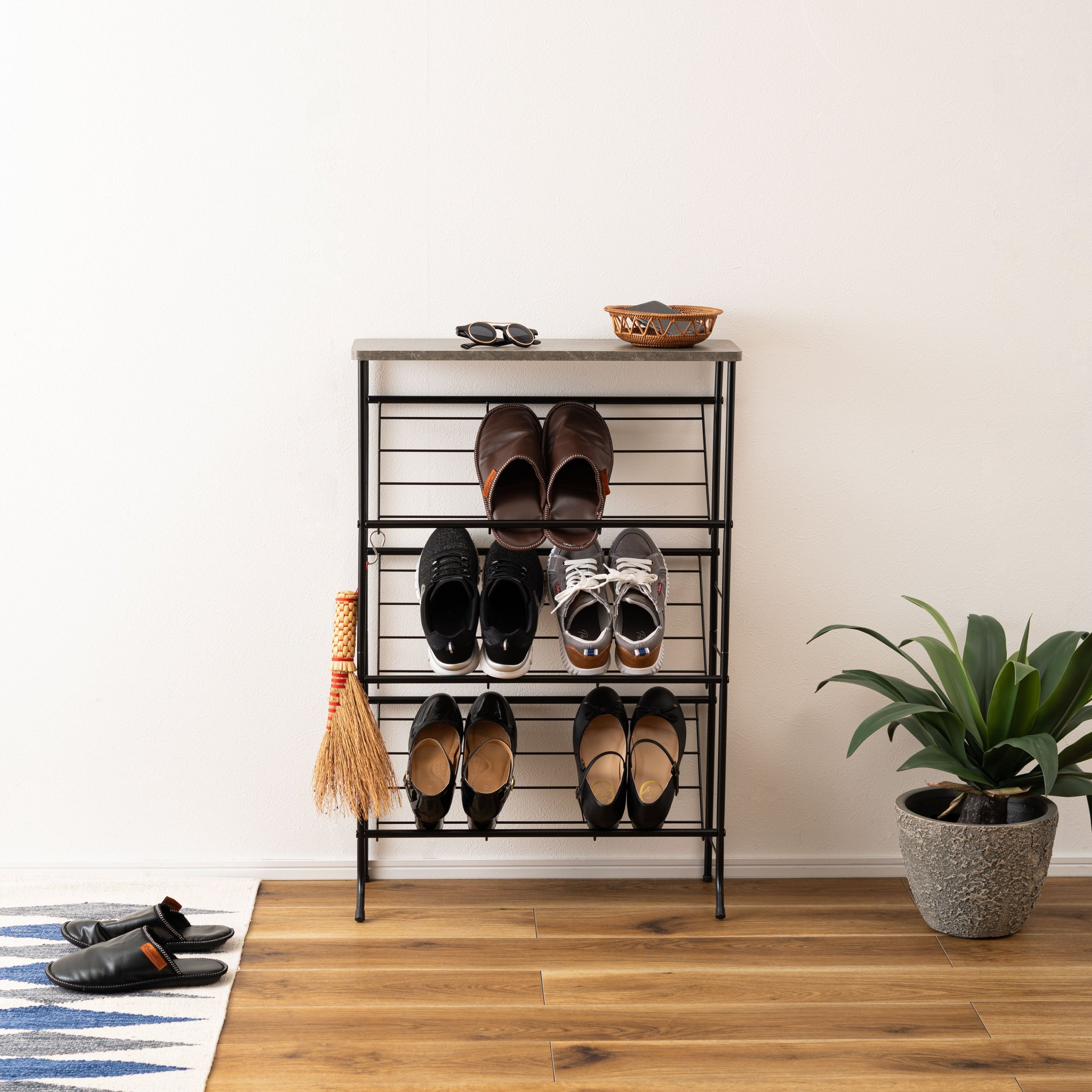 シックな石目調天板とスチールを組み合わせた、スタイリッシュですっきりと収納できるシューズラックです。匂いや湿気がこもらない通気性の良いオープンタイプで、衛生的に使用できます。天板は十分なスペースがある為、小物置きやインテリアのディスプレイになっています。