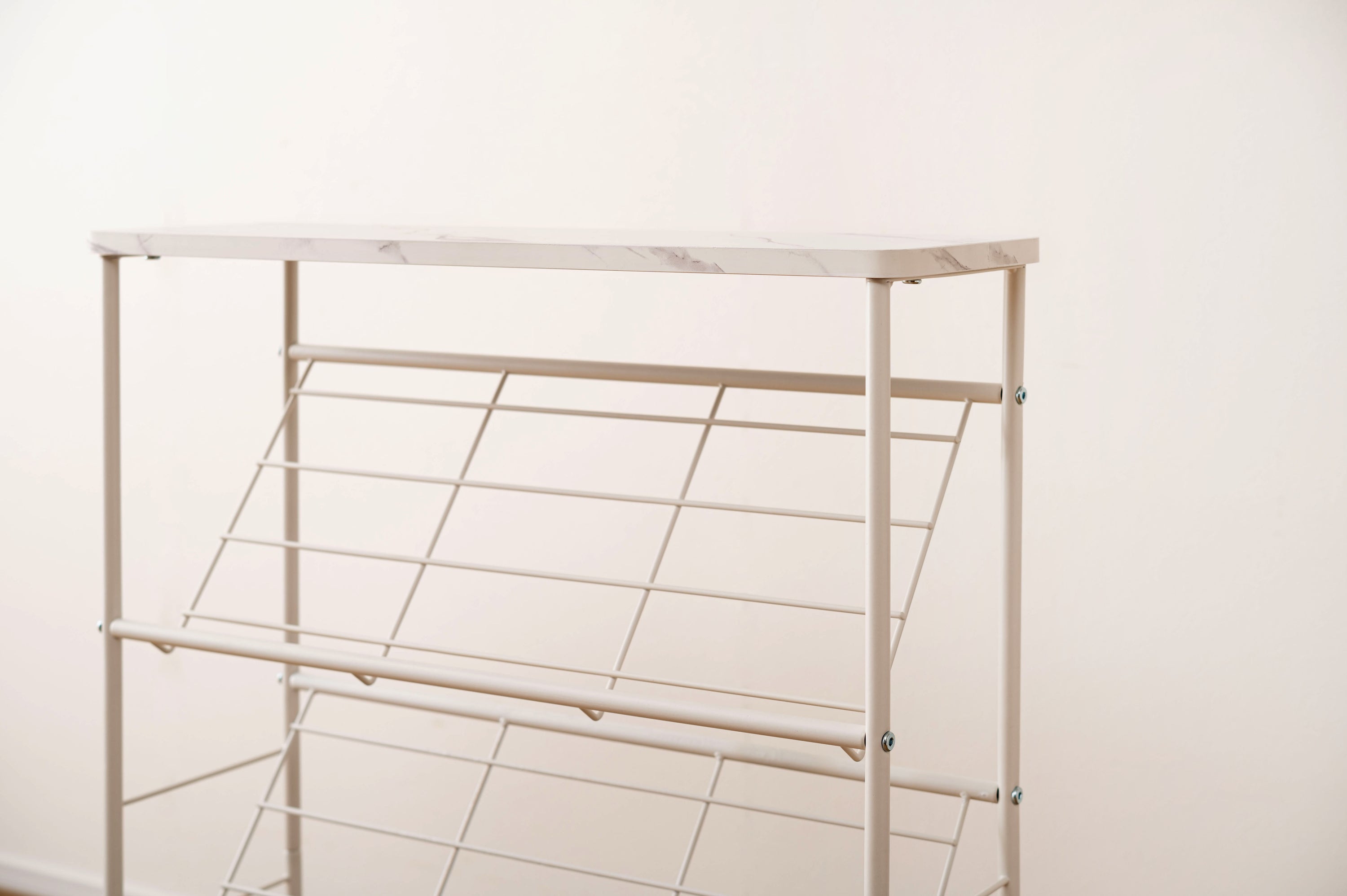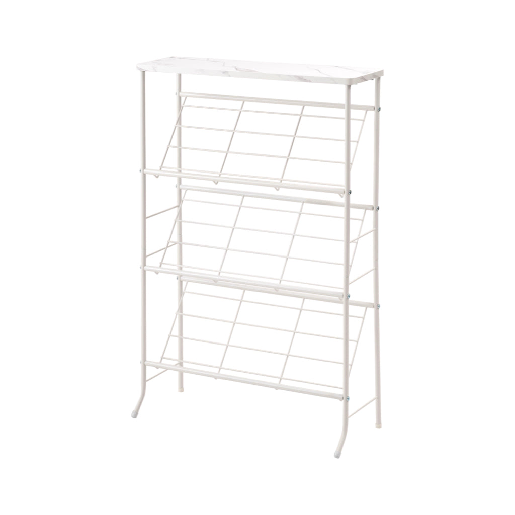 シックな石目調天板とスチールを組み合わせた、スタイリッシュですっきりと収納できるシューズラックです。匂いや湿気がこもらない通気性の良いオープンタイプで、衛生的に使用できます。天板は十分なスペースがある為、小物置きやインテリアのディスプレイになっています。