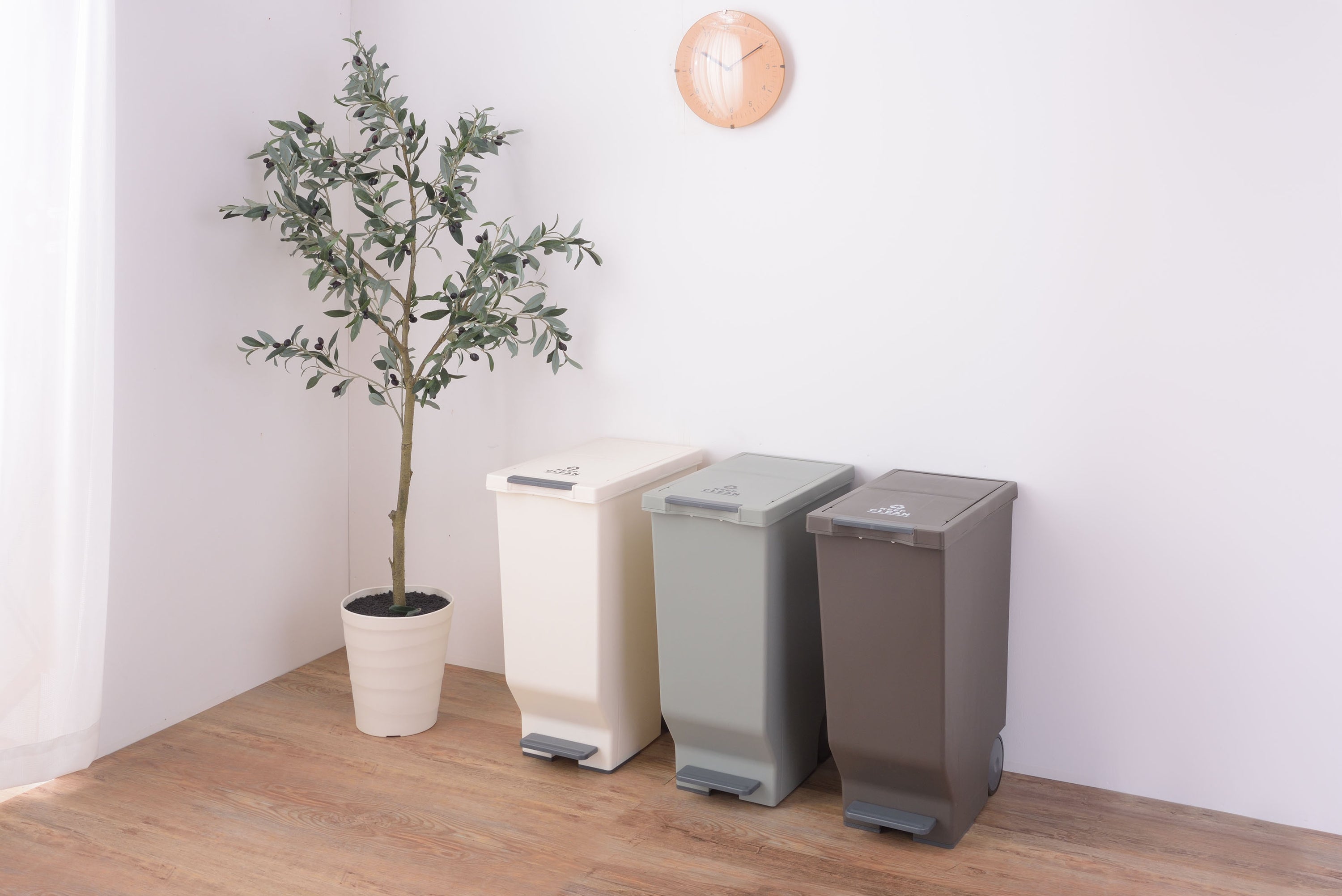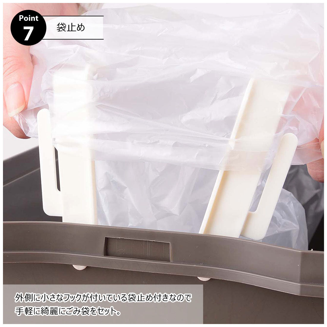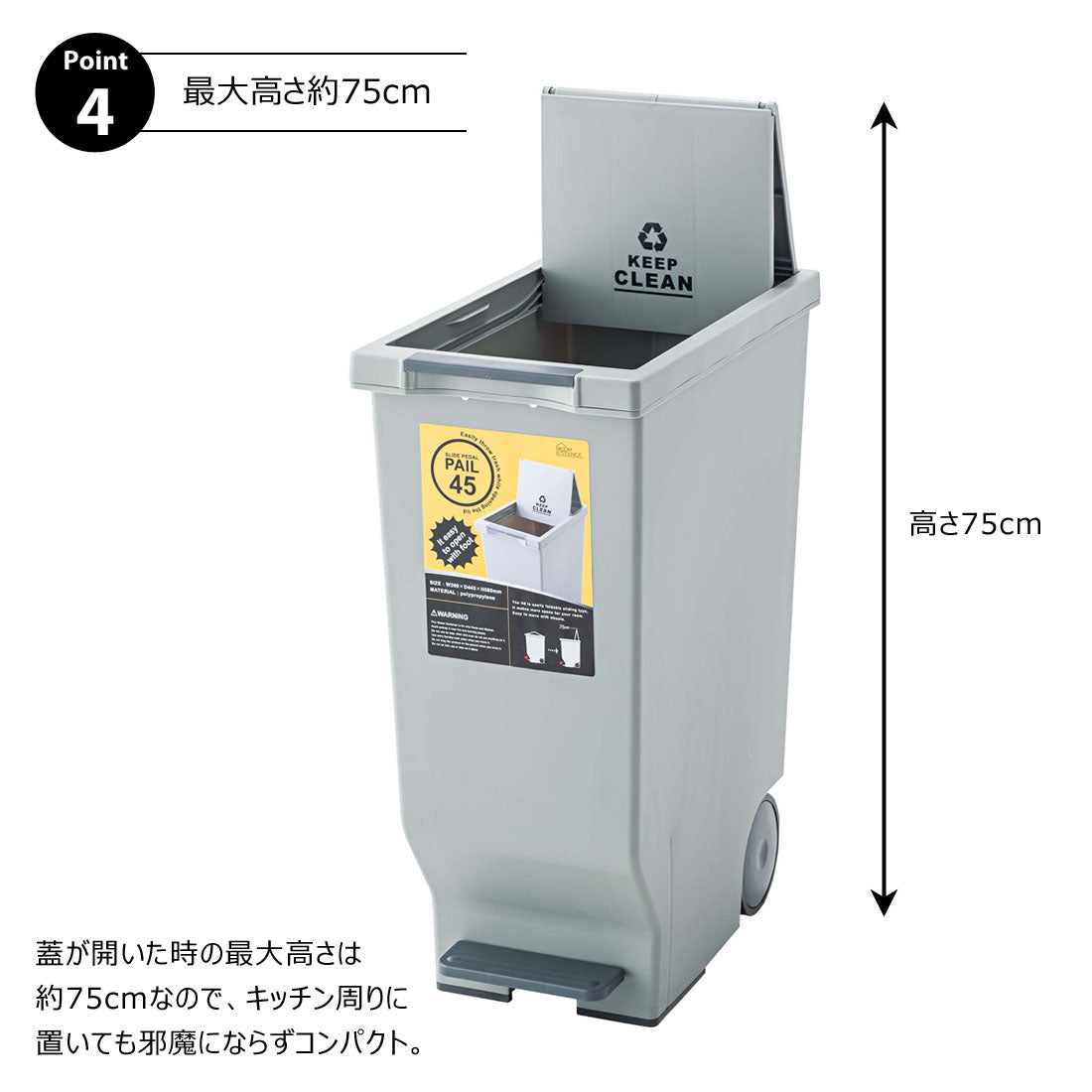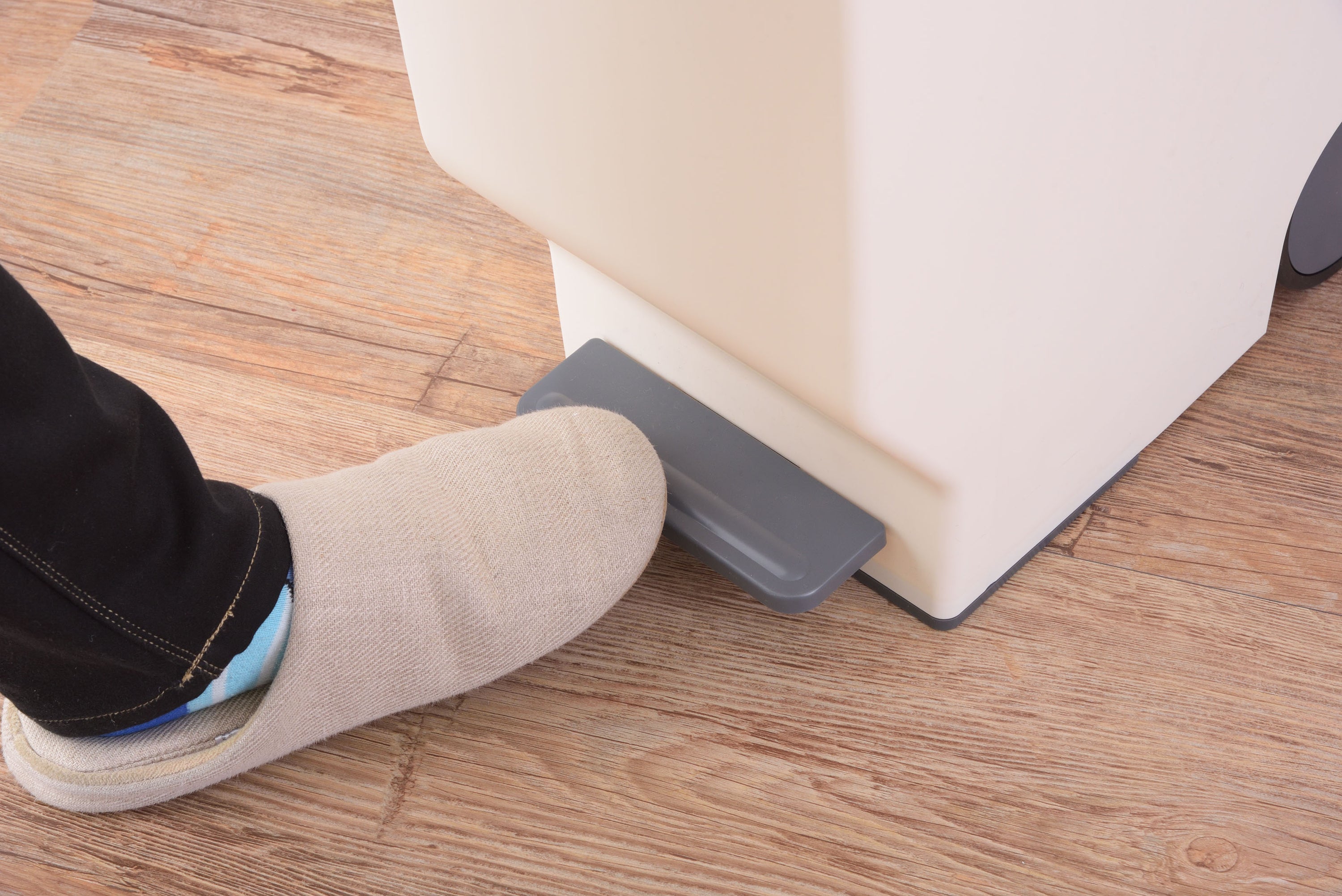 しっとりと落ち着いたツヤ消しマットなカラー。 キッチンやデスク周りはもちろん、オフィス等でも違和感なく使えるカラー。 ラベルは海外製を思わせるデザインながらも安心の日本製。 フットペダルで蓋を開閉。手を使わないので衛生的で清潔。 蓋はスライドロック仕様なので、蓋を開けたままにしておくことも可能。 蓋が開いた時の最大高さは約75cmなので、キッチン周りに置いても邪魔にならずコンパクト。 直径11cmの大型キャスター付きなので移動もらくらく。 フットペダル側の底面にはフレーム状の脚が付いているので、普段の使用時はしっかりとホールド。 外側に小さなフックが付いている袋止め付きなので、手軽に綺麗にごみ袋をセット。 ポリプロピレン製なので汚れに強くお手入れも簡単。