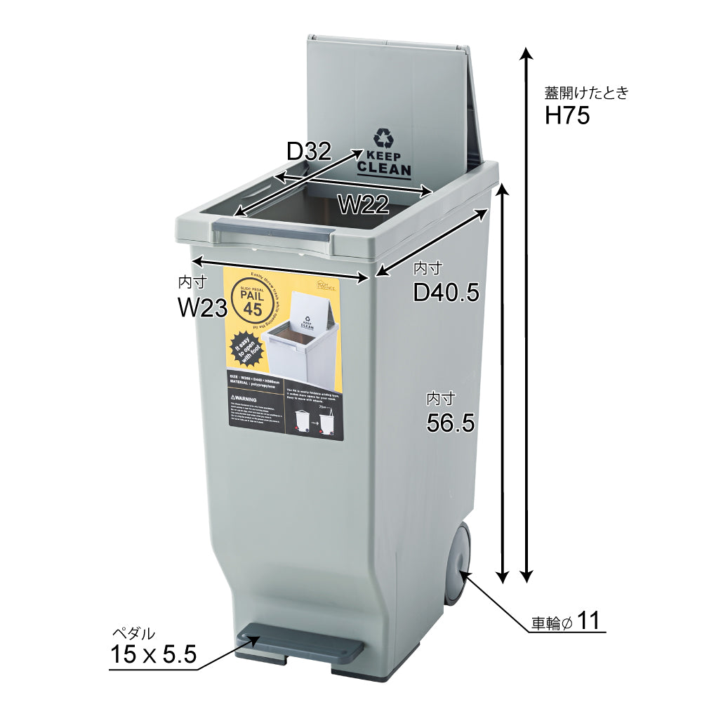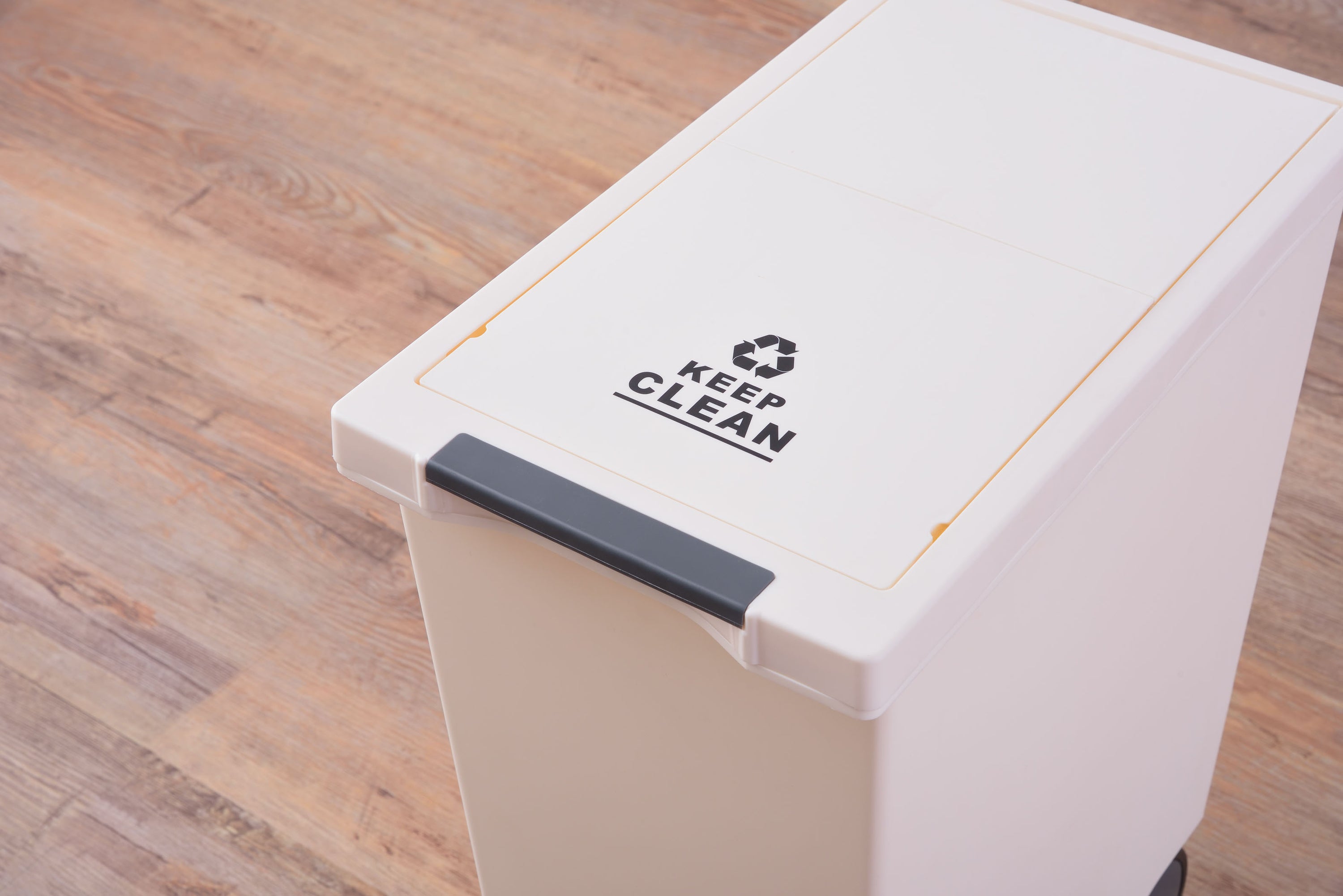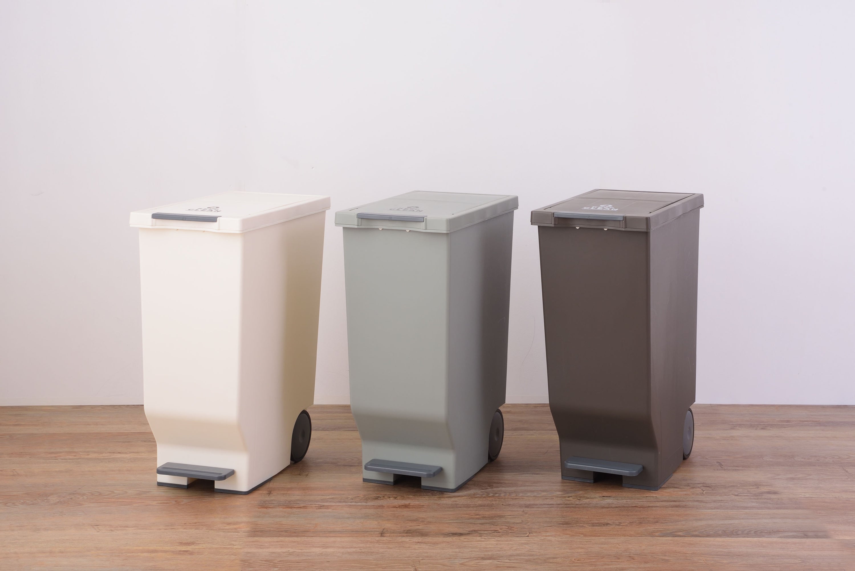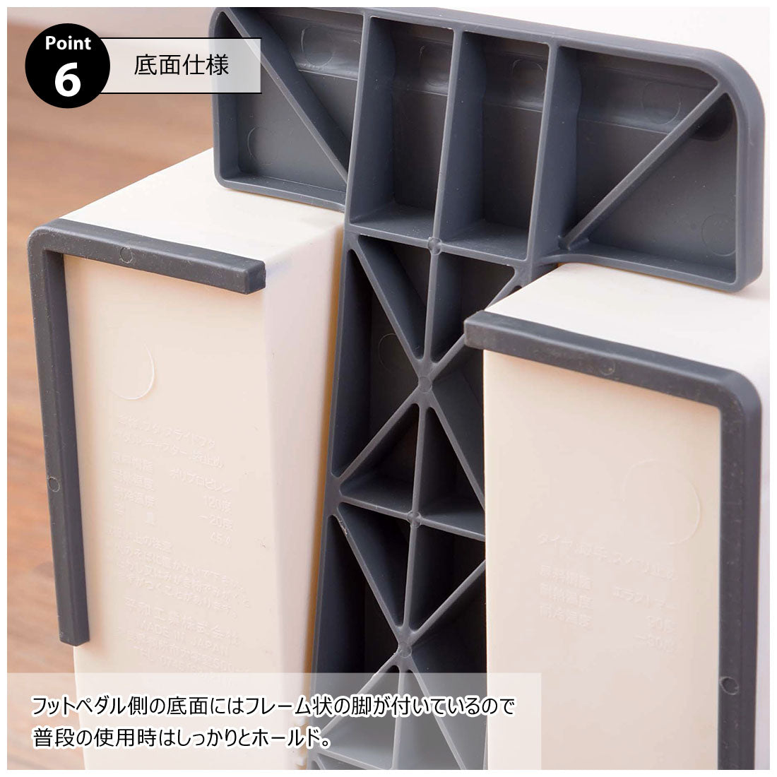 しっとりと落ち着いたツヤ消しマットなカラー。 キッチンやデスク周りはもちろん、オフィス等でも違和感なく使えるカラー。 ラベルは海外製を思わせるデザインながらも安心の日本製。 フットペダルで蓋を開閉。手を使わないので衛生的で清潔。 蓋はスライドロック仕様なので、蓋を開けたままにしておくことも可能。 蓋が開いた時の最大高さは約75cmなので、キッチン周りに置いても邪魔にならずコンパクト。 直径11cmの大型キャスター付きなので移動もらくらく。 フットペダル側の底面にはフレーム状の脚が付いているので、普段の使用時はしっかりとホールド。 外側に小さなフックが付いている袋止め付きなので、手軽に綺麗にごみ袋をセット。 ポリプロピレン製なので汚れに強くお手入れも簡単。