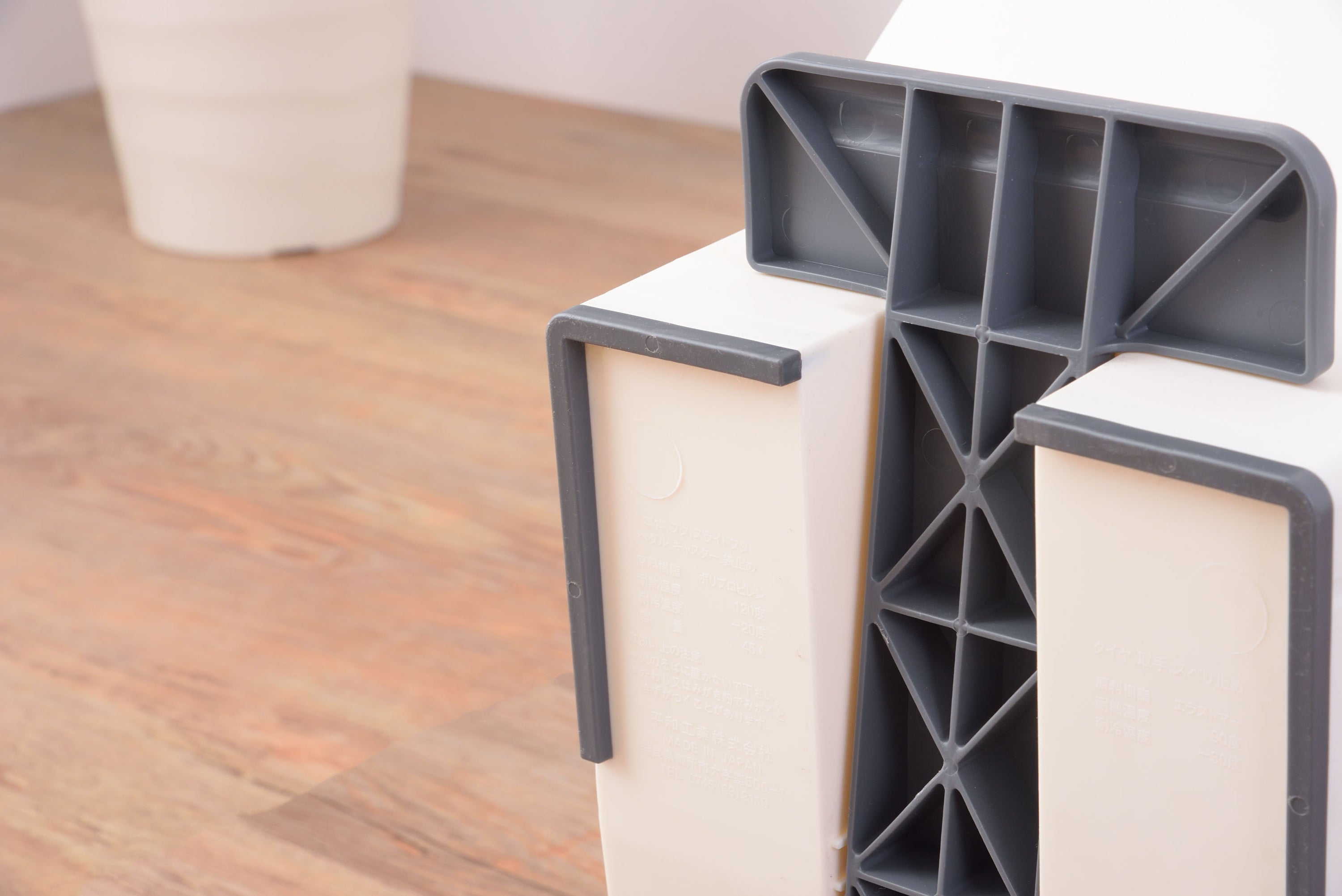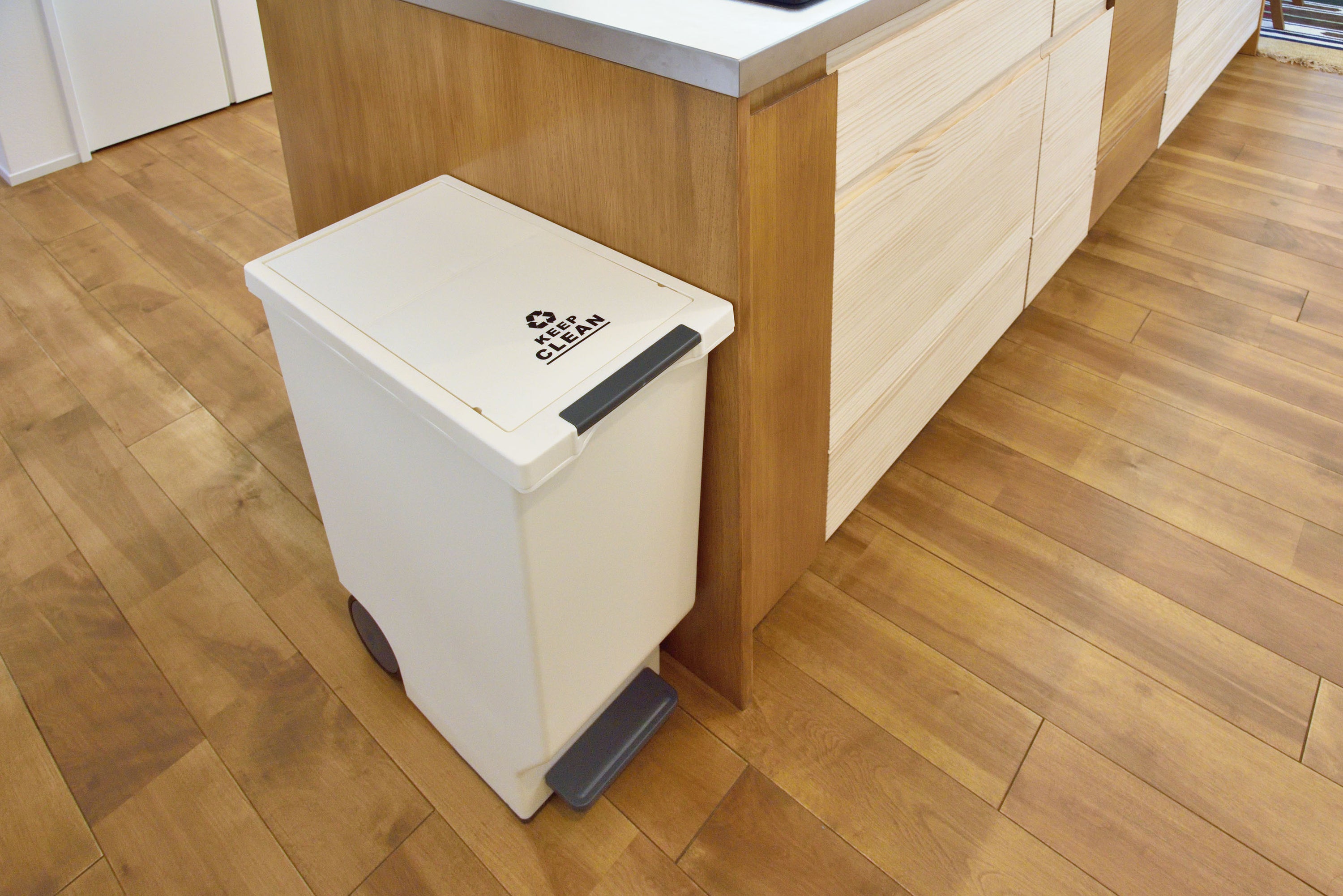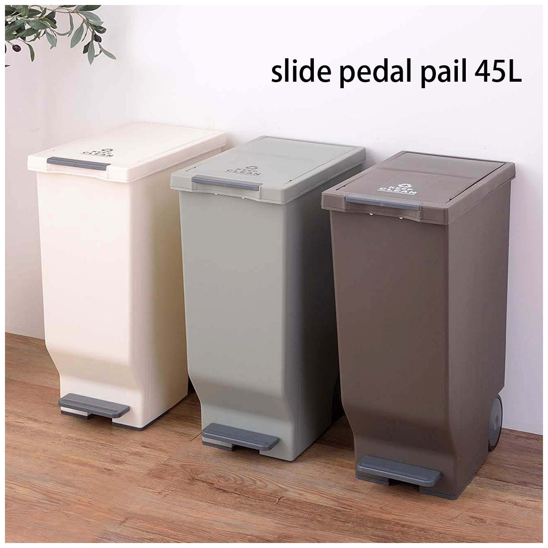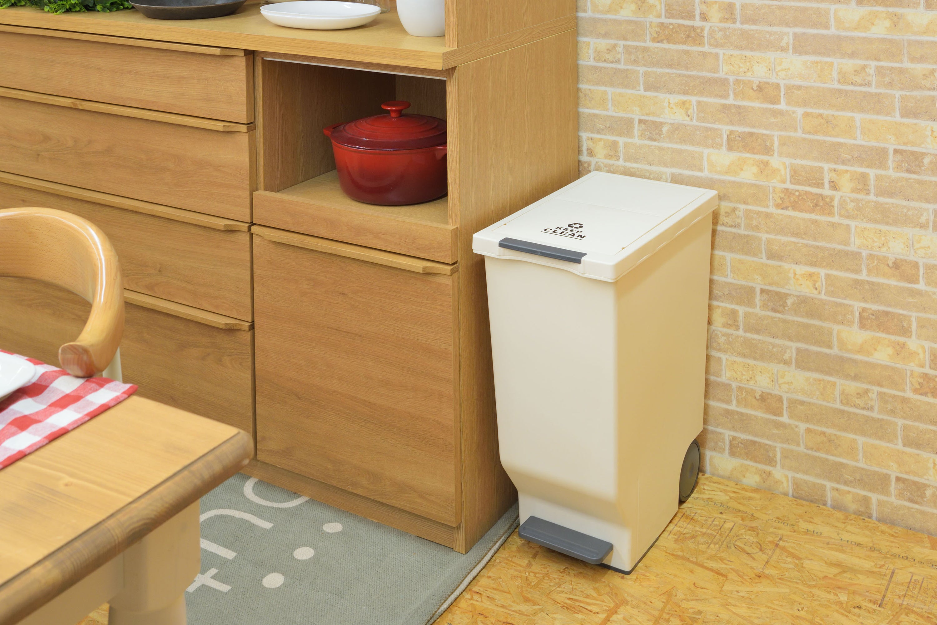 しっとりと落ち着いたツヤ消しマットなカラー。 キッチンやデスク周りはもちろん、オフィス等でも違和感なく使えるカラー。 ラベルは海外製を思わせるデザインながらも安心の日本製。 フットペダルで蓋を開閉。手を使わないので衛生的で清潔。 蓋はスライドロック仕様なので、蓋を開けたままにしておくことも可能。 蓋が開いた時の最大高さは約75cmなので、キッチン周りに置いても邪魔にならずコンパクト。 直径11cmの大型キャスター付きなので移動もらくらく。 フットペダル側の底面にはフレーム状の脚が付いているので、普段の使用時はしっかりとホールド。 外側に小さなフックが付いている袋止め付きなので、手軽に綺麗にごみ袋をセット。 ポリプロピレン製なので汚れに強くお手入れも簡単。